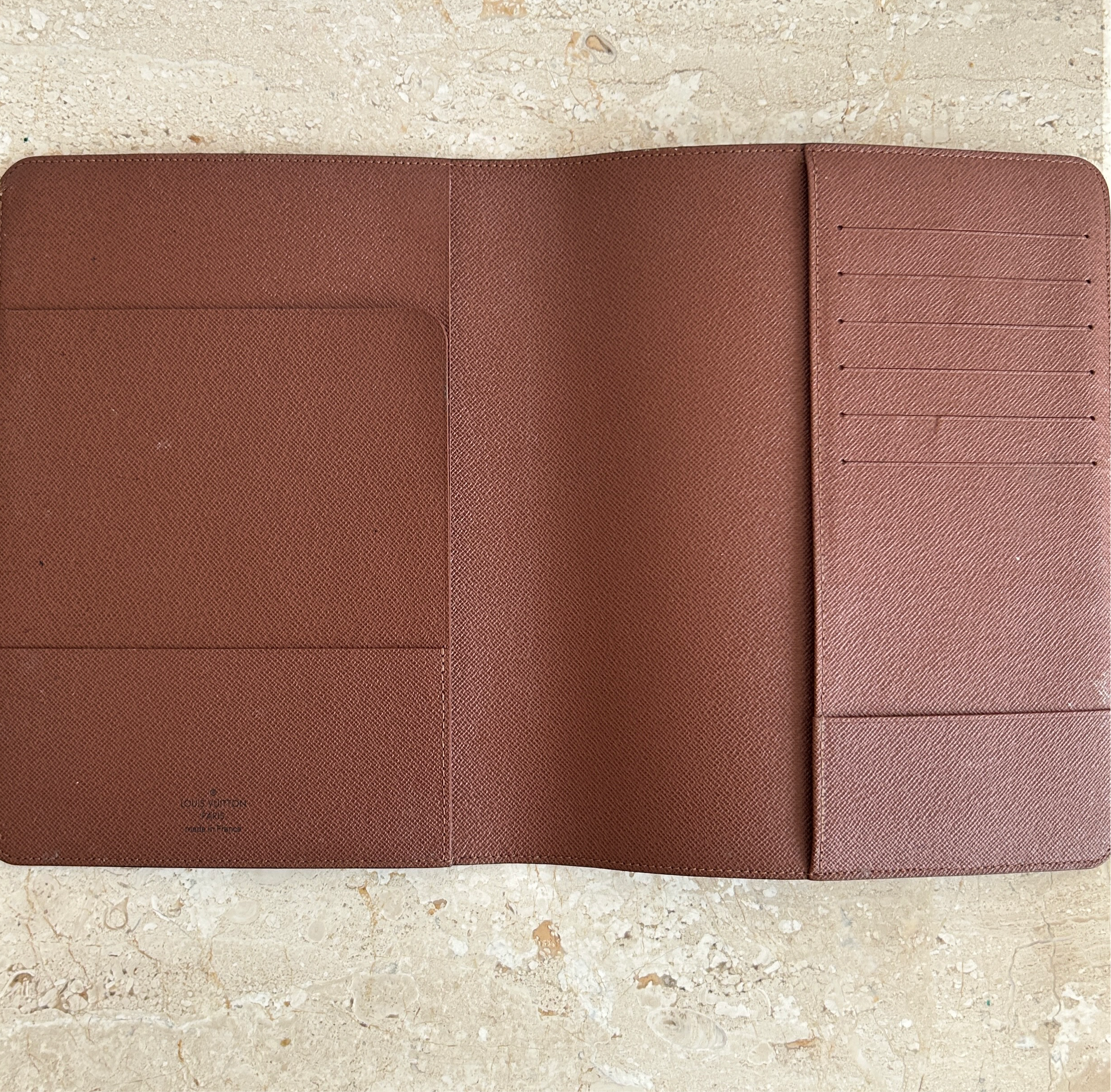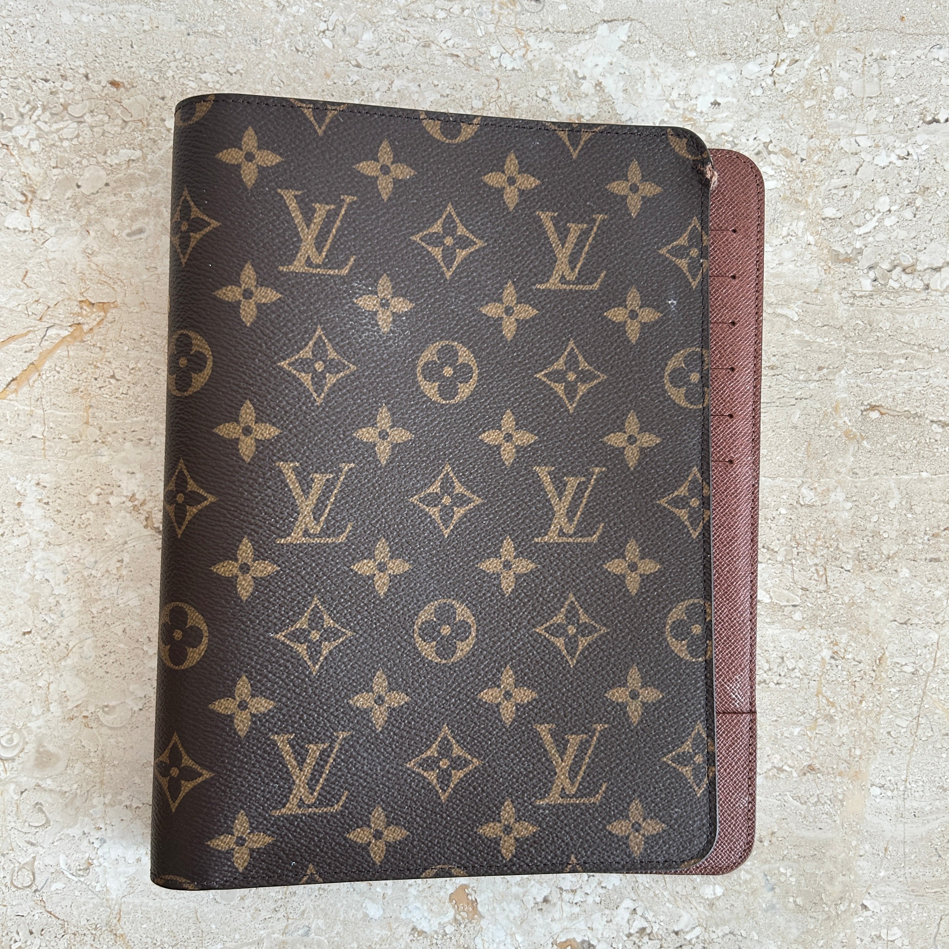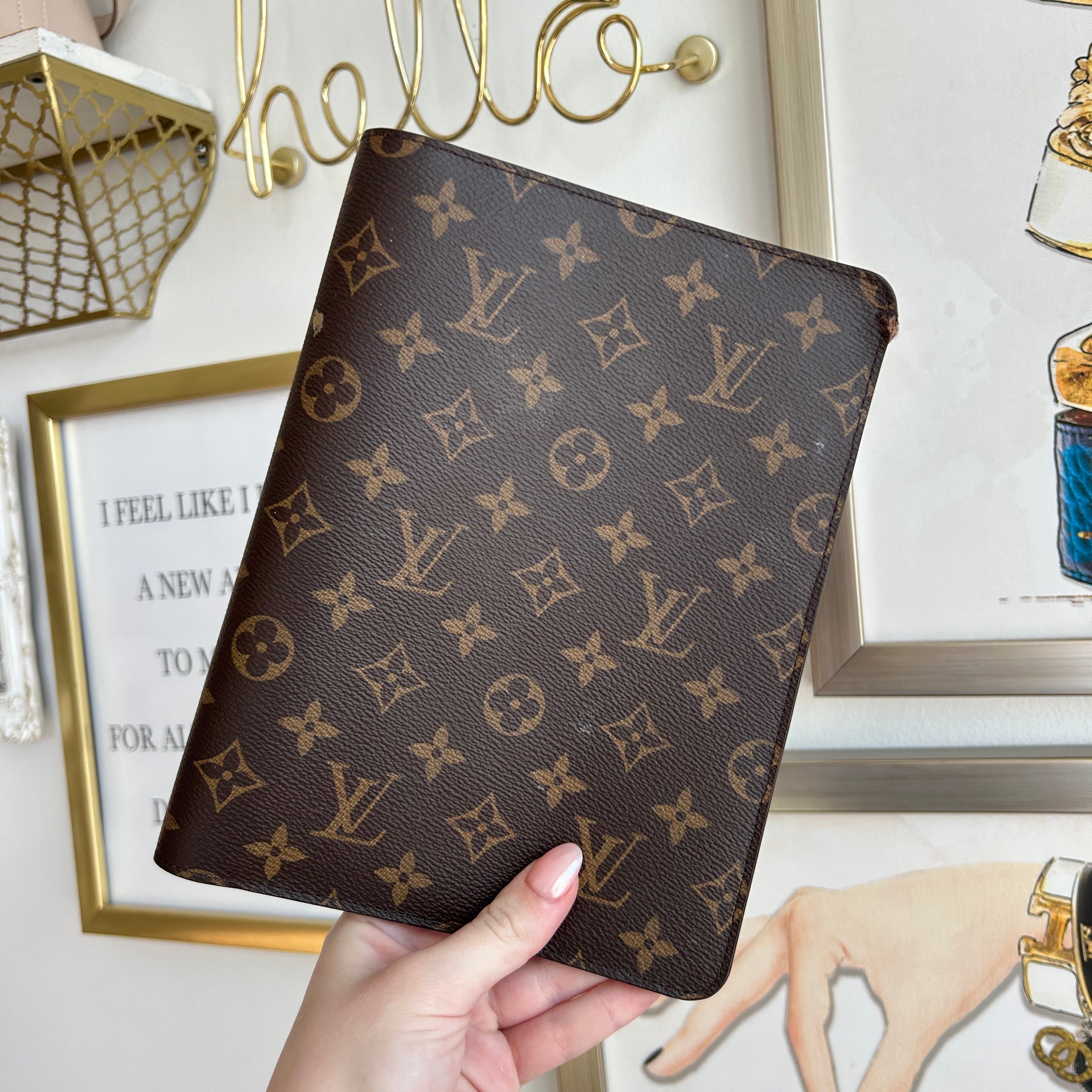 Pre-Owned Louis Vuitton Monogram Desk Agenda Cover. Designed to stay on the desk, this monogram agenda cover is leather lined with room for cards and small papers and can fit a standard A5 notebook. 6 card slots and 3 pockets. This is a great office piece!