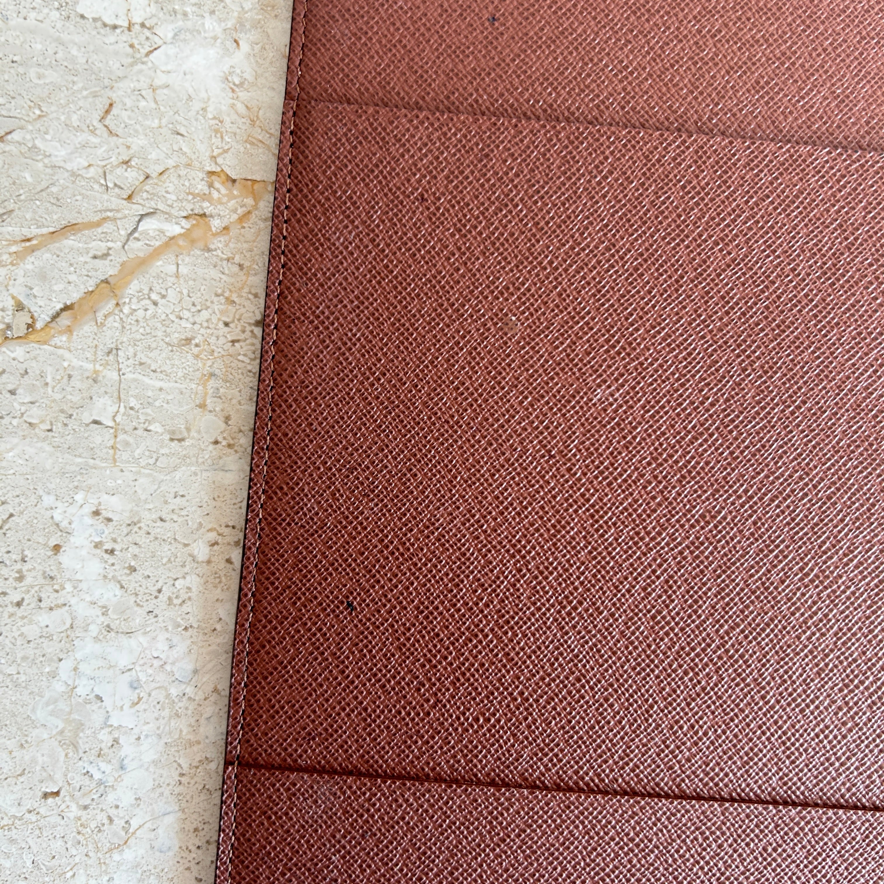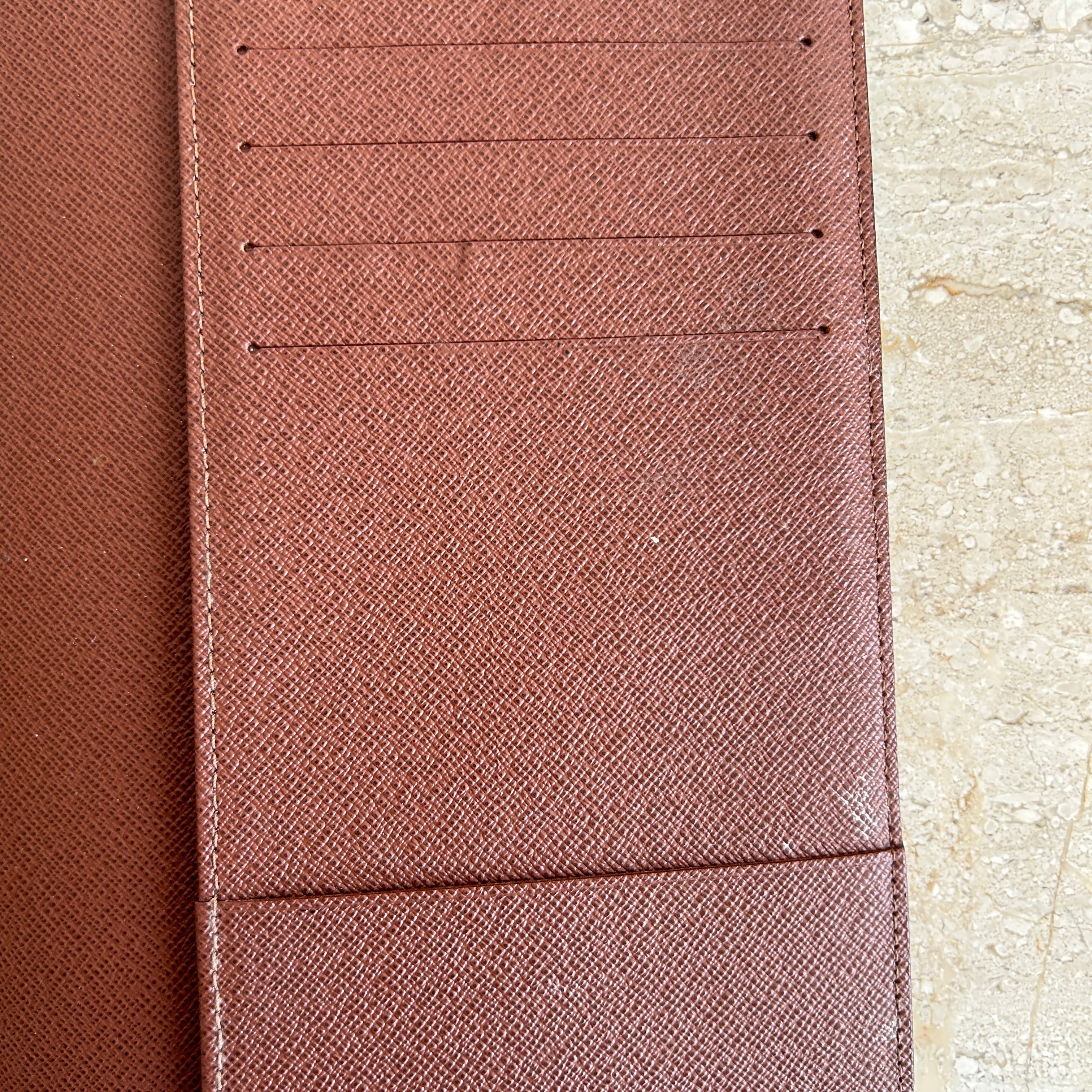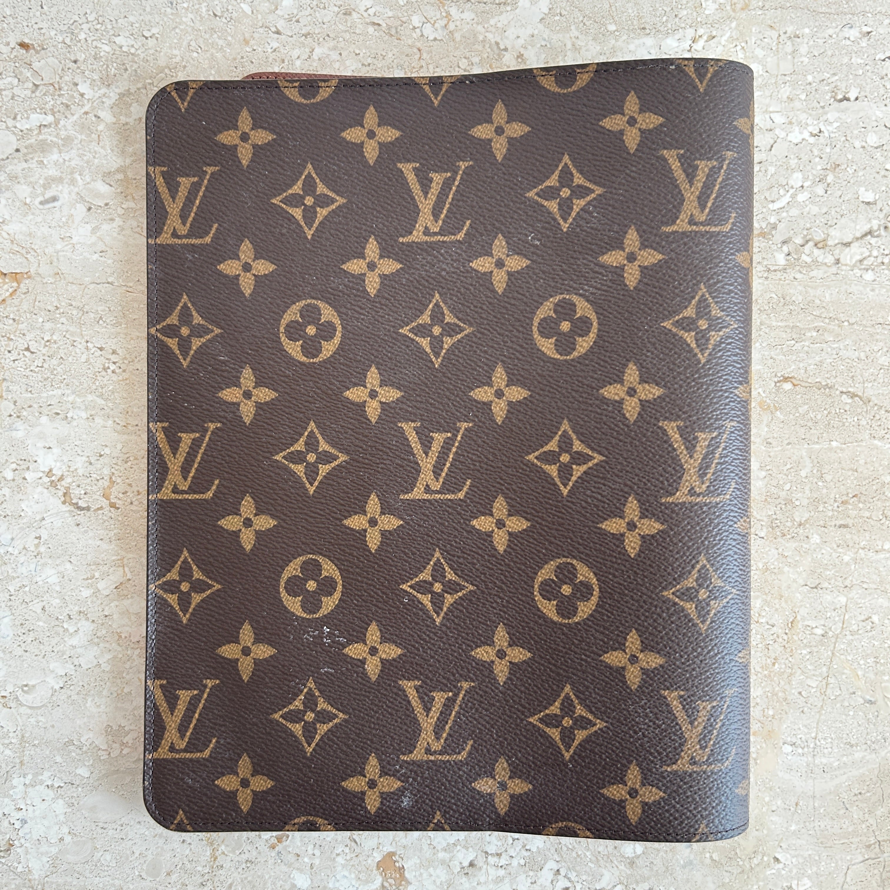 Pre-Owned Louis Vuitton Monogram Desk Agenda Cover. Designed to stay on the desk, this monogram agenda cover is leather lined with room for cards and small papers and can fit a standard A5 notebook. 6 card slots and 3 pockets. This is a great office piece!