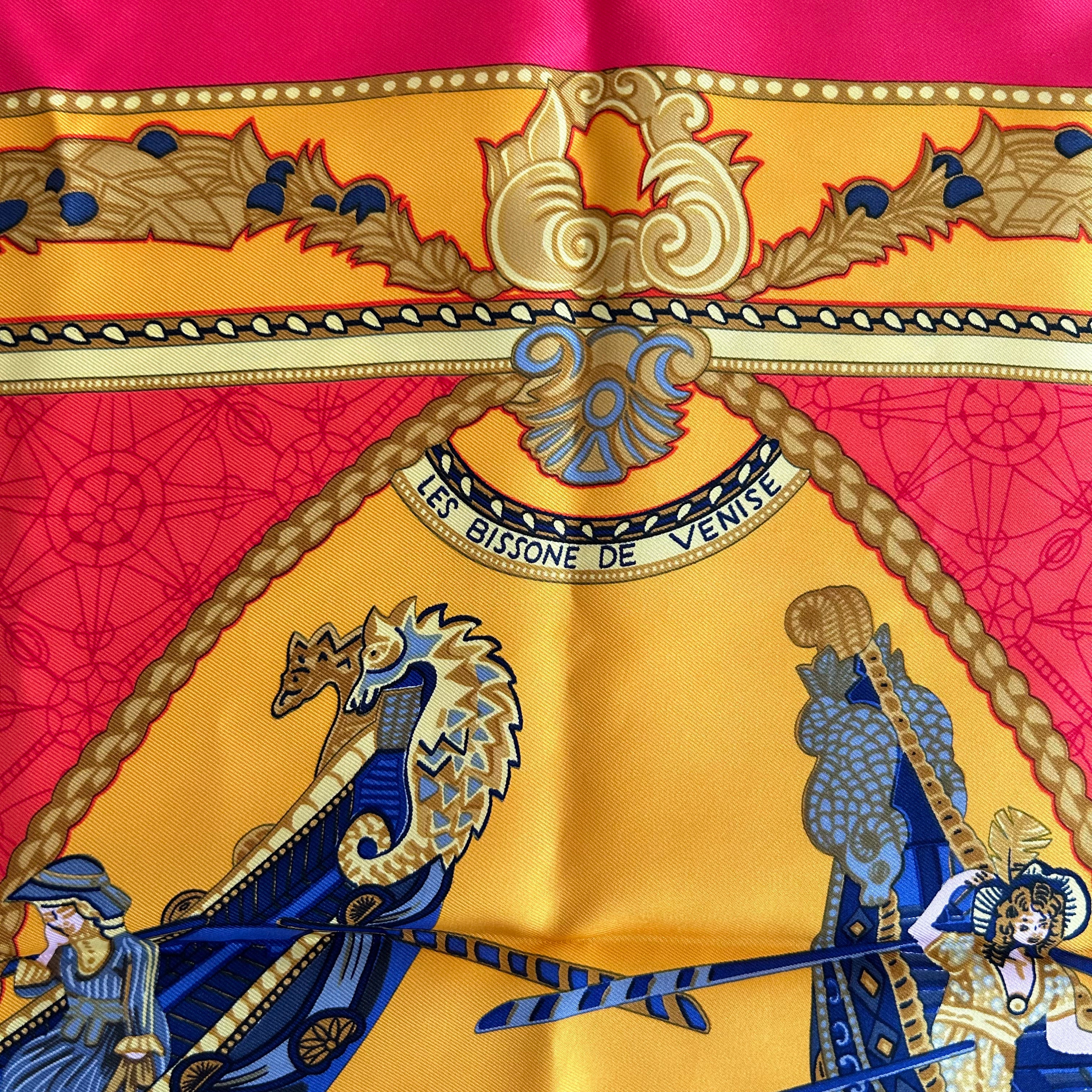 Pre-Owned Hermes Les Bissone de Venise Silk Scarf 90. Crafted in 100% silk, this scarf features Venetian Gondolas in blues and golds, against a vibrant mix of orange and yellows. With hand rolled edges, this scarf is a stunning piece of art!