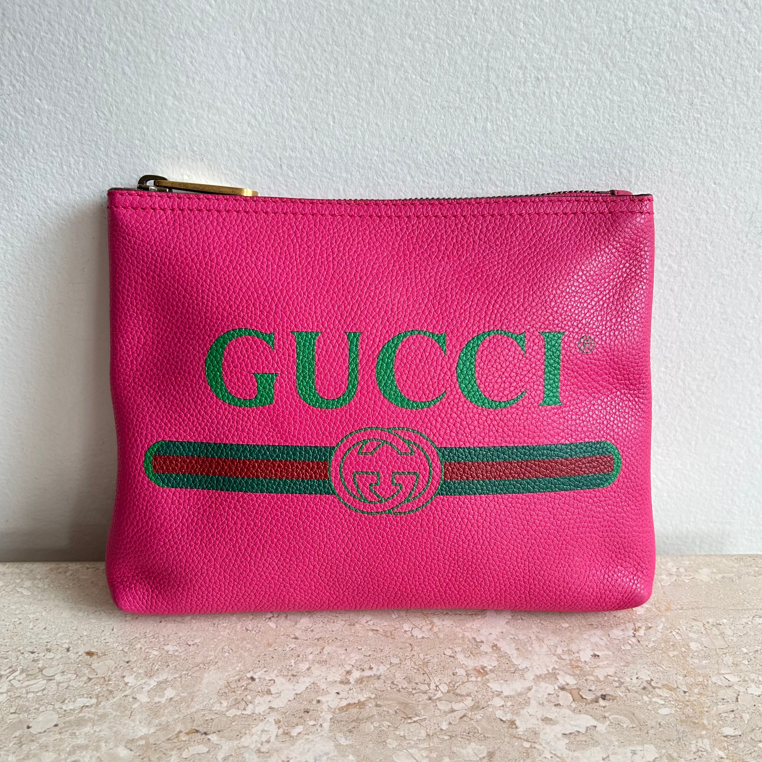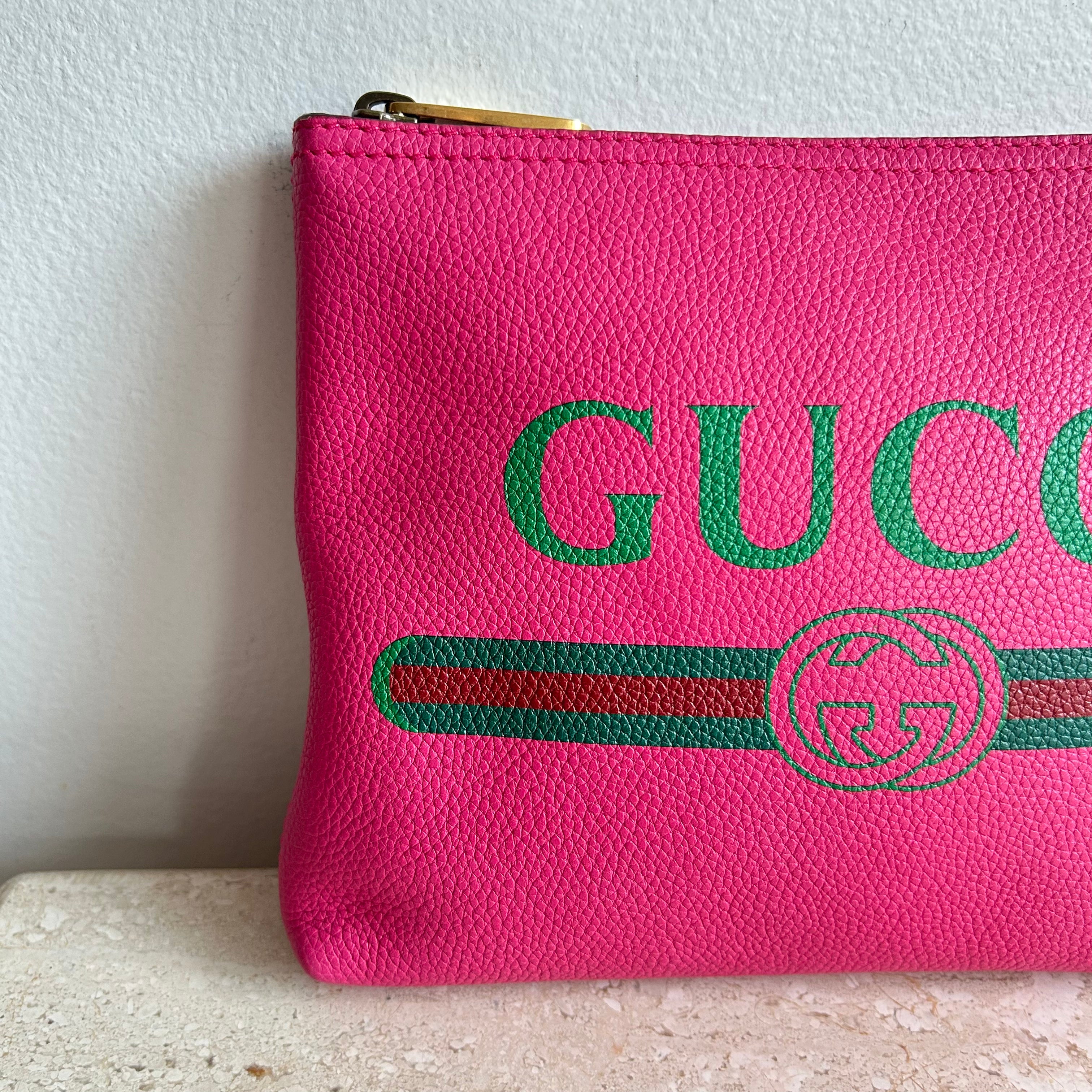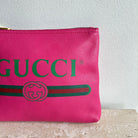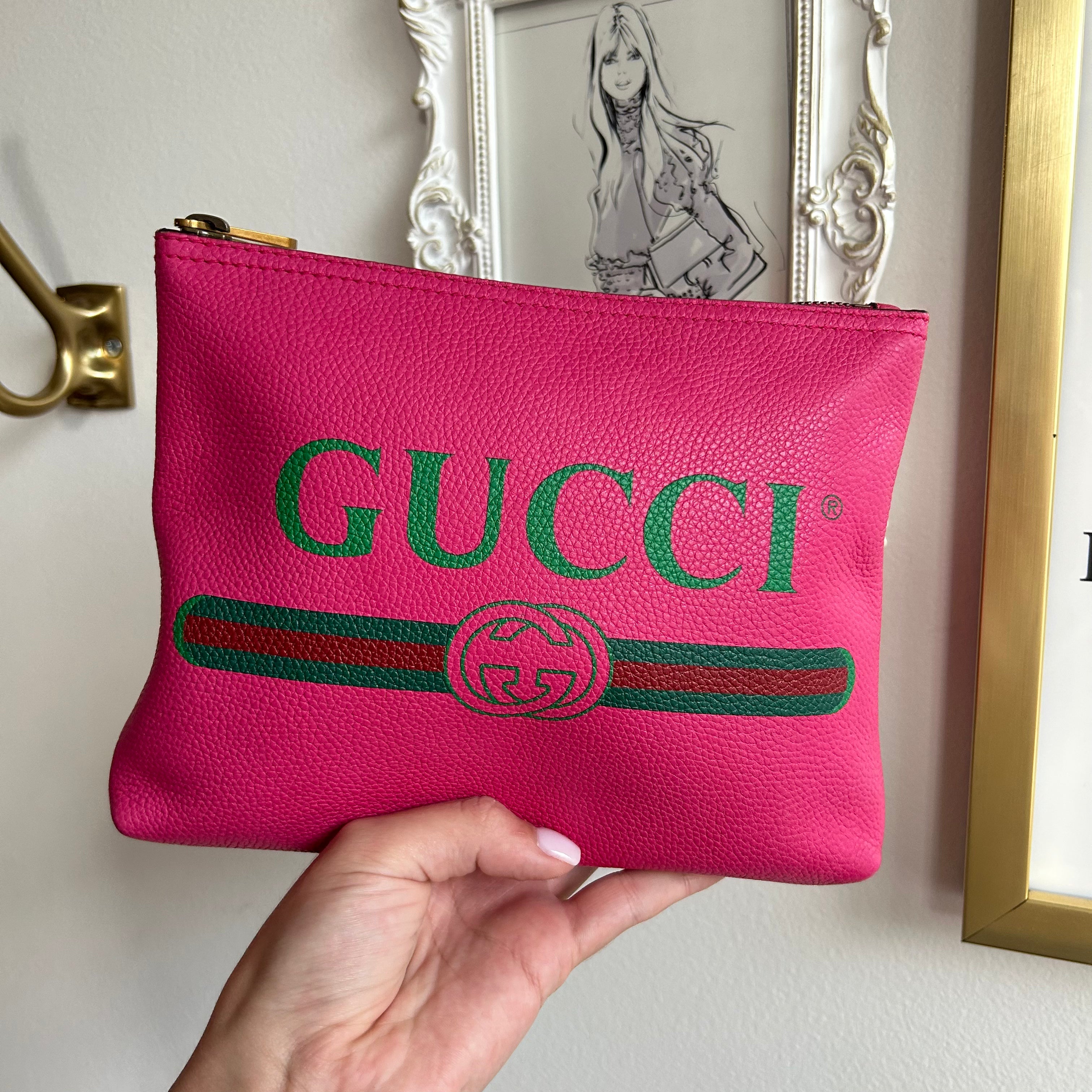 Pre-Owned Gucci Pink Logo Web Clutch/Pouch. Crafted in pink pebbled calfskin leather featuring the iconic web and house signature along the front in green. Top zipper opens to a matching suede interior. The perfect grab and go clutch in the most fun colour!