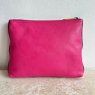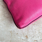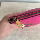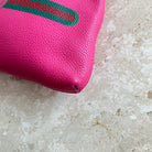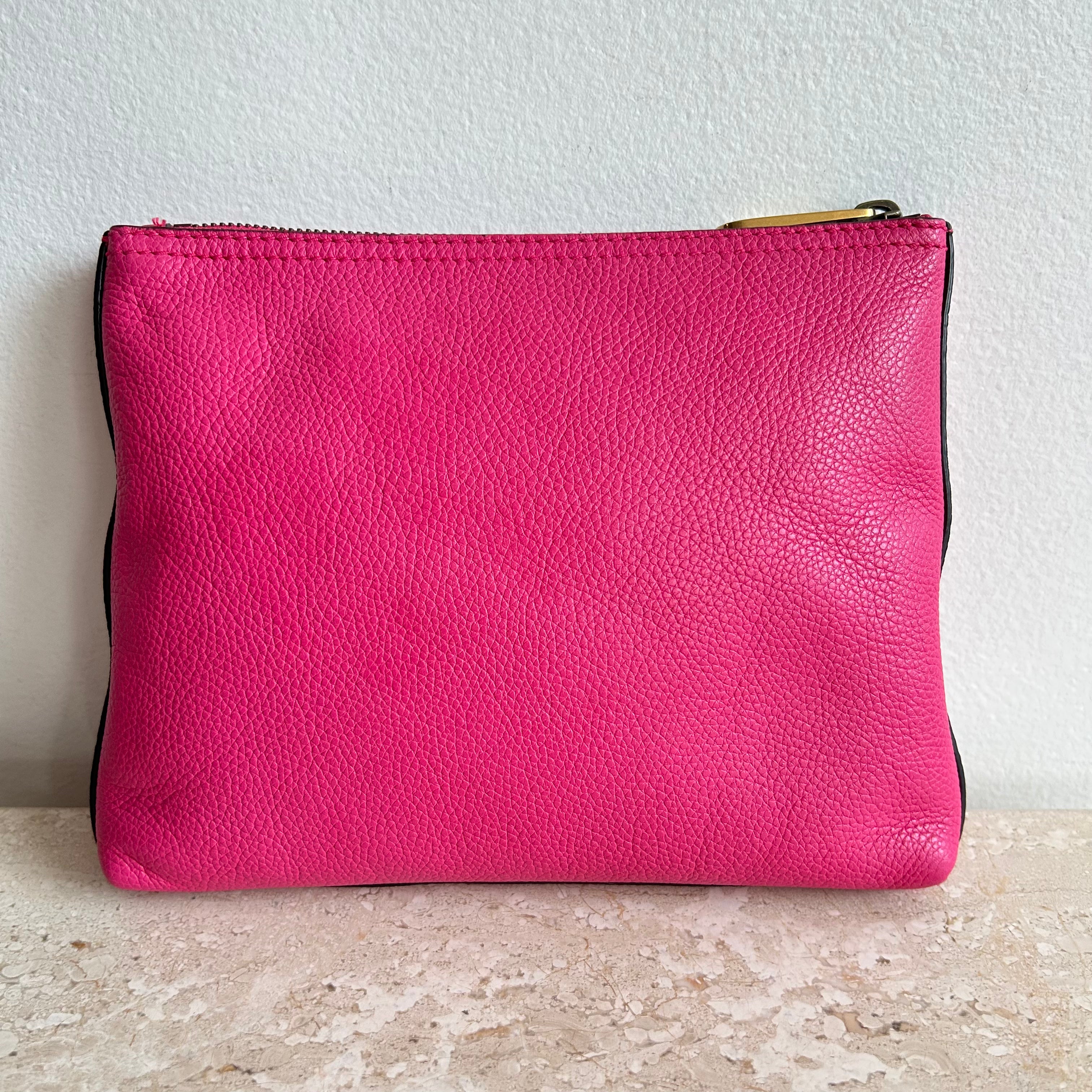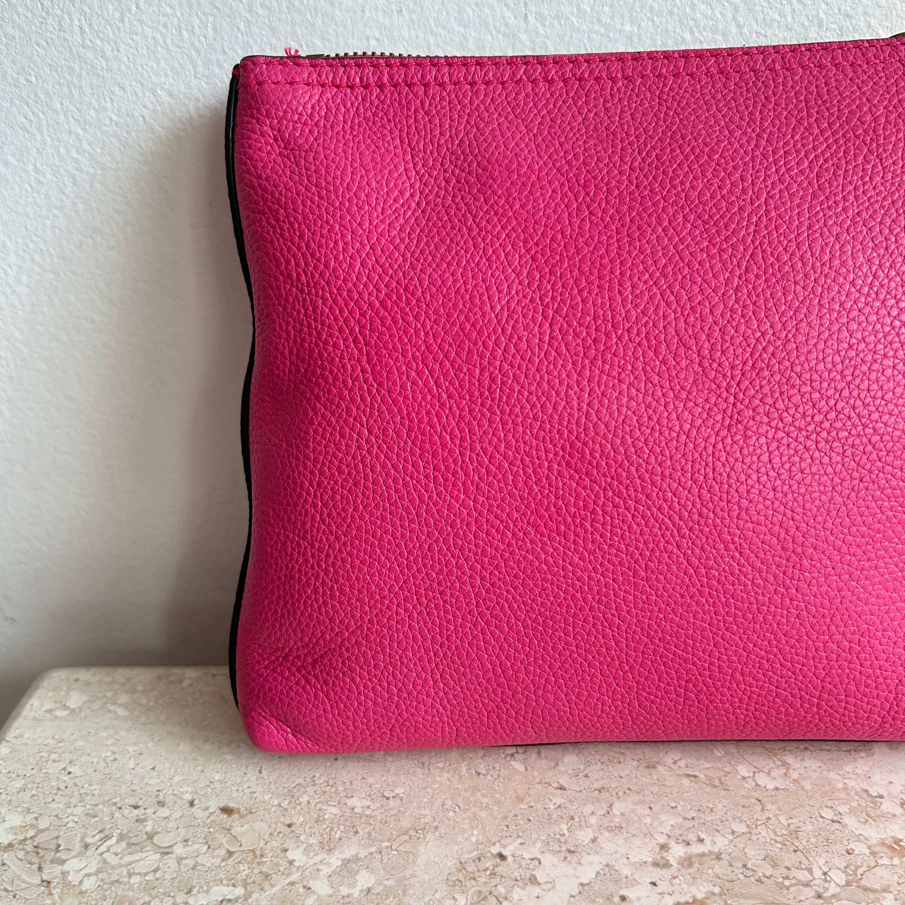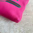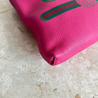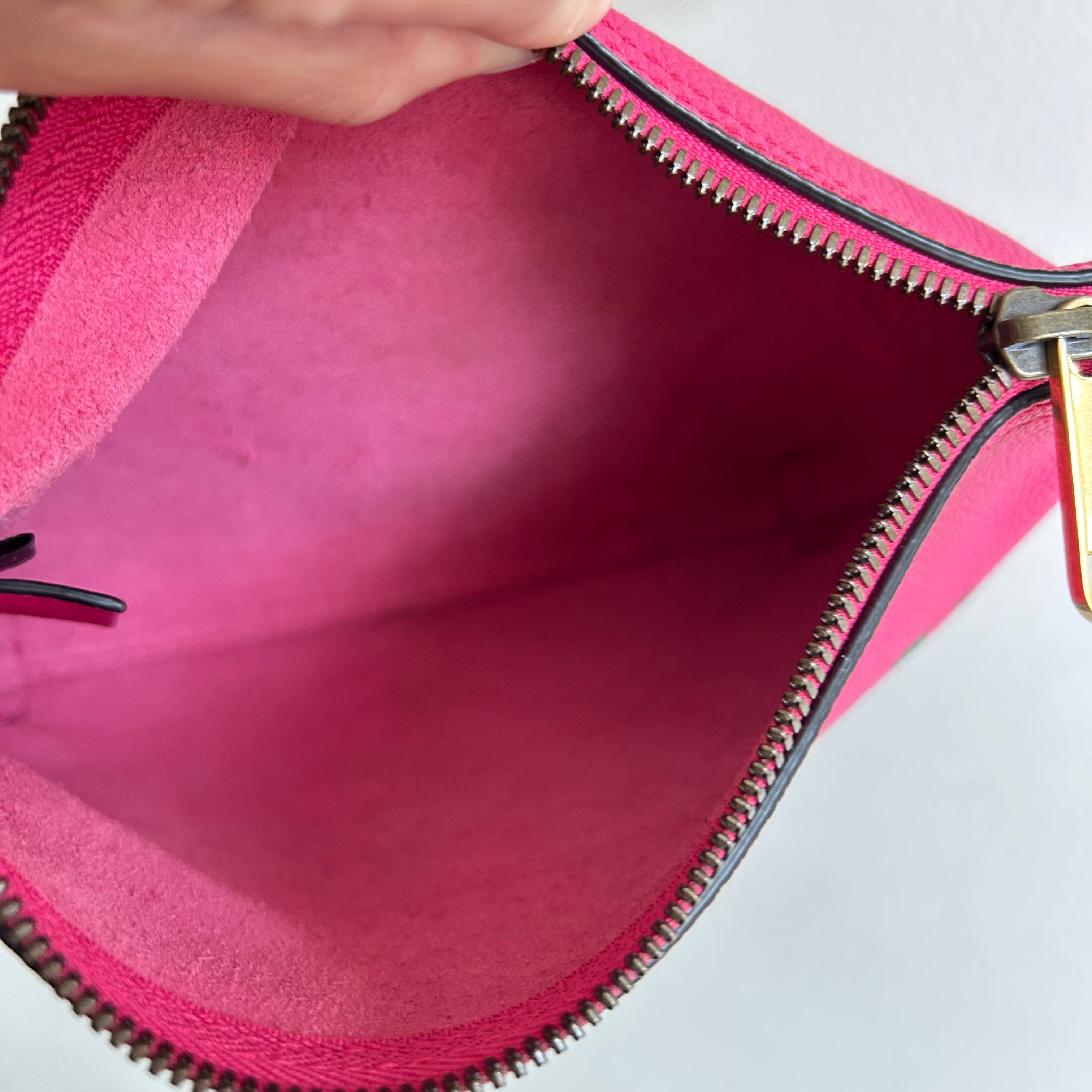 Pre-Owned Gucci Pink Logo Web Clutch/Pouch. Crafted in pink pebbled calfskin leather featuring the iconic web and house signature along the front in green. Top zipper opens to a matching suede interior. The perfect grab and go clutch in the most fun colour!