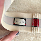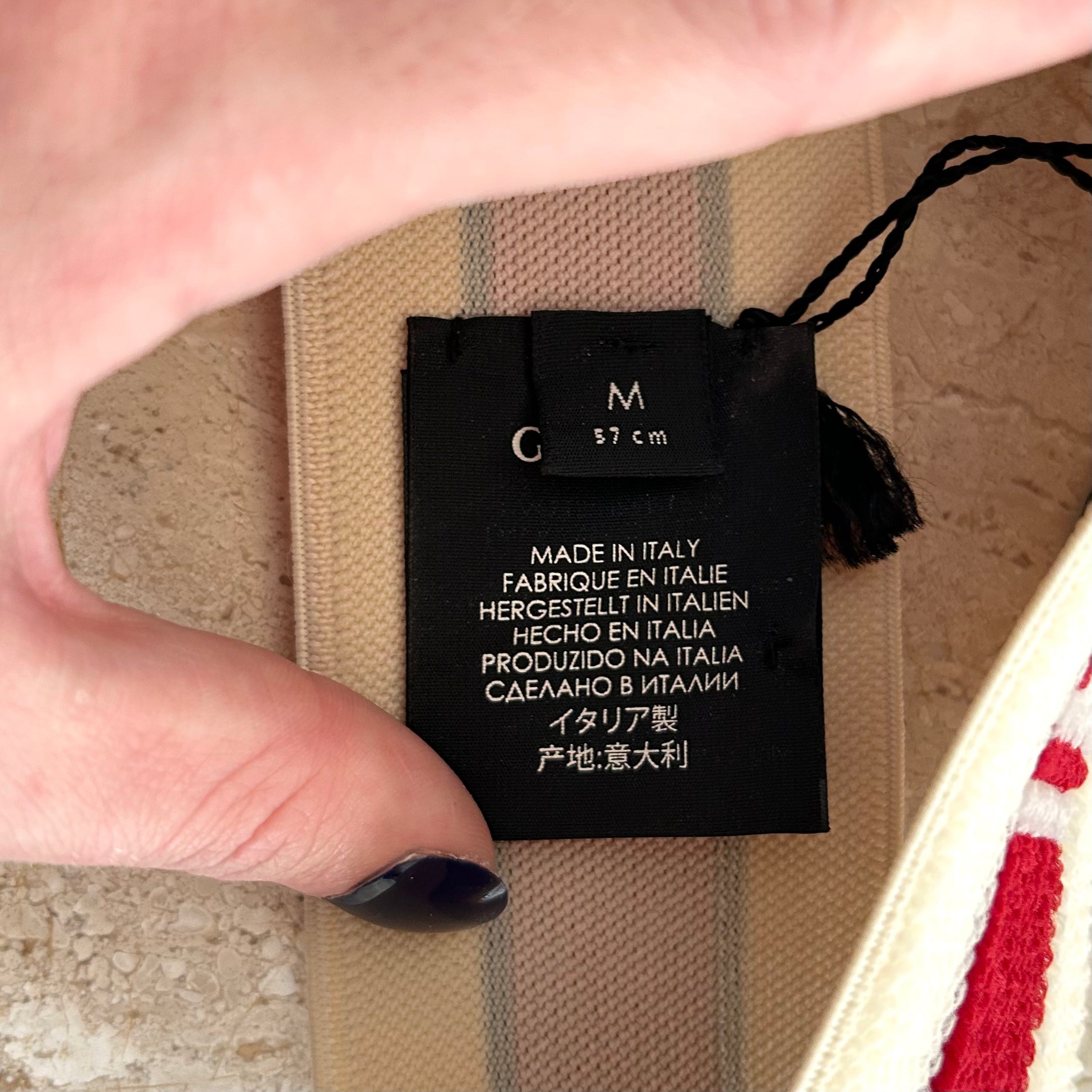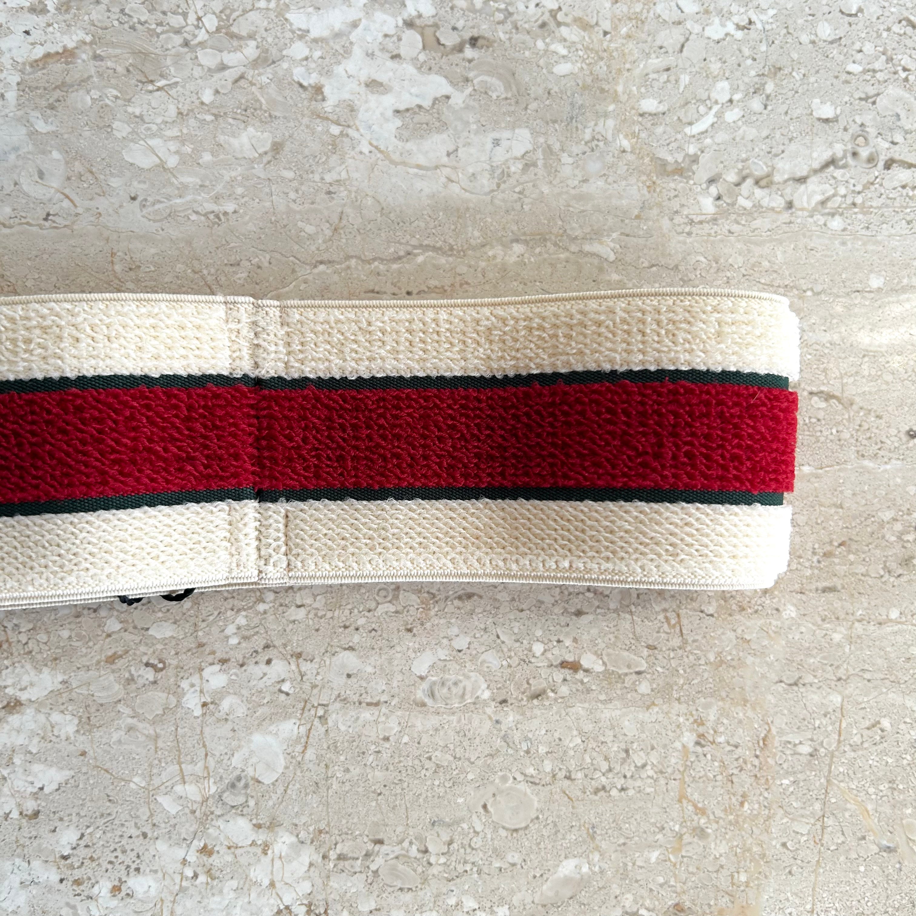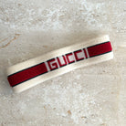 Pre-Owned Gucci Logo Elastic Headband. This elastic headband is in a cream colour, with the house logo across the front and the red and green stripe all around. This is such a fun piece!