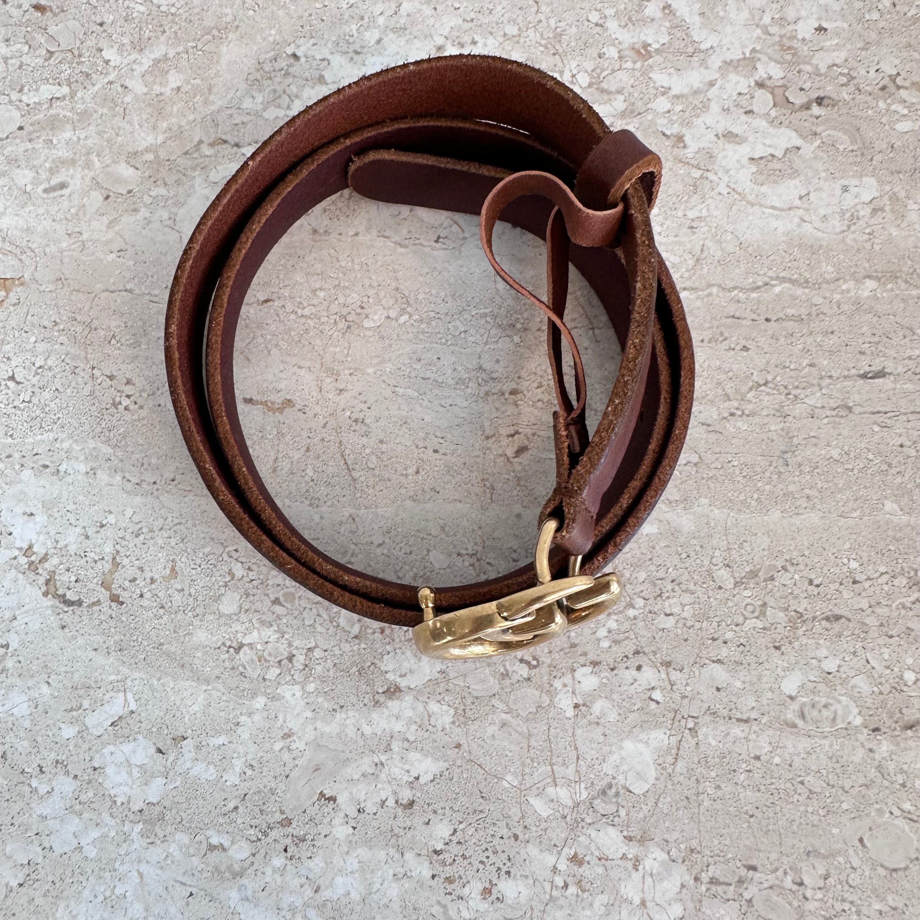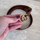 Pre-Owned Gucci Marmont Thin Brown Belt Size 75/30. This brown belt features a worn leather look and the iconic interlocking GG logo in gold-tone hardware. Can be transitioned easily into casual or chic outfits! A great find!
