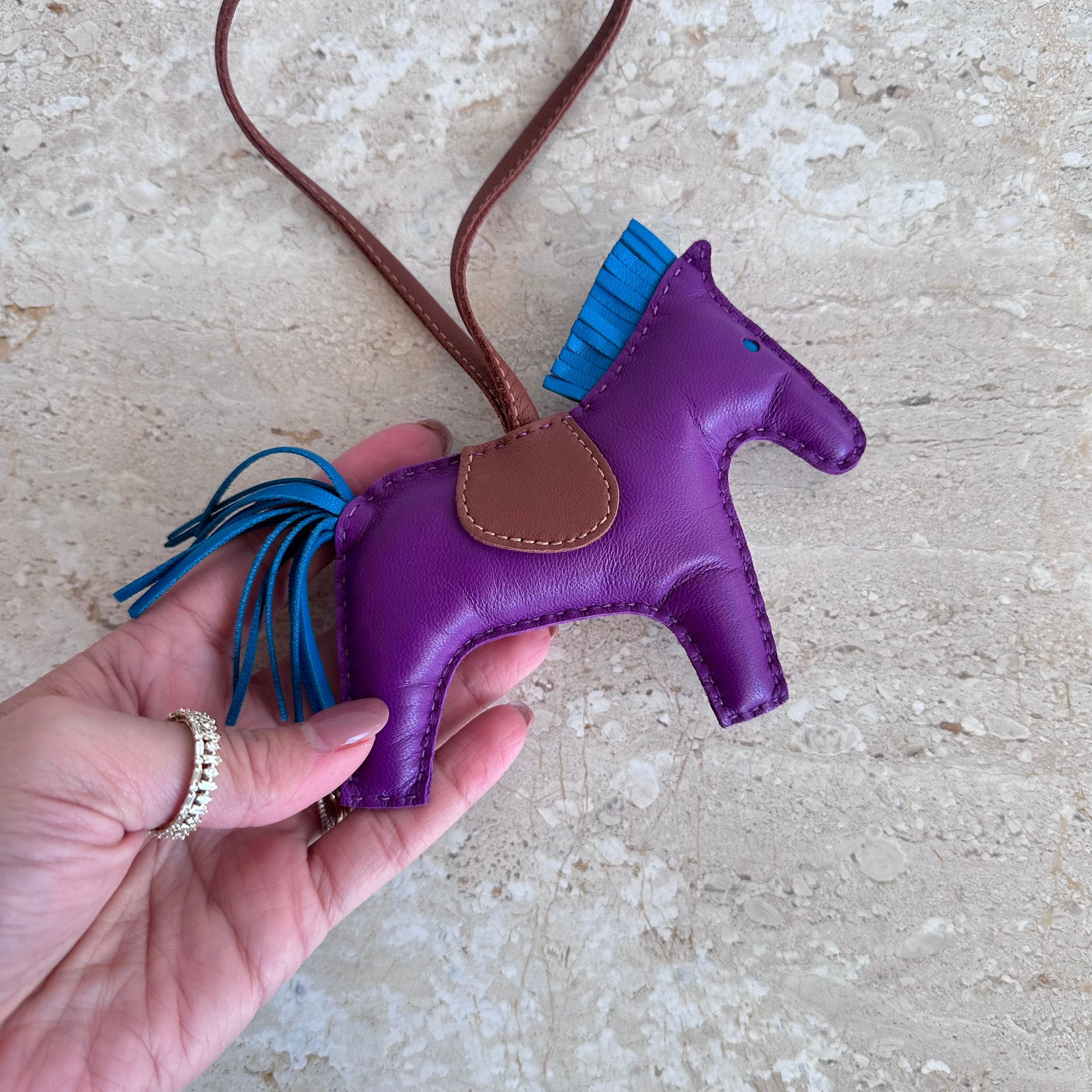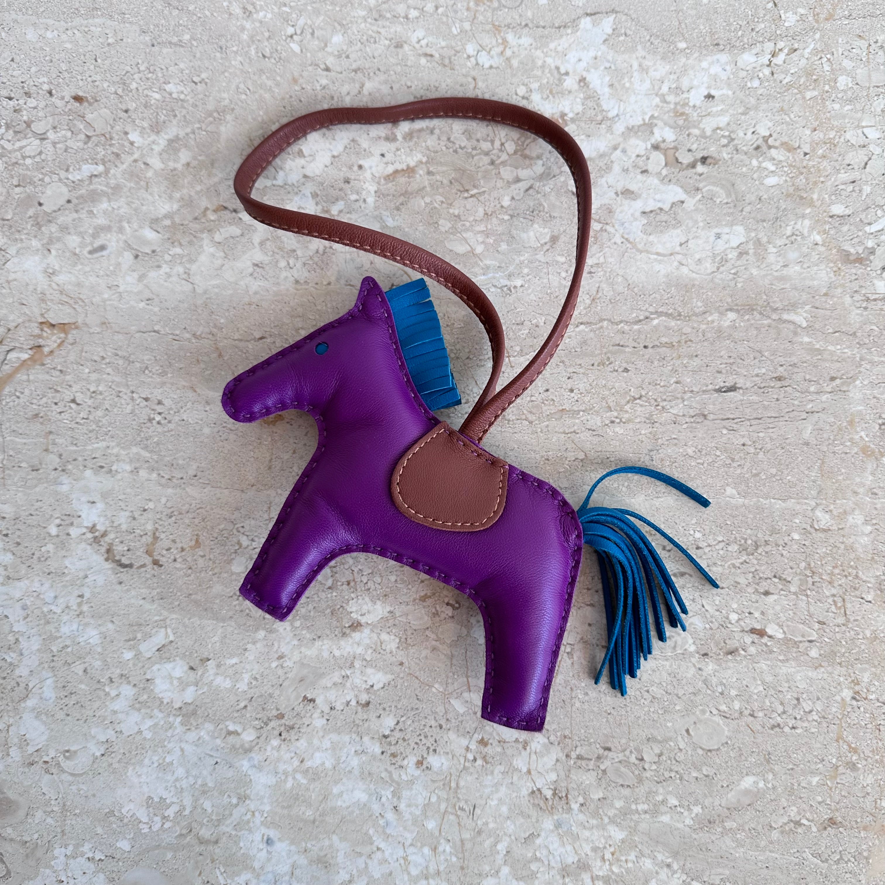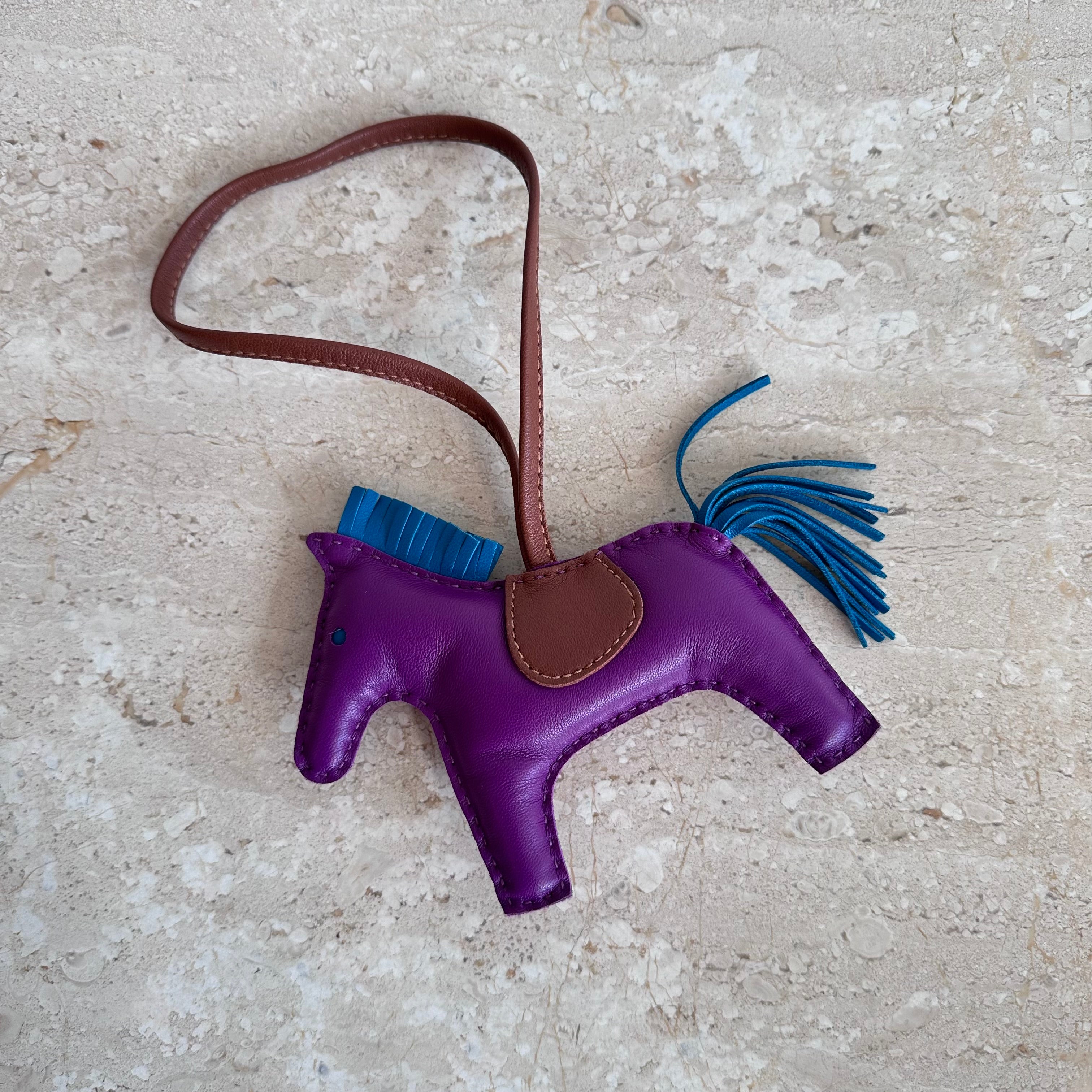 Pre-Owned Hermes Milo Lambskin Grigri Rodeo Horse Bag Charm MM in Anemone Bleu Izmir Fauve. Stuffed lambskin leather with fringe mane and tail. The sweetest adornment for your bag in a great colour!