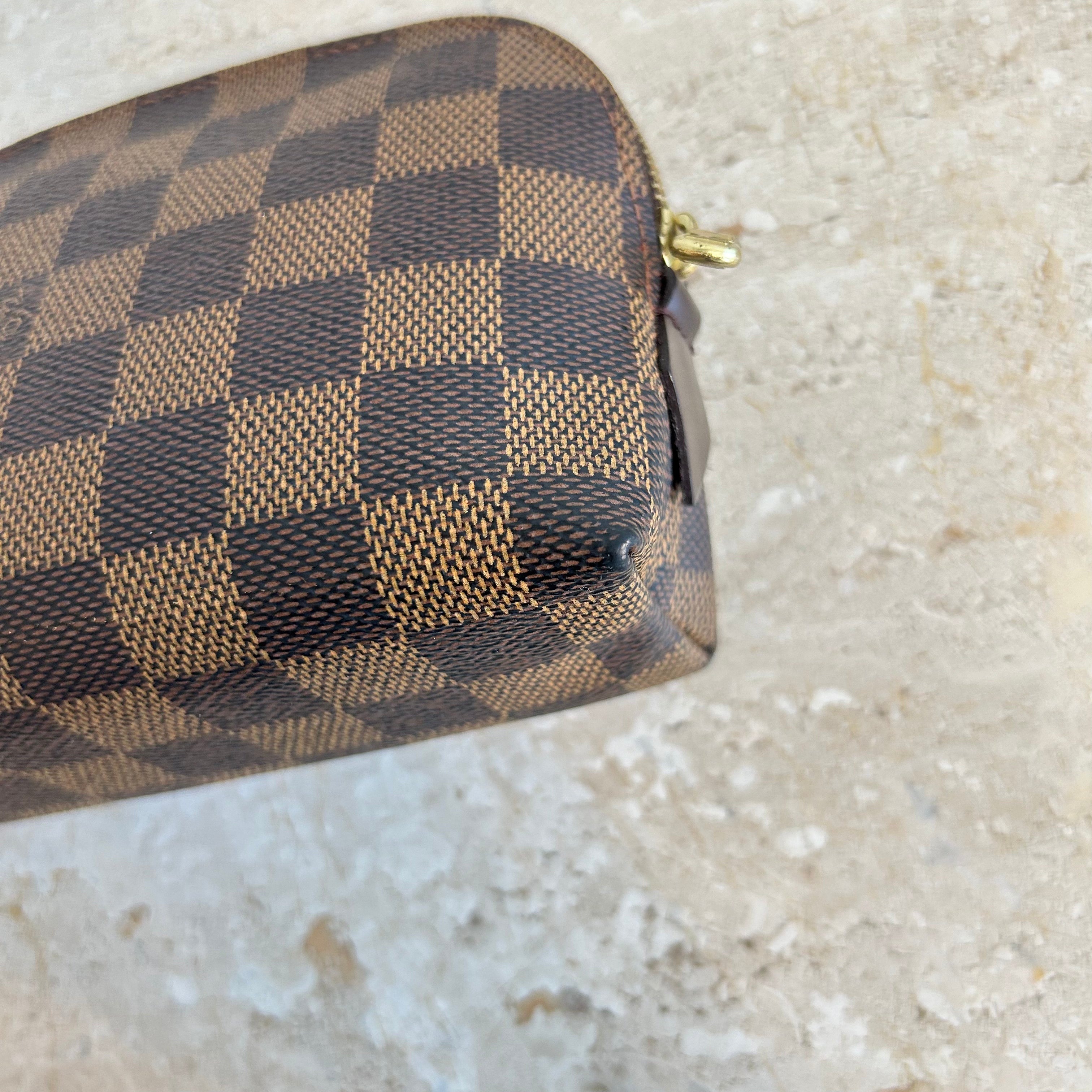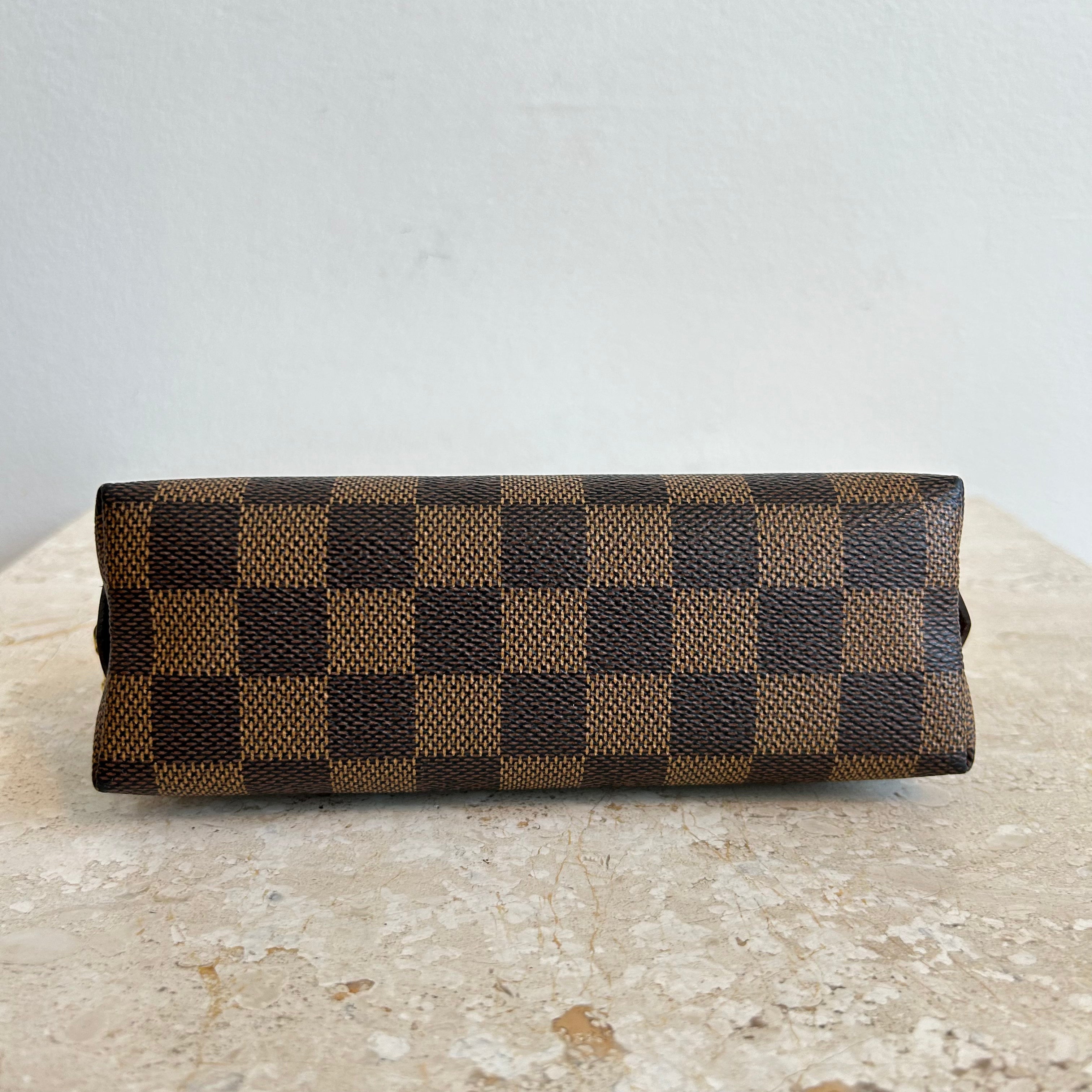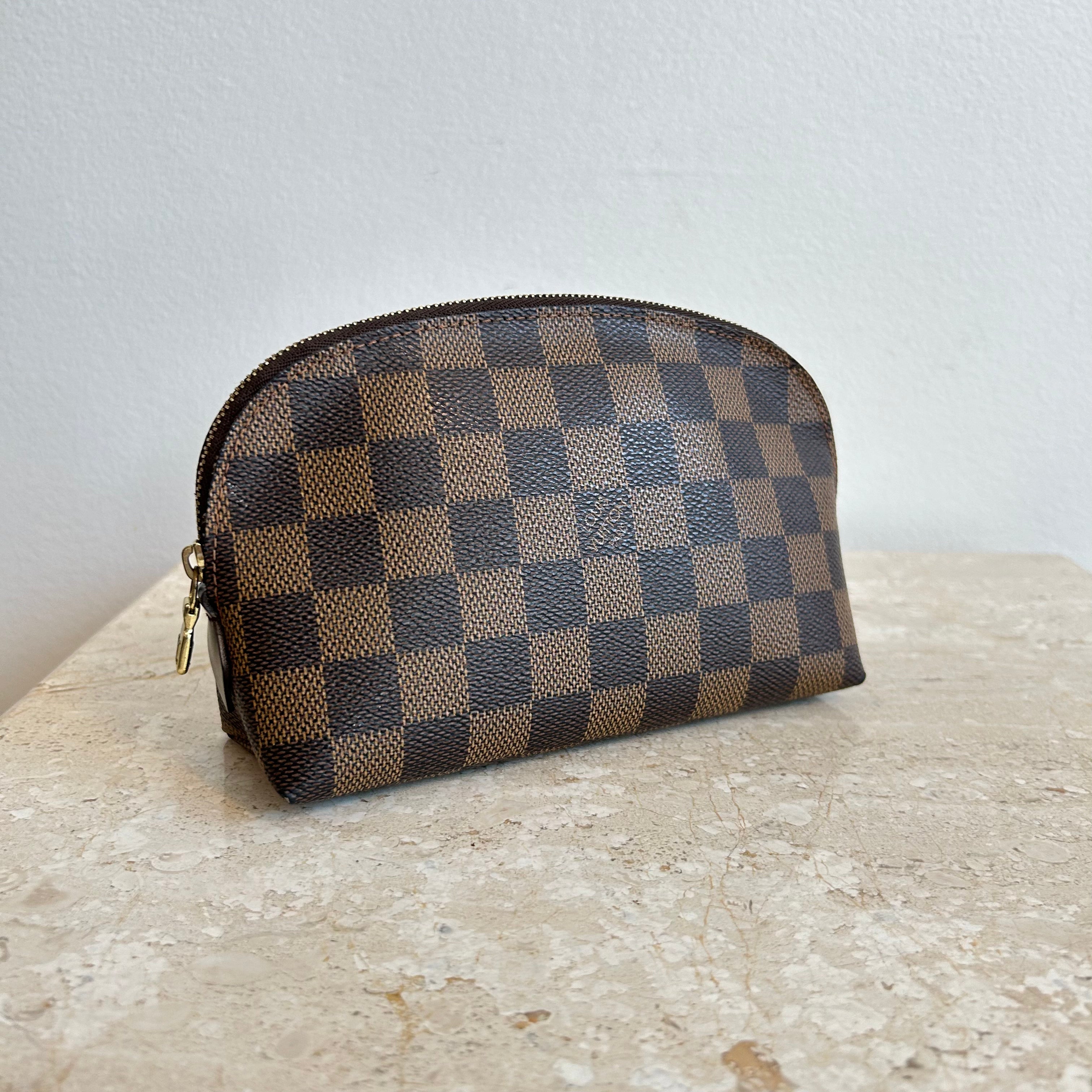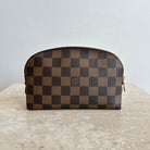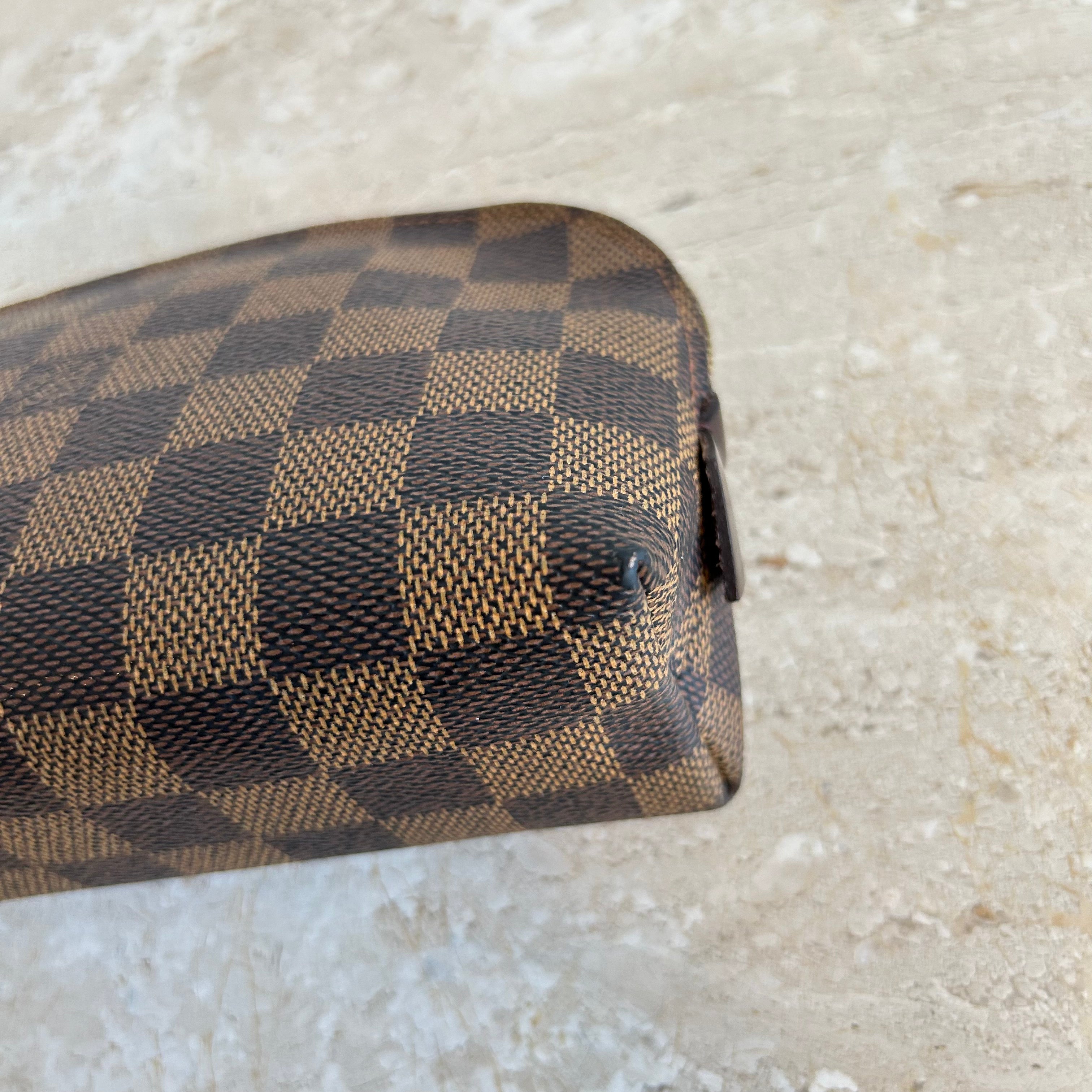 Pre-Owned Louis Vuitton Damier Ebene Cosmetic Pouch. Made in damier ebene canvas, this is the perfect pouch to keep your goodies together in your purse or workbag. With a top zipper and single interior slip pocket, this pouch is ideal for travelling and holding your cosmetics!
