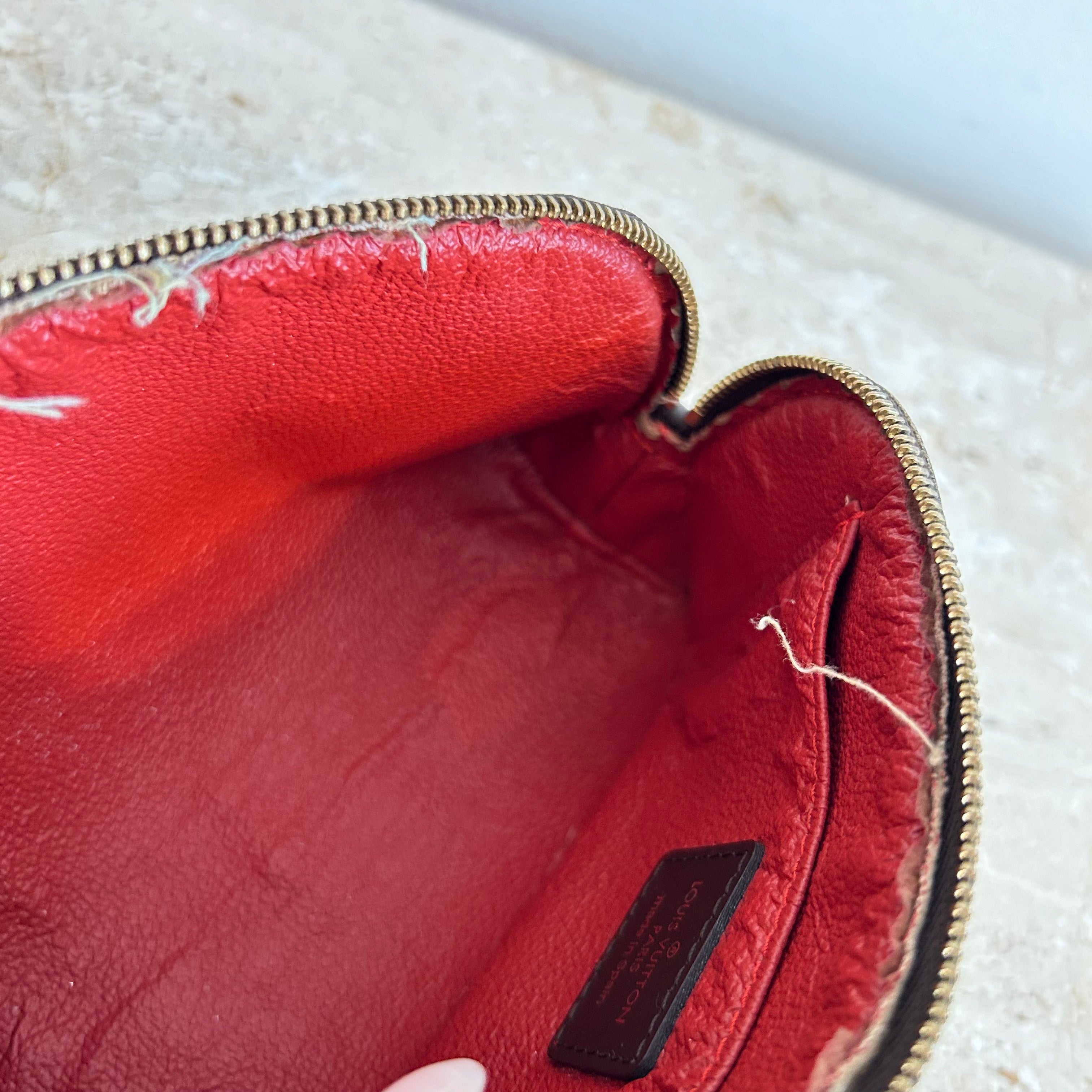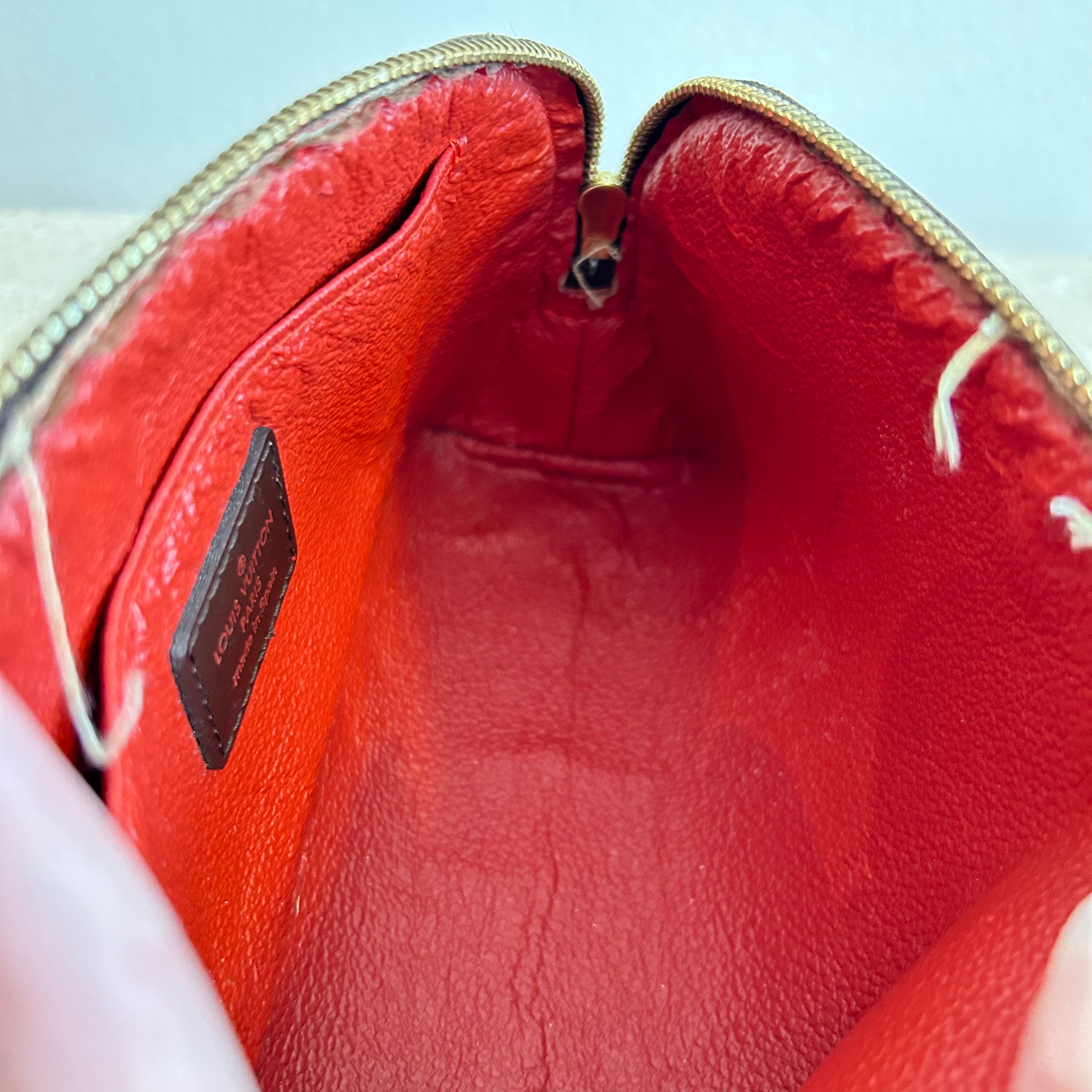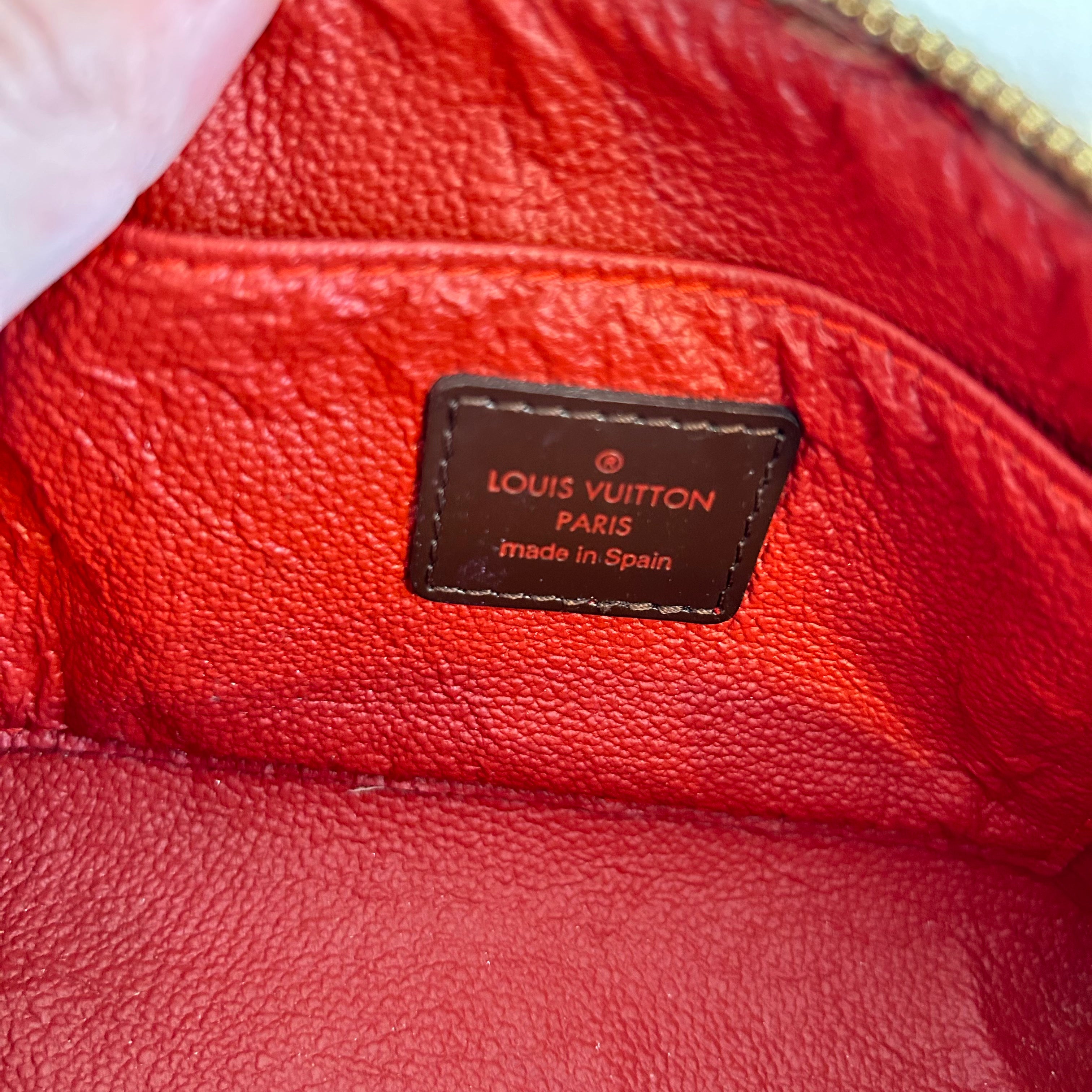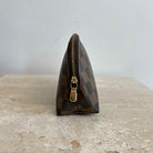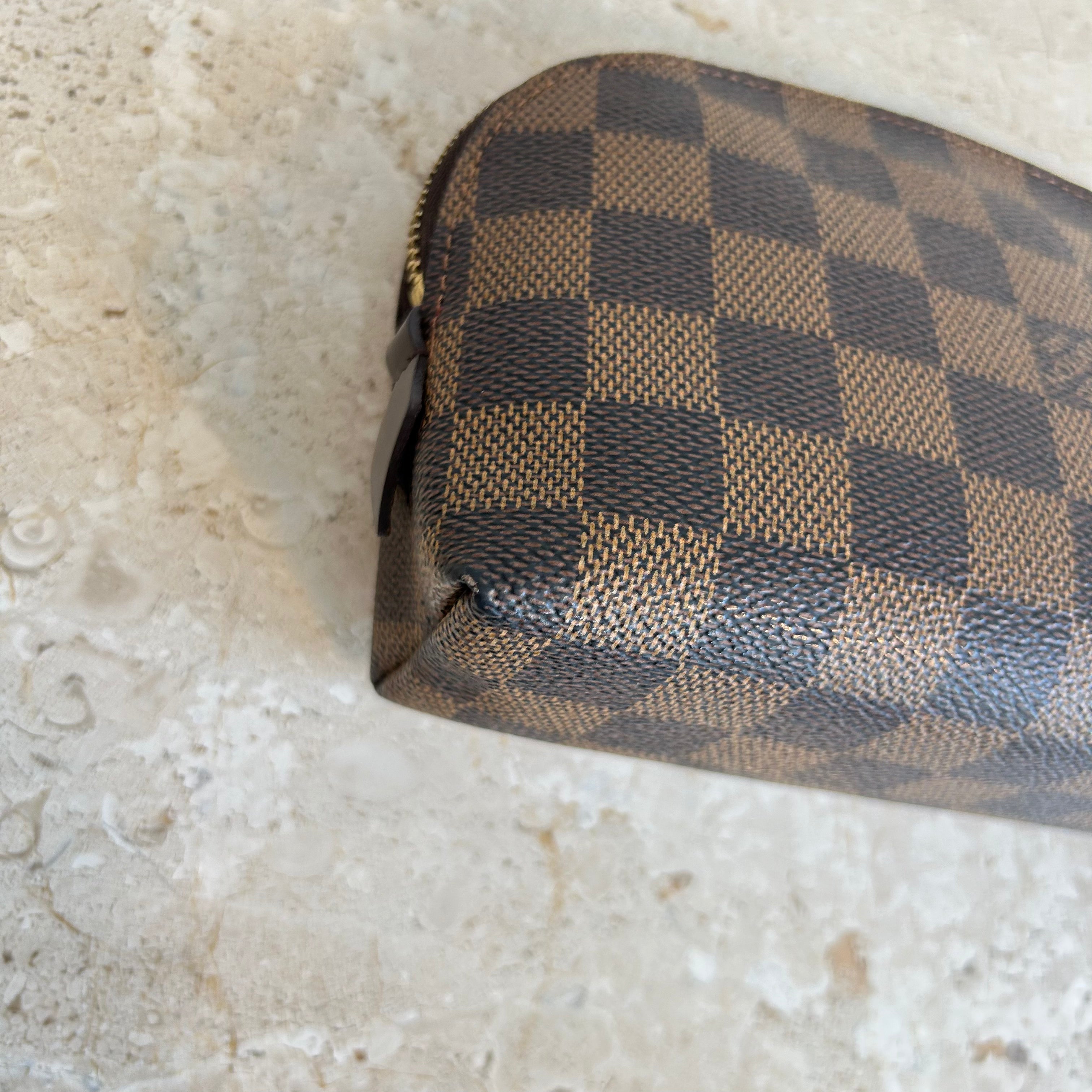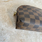 Pre-Owned Louis Vuitton Damier Ebene Cosmetic Pouch. Made in damier ebene canvas, this is the perfect pouch to keep your goodies together in your purse or workbag. With a top zipper and single interior slip pocket, this pouch is ideal for travelling and holding your cosmetics!
