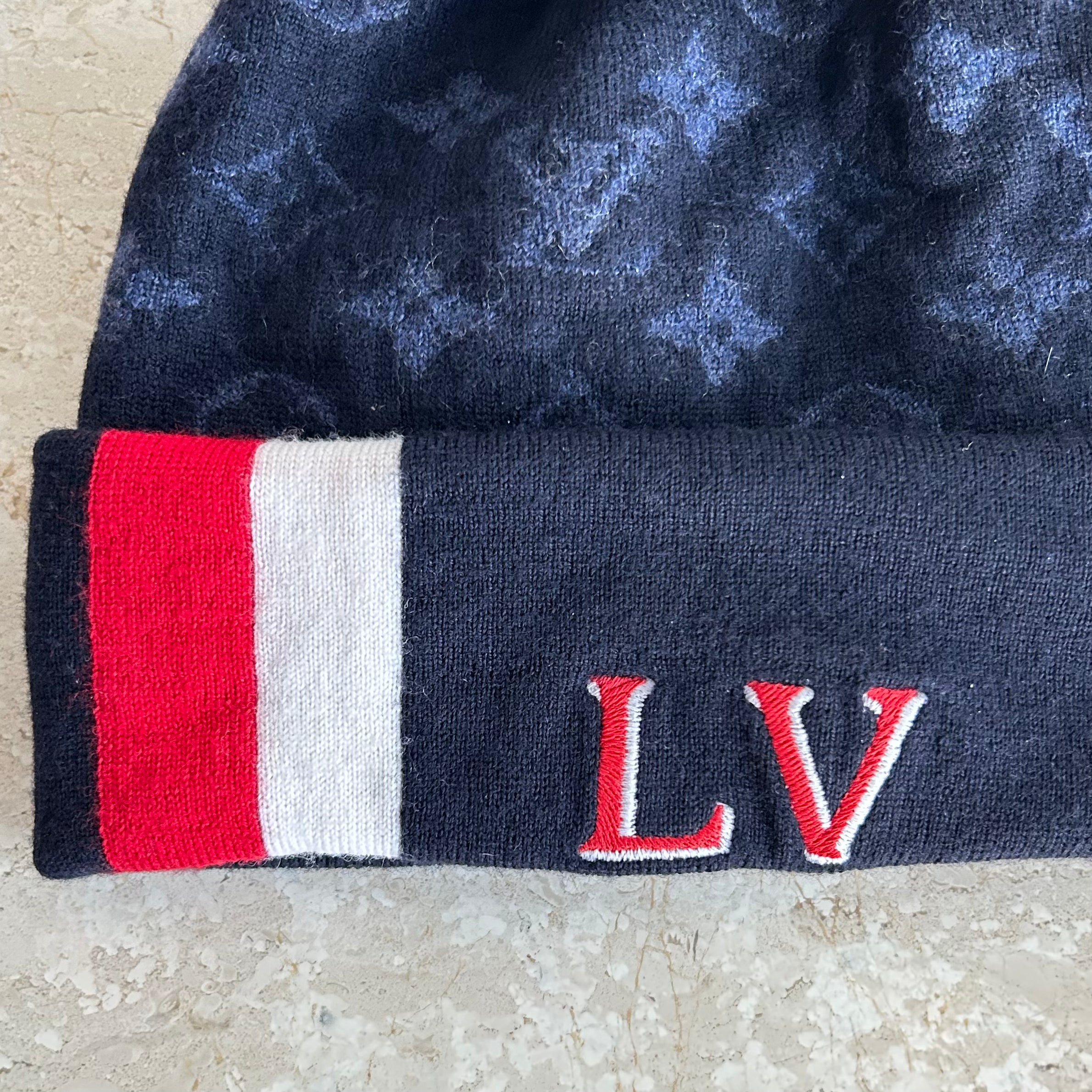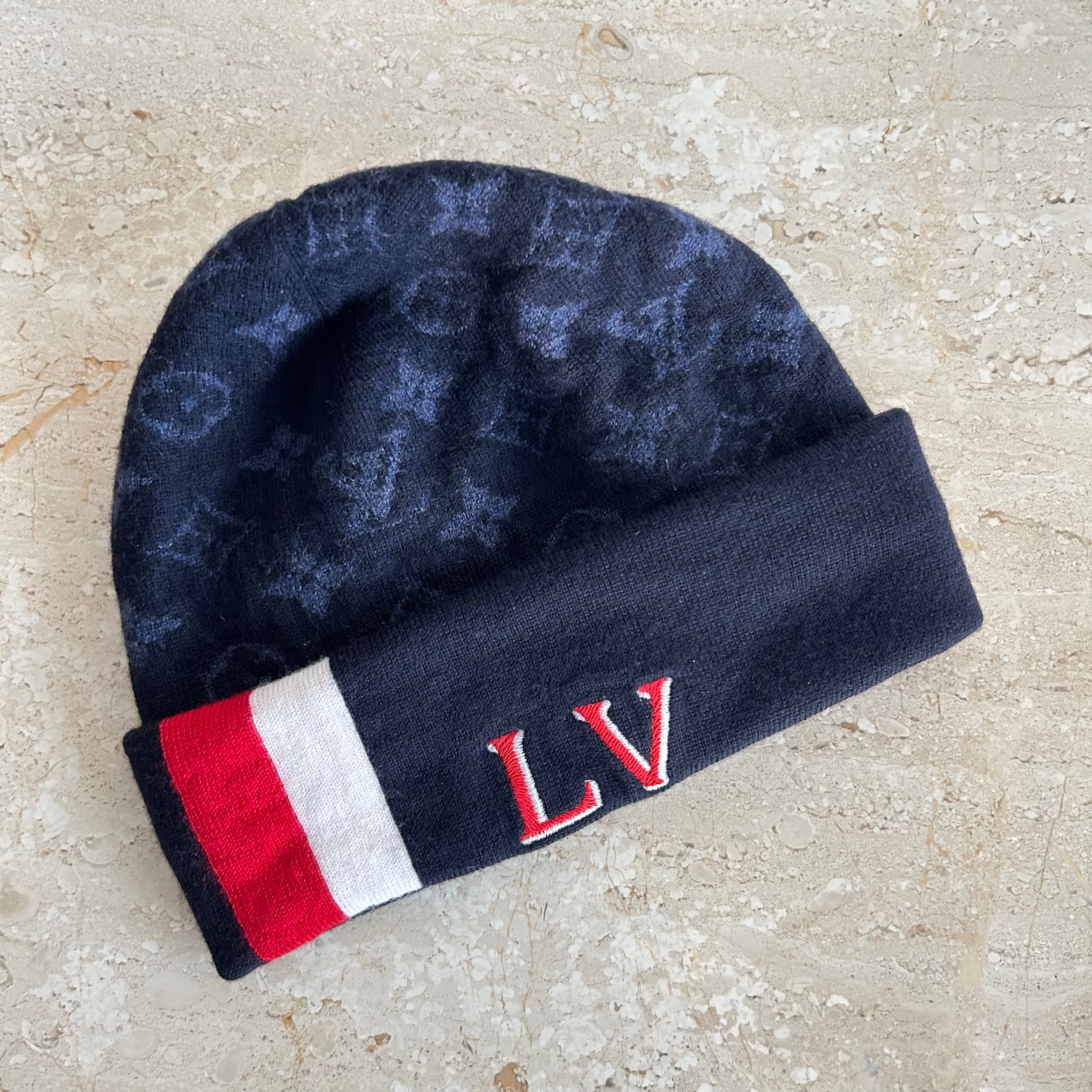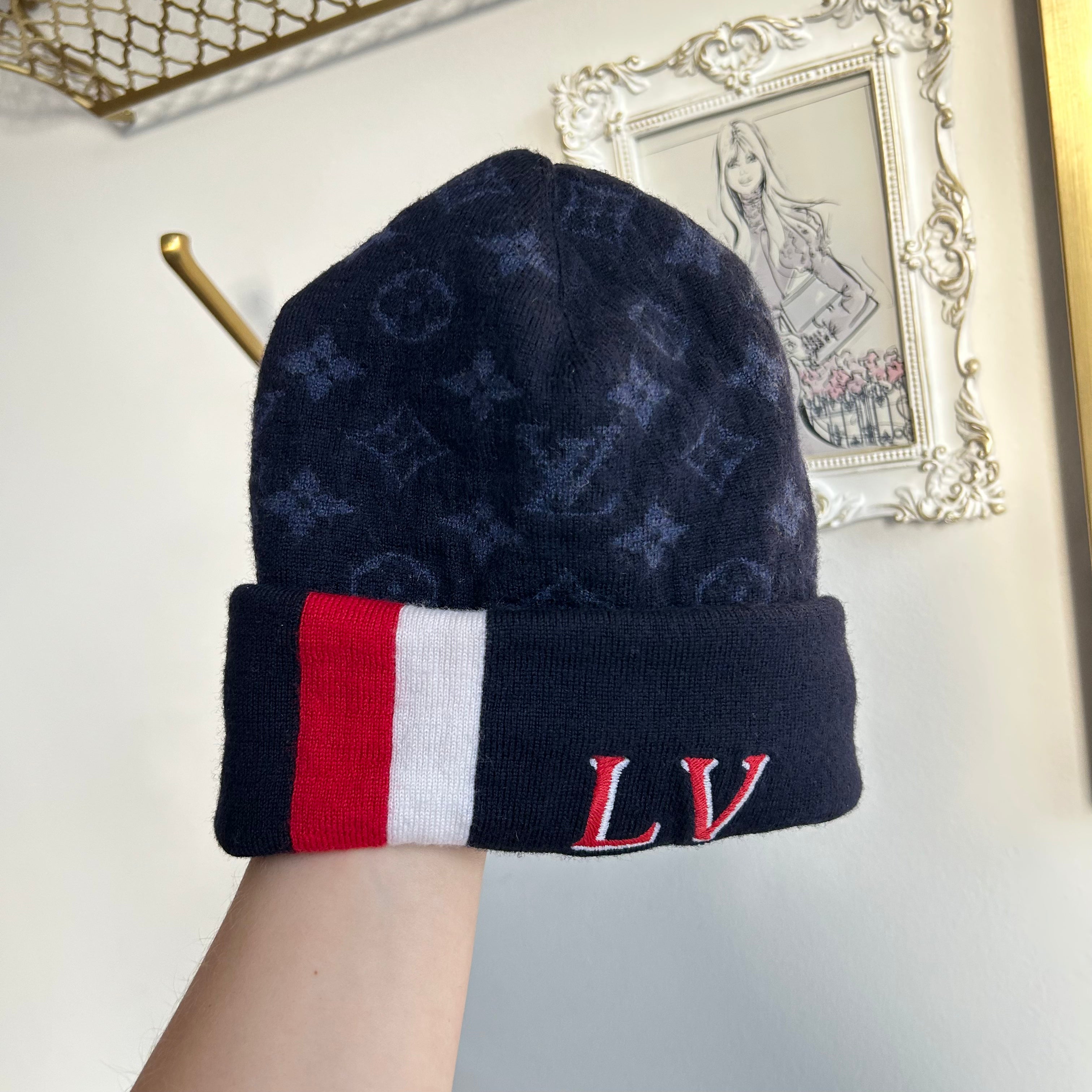 Pre-Owned Louis Vuitton Navy Blue LV Varsity Beanie Toque. Crafted in 100% wool, this navy blue beanie features the house monogram motifs throughout, and the house initials in red and white across the front. A fab piece to keep you warm all winter! *Perfume Scent