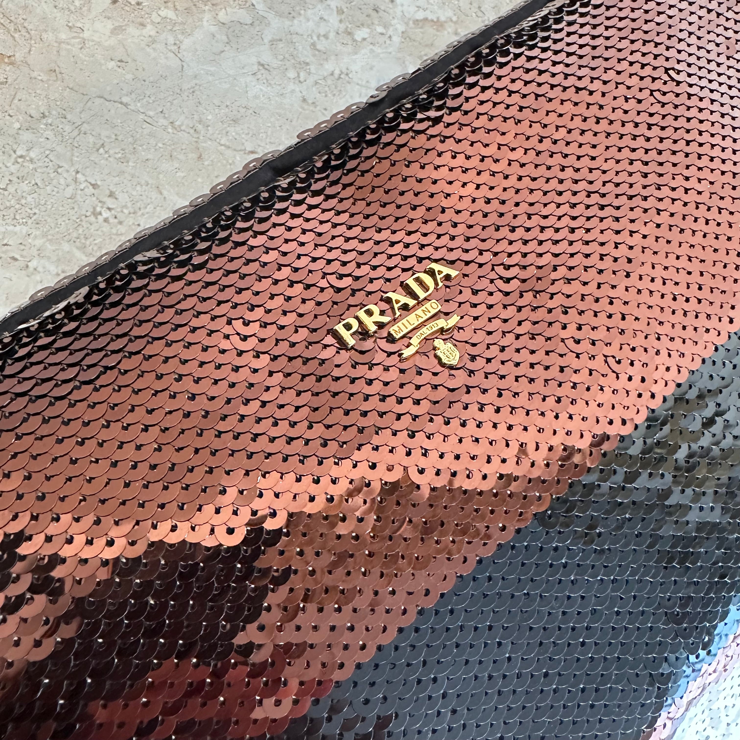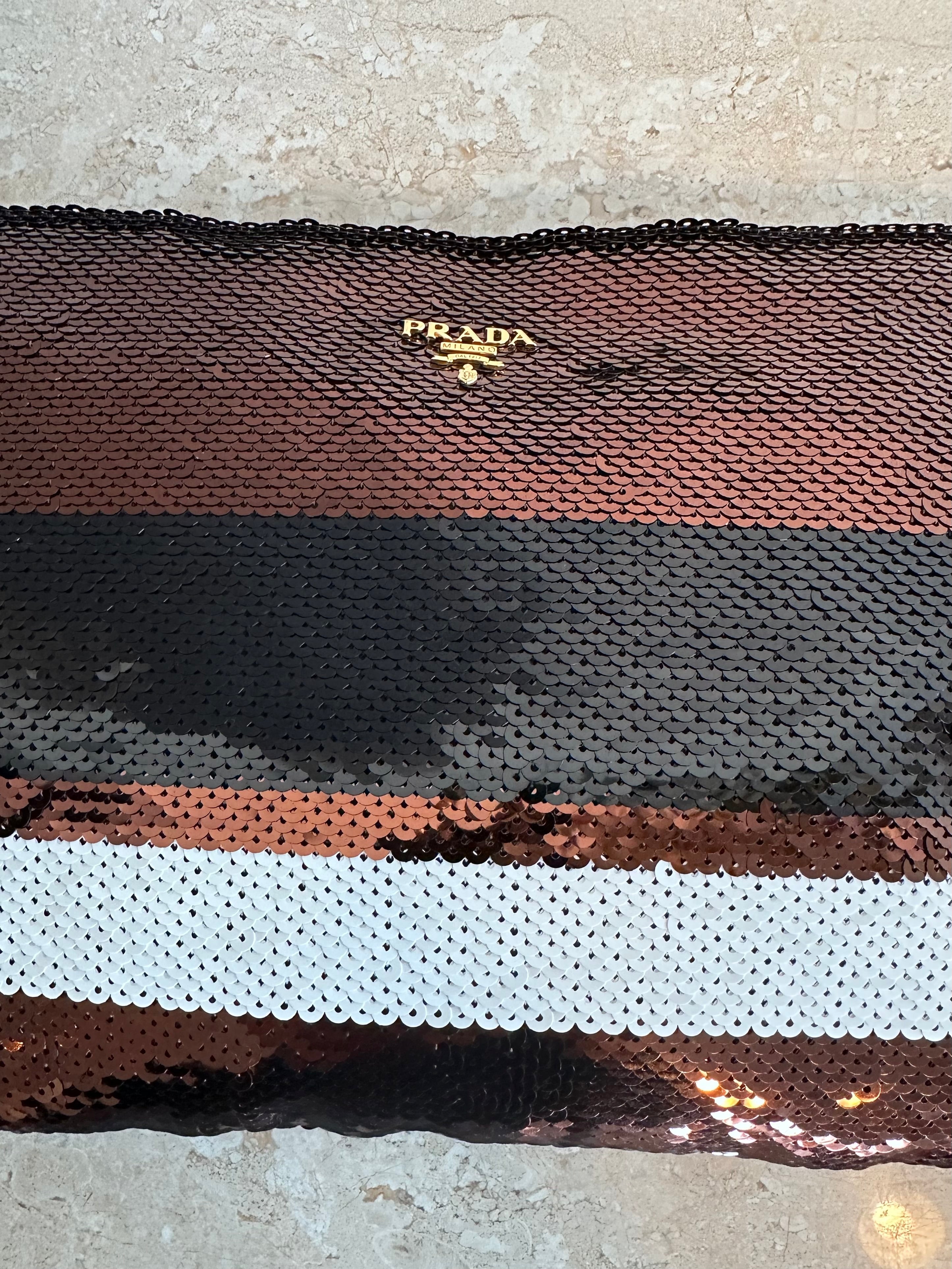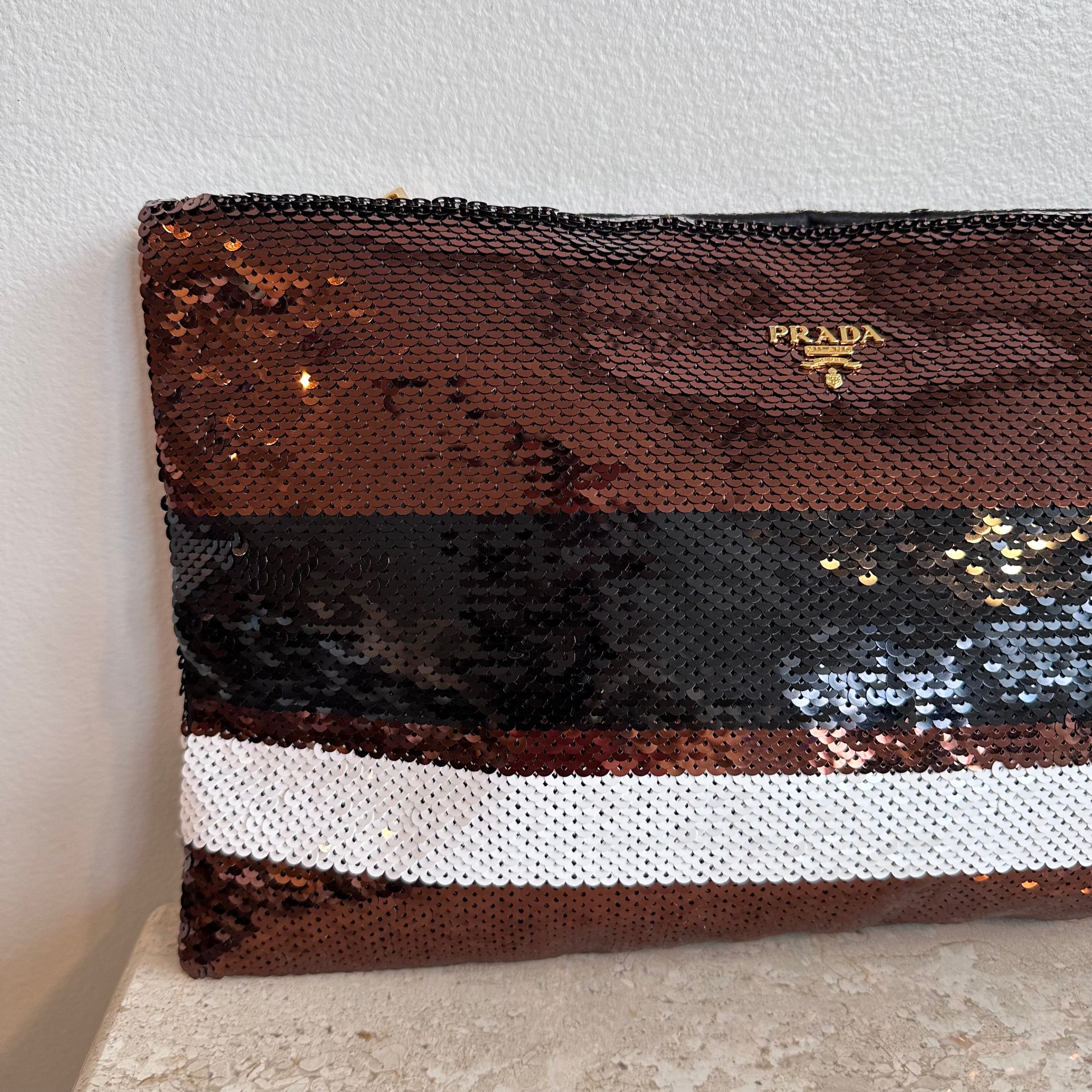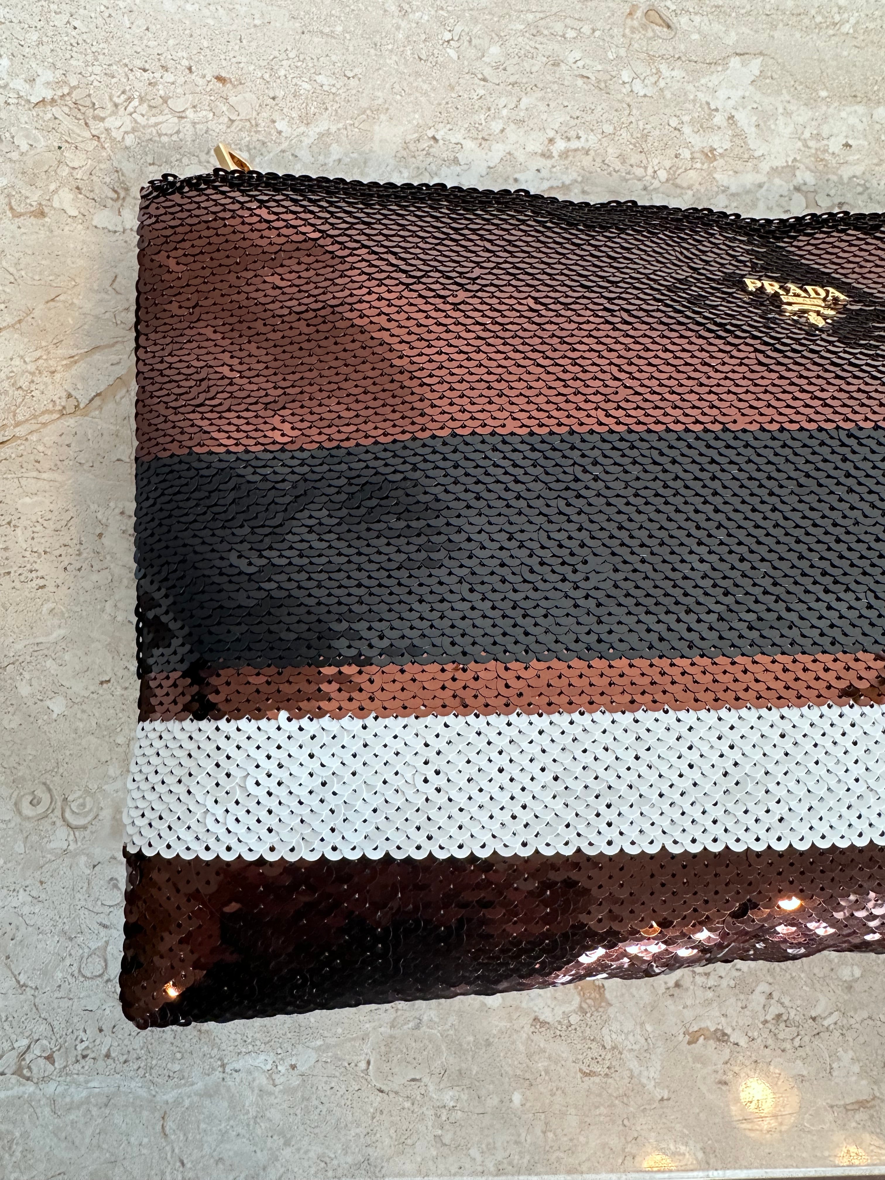 Pre-Owned Prada Paillettes Pochette Sequin Clutch. Brown sequins with a black and white stripe. Gold tone hardware including outer logo and top zipper. Fabric lined interior hosts a zip pocket and 2 slip pockets. The perfect evening bag!