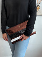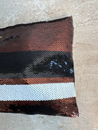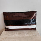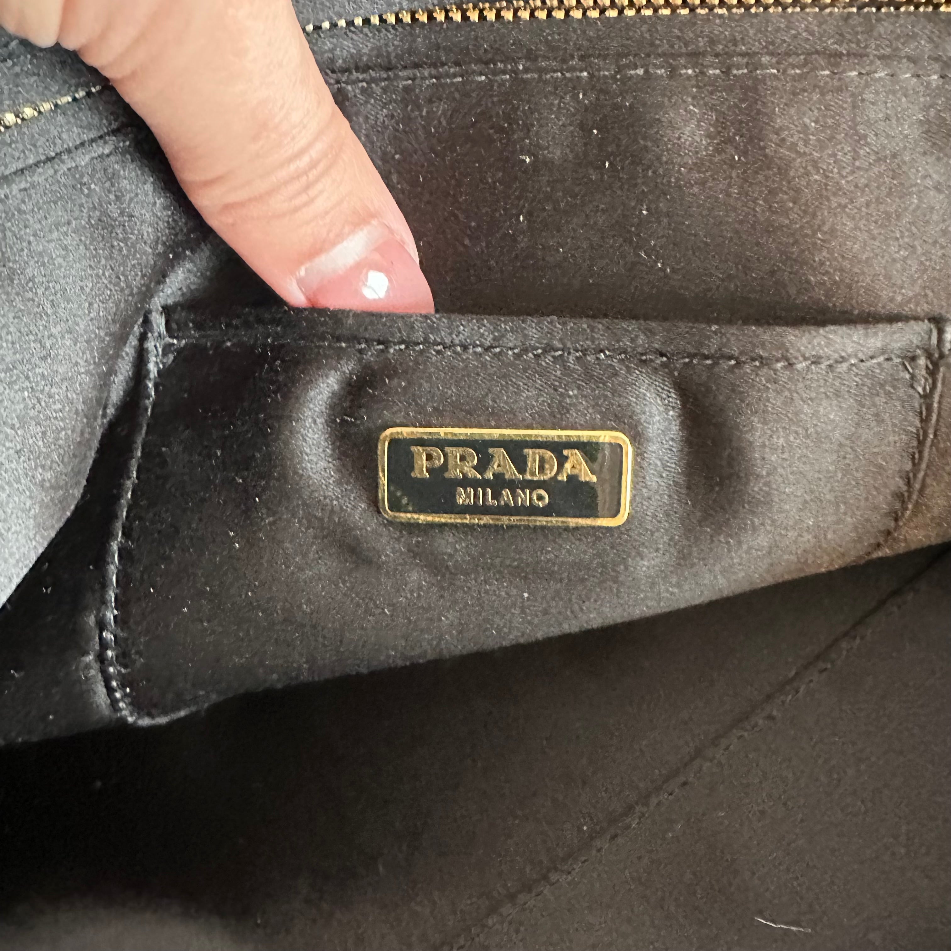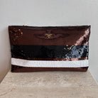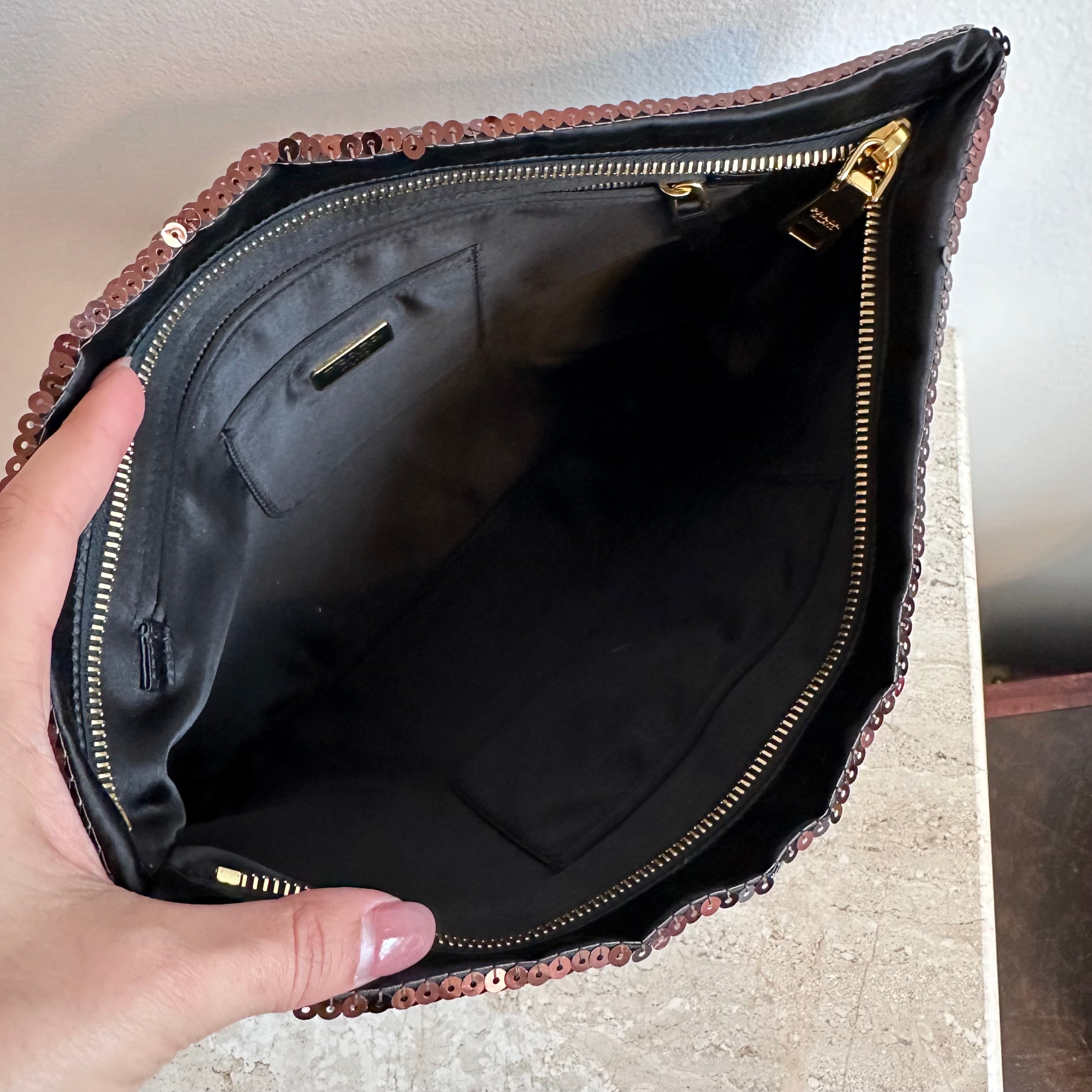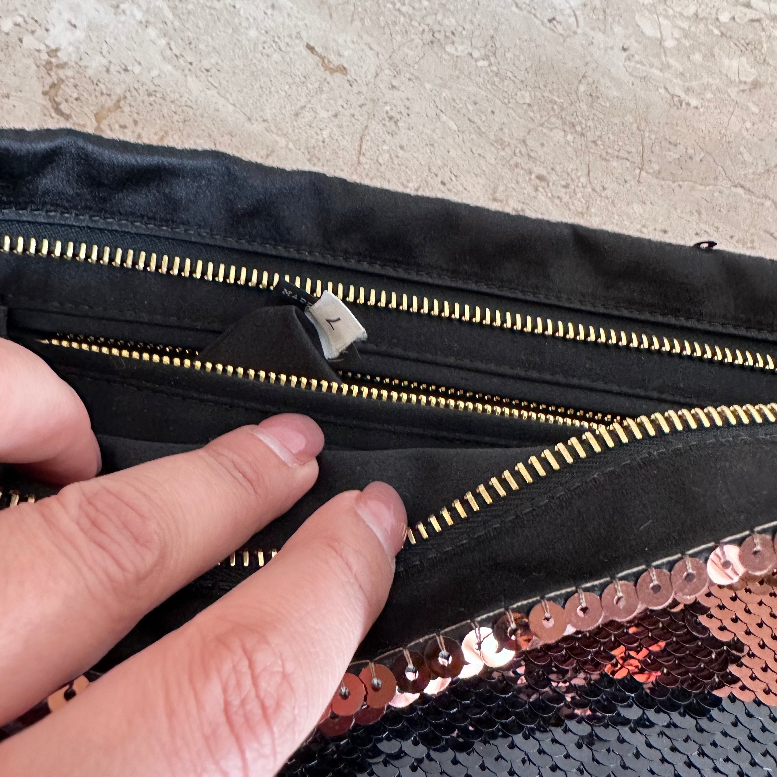 Pre-Owned Prada Paillettes Pochette Sequin Clutch. Brown sequins with a black and white stripe. Gold tone hardware including outer logo and top zipper. Fabric lined interior hosts a zip pocket and 2 slip pockets. The perfect evening bag!