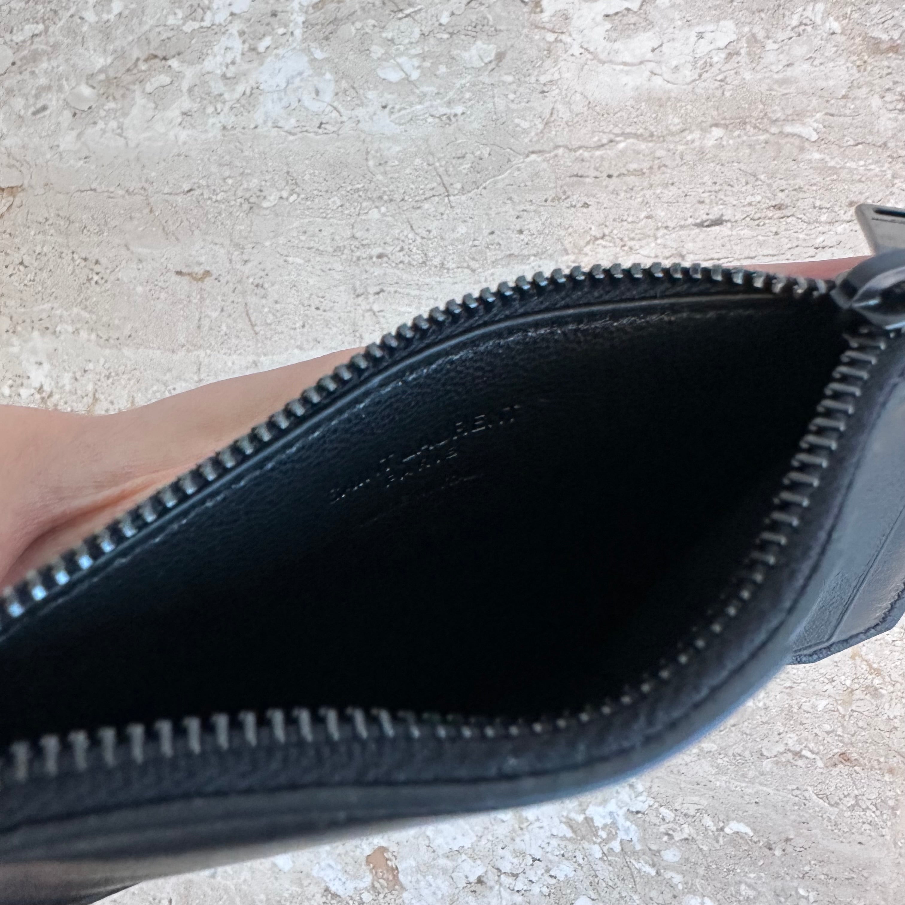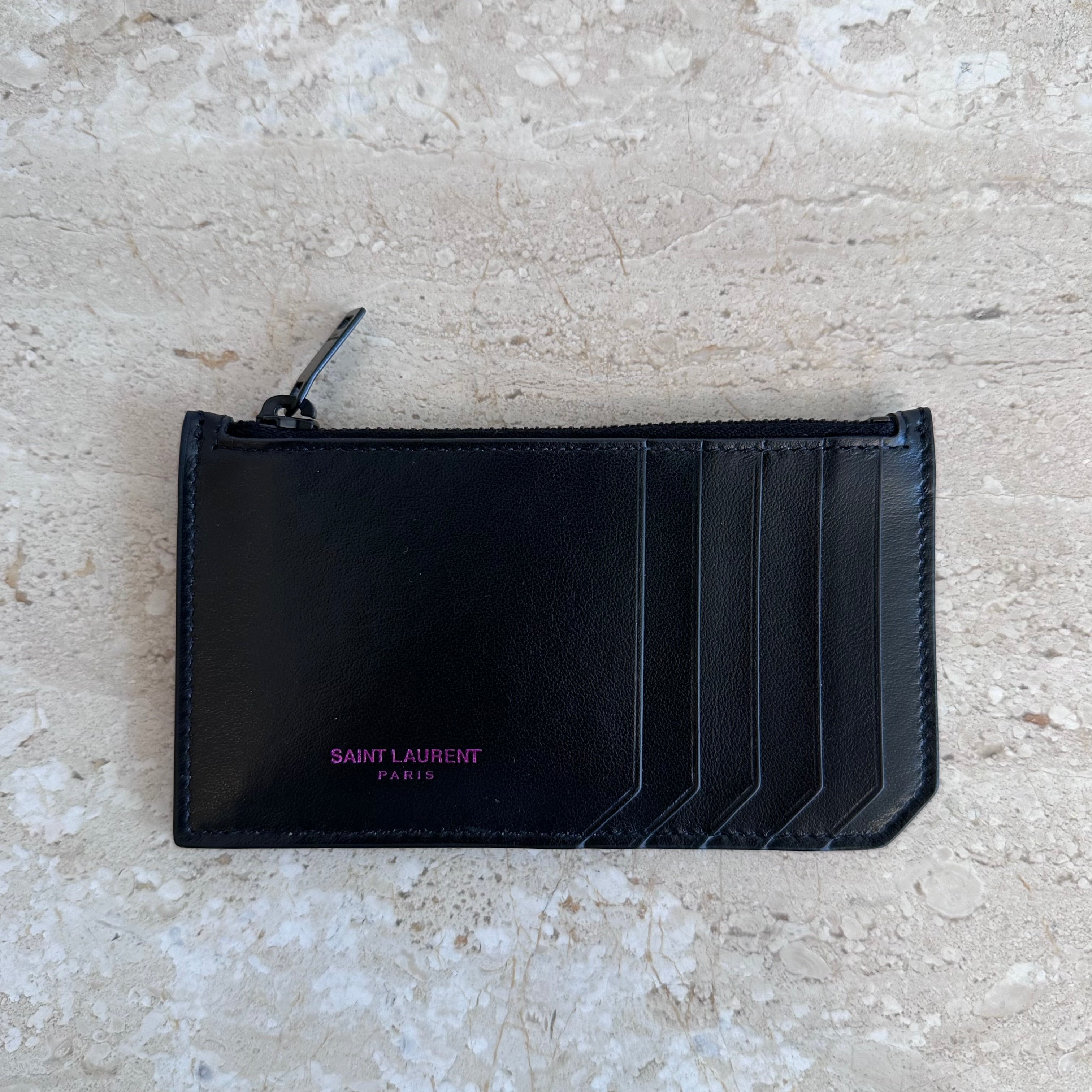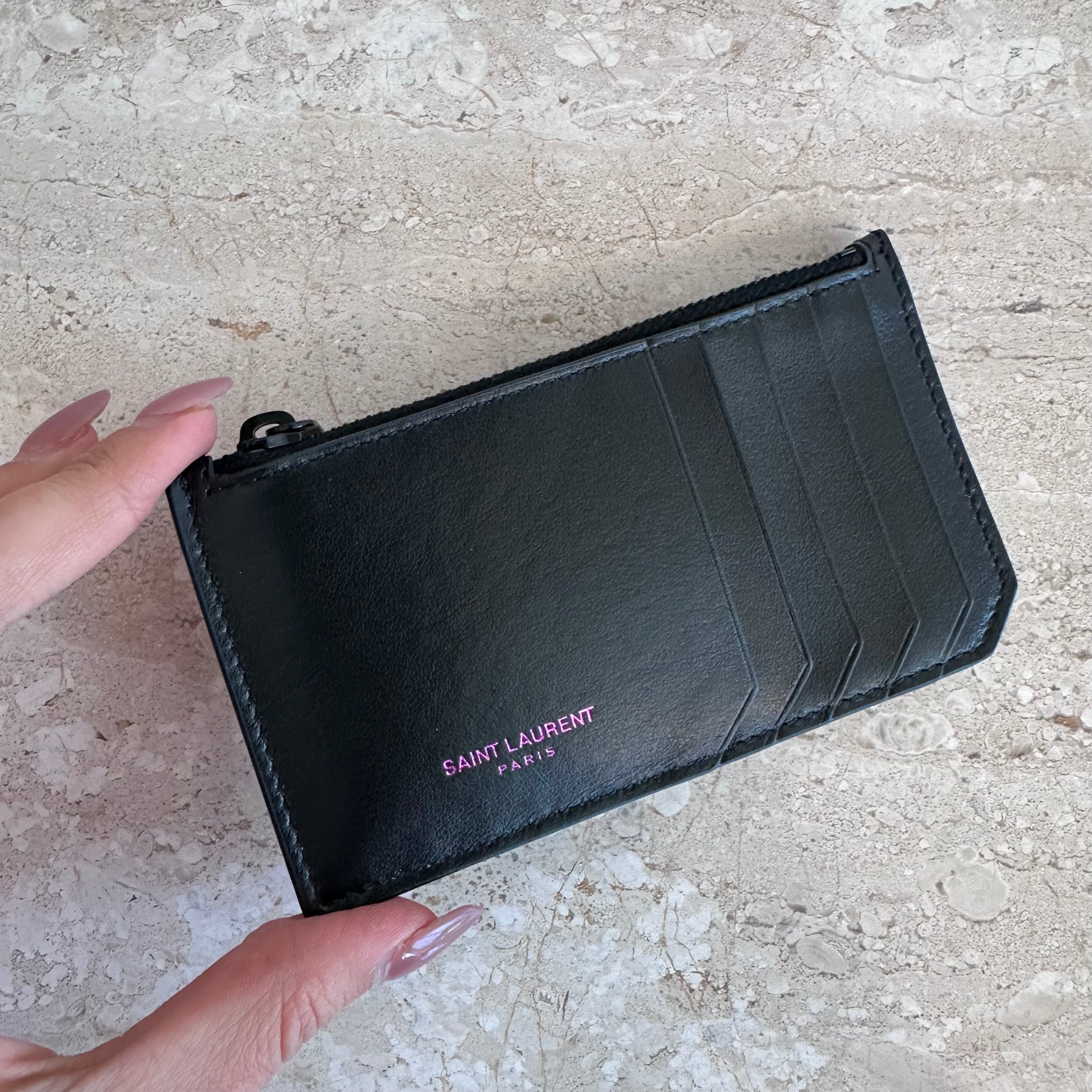 Pre-Owned Saint Laurent Black Zip Card Case with Pink Foil. This black leather card case has 5 card slots and a zipper pocket for change. With the pink foil logo on the front, this is a subtle piece but has an abundace of style.