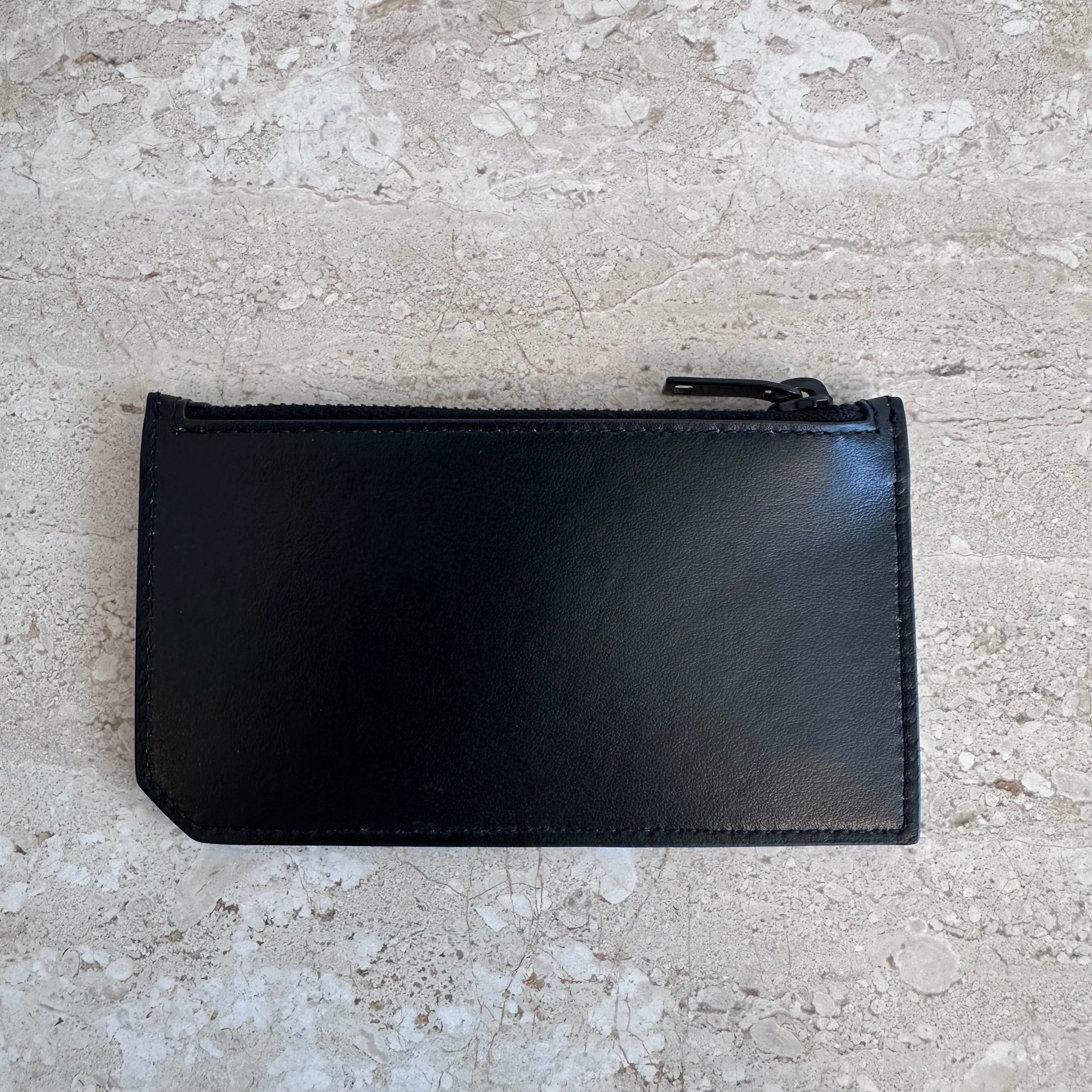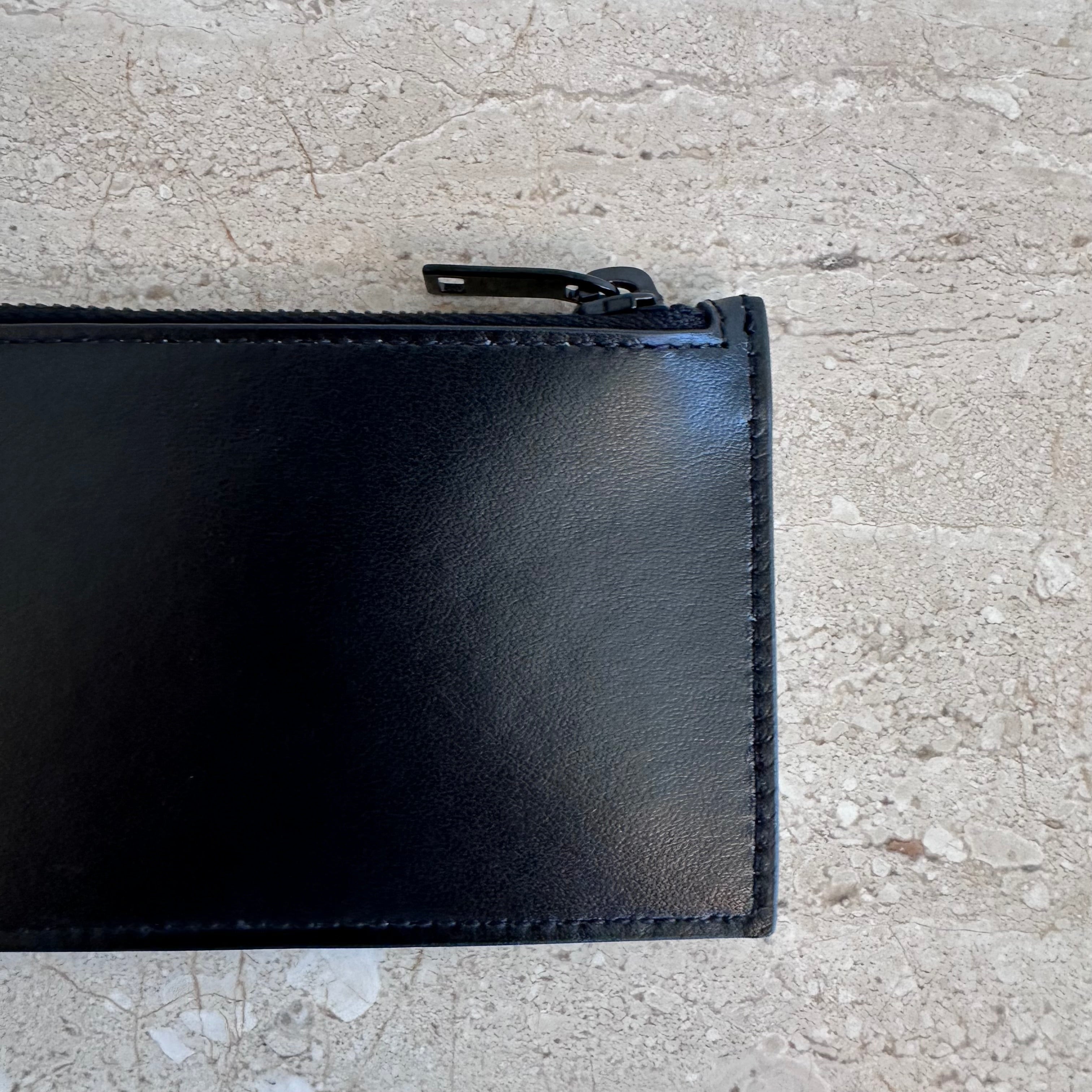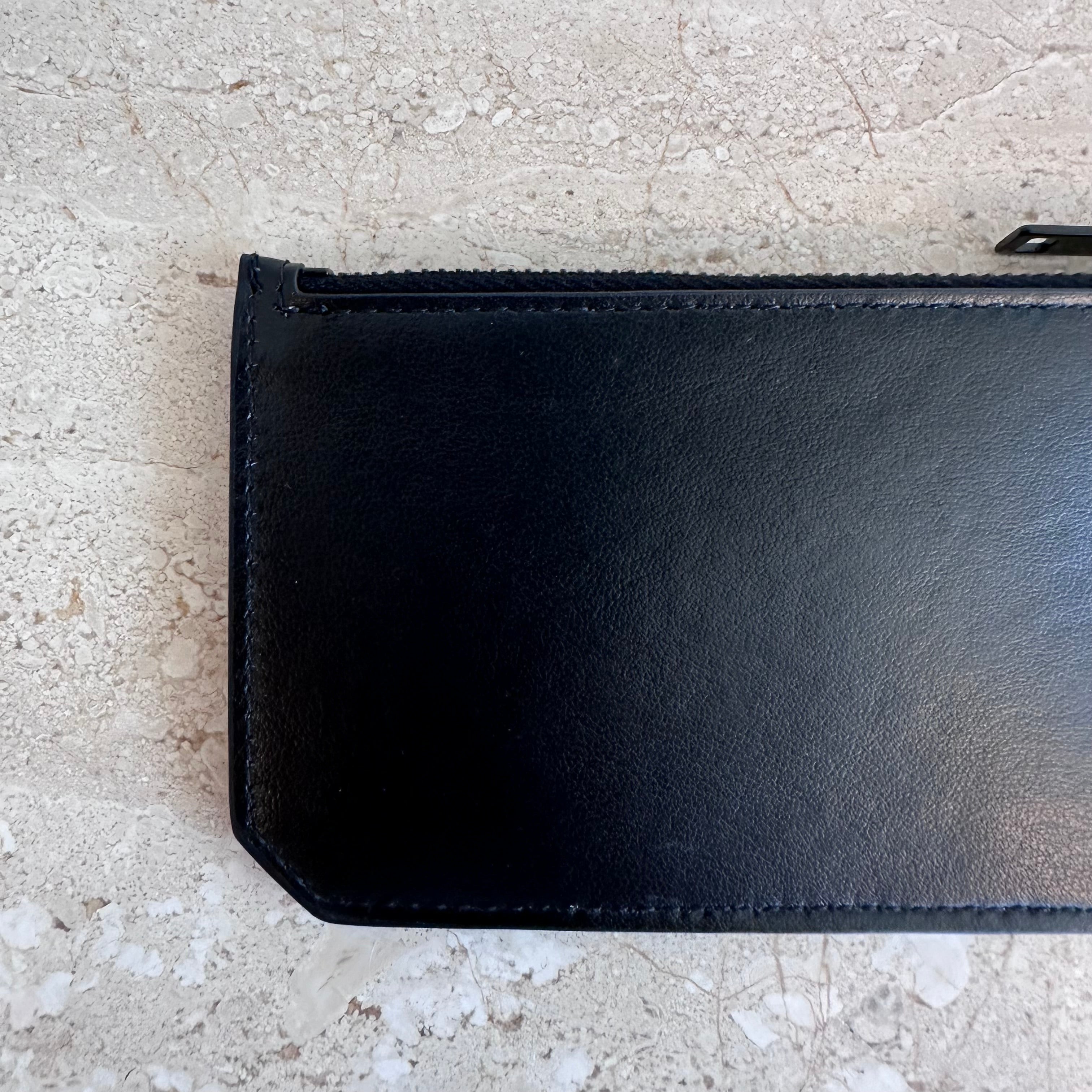 Pre-Owned Saint Laurent Black Zip Card Case with Pink Foil. This black leather card case has 5 card slots and a zipper pocket for change. With the pink foil logo on the front, this is a subtle piece but has an abundace of style.