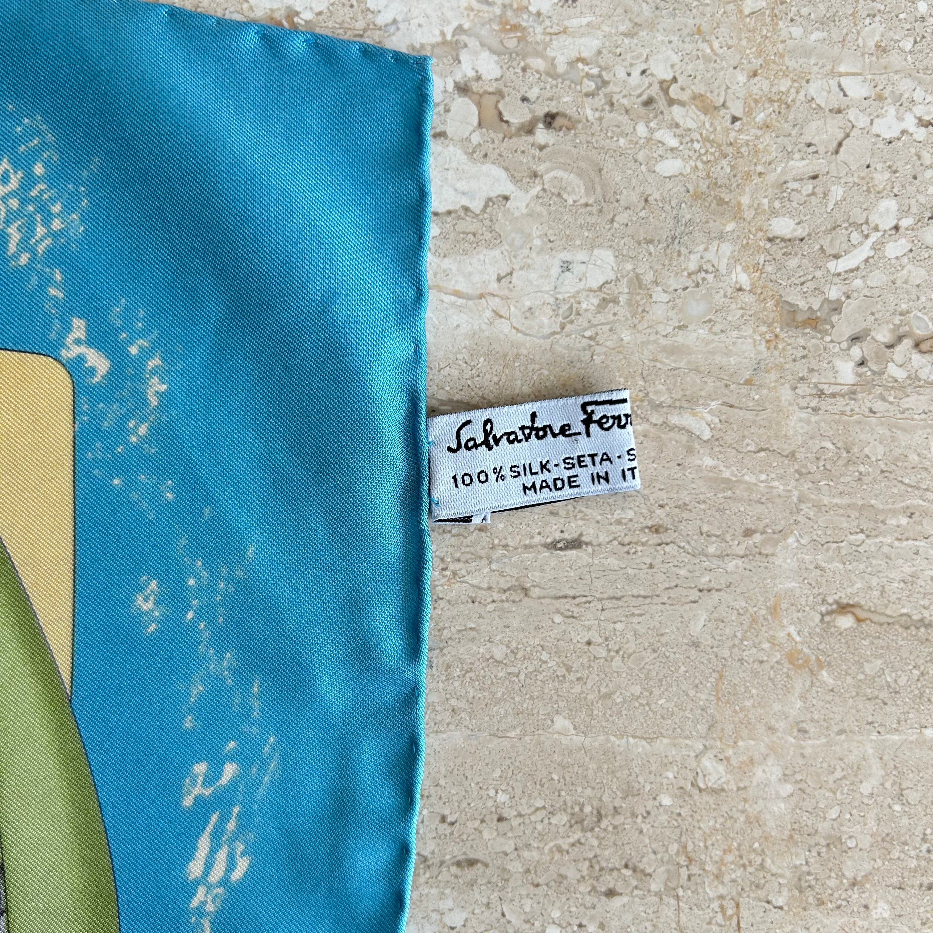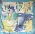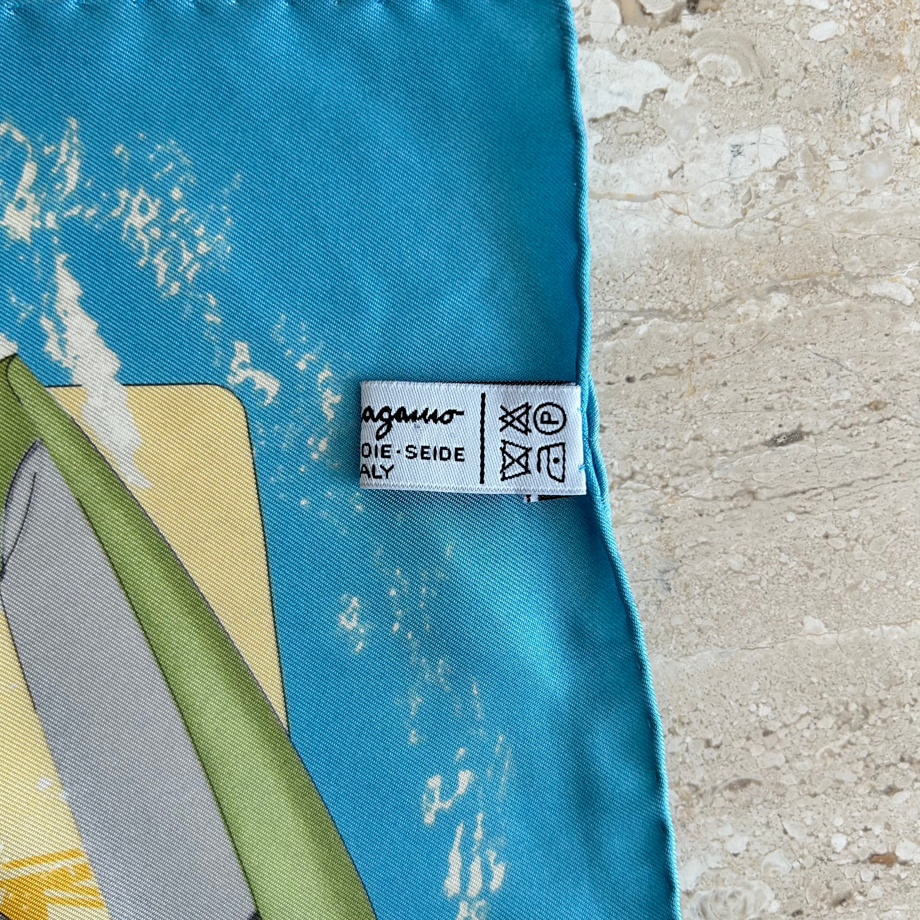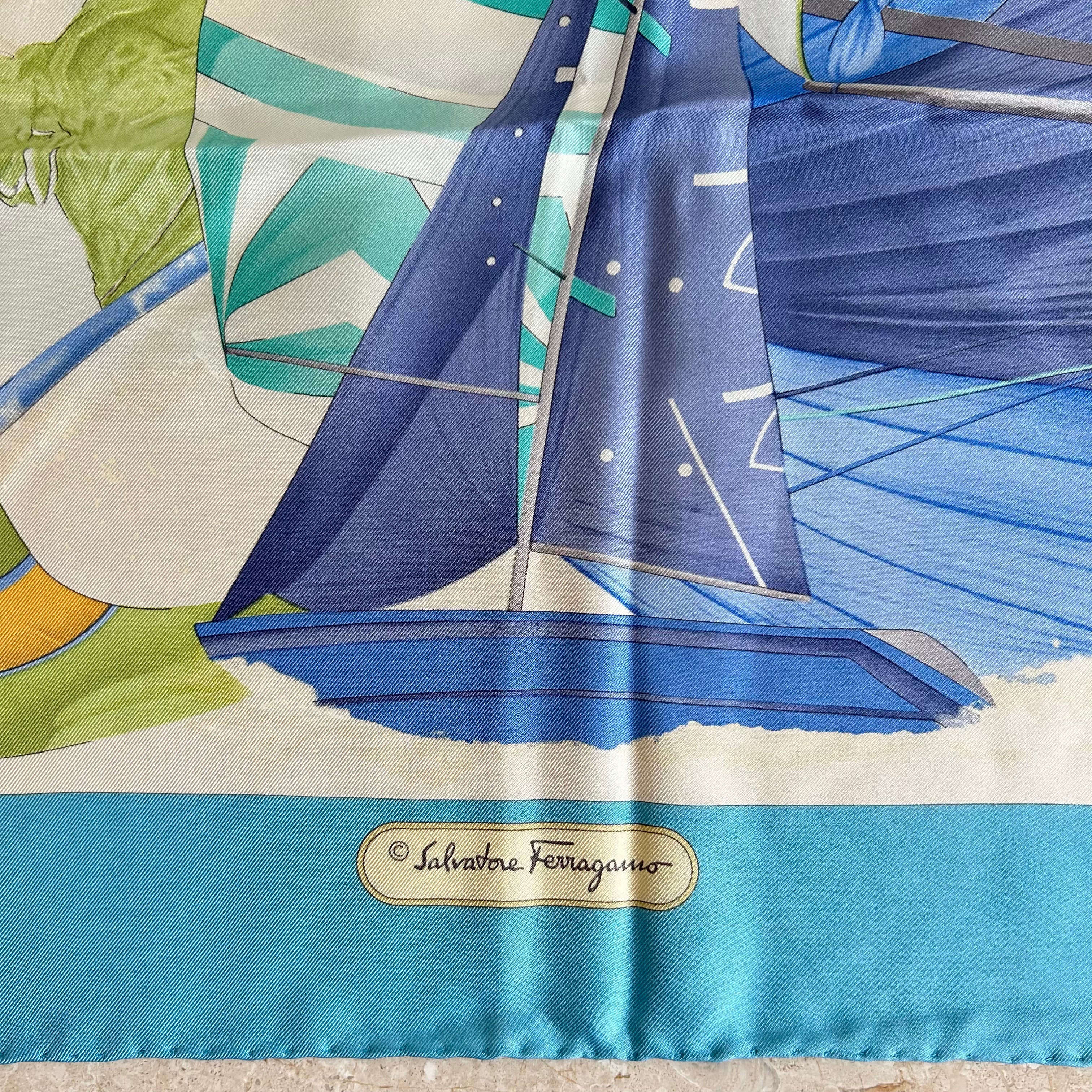 Pre-owned Salvatore Ferragamo Sailing Scene Scarf. This luxurious scarf is crafted from 100% silk and features a detailed sailing scene in calming shades of blue, green, and yellow. Finished with elegant hand-rolled edges, this piece adds elegance to any look!