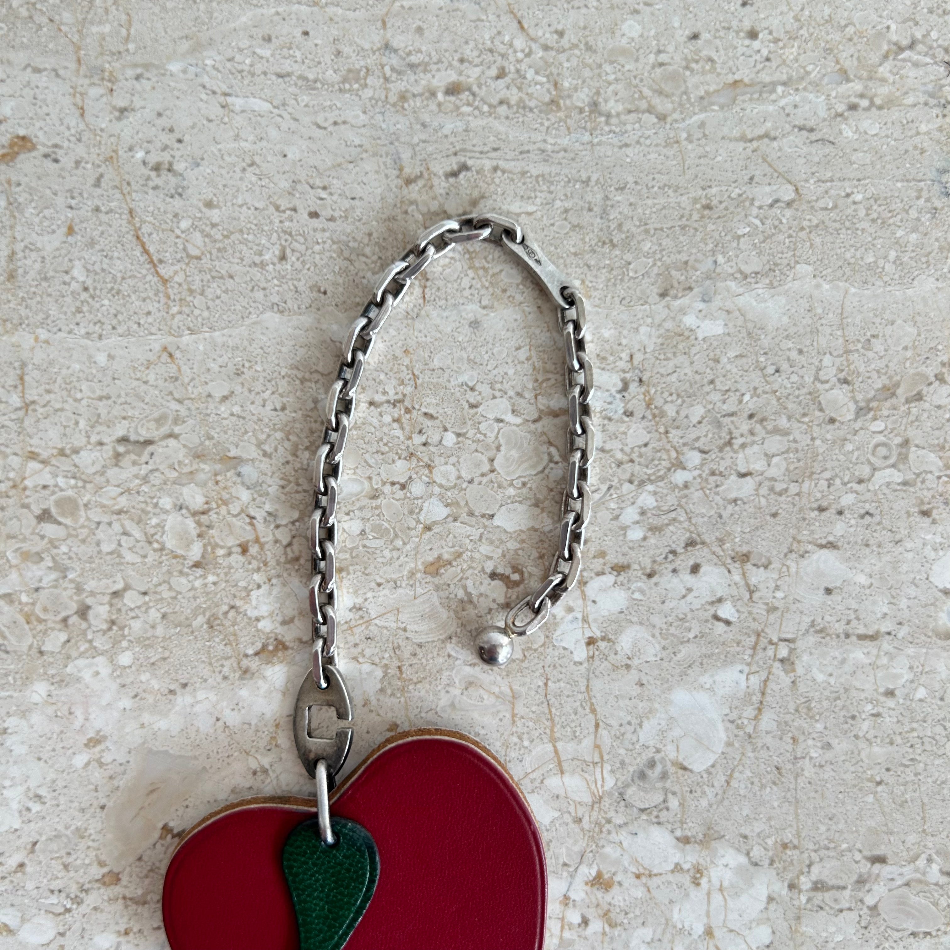 Pre-Owned Hermes Vintage Leather Apple Charm. In red box calf leather, this apple motif charm is on a silver tone hardware chain with a ball stud clasp. Green leather leaf features the house name stamped on the back. Such a fun charm for your keys or bag!