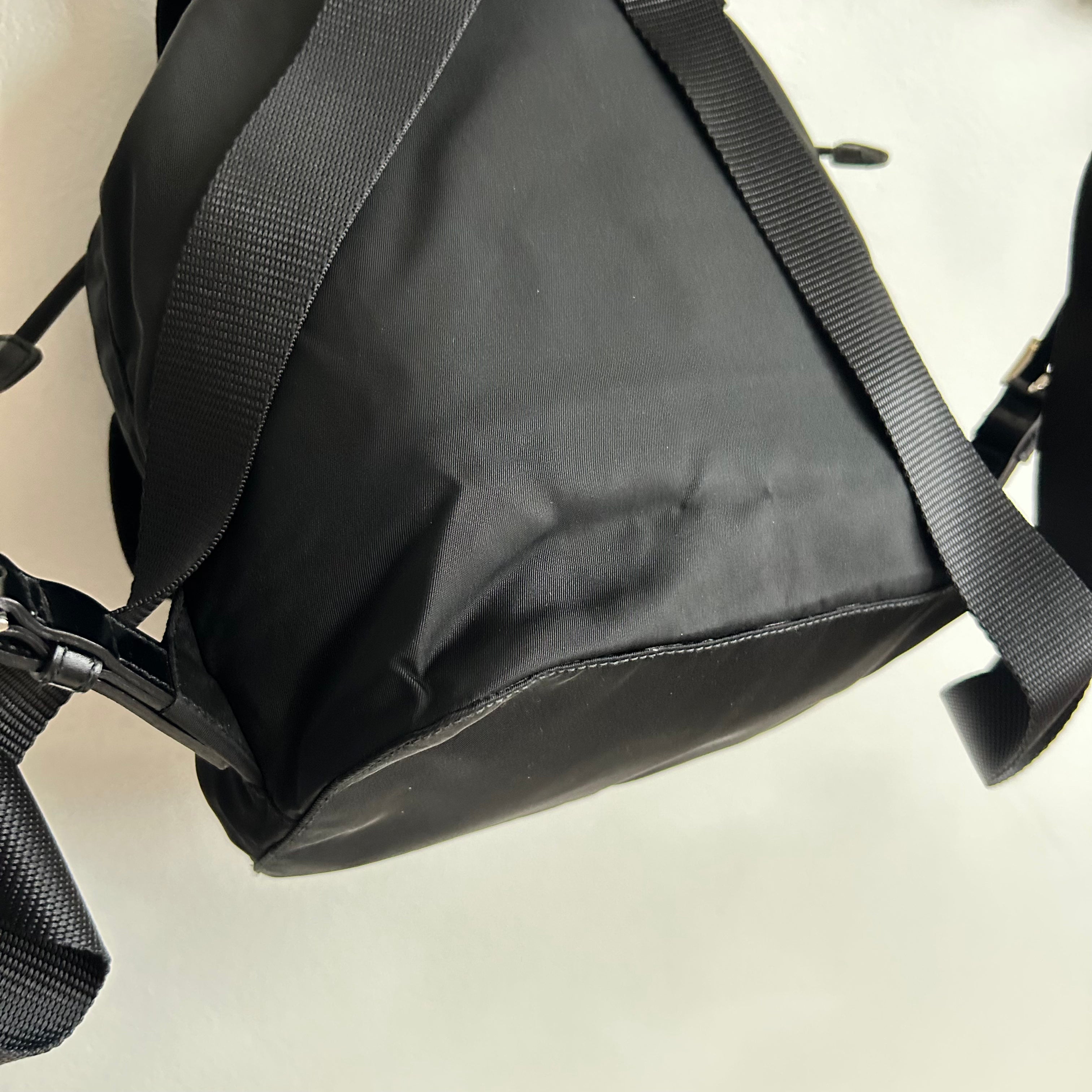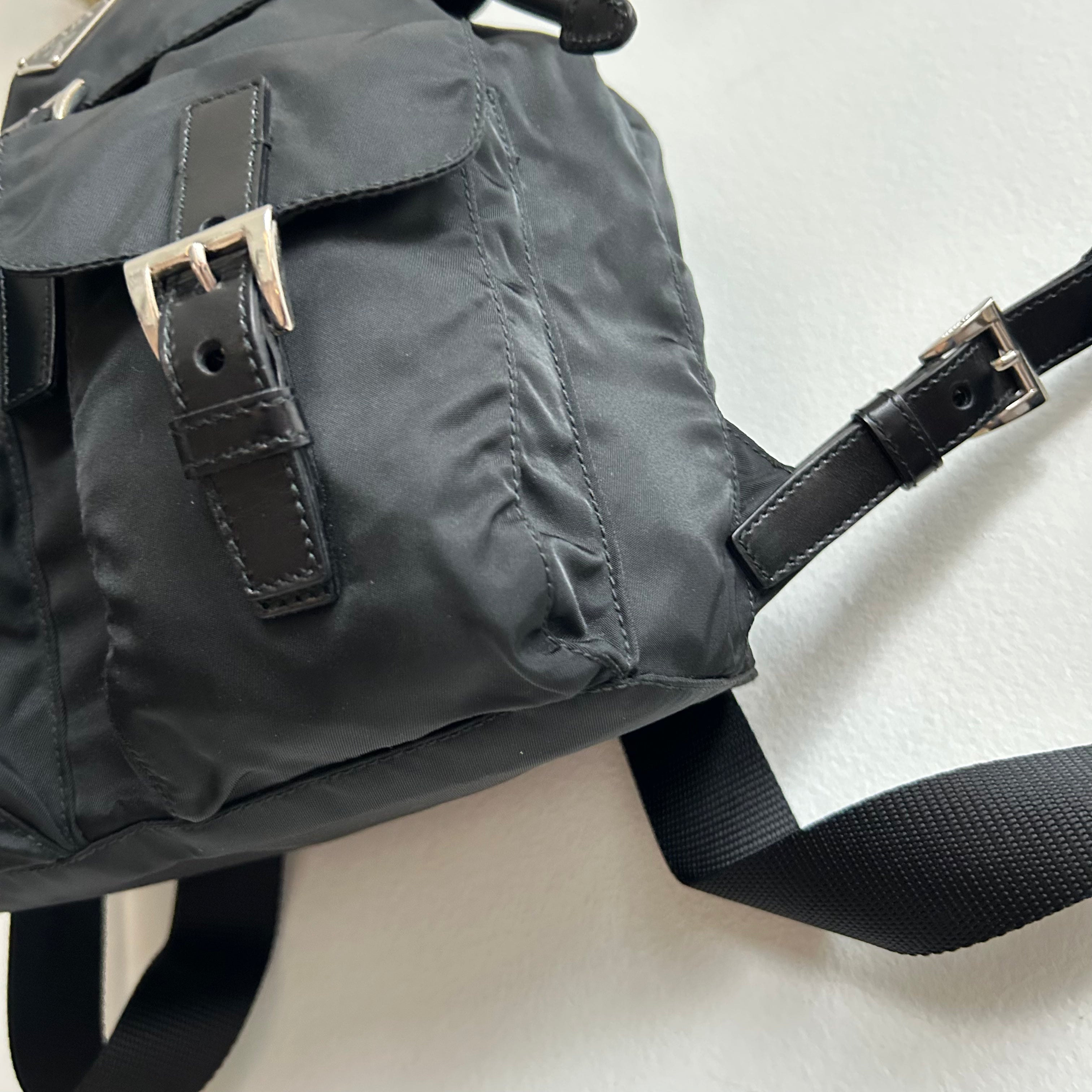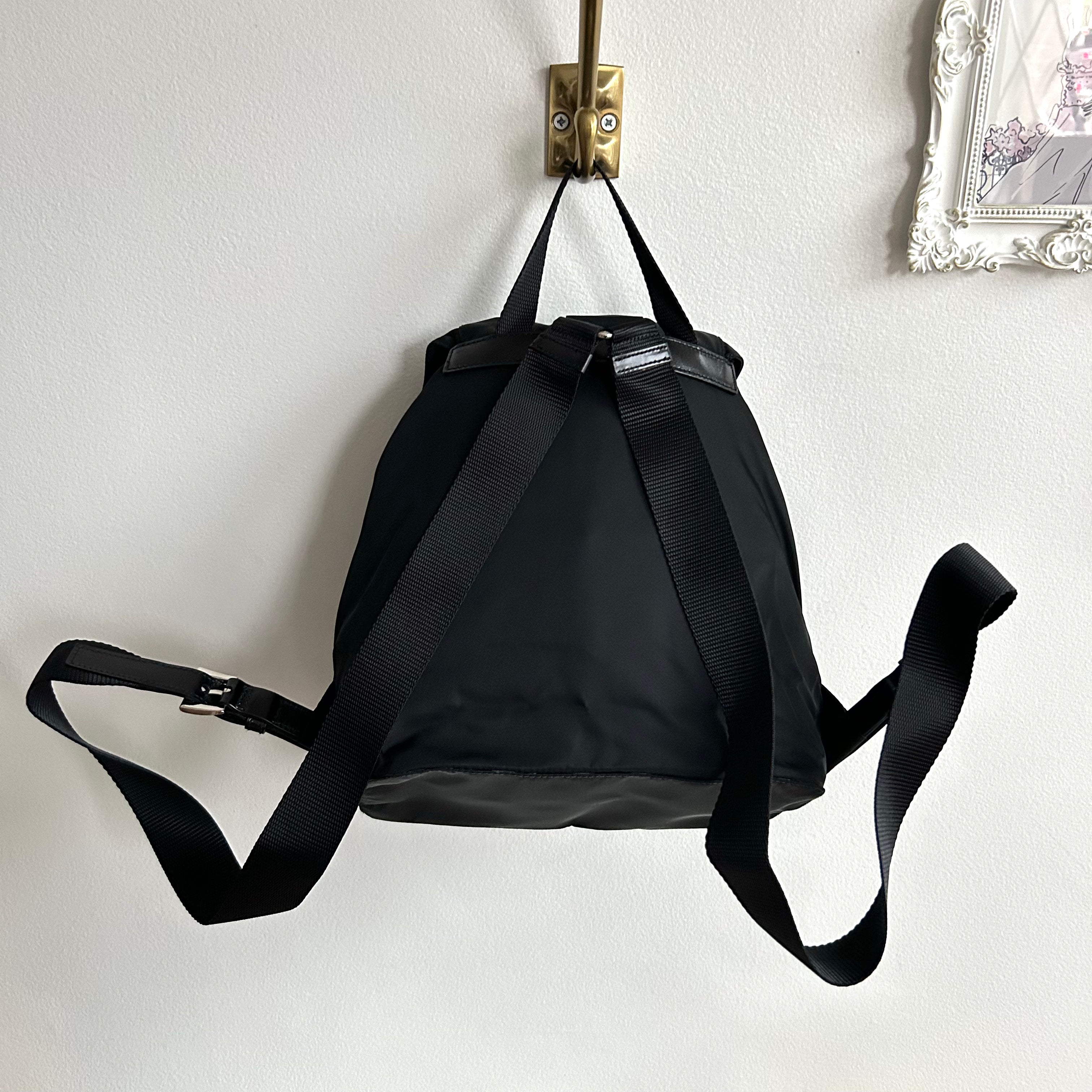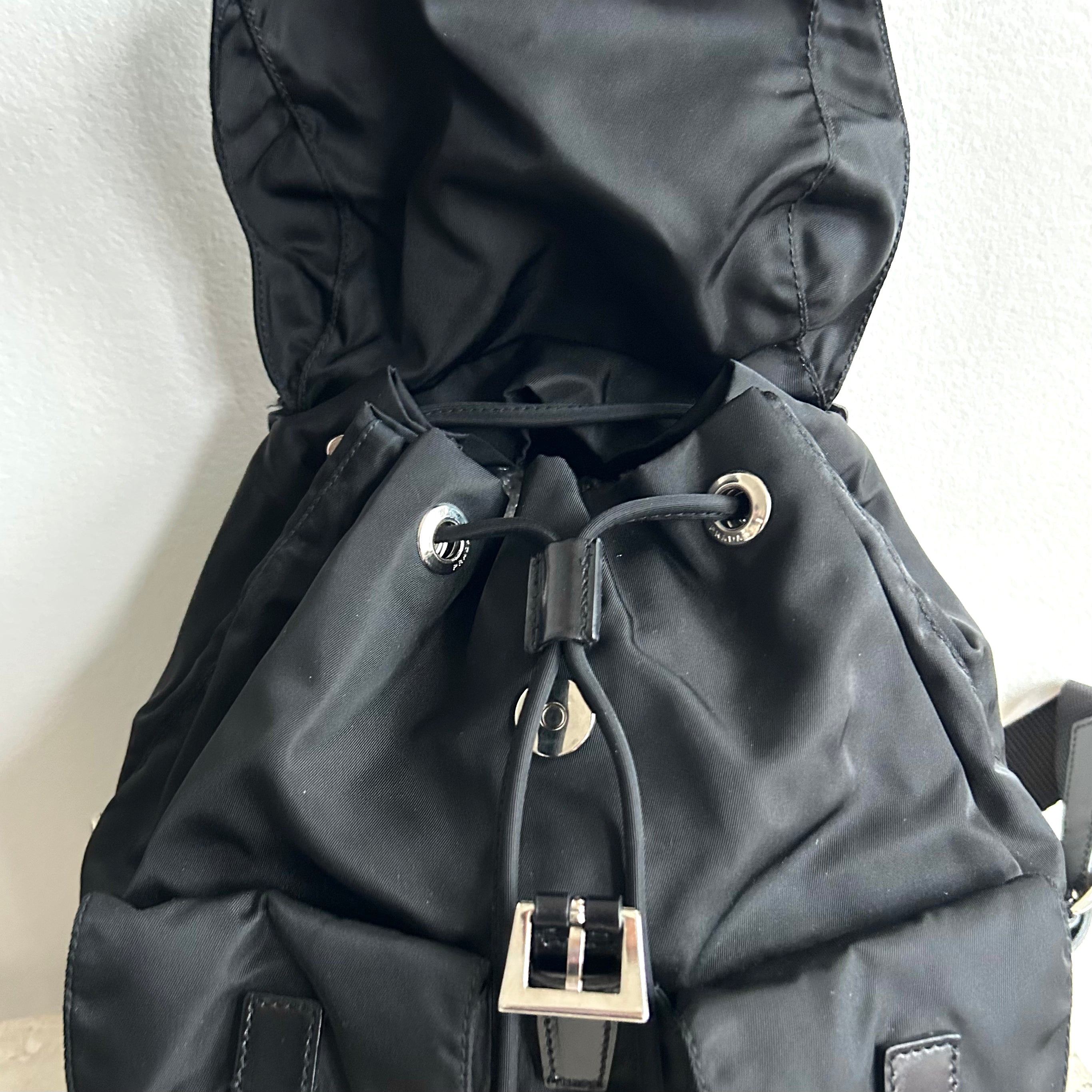 Pre-Owned Prada Vela Sport Small Nylon Backpack. This stylish backpack is crafted from Re-nylon with leather trim and silver-tone hardware. The front features two pockets with buckle and magnetic snap fastenings. The top flap is secured with a buckle, magnetic snap, and drawstring closure. The bag opens to a black logo-print fabric lining with a single zip pocket. The back features two adjustable straps that can be worn over the shoulder or on the back. Lightweight and perfect for days on the go!