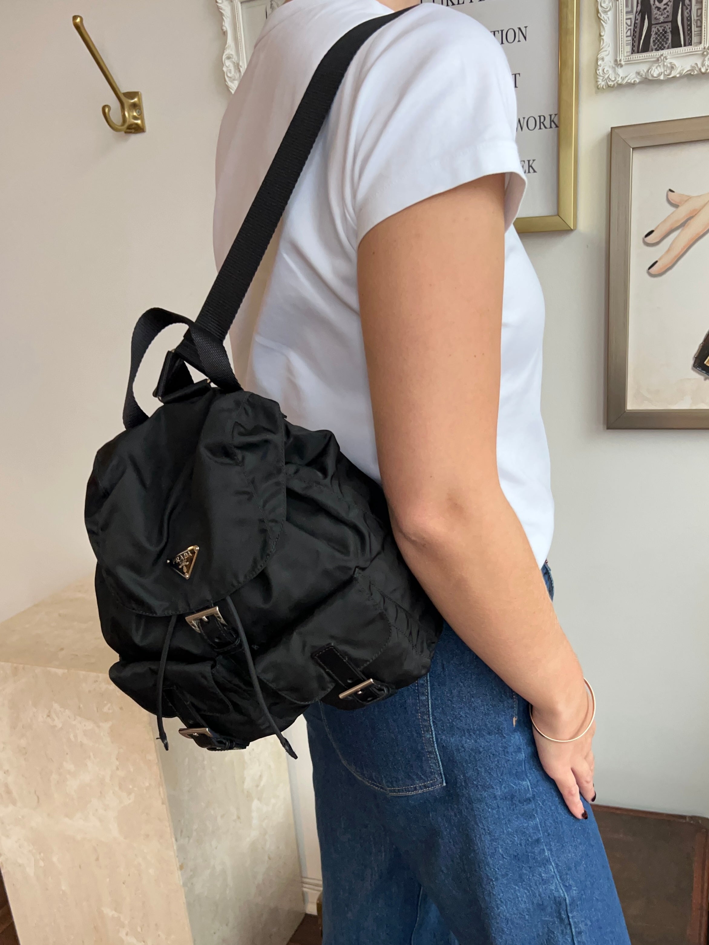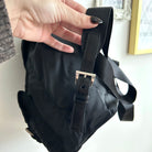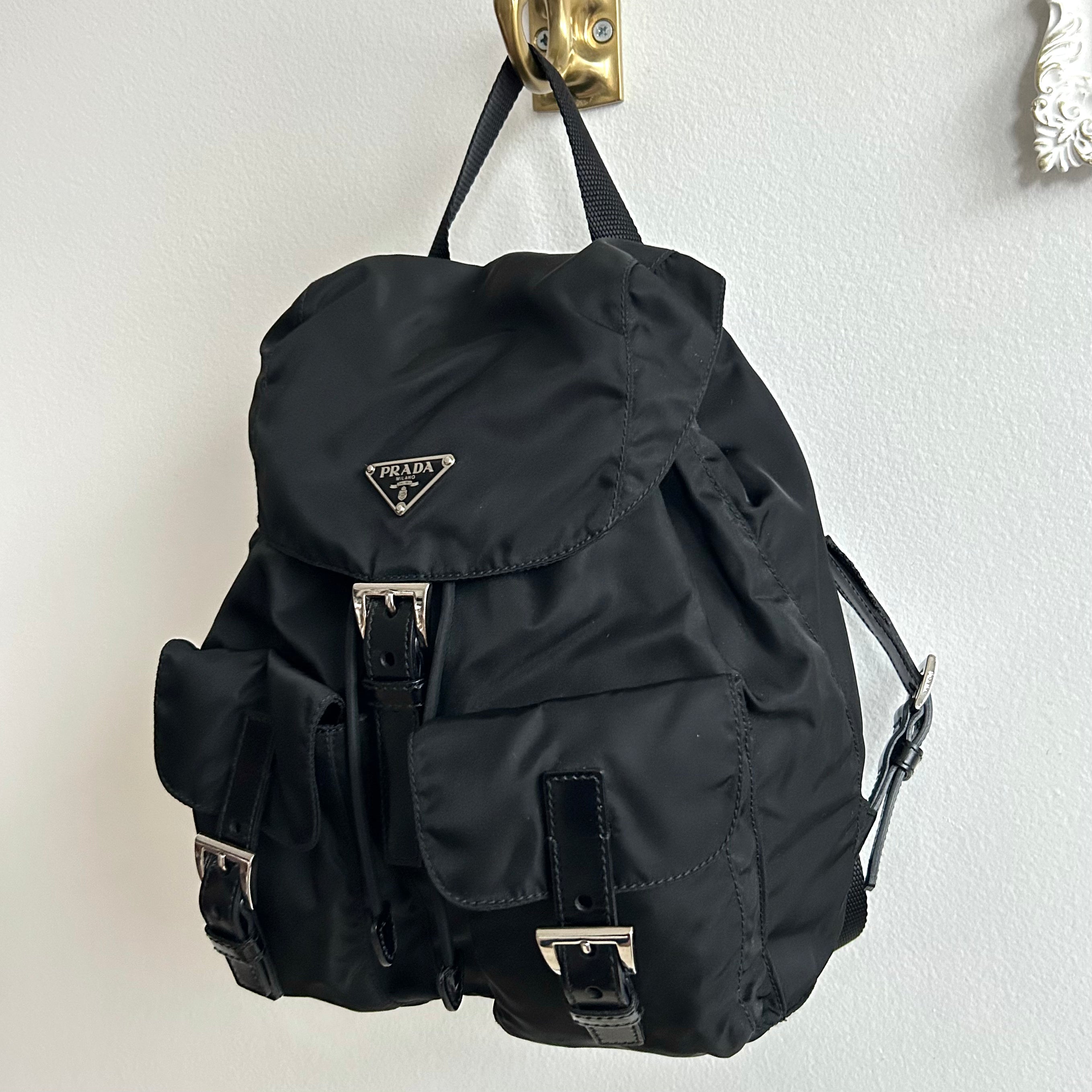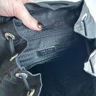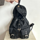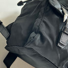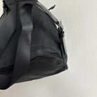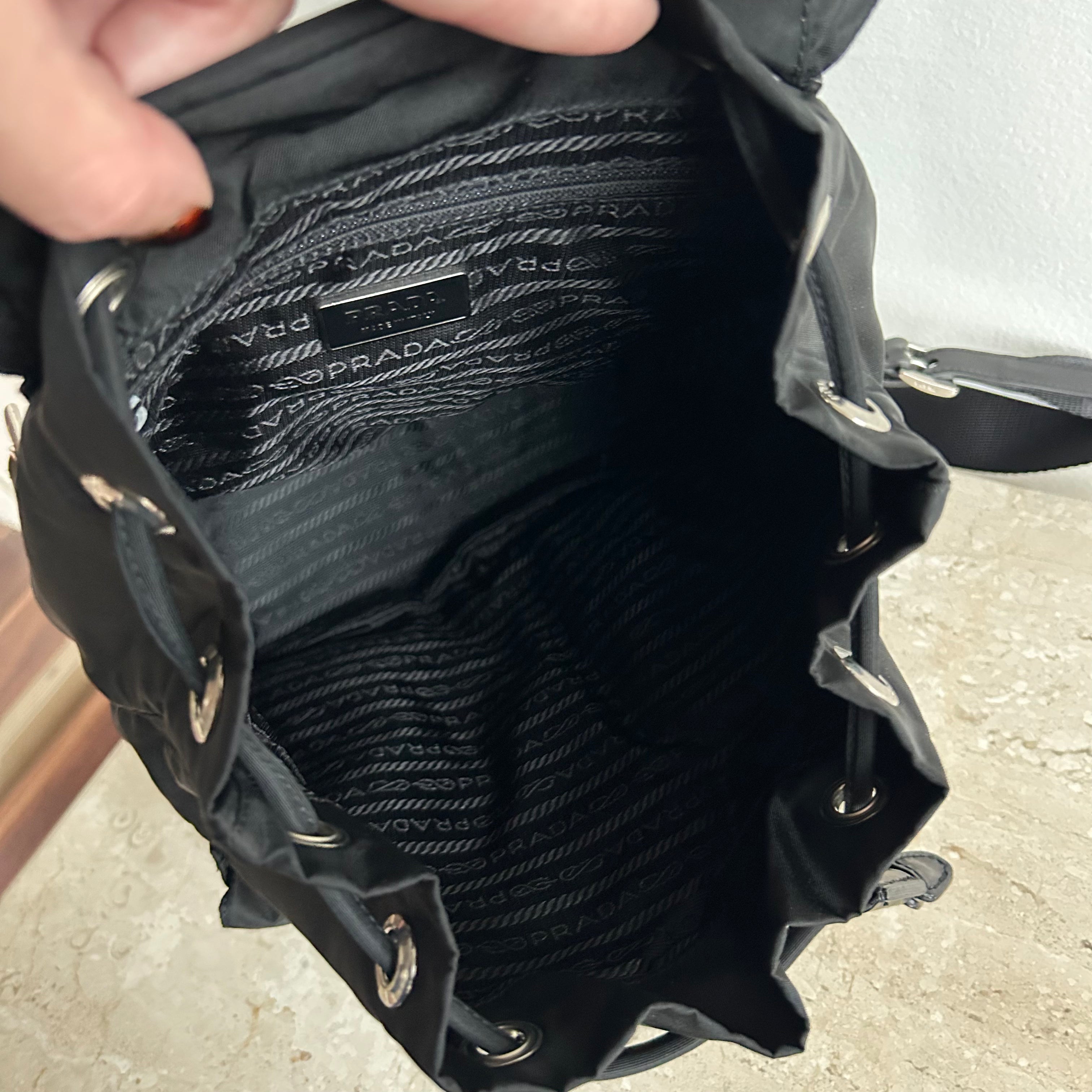Pre-Owned Prada Vela Sport Small Nylon Backpack. This stylish backpack is crafted from Re-nylon with leather trim and silver-tone hardware. The front features two pockets with buckle and magnetic snap fastenings. The top flap is secured with a buckle, magnetic snap, and drawstring closure. The bag opens to a black logo-print fabric lining with a single zip pocket. The back features two adjustable straps that can be worn over the shoulder or on the back. Lightweight and perfect for days on the go!