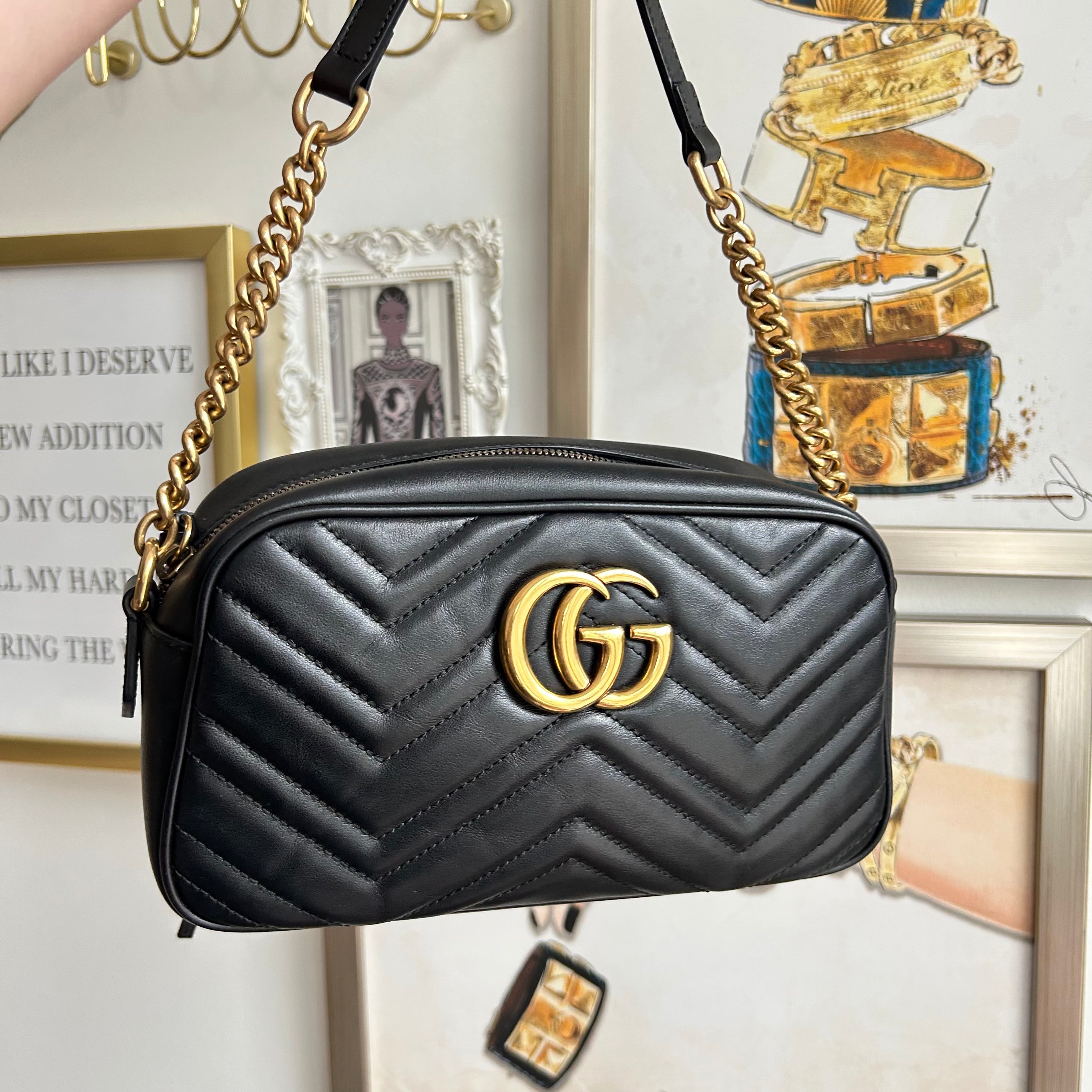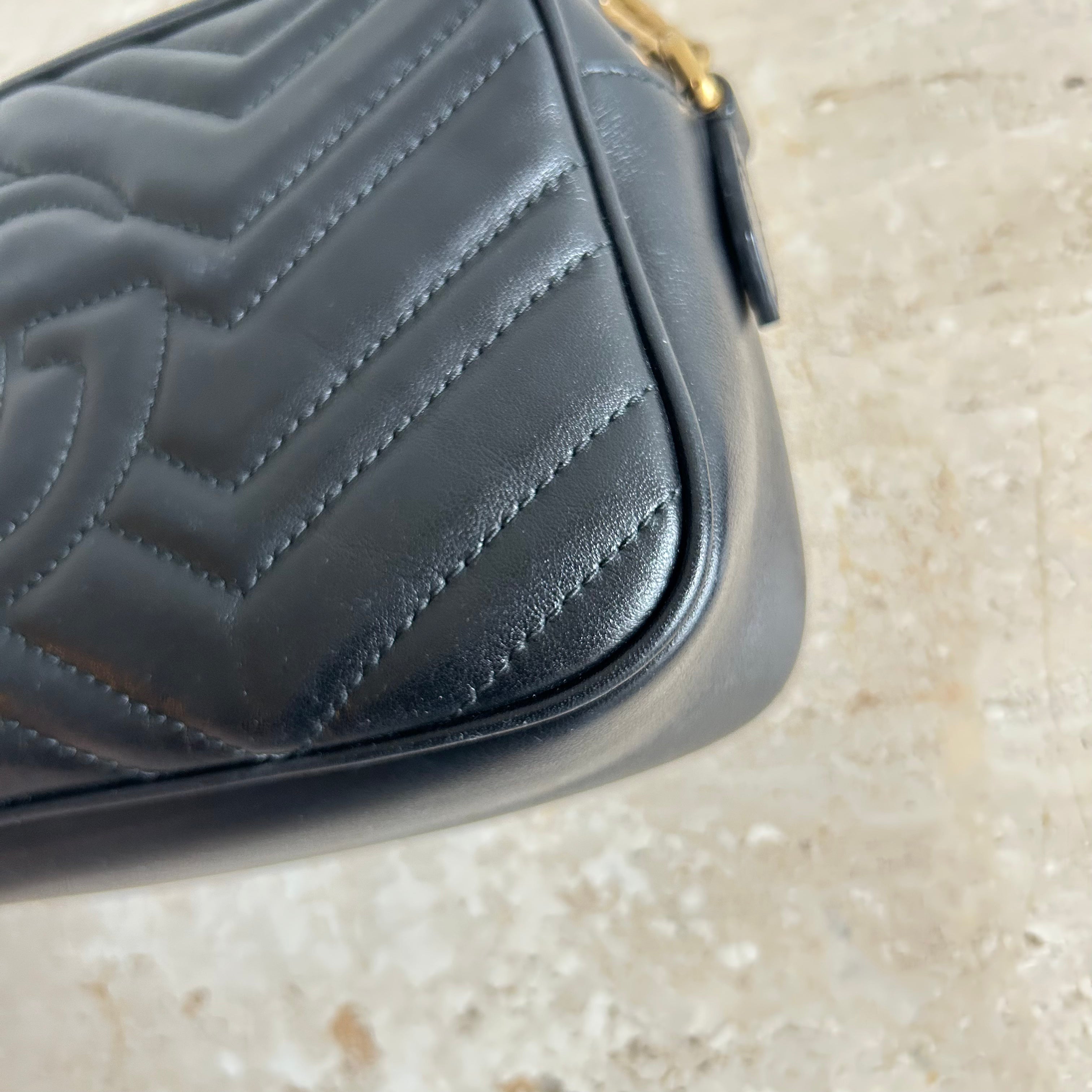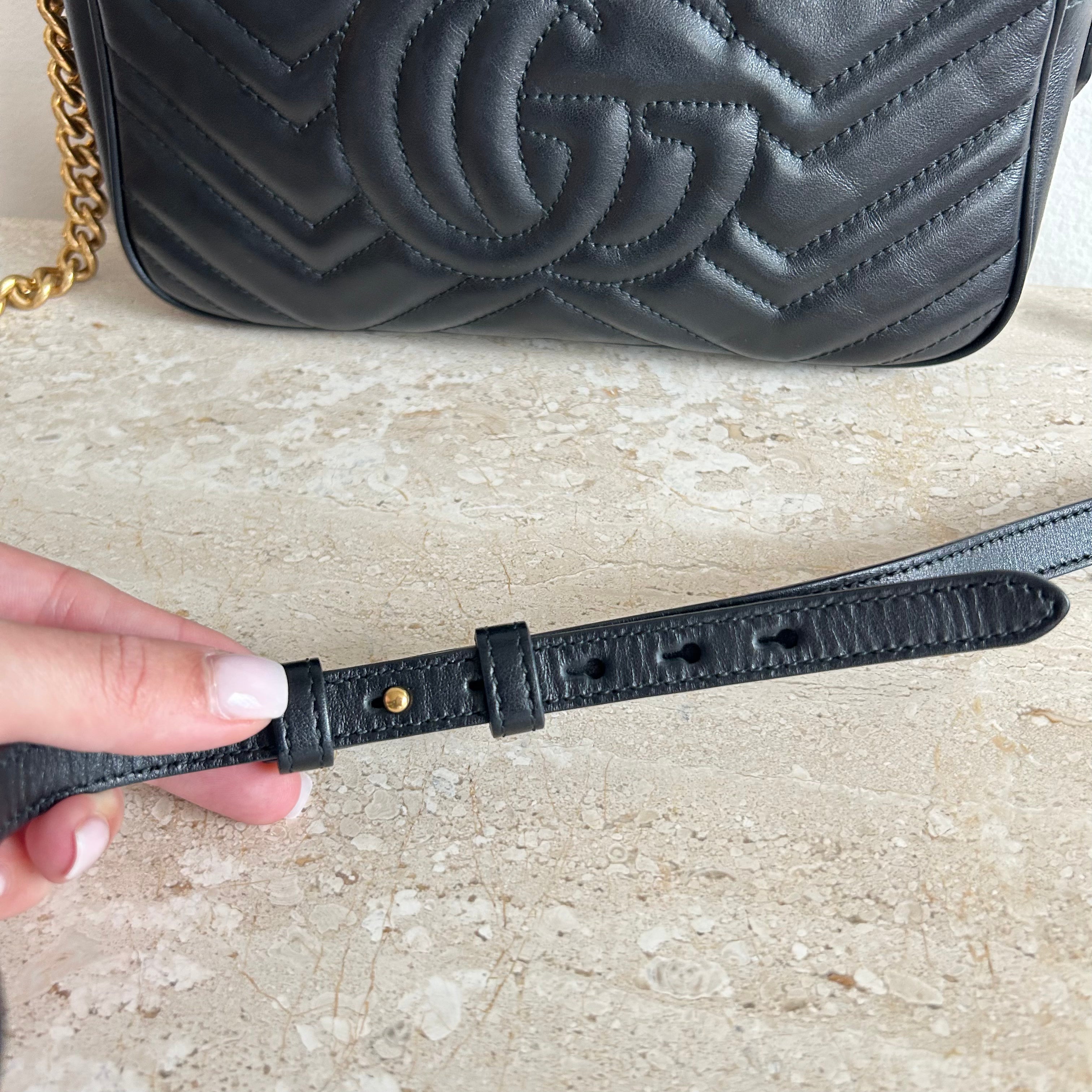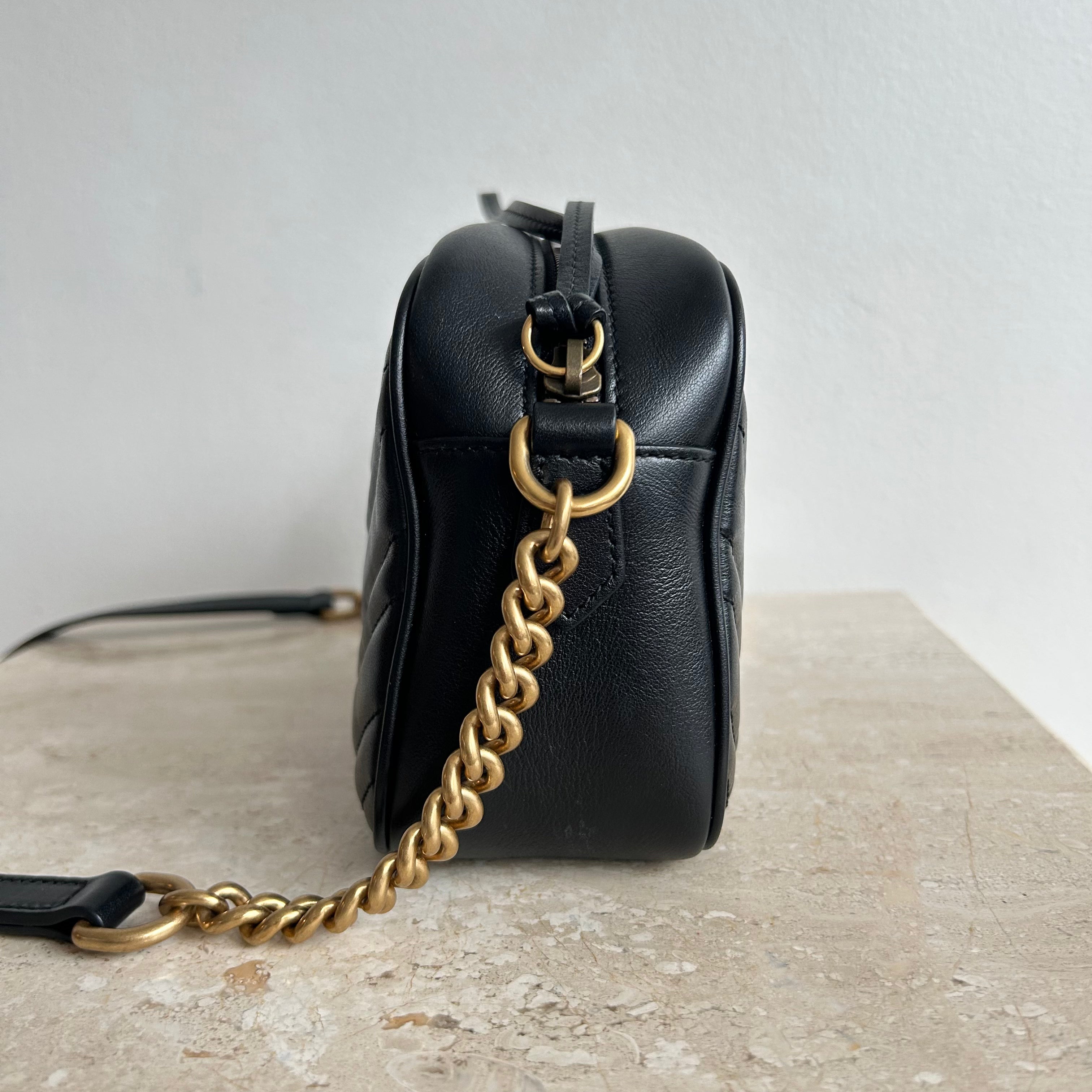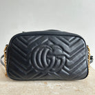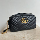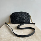 Pre-Owned Gucci Marmont Black Small Shoulder Bag. Crafted in matelasse chevron patterned leather in black with gold-tone hardware. A softly structured shape and a top zip closure with double GG hardware. The leather shoulder strap features chain detail that can be worn cross-body. The interior microfibre lining hosts one flat pocket. A great daily bag!