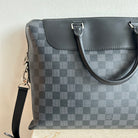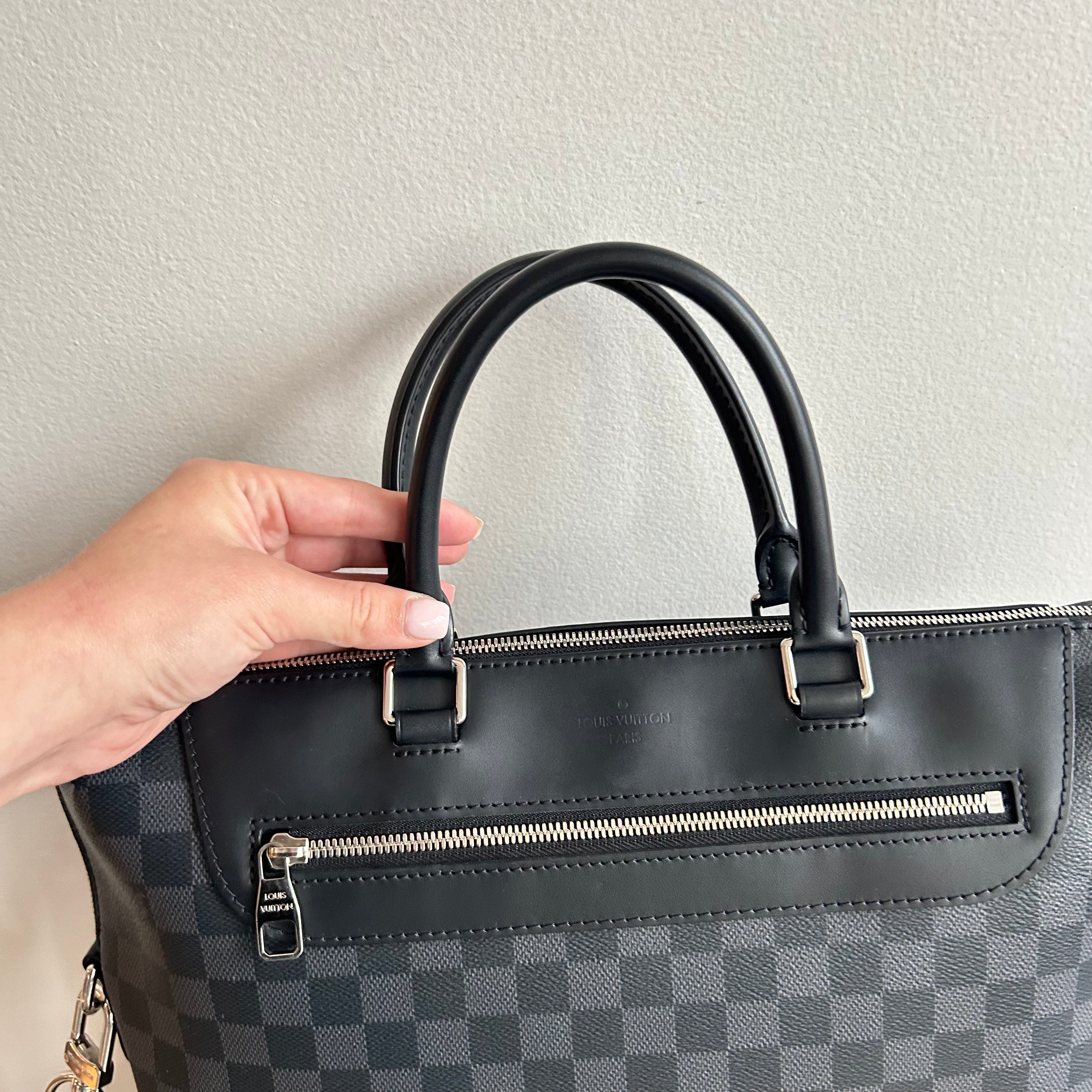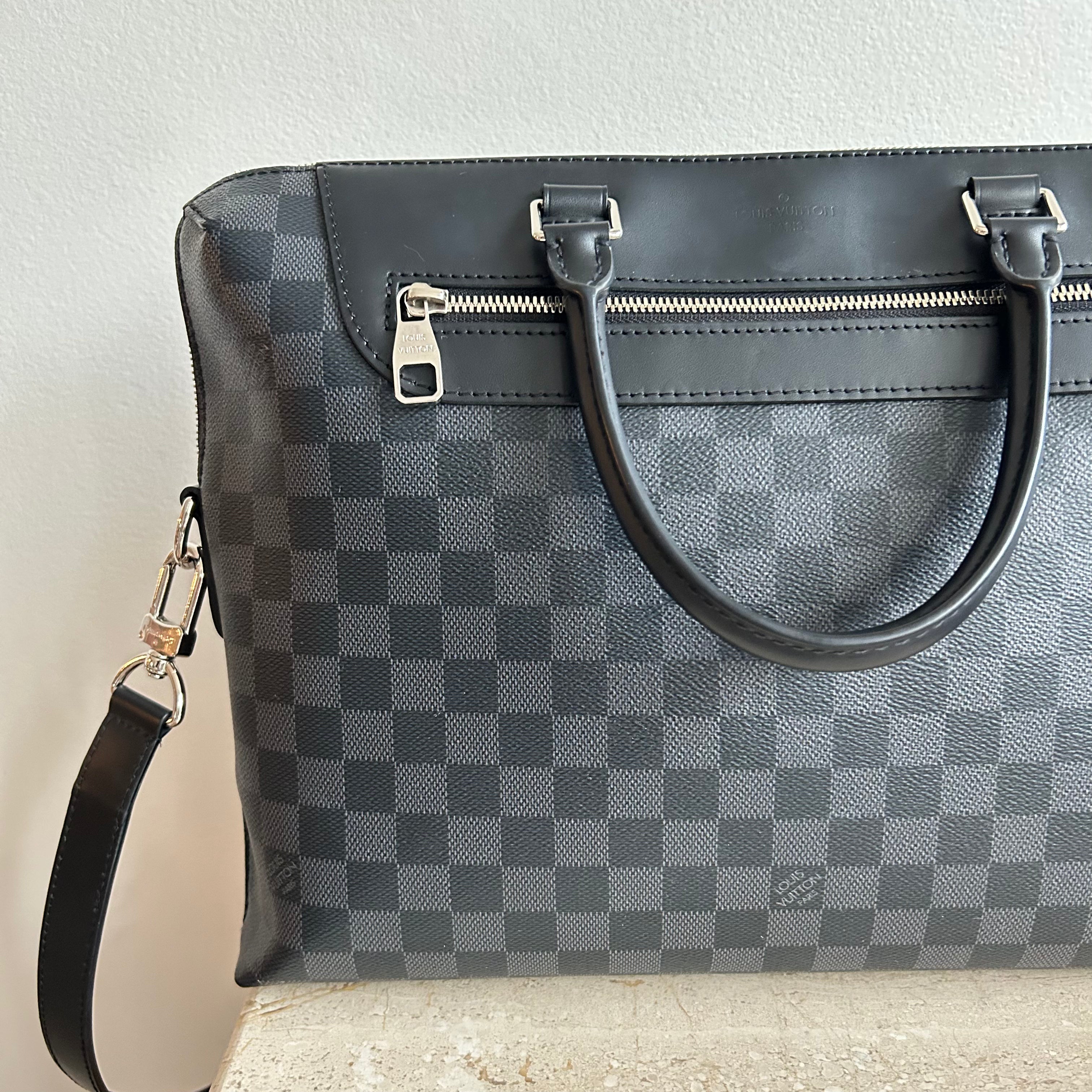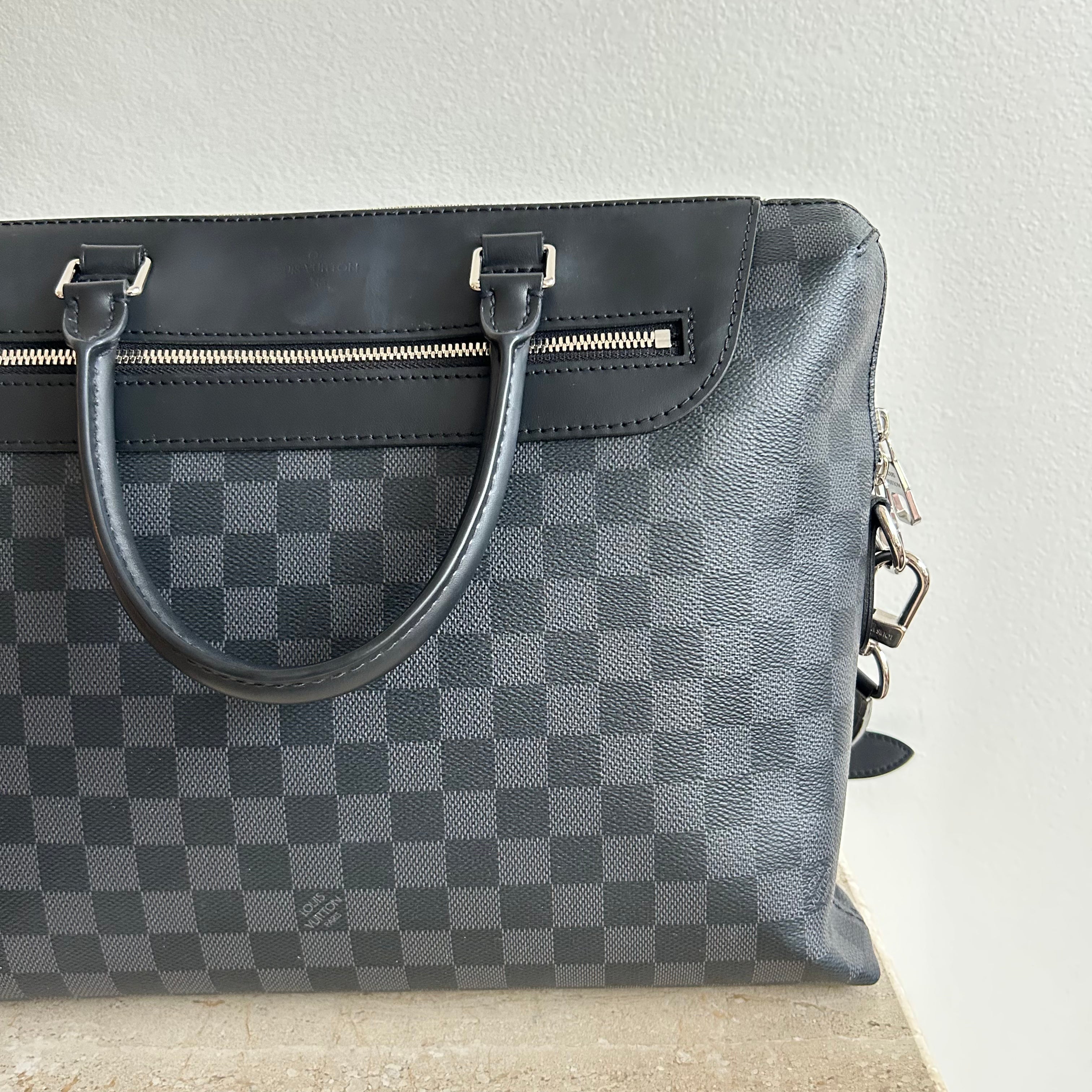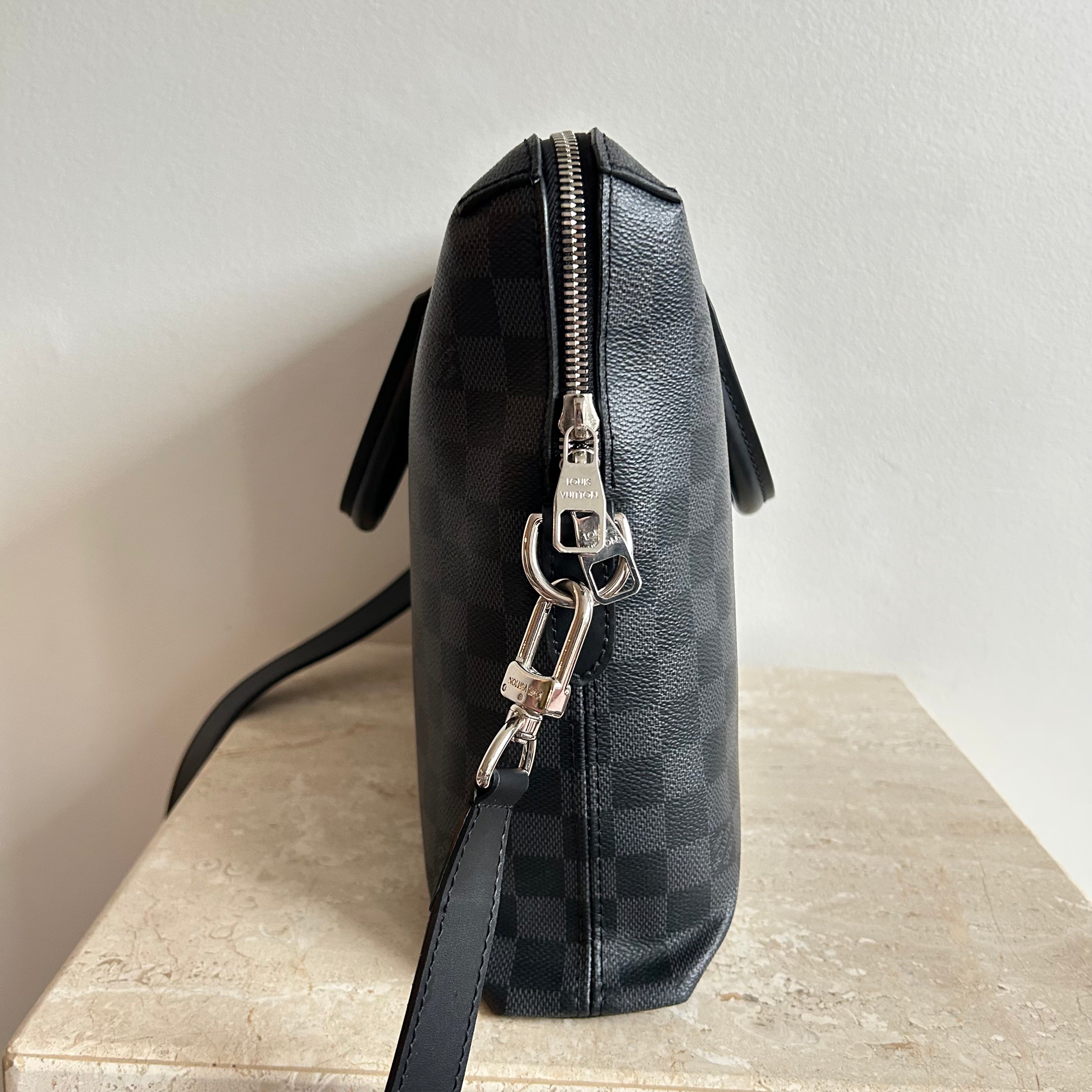 Pre-Owned Louis Vuitton Damier Graphite Porte-Documents Jour Bag. Crafted in Damier Graphite coated canvas and cowhide leather trim, including dual top handles and an adjustable and removable shoulder strap. Silver tone hardware includes front zip pocket, and dual top zipper which opens to a roomy fabric lined interior, hosting 5 slip pockets. This is the ideal work bag, and fits a 13" laptop!