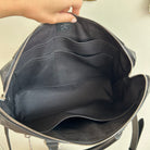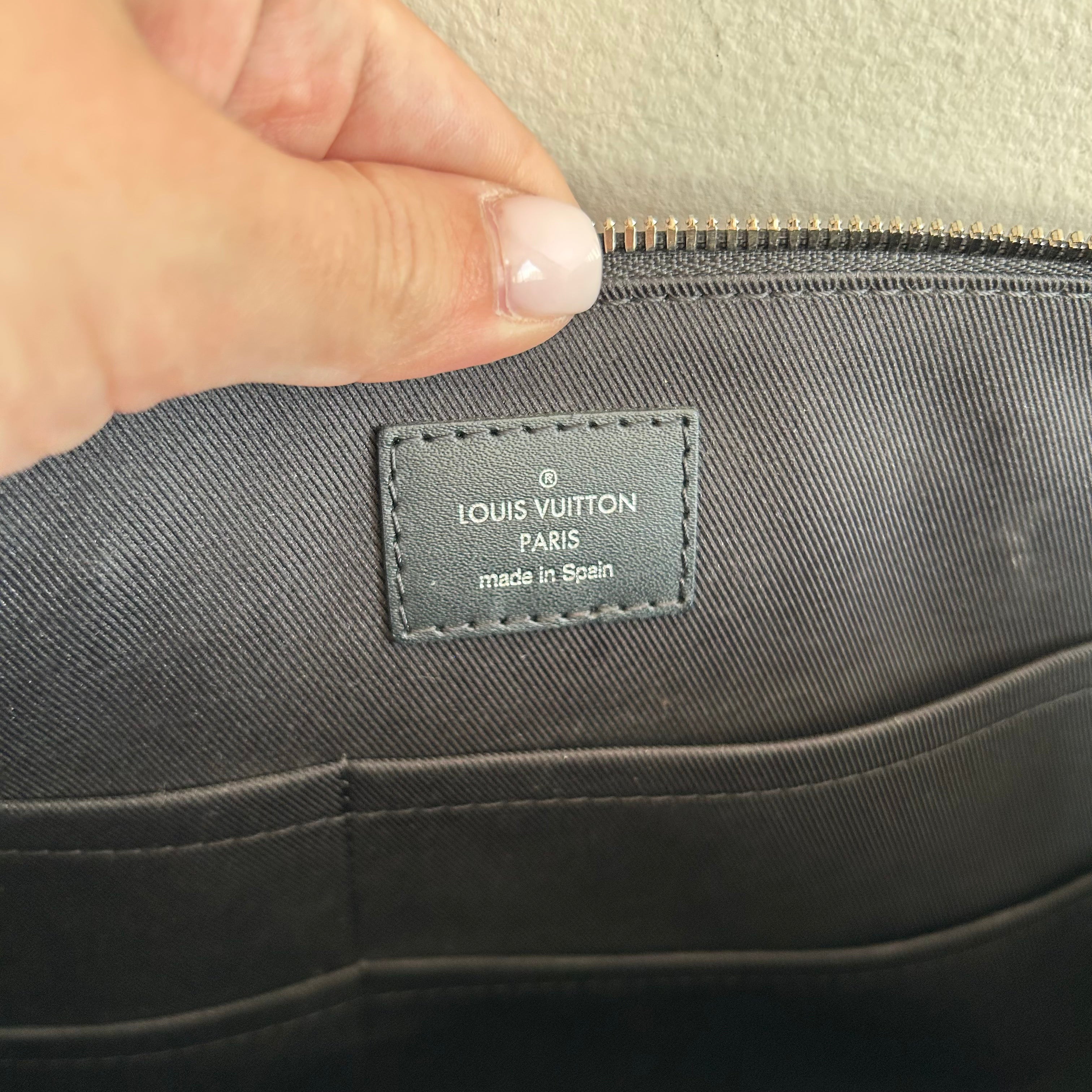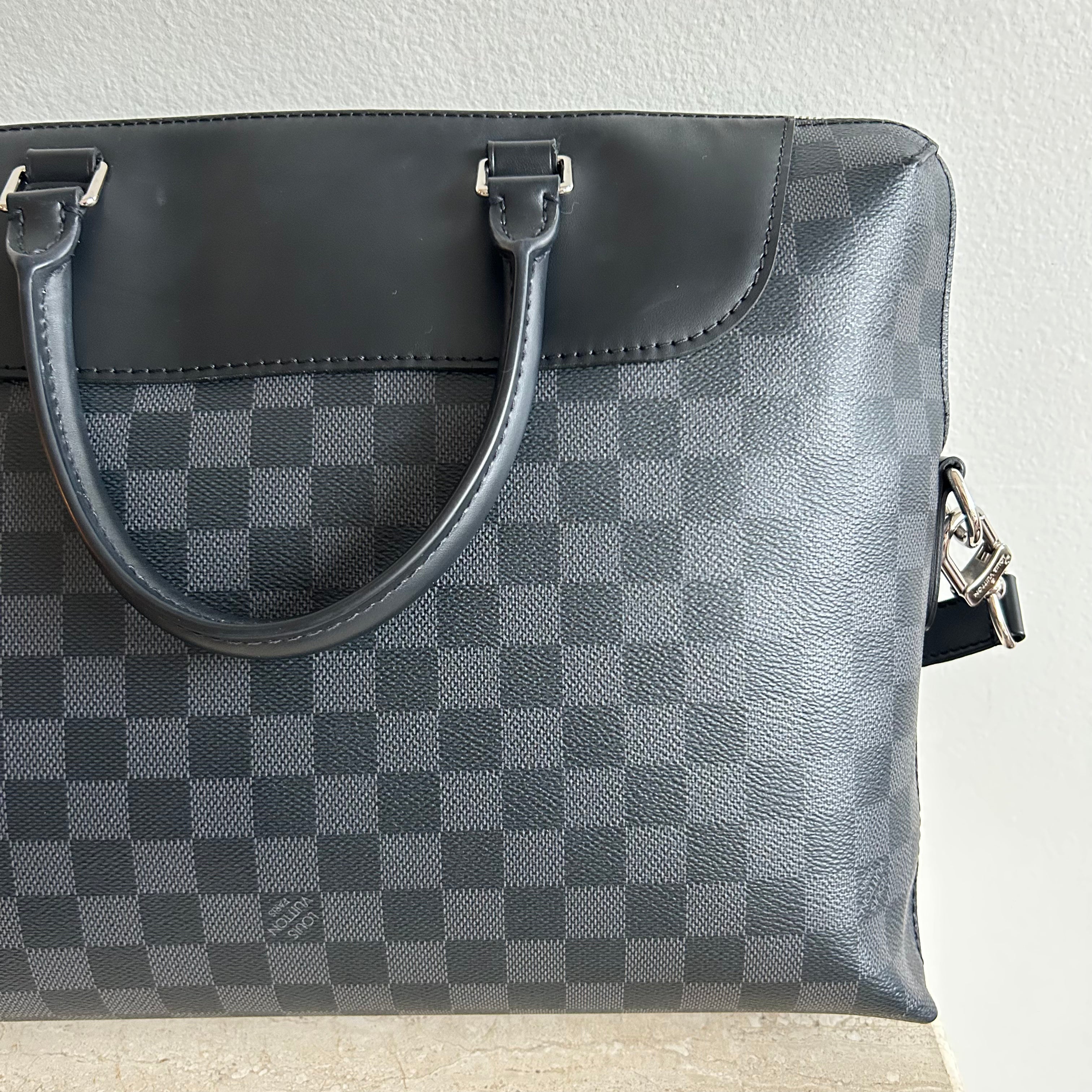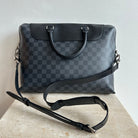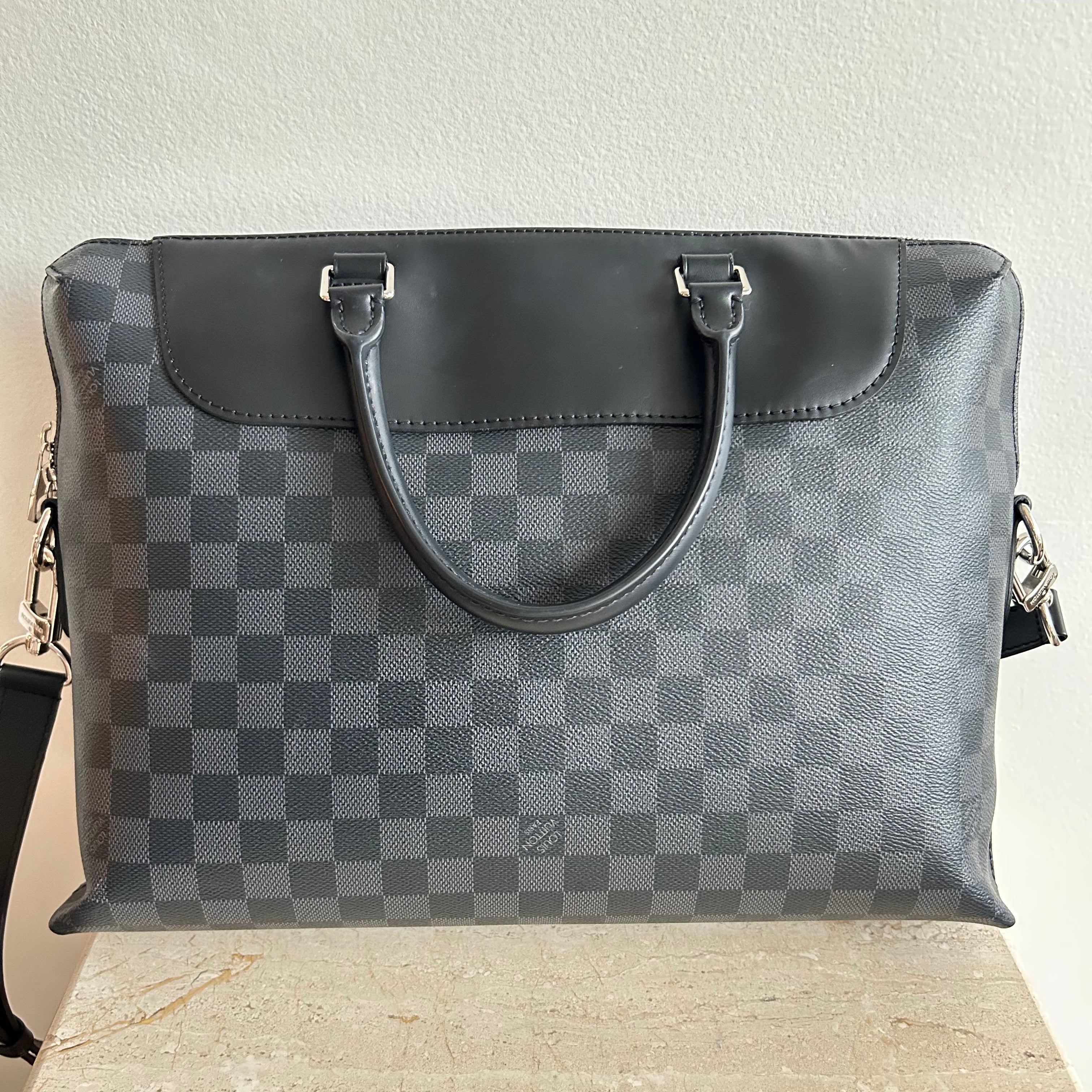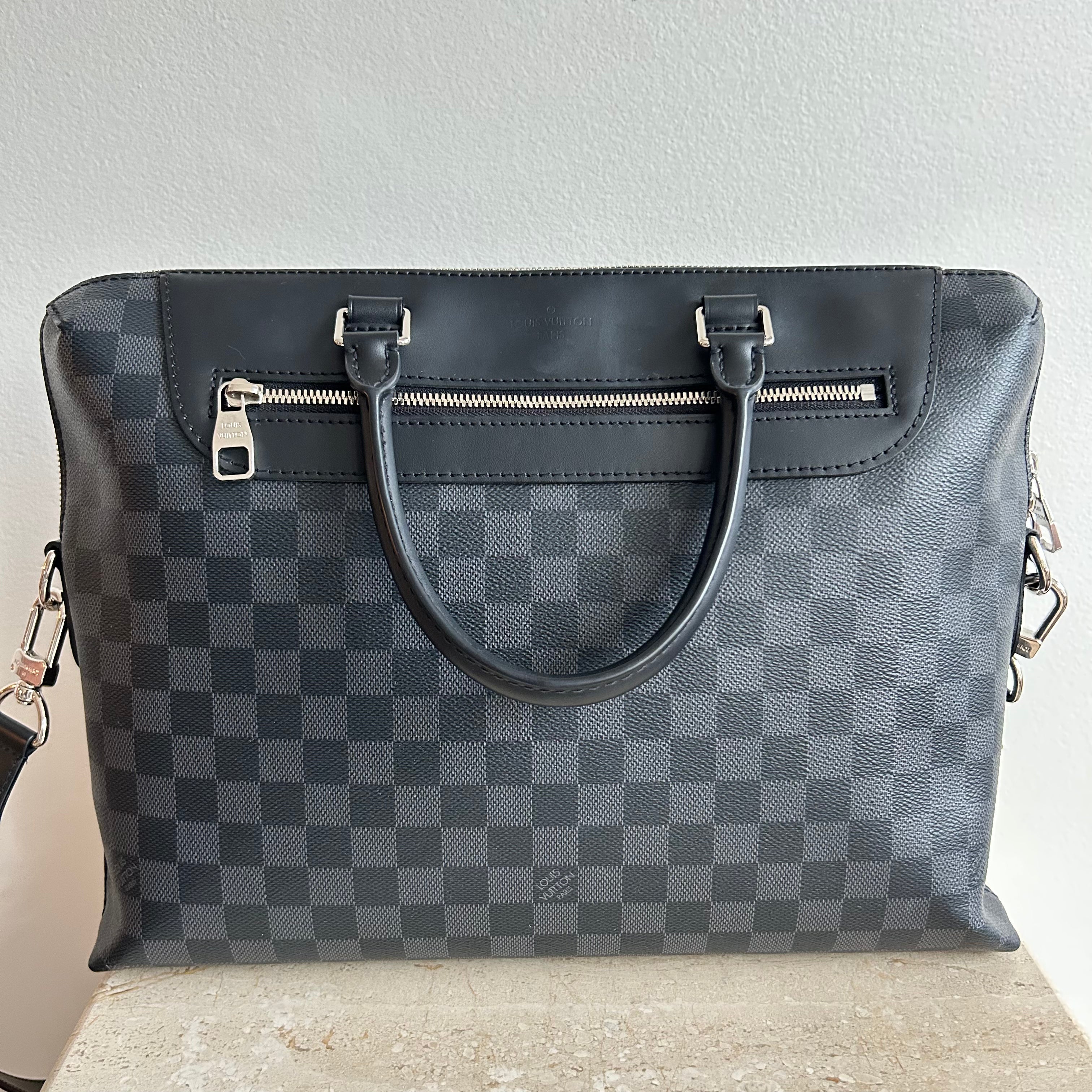 Pre-Owned Louis Vuitton Damier Graphite Porte-Documents Jour Bag. Crafted in Damier Graphite coated canvas and cowhide leather trim, including dual top handles and an adjustable and removable shoulder strap. Silver tone hardware includes front zip pocket, and dual top zipper which opens to a roomy fabric lined interior, hosting 5 slip pockets. This is the ideal work bag, and fits a 13" laptop!
