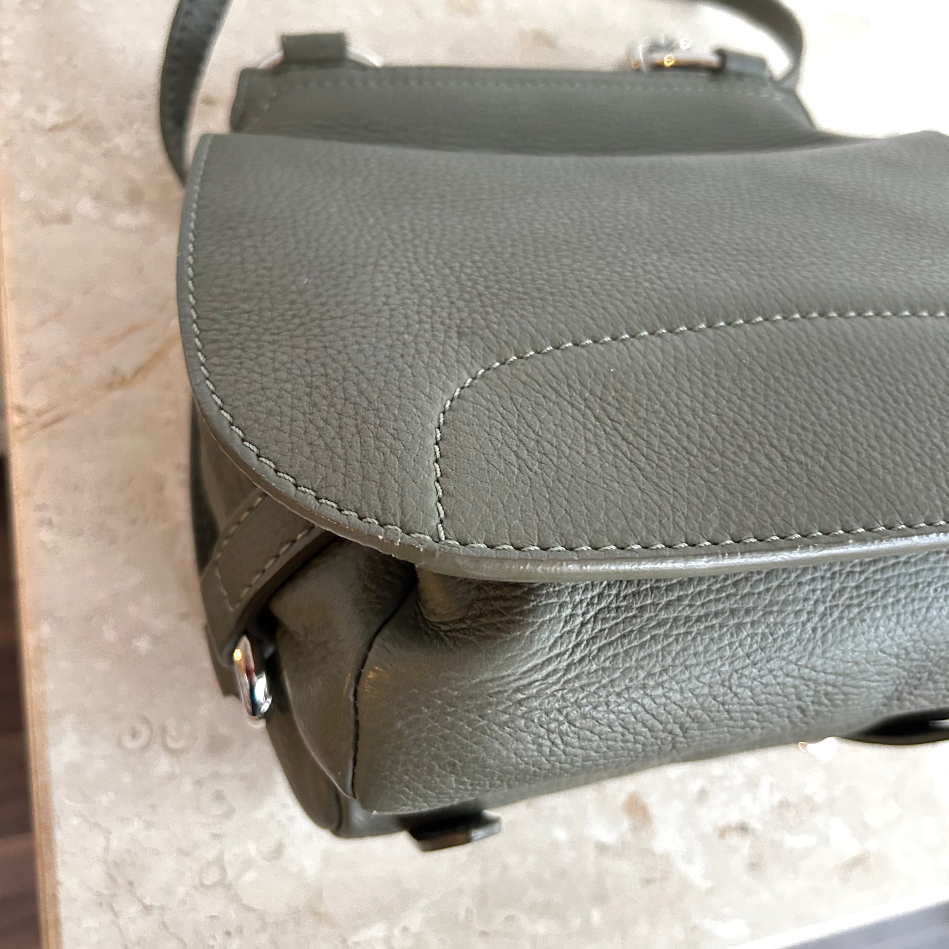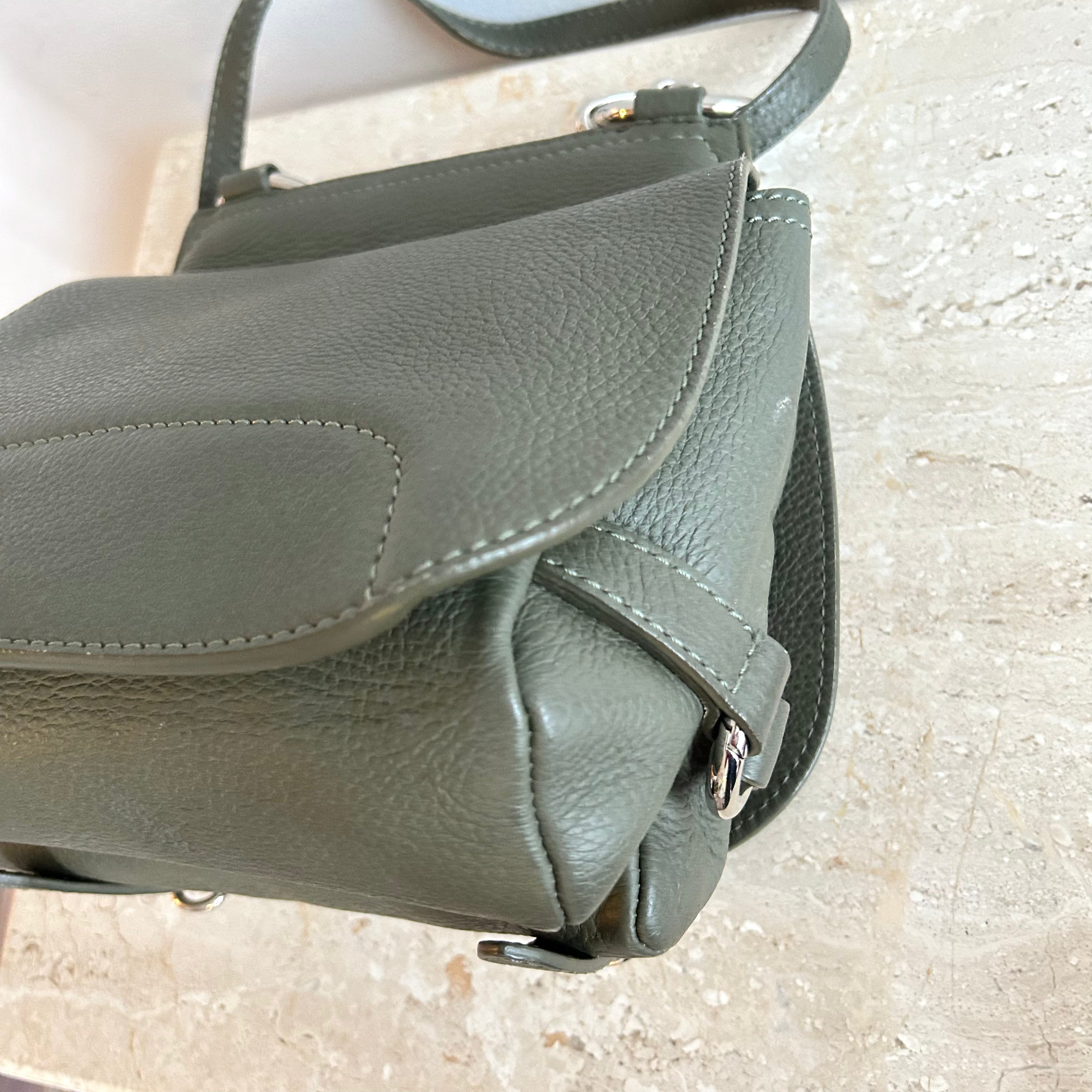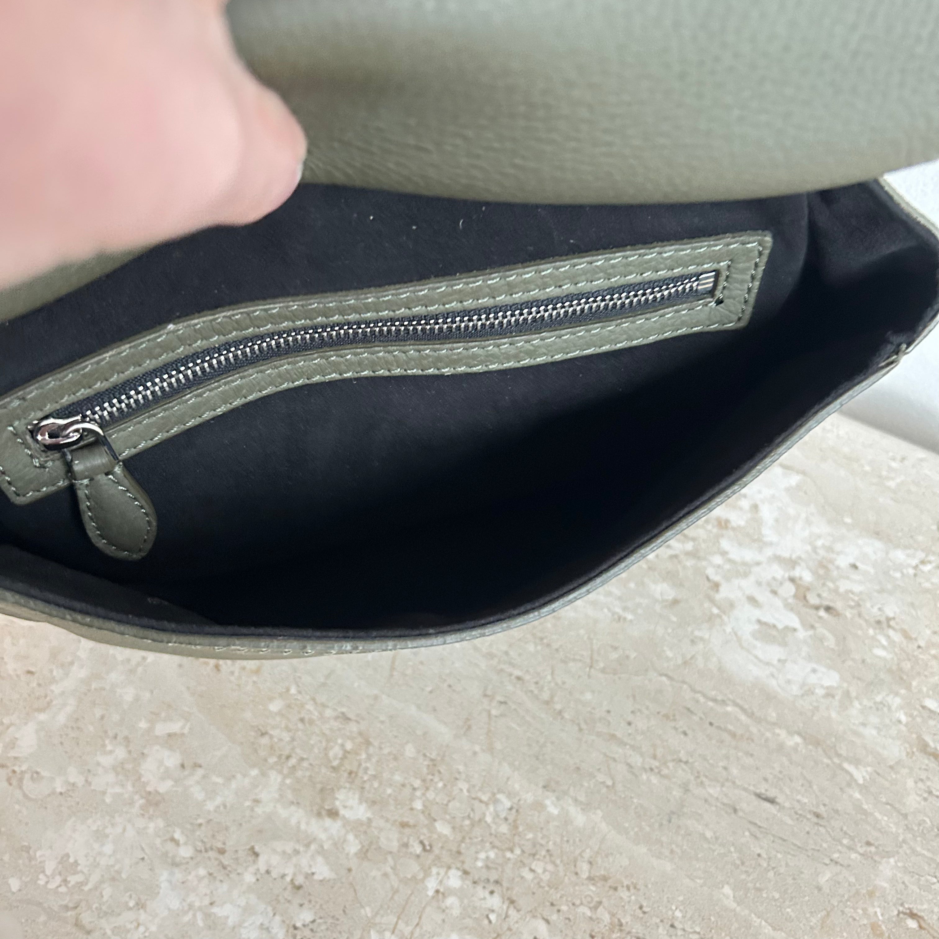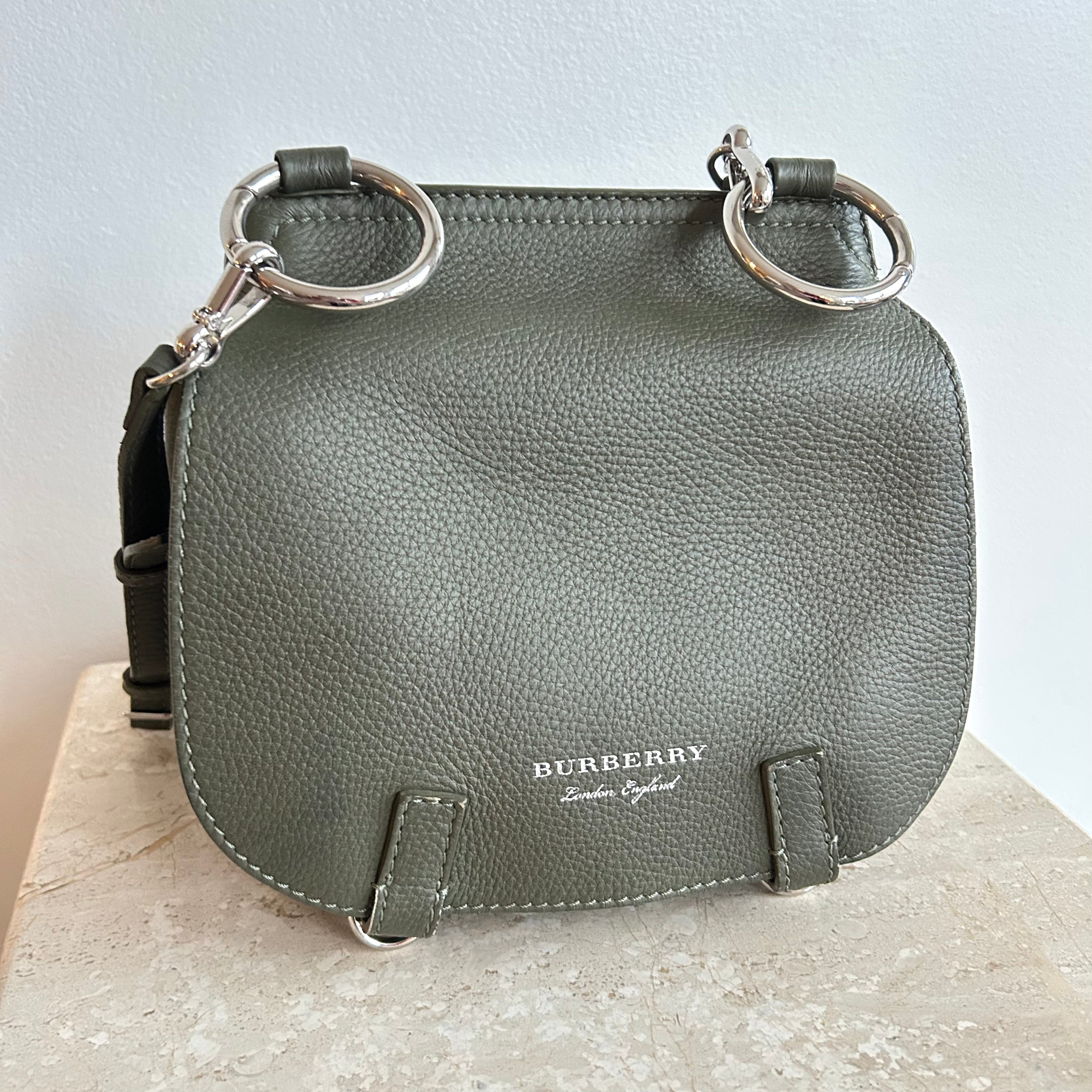Pre-Owned Burberry Bridle Green Leather Crossbody Bag. Crafted in grained leather ina beautiful olive green with silver tone hardware. Front flap opens to a fabric lined interior hosting one slip pocket, and rear flap opens to a separate fabric lined compartment hosting one zip pocket. With an adjustable and removable leather strap, this bag can be worn on the shoulder or as a crossbody. A great size bag in the most beautiful green!