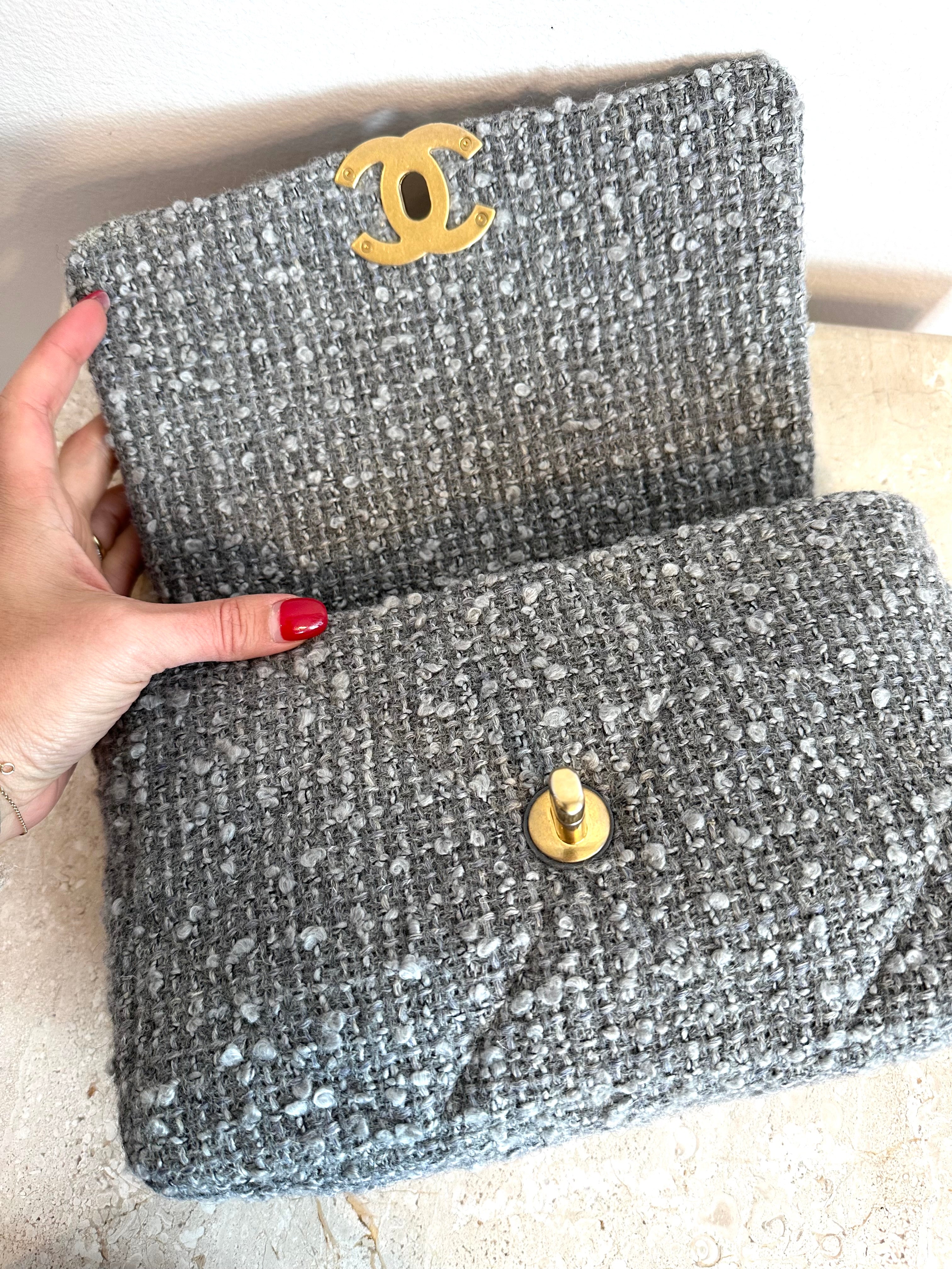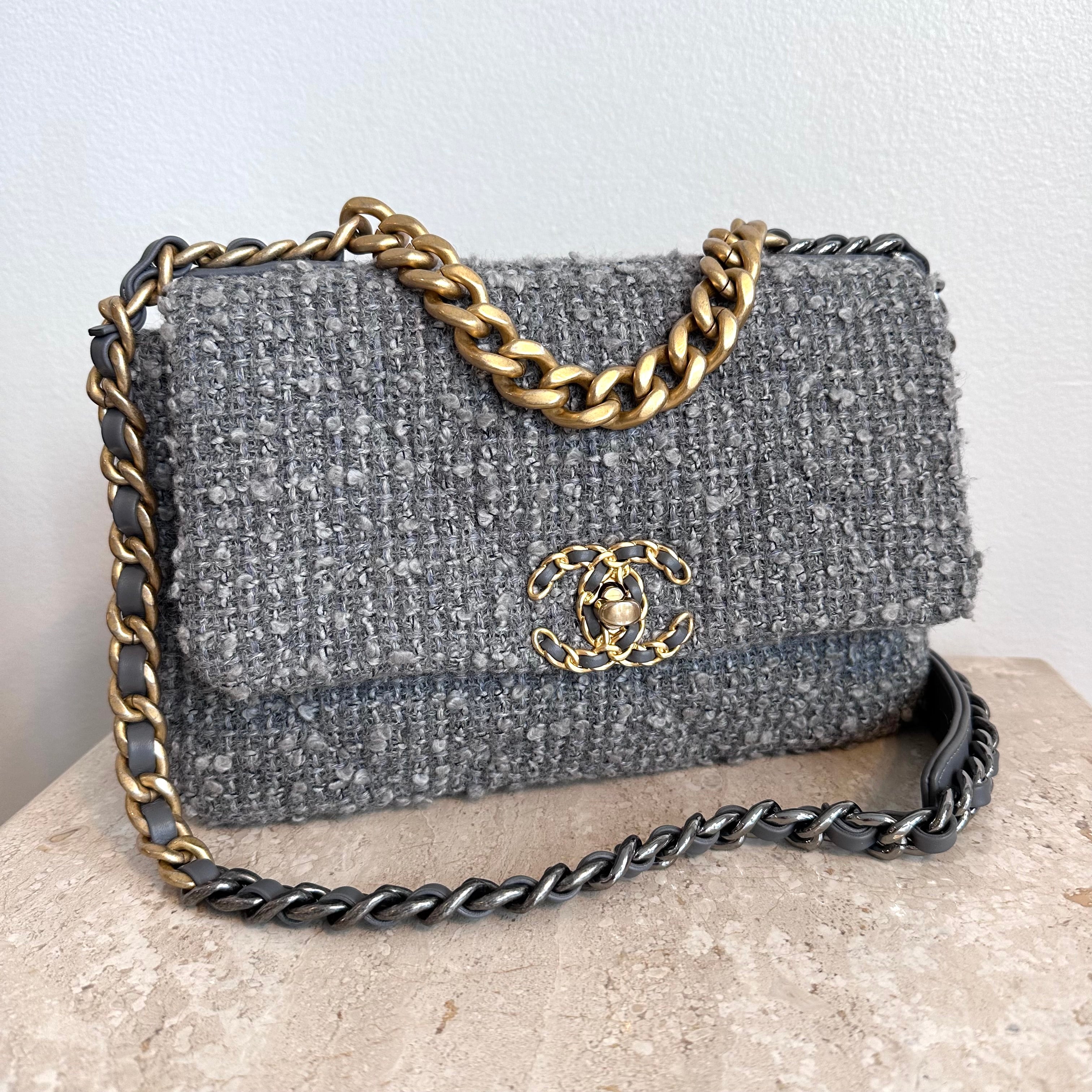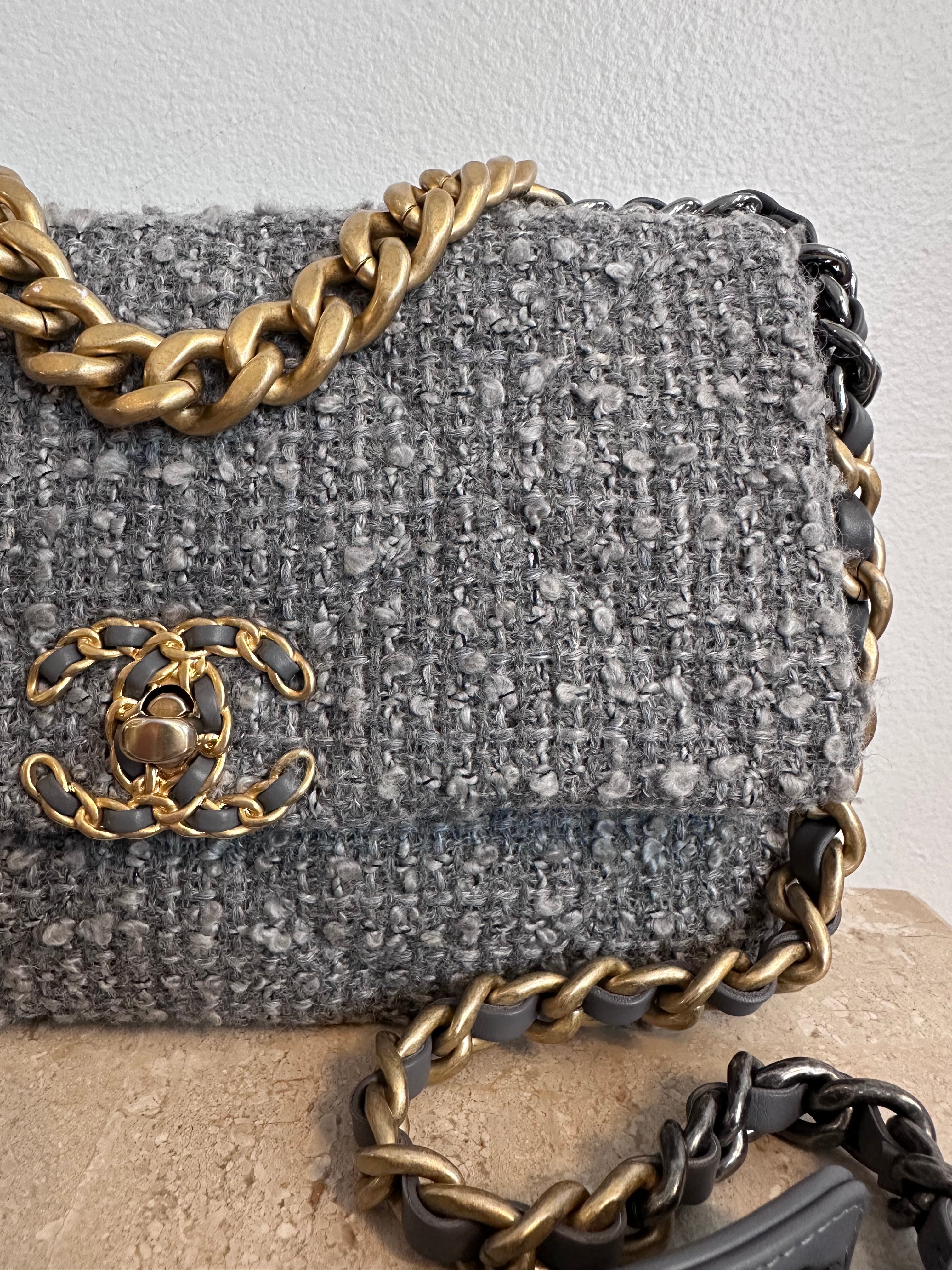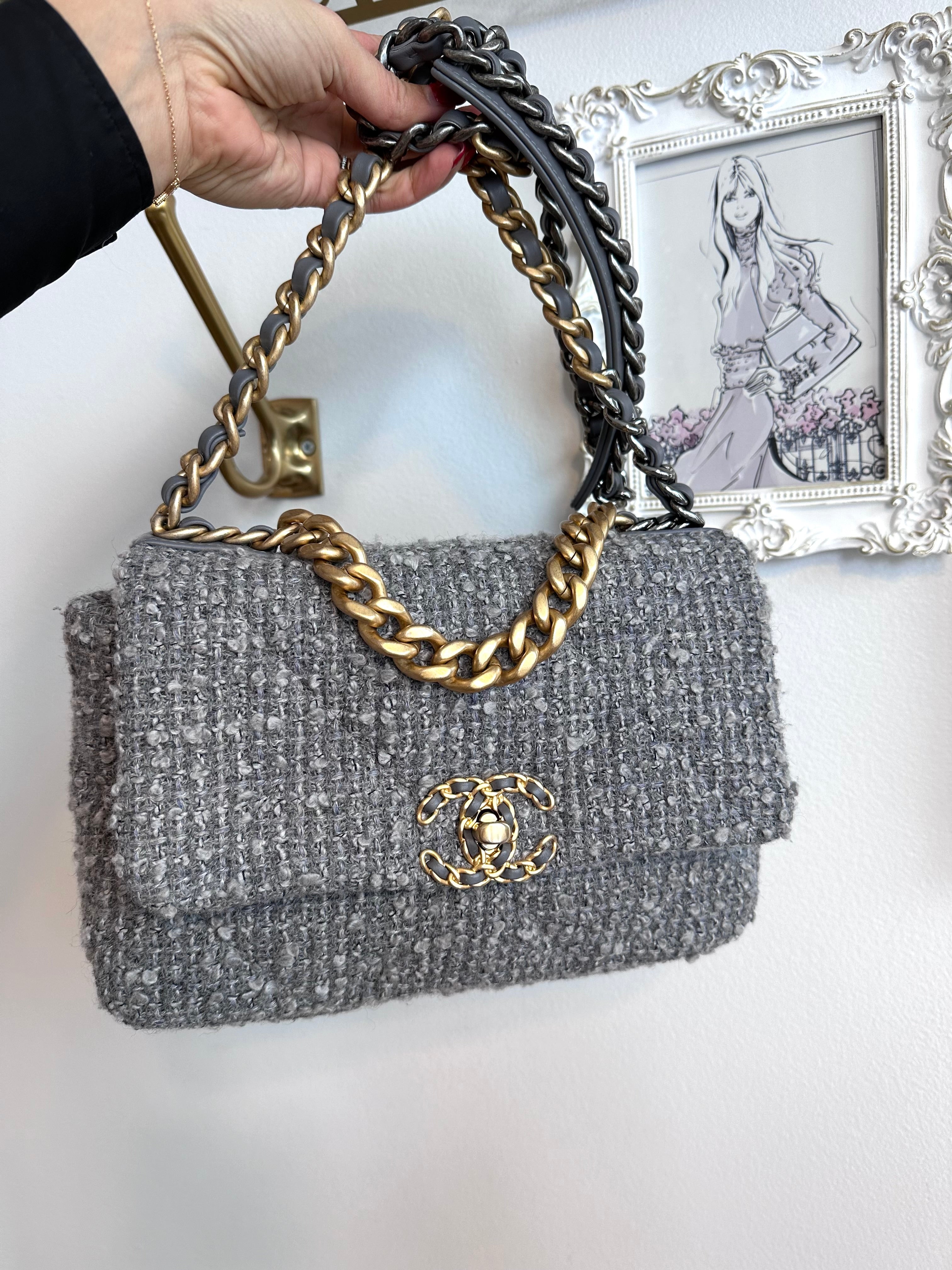 Pre-Owned Chanel™ 19 Grey Tweed. A rarely consigned goodie that is just stunning! Beautifully soft grey wool fabric with multi gold tone, silver tone hardware combination, is nothing short of stunning. The single flap, chain link initials open up to 1 zip pocket and more than enough space for all your essentials. In Canada our winters are so long that a winter bag that takes us through most of the seasons until spring peaks is key! Take this bag right from day to night. This bag is gorgeous!