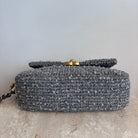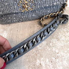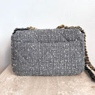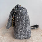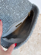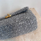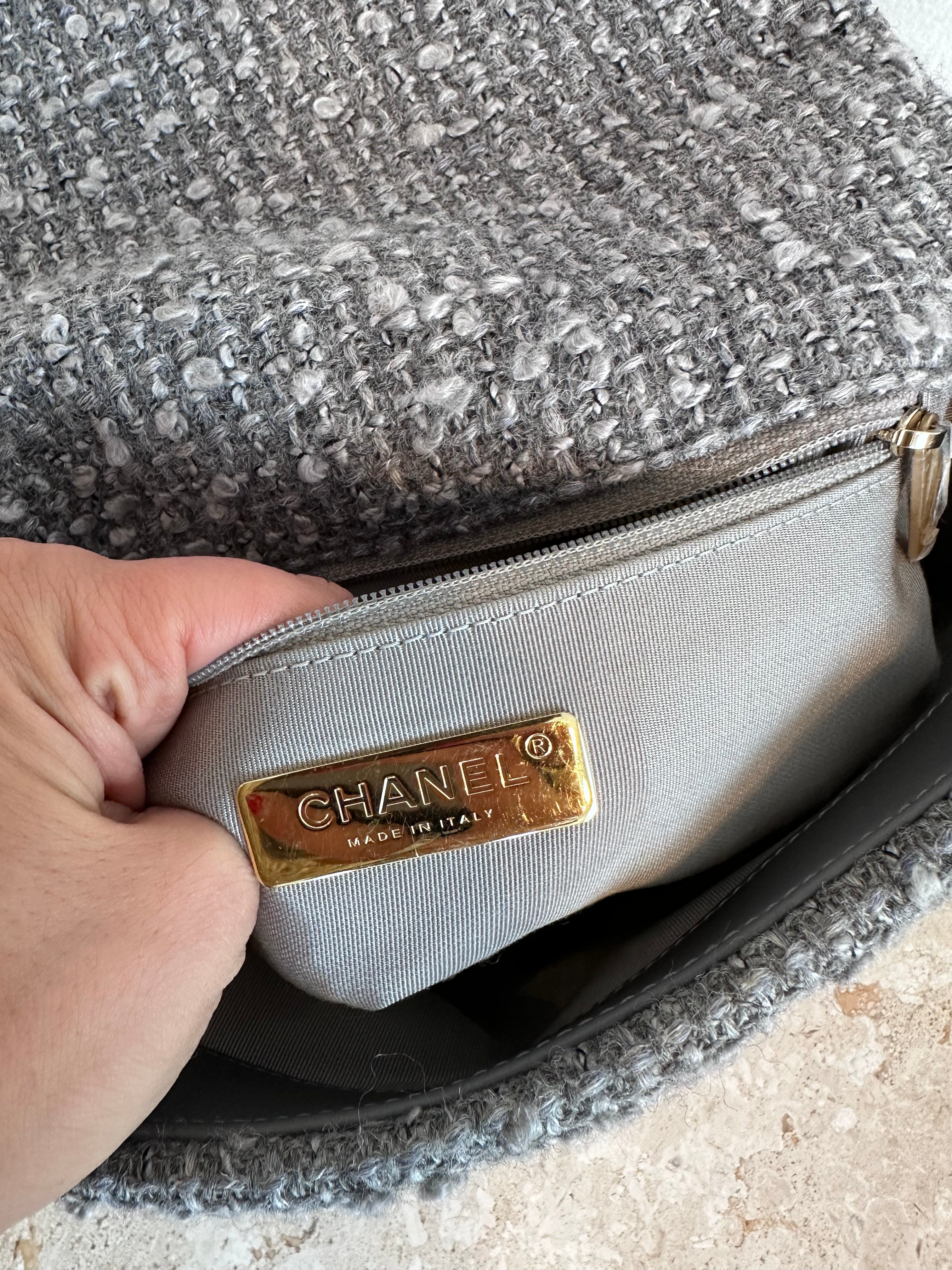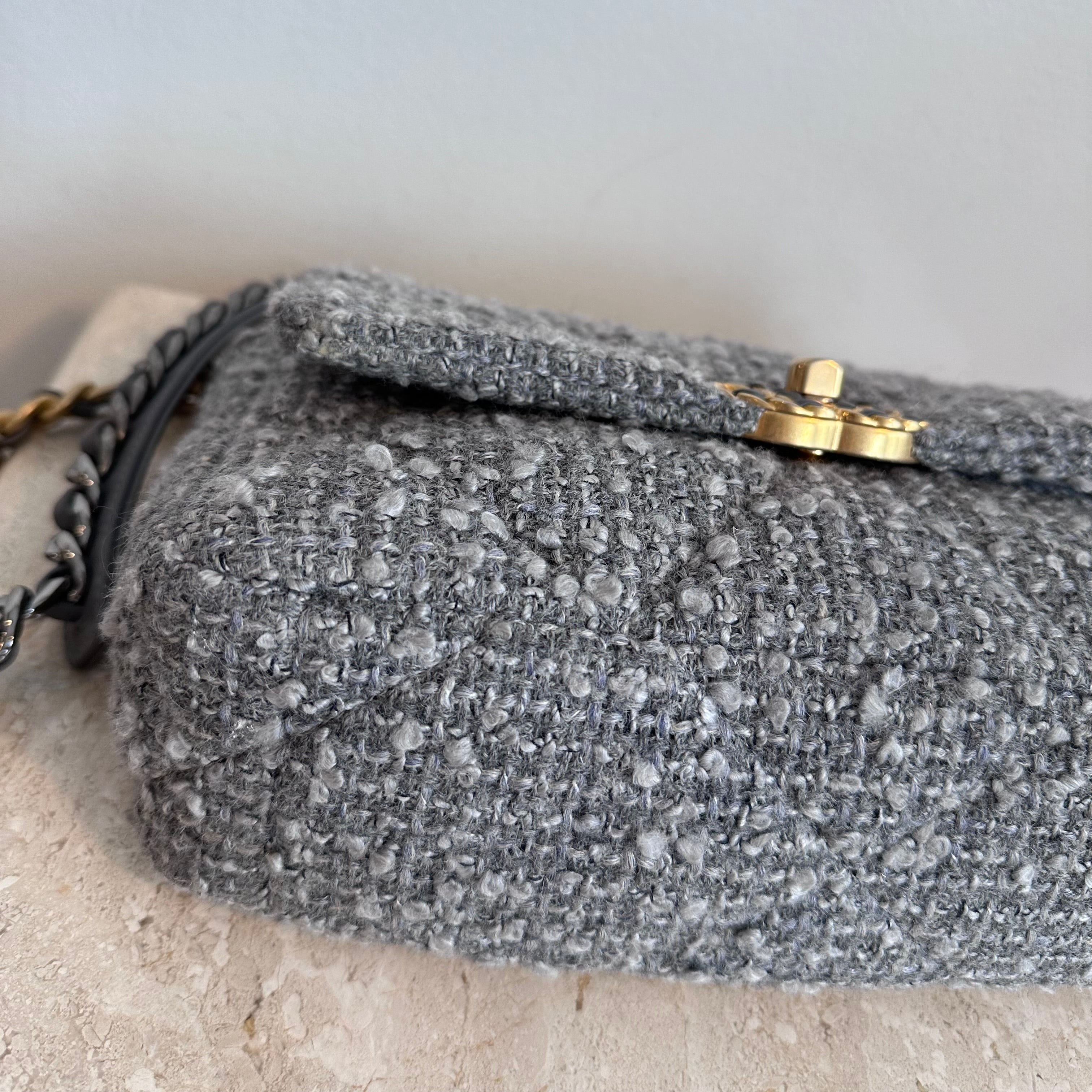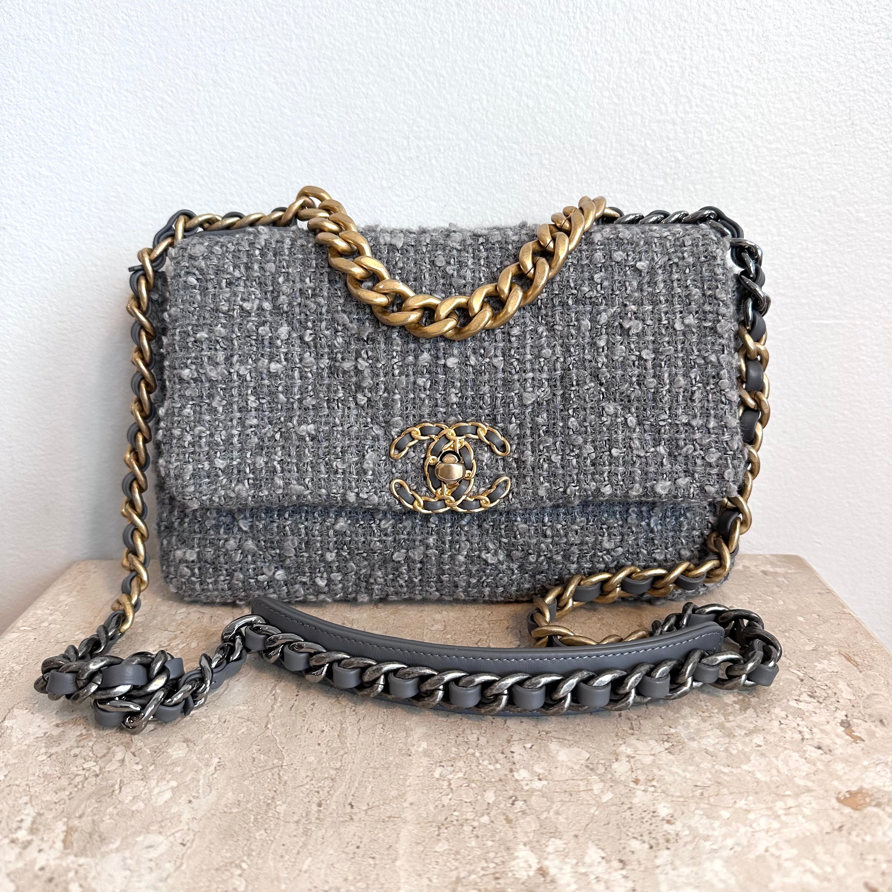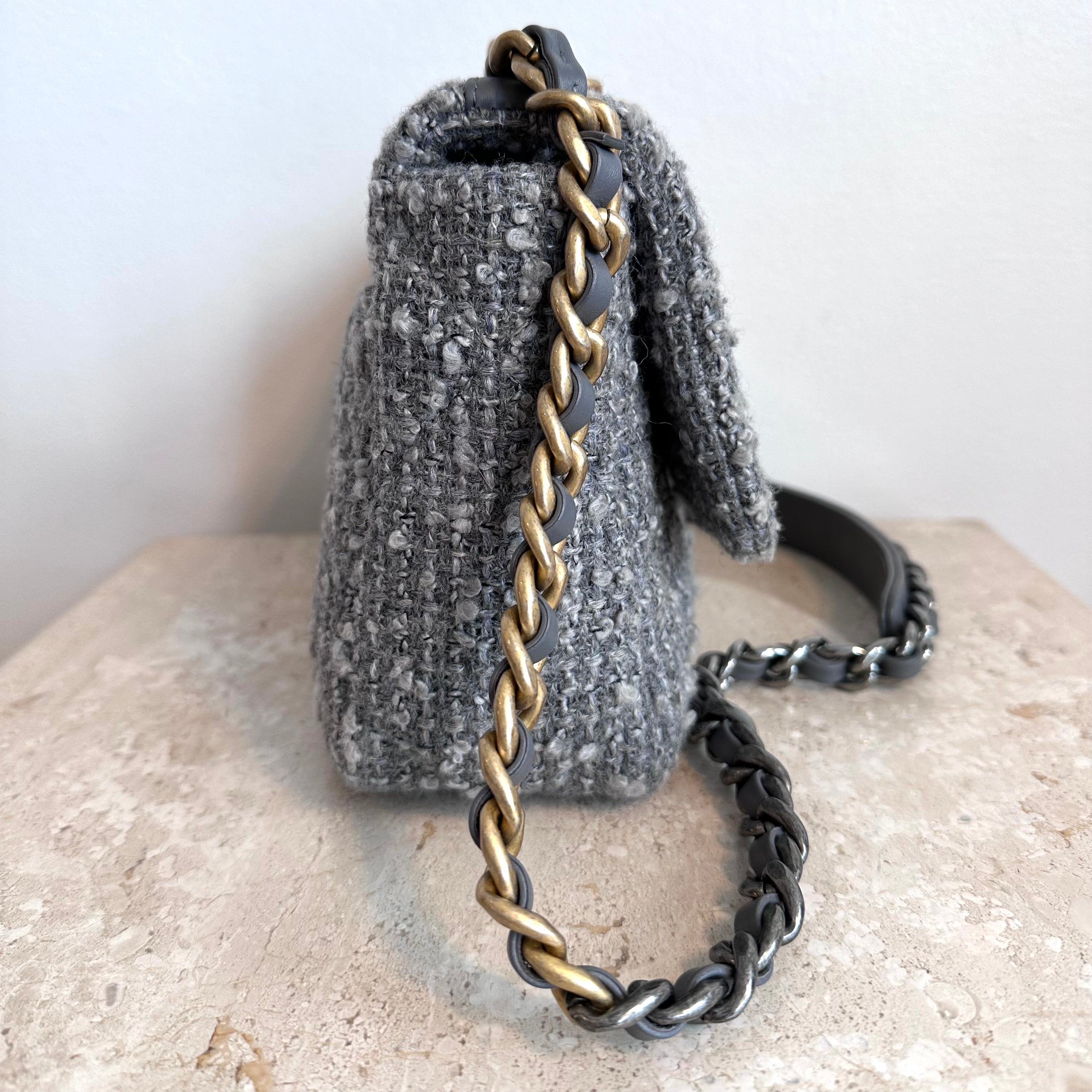 Pre-Owned Chanel™ 19 Grey Tweed. A rarely consigned goodie that is just stunning! Beautifully soft grey wool fabric with multi gold tone, silver tone hardware combination, is nothing short of stunning. The single flap, chain link initials open up to 1 zip pocket and more than enough space for all your essentials. In Canada our winters are so long that a winter bag that takes us through most of the seasons until spring peaks is key! Take this bag right from day to night. This bag is gorgeous!