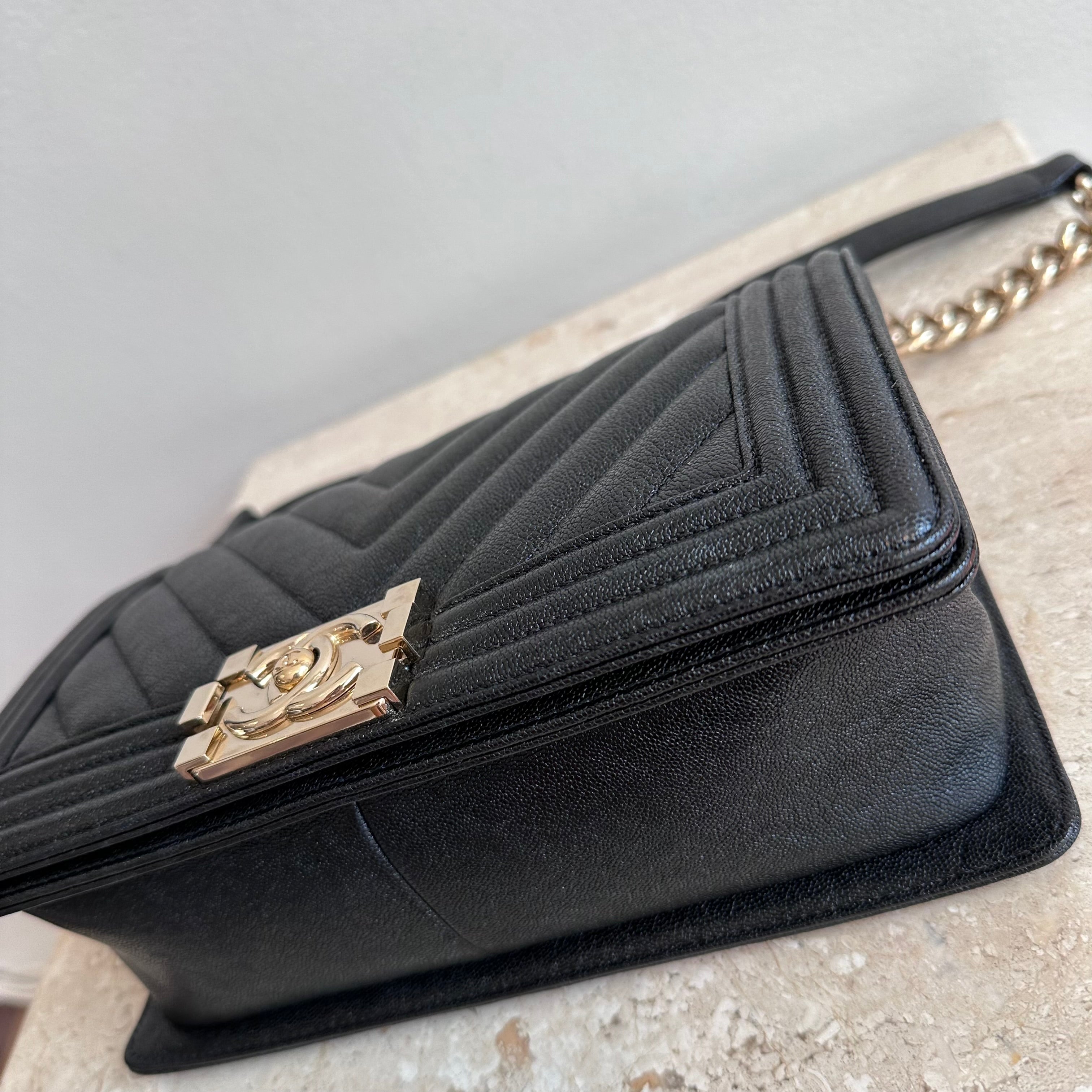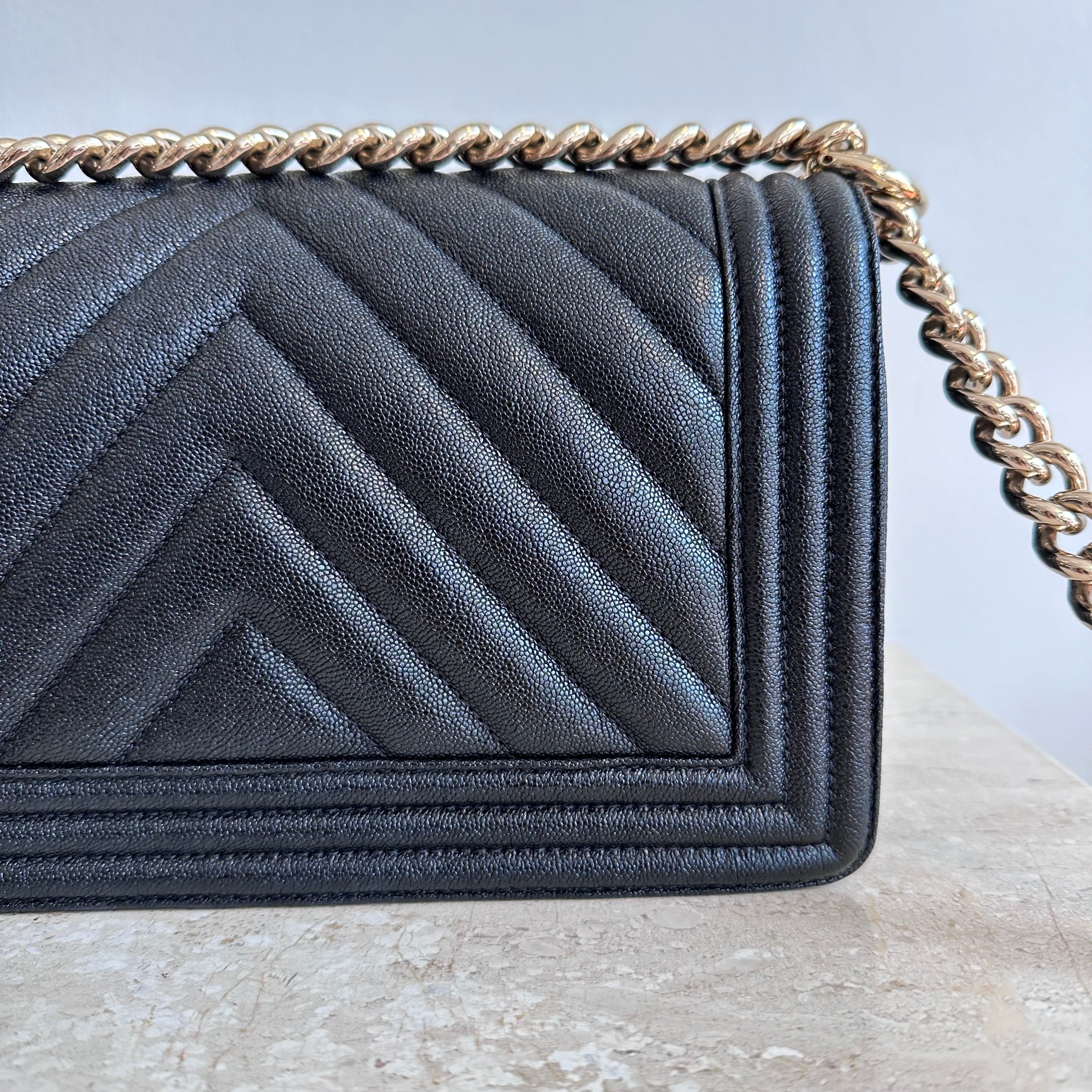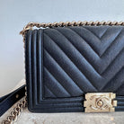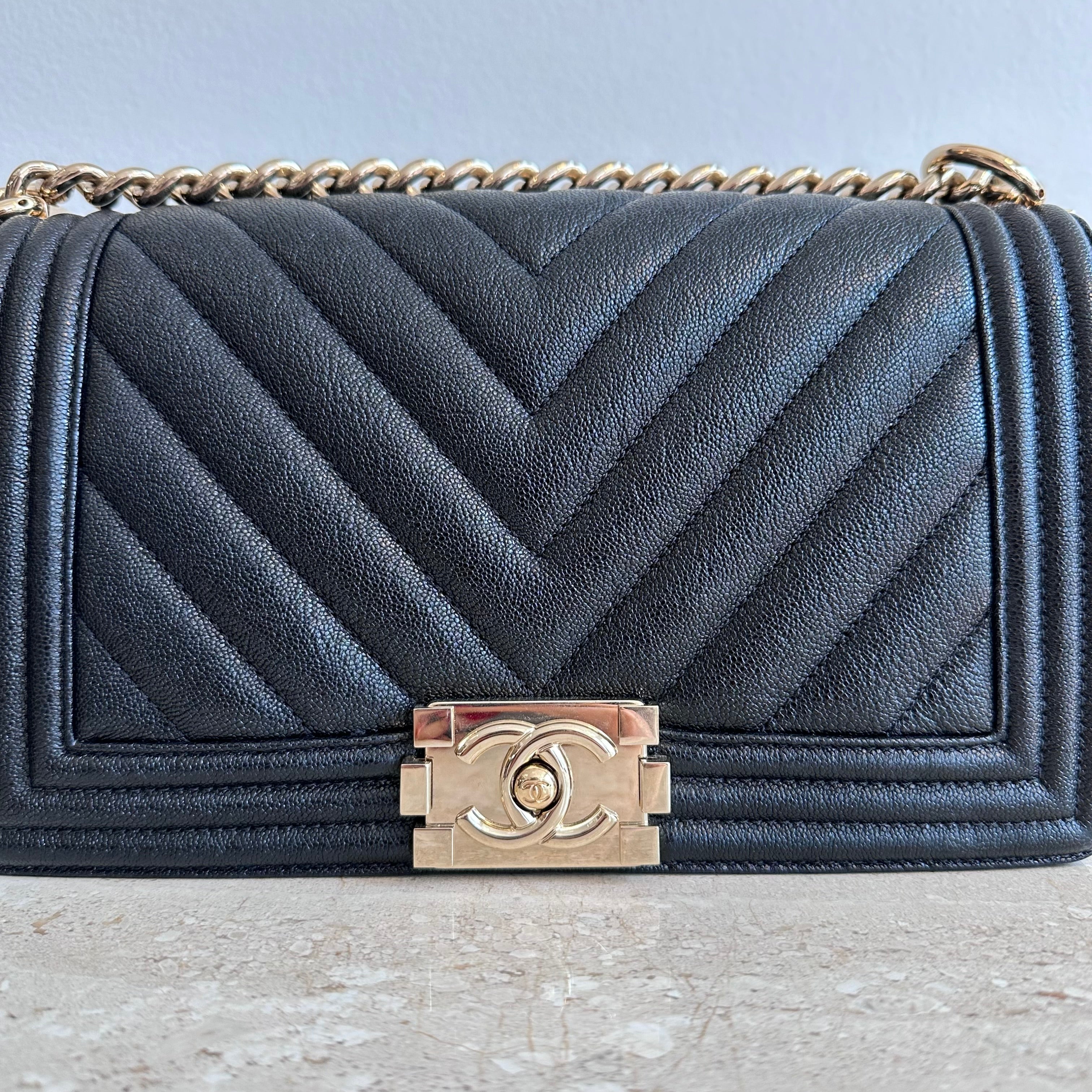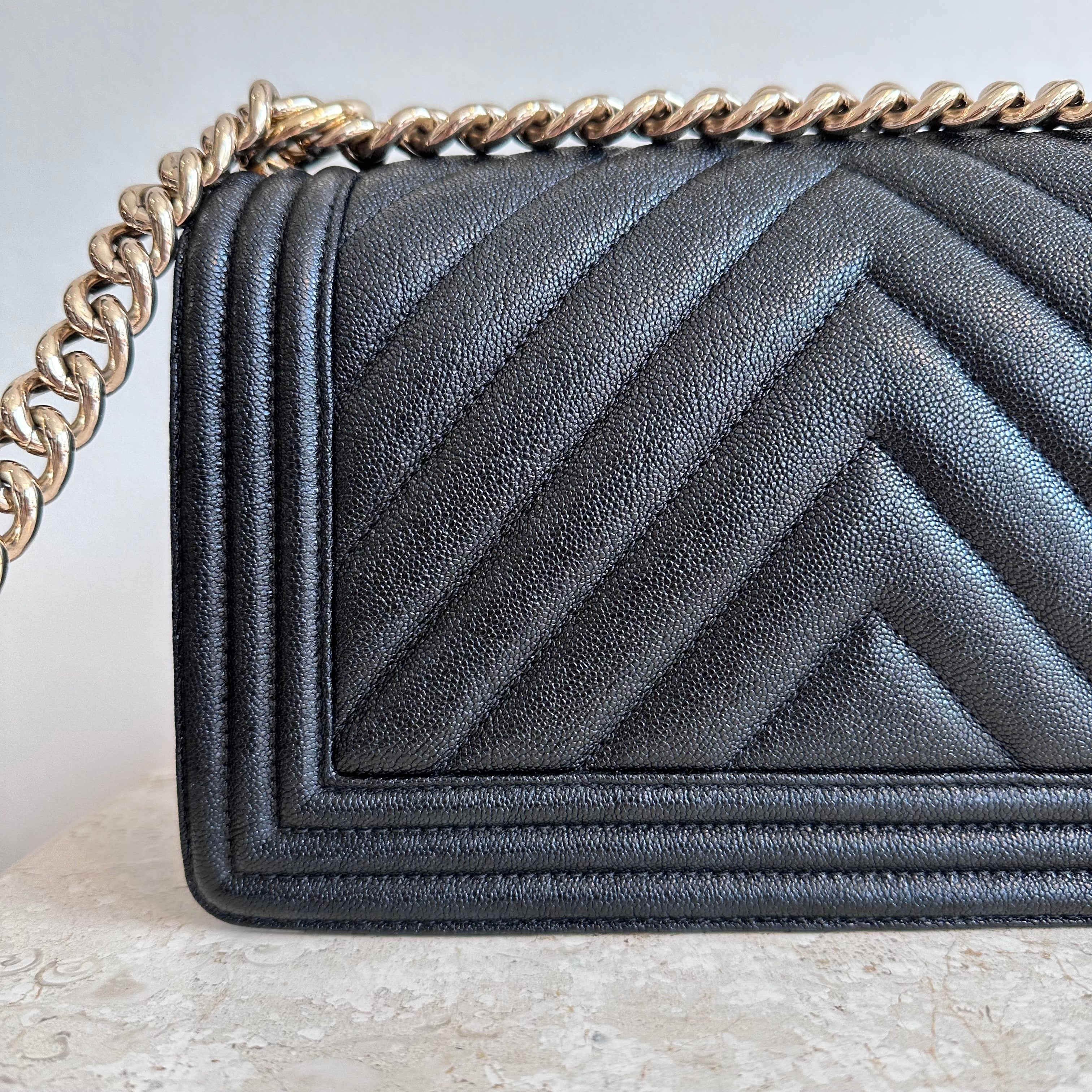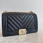Pre-Owned Chanel™ Medium Black Boy Bag - Grained Calfskin & Gold Tone Hardware. This exceptional bag with chevron stitched leather and the most beautiful hardware. This handbag the perfect accessory for anyones wardrobe. The strap can be worn singularly or doubled in both leather and chain. The flap opens up to a good size interior hosting 1 large slit pocket. Such a beauty!