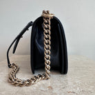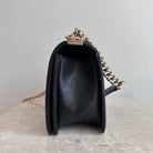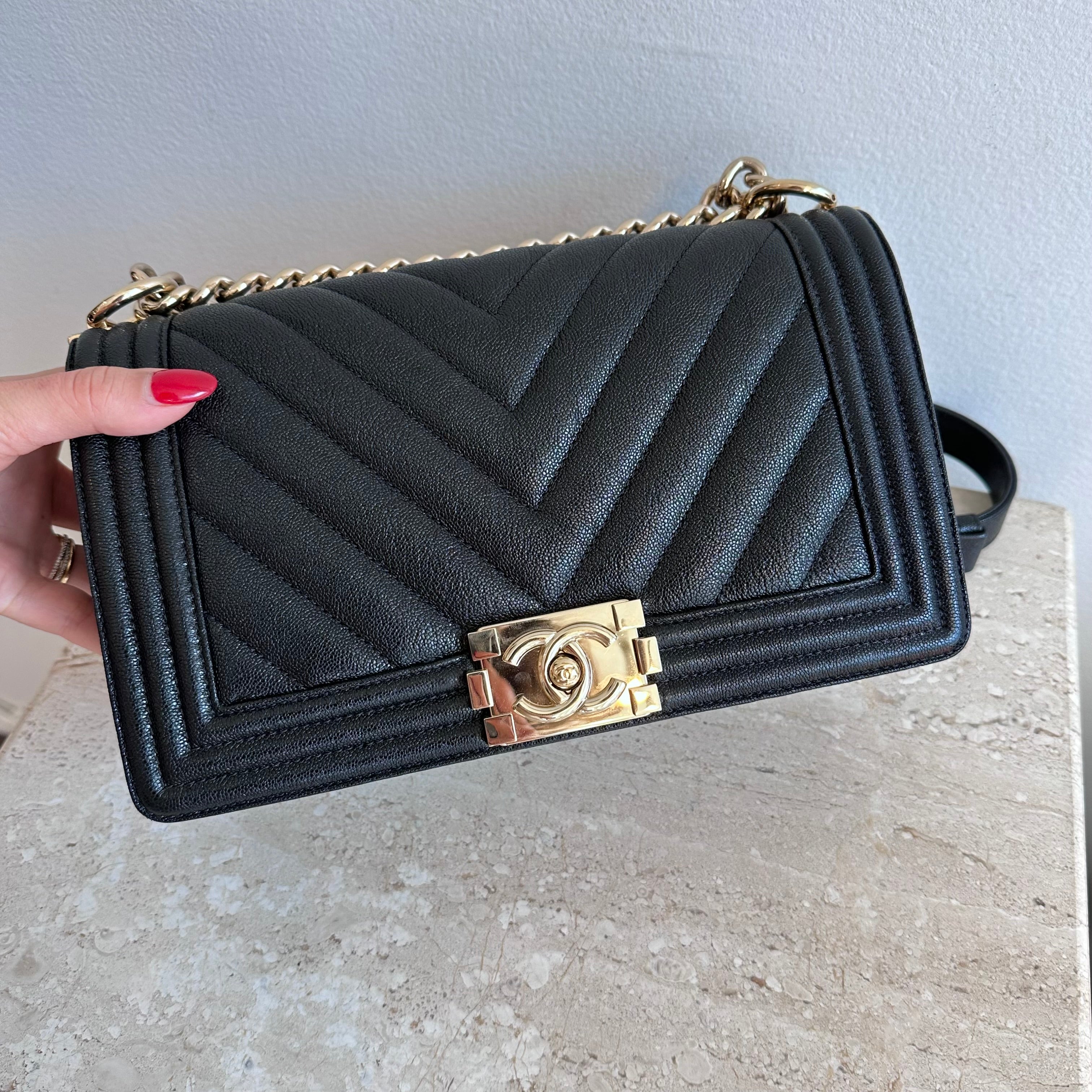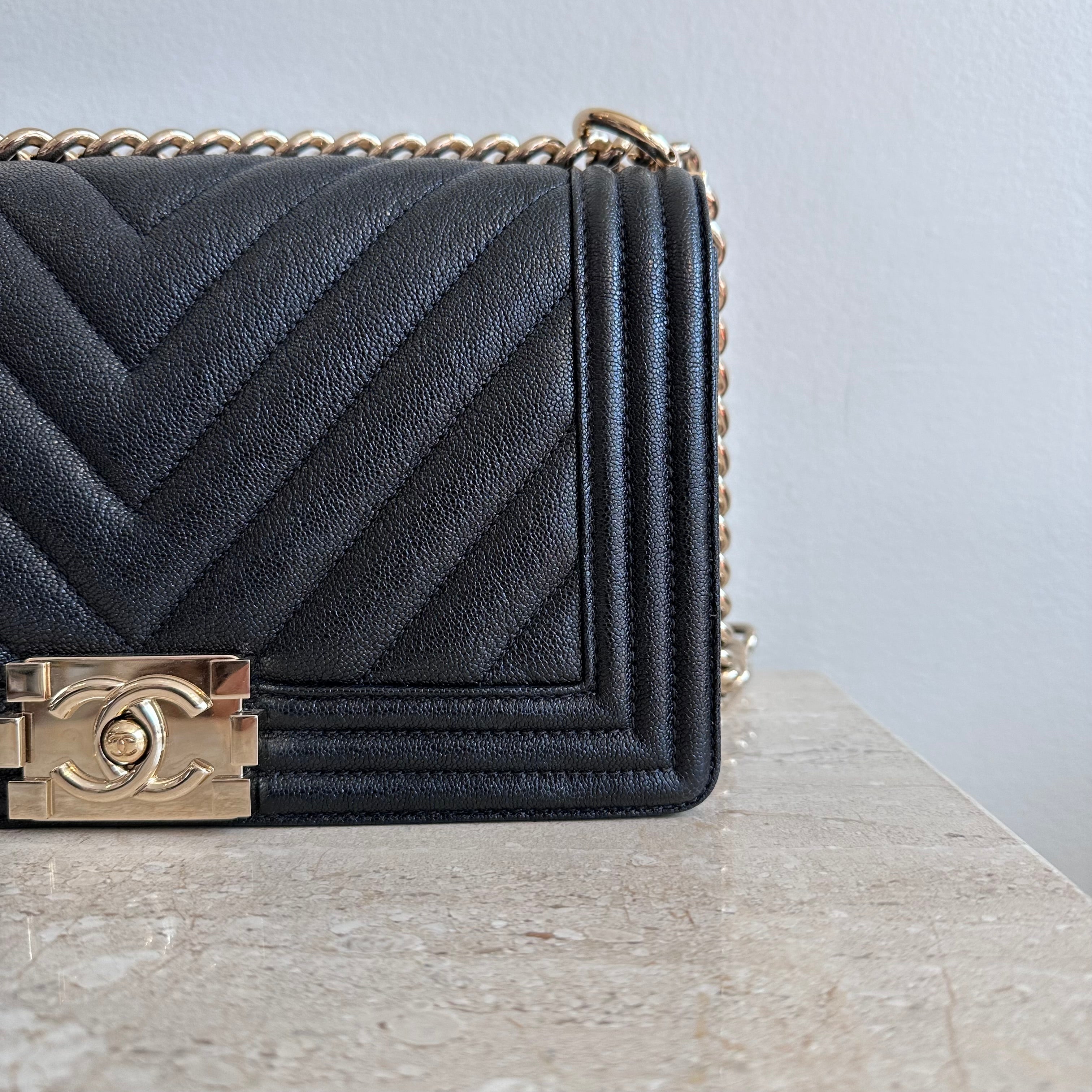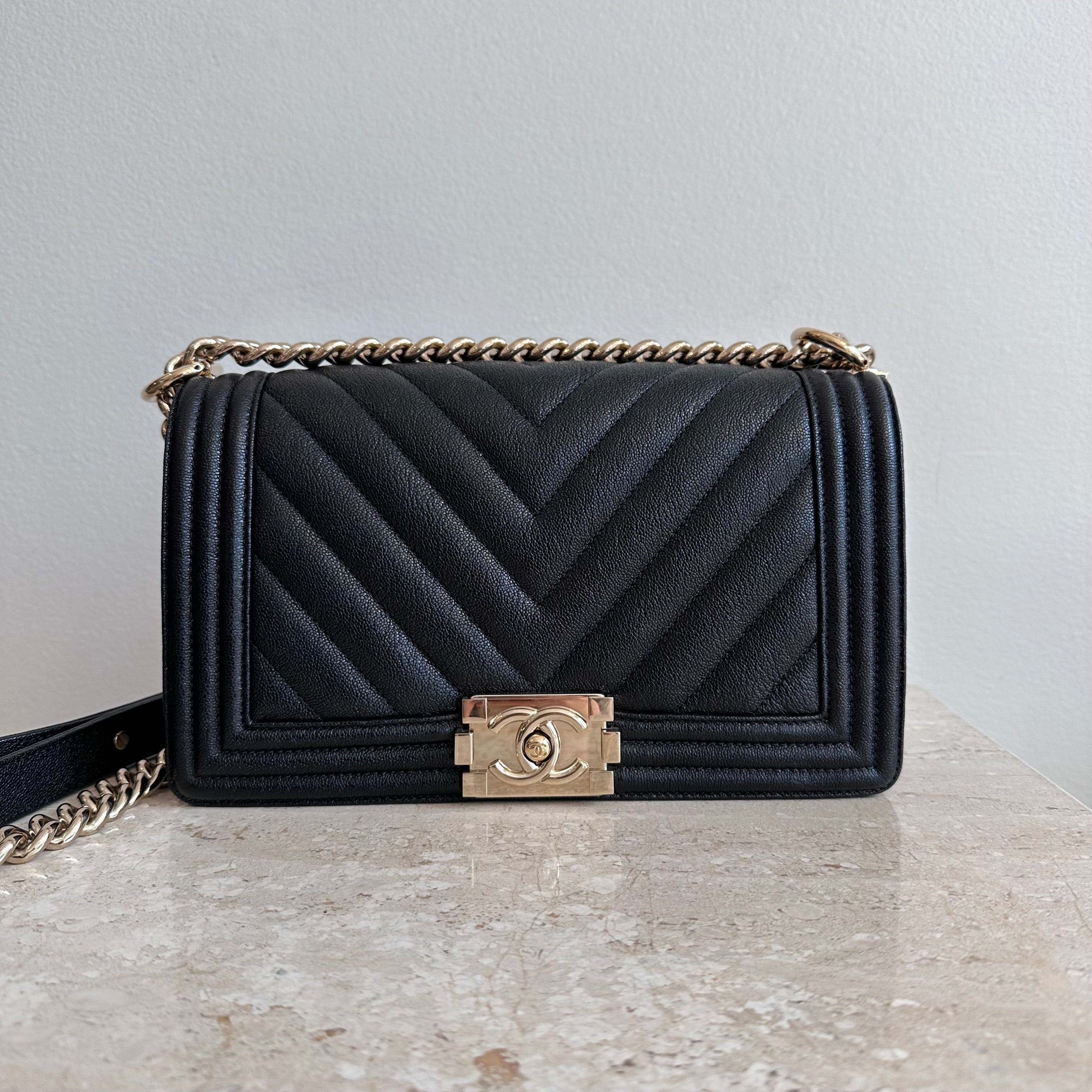 Pre-Owned Chanel™ Medium Black Boy Bag - Grained Calfskin & Gold Tone Hardware. This exceptional bag with chevron stitched leather and the most beautiful hardware. This handbag the perfect accessory for anyones wardrobe. The strap can be worn singularly or doubled in both leather and chain. The flap opens up to a good size interior hosting 1 large slit pocket. Such a beauty!