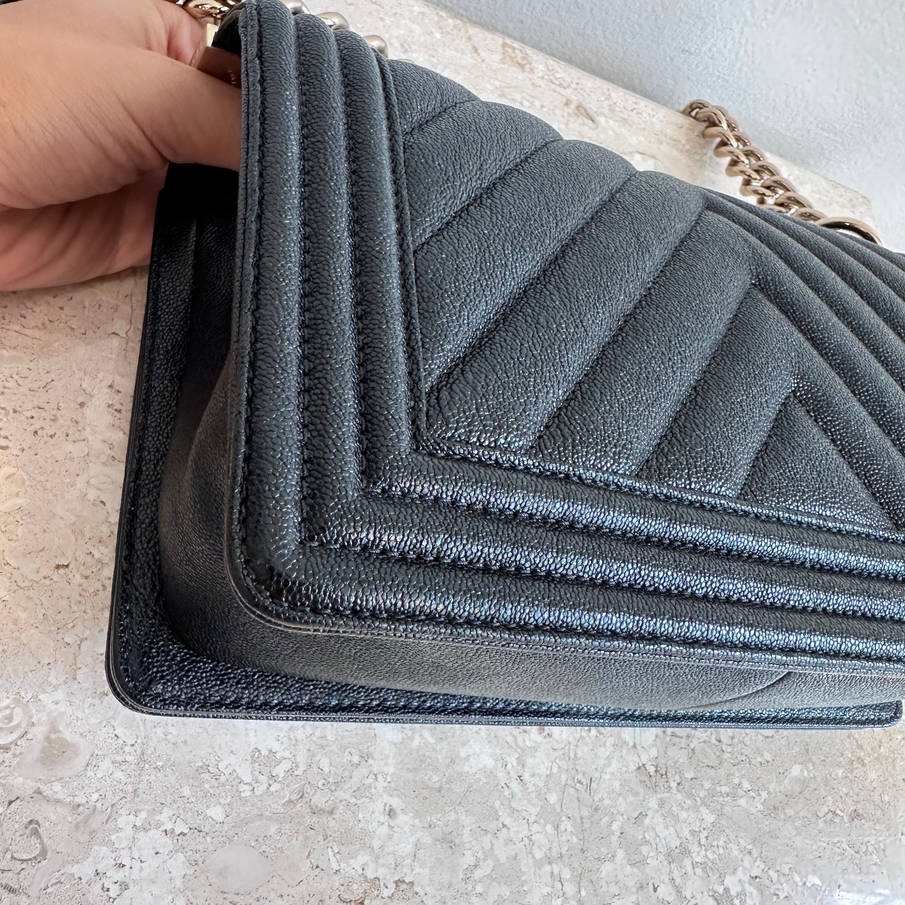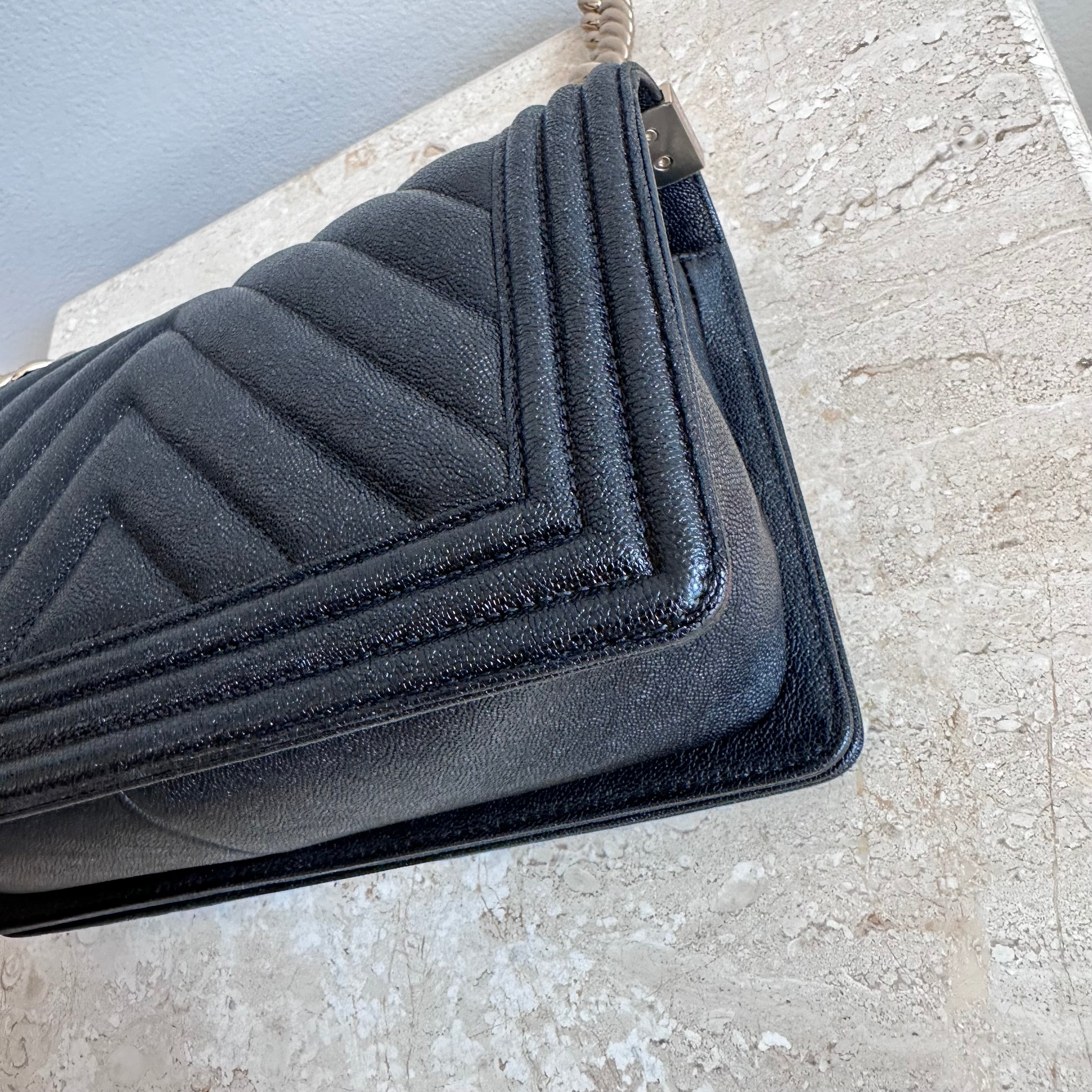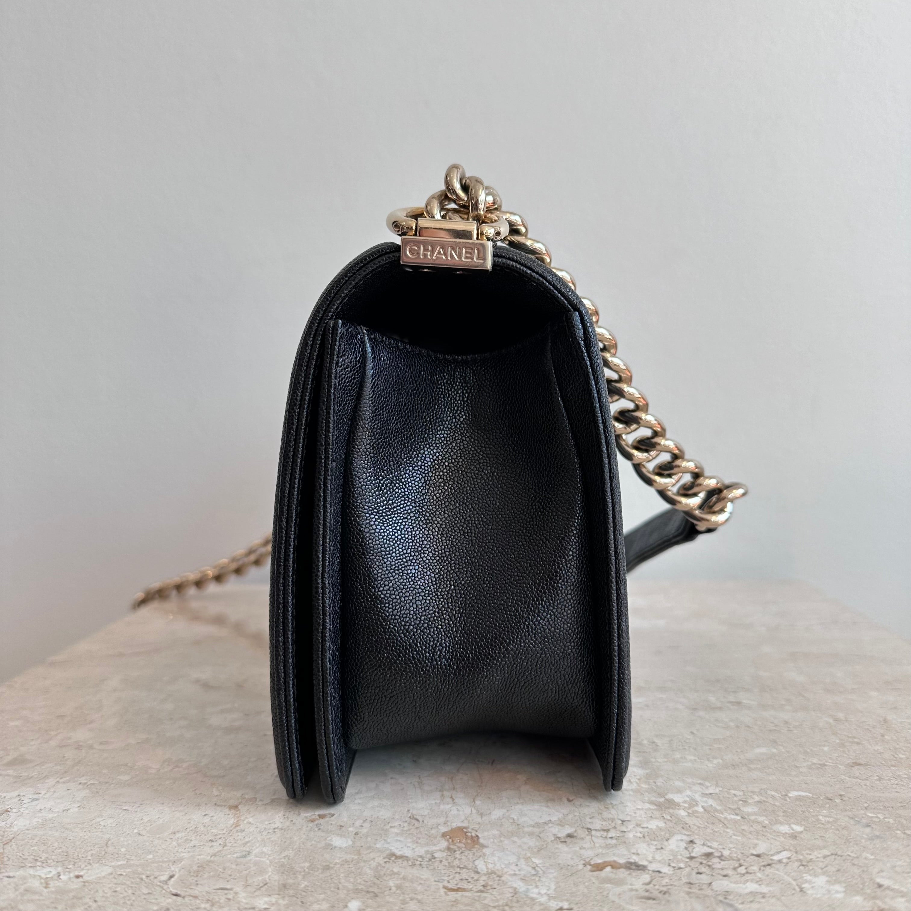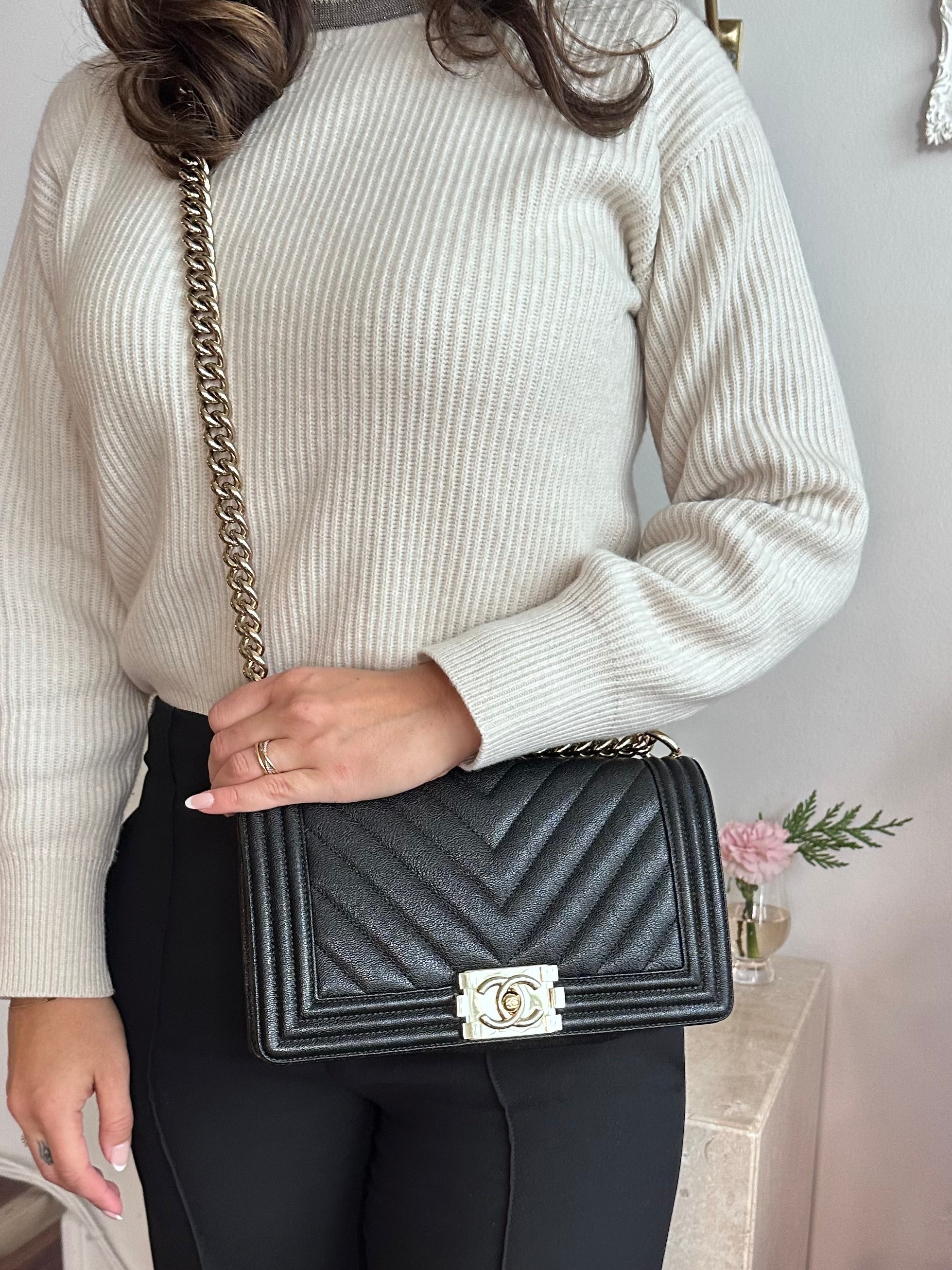 Pre-Owned Chanel™ Medium Black Boy Bag - Grained Calfskin & Gold Tone Hardware. This exceptional bag with chevron stitched leather and the most beautiful hardware. This handbag the perfect accessory for anyones wardrobe. The strap can be worn singularly or doubled in both leather and chain. The flap opens up to a good size interior hosting 1 large slit pocket. Such a beauty!