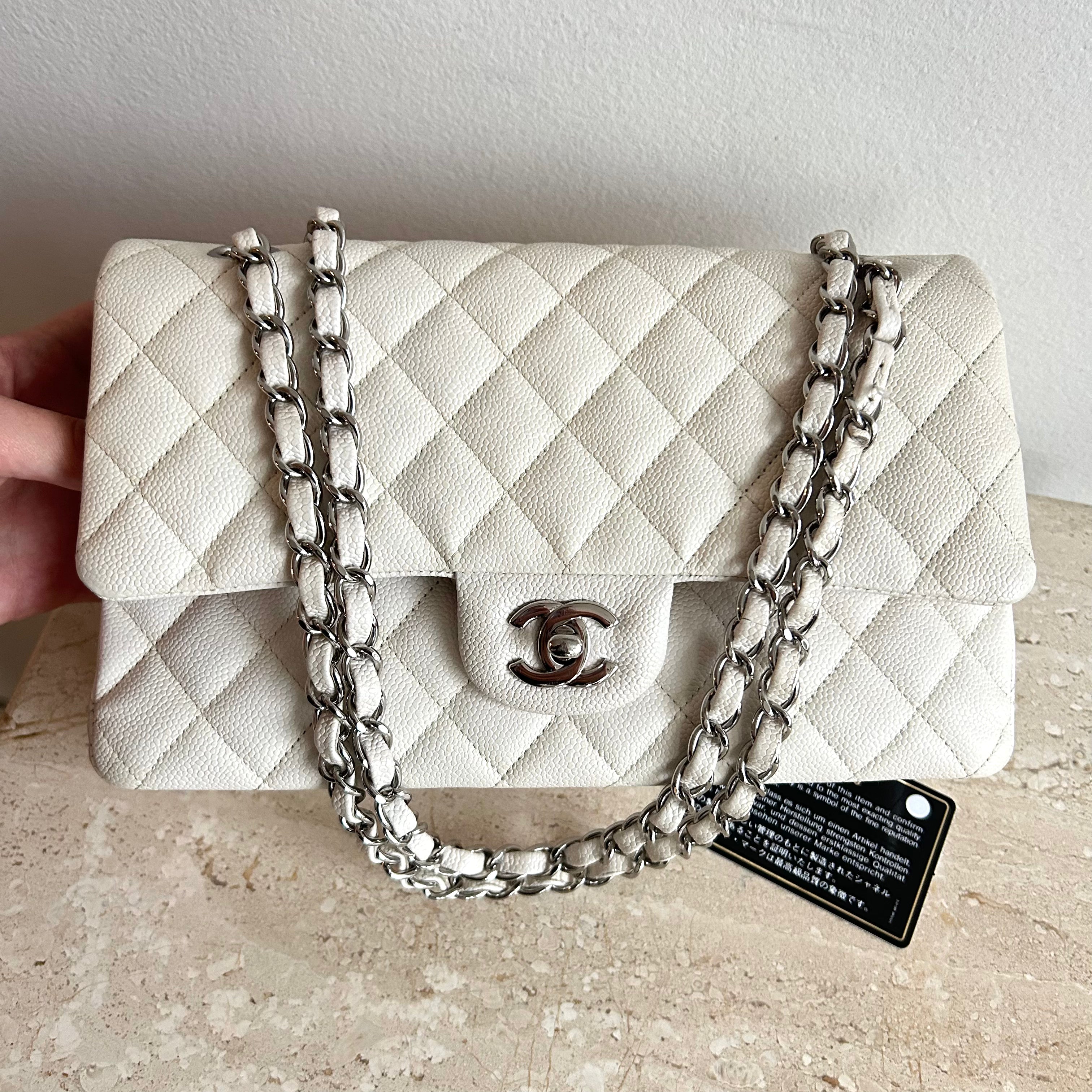 Pre-Owned Chanel™ Classic Medium White Caviar Double Flap Handbag. This stunning handbag is crafted from luxurious white caviar leather and finished with silver tone hardware. The classic diamond quilted design gives it an iconic look, while the leather-lined interior includes two pockets for easy organization. Elegant and timeless, this piece is perfect for both everyday sophistication and special occasions. This bag has slightly changed colour overtime, however it maintains its beauty and still has so much life left! At this fab price, this is a beautiful addition to any collection!