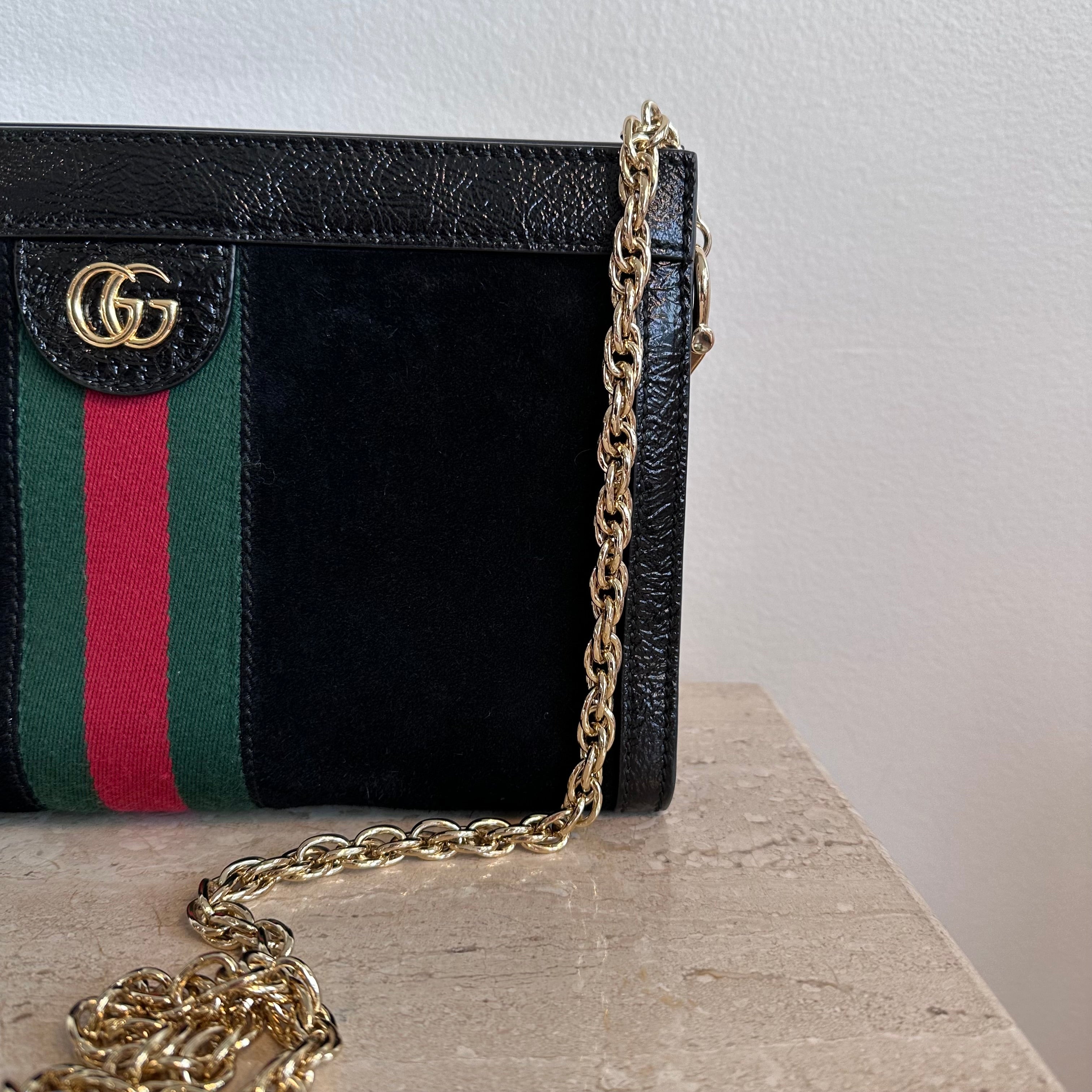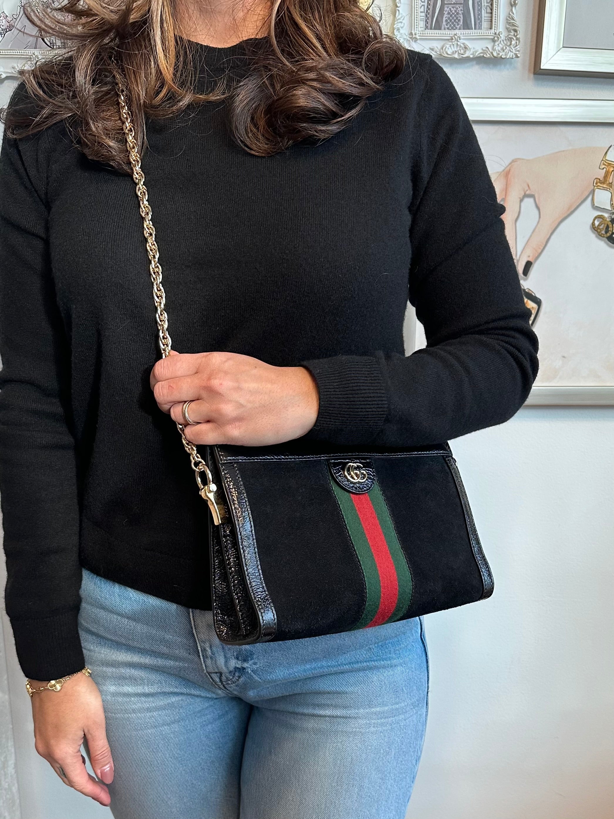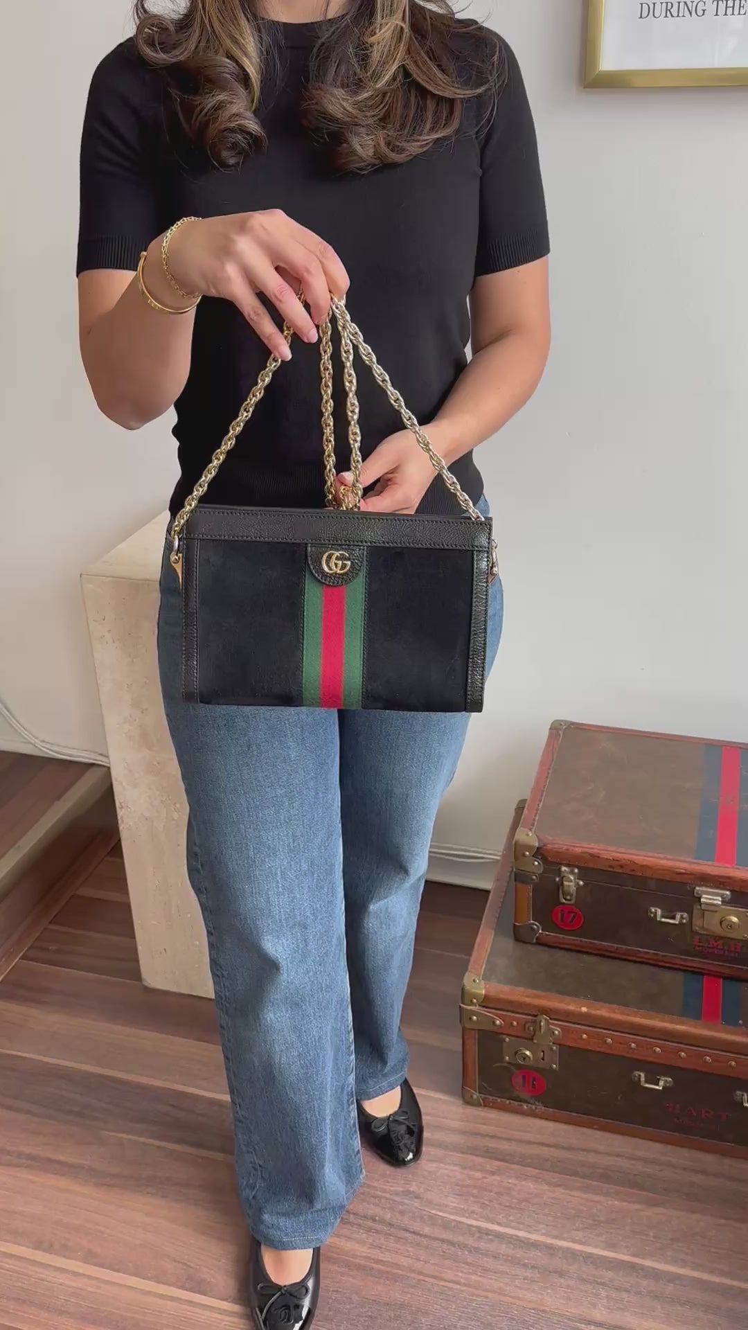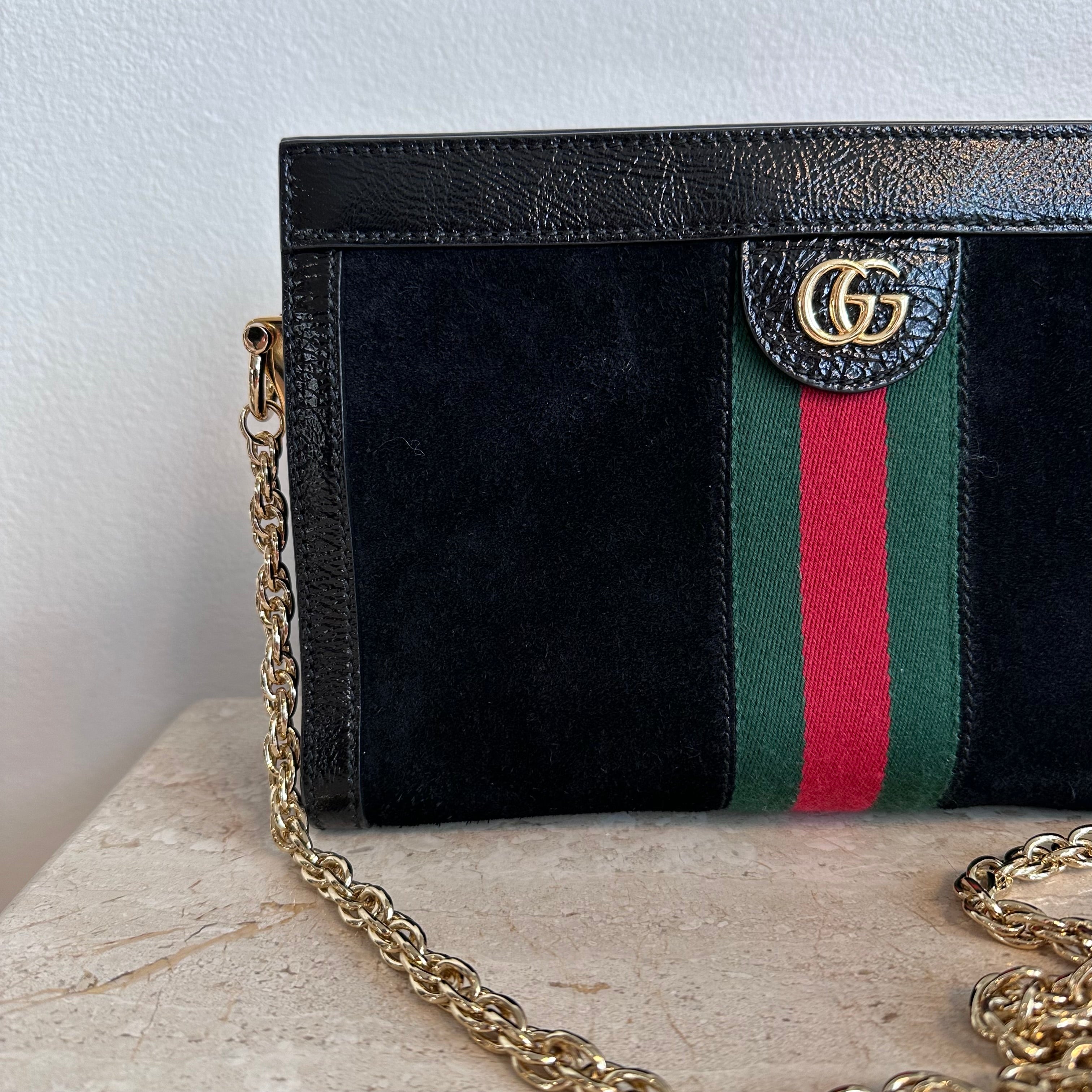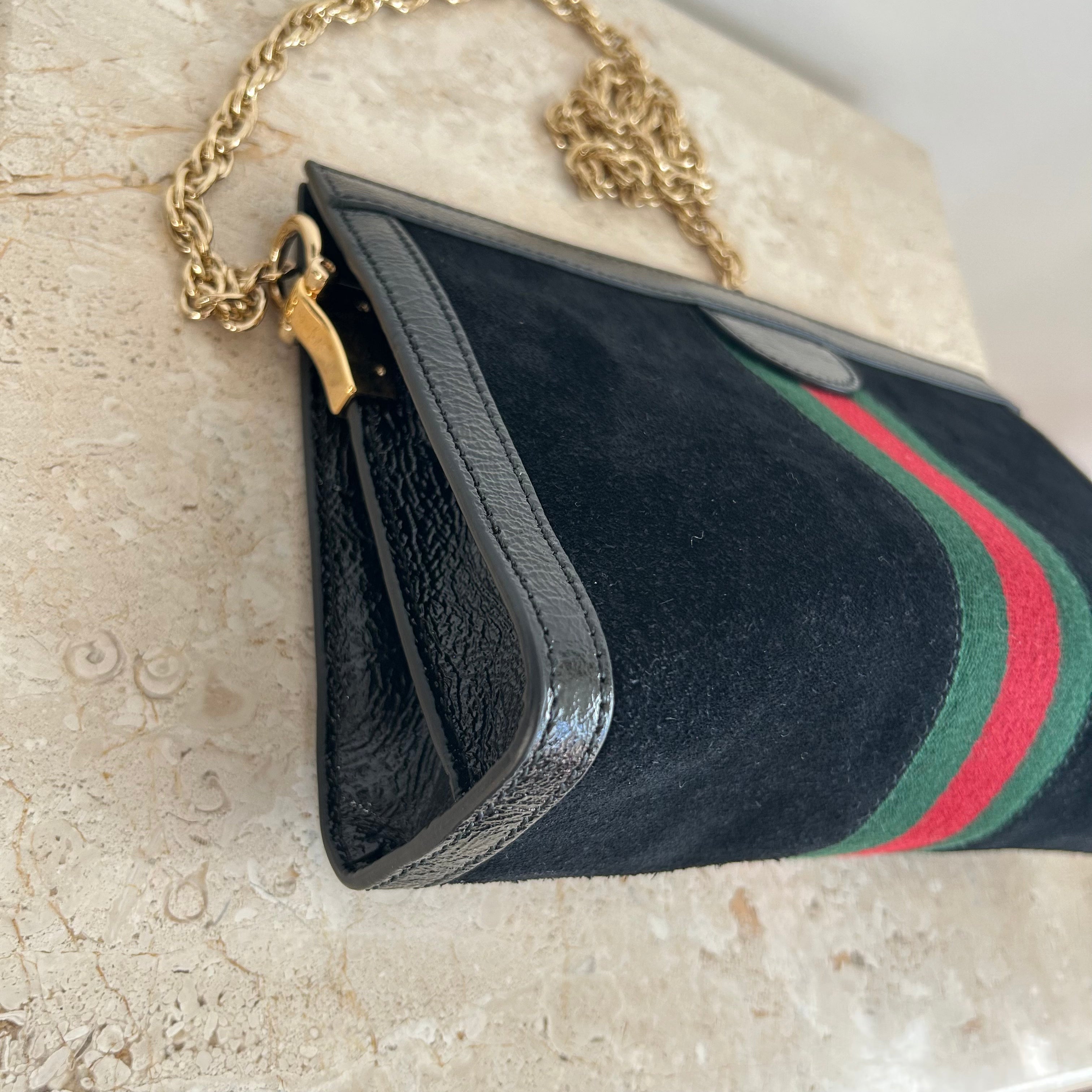 Pre-Owned Gucci Suede Small Ophidia Shoulder Bag in Black. A rectangle shape bag in black suede with black patent lining details. With inlaid green and red Web stripe, featuring a play on the Double G, an archival Gucci code from the '70s that appears atop a leather tab detail. Opens to a blue fabric lined interior divided in two compartments with a slip pocket. Tuck the chain in to carry as a clutch or wear on the shoulder!