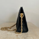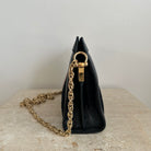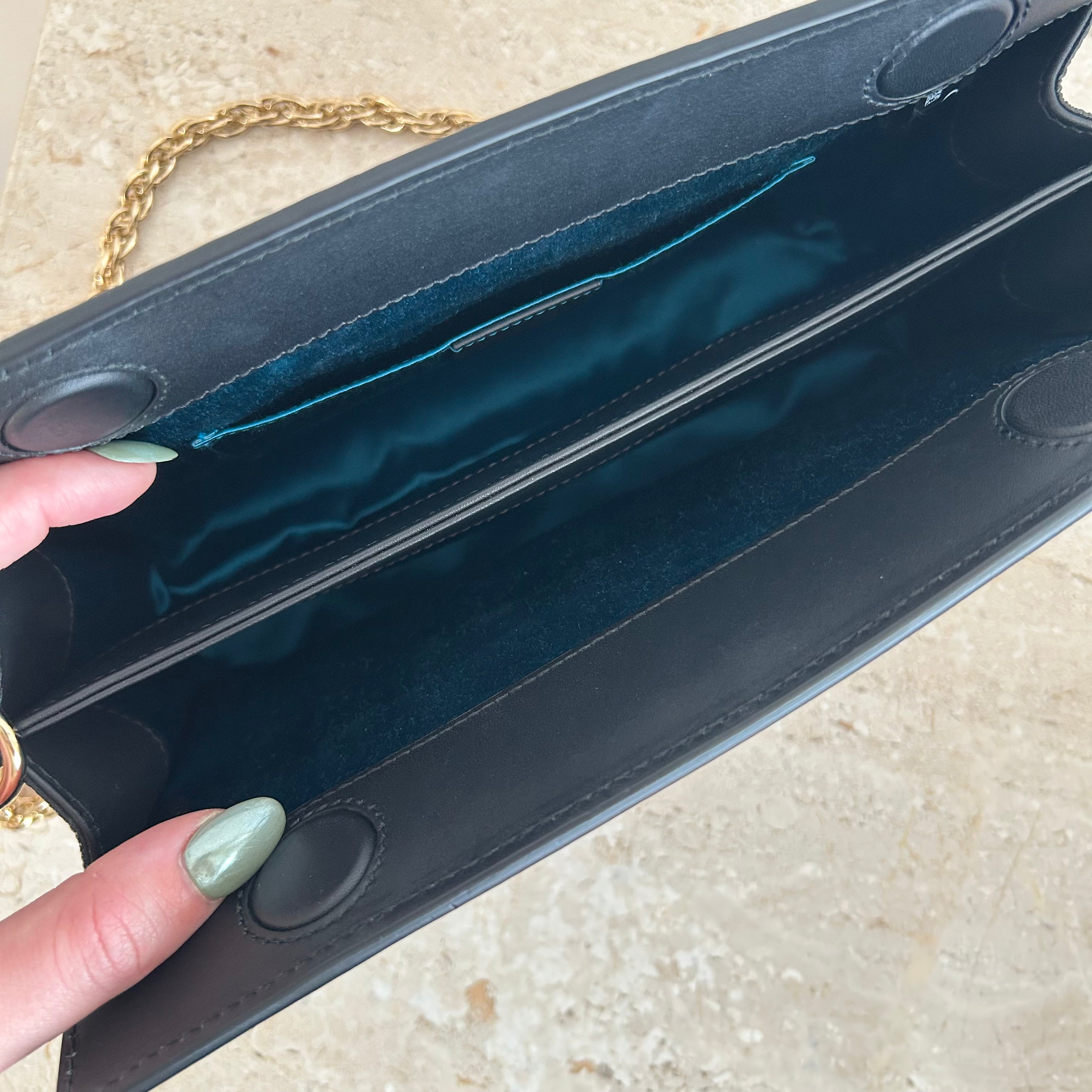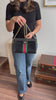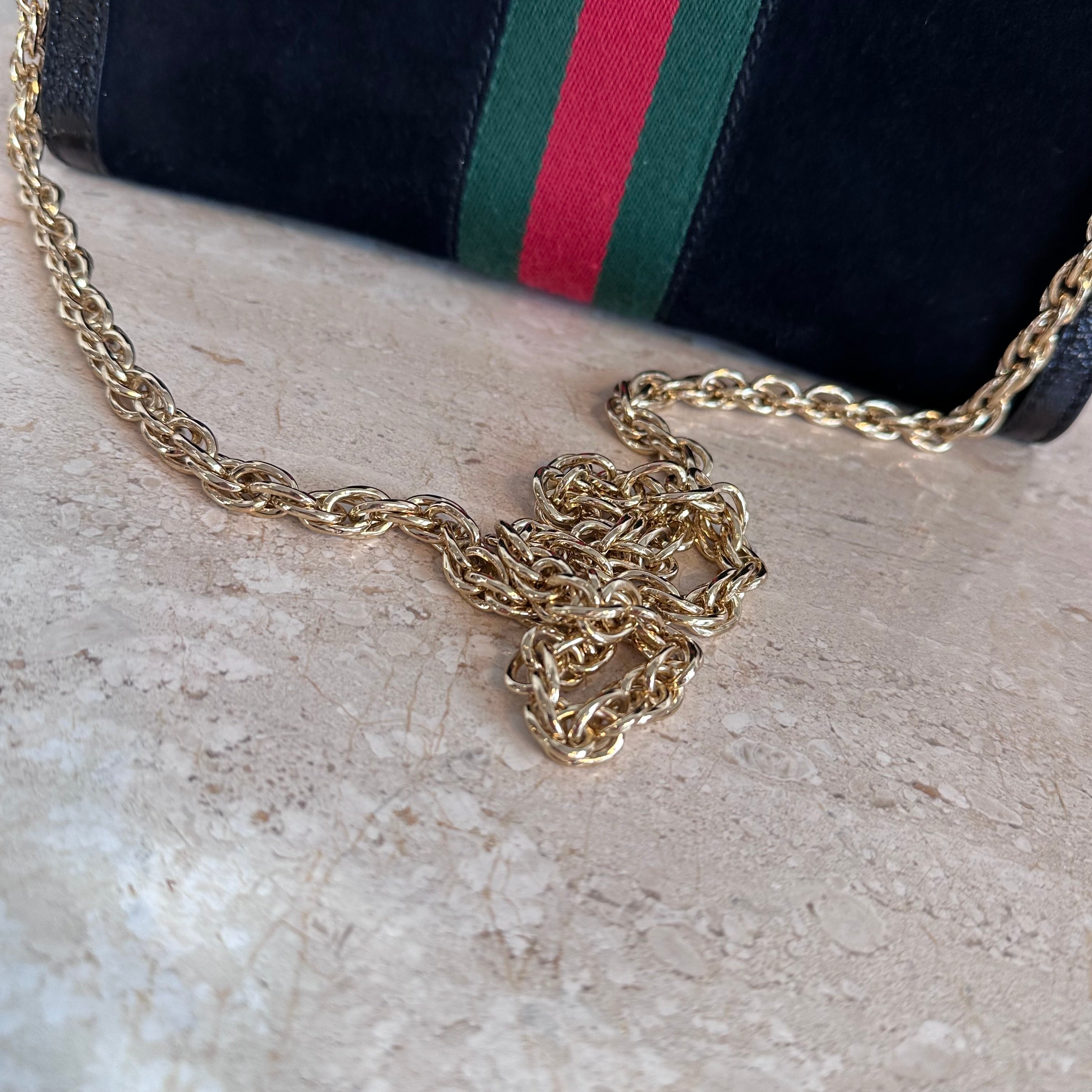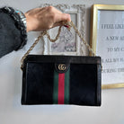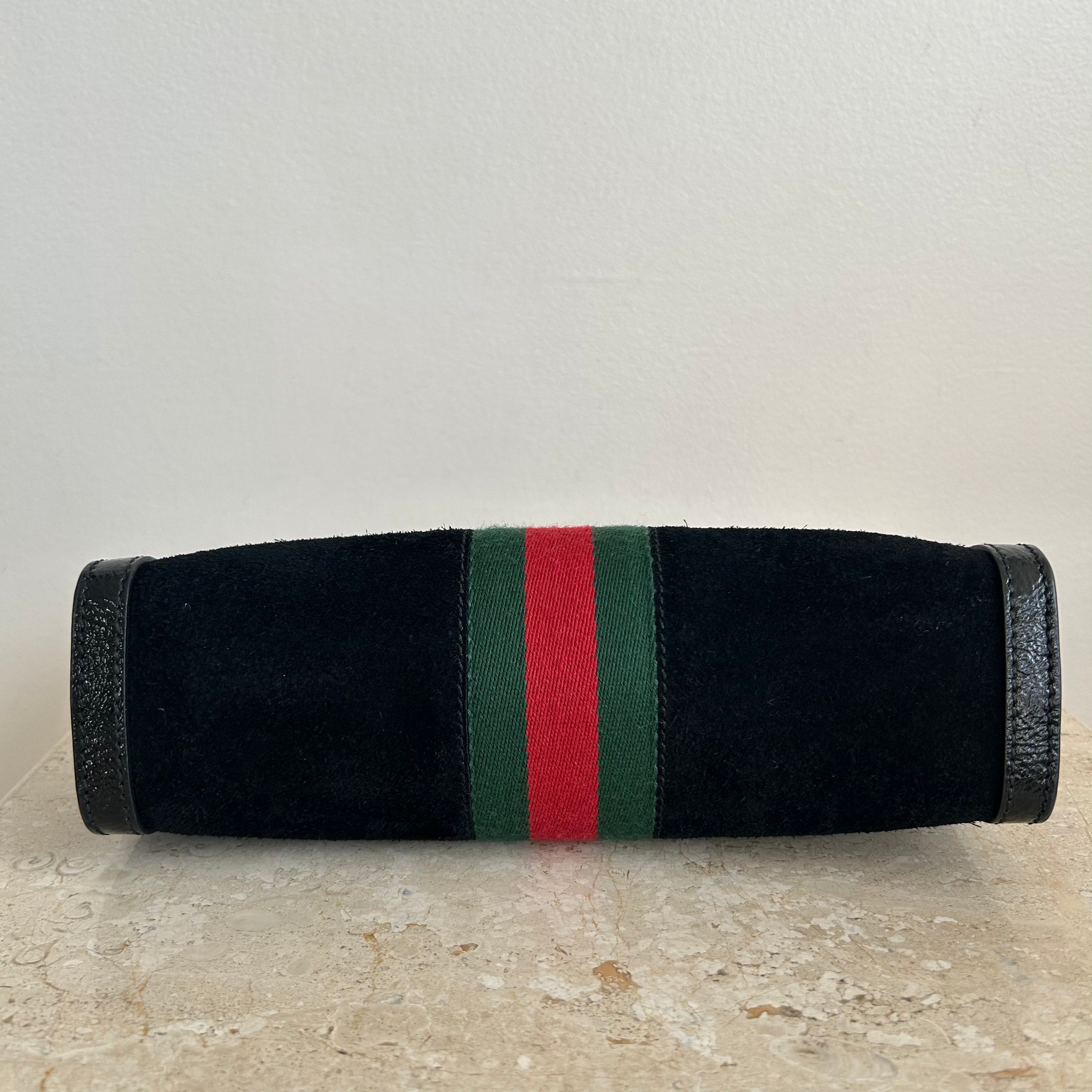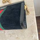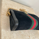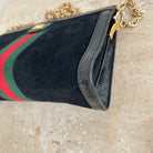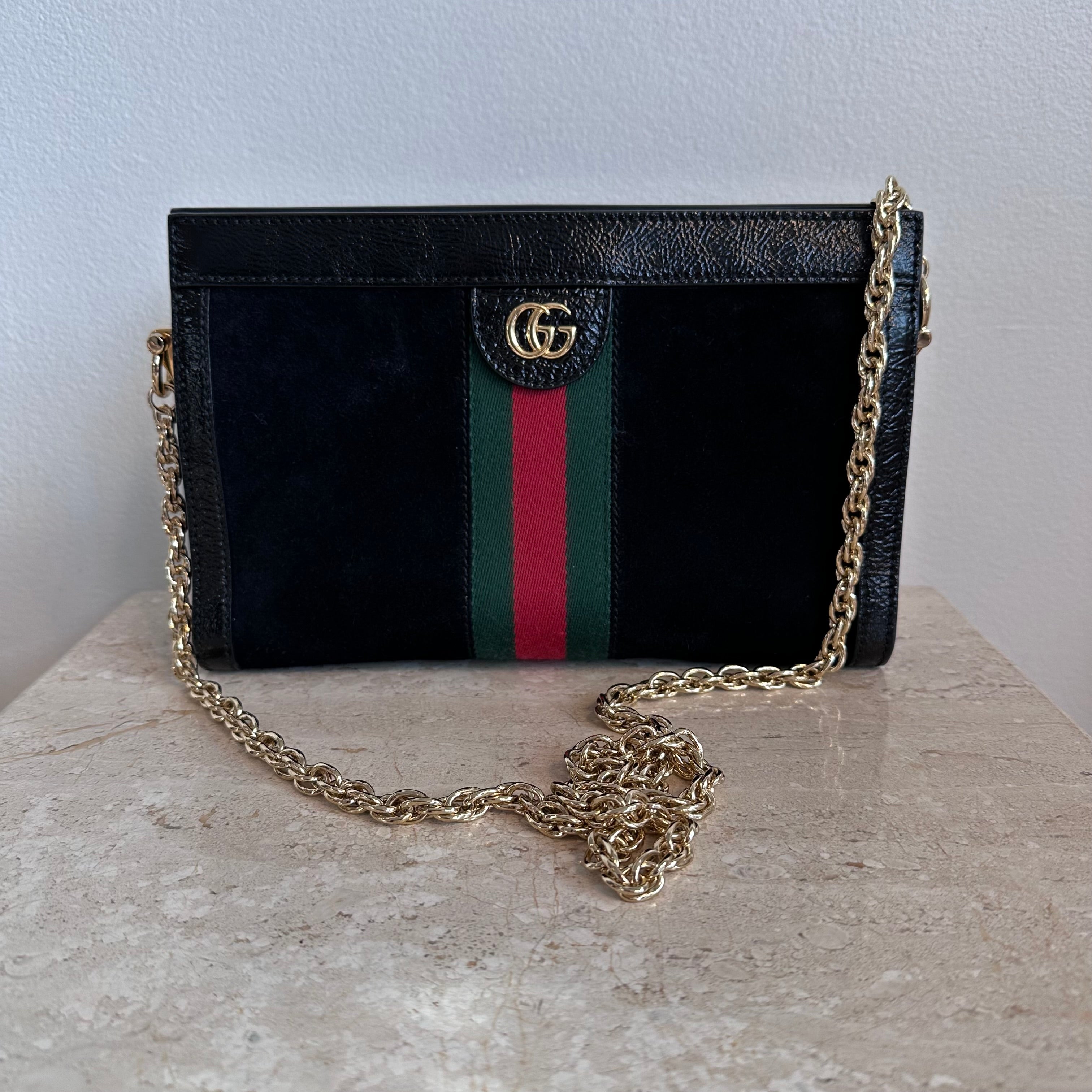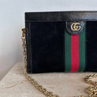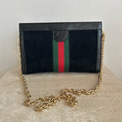 Pre-Owned Gucci Suede Small Ophidia Shoulder Bag in Black. A rectangle shape bag in black suede with black patent lining details. With inlaid green and red Web stripe, featuring a play on the Double G, an archival Gucci code from the '70s that appears atop a leather tab detail. Opens to a blue fabric lined interior divided in two compartments with a slip pocket. Tuck the chain in to carry as a clutch or wear on the shoulder!
