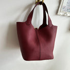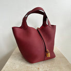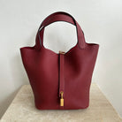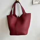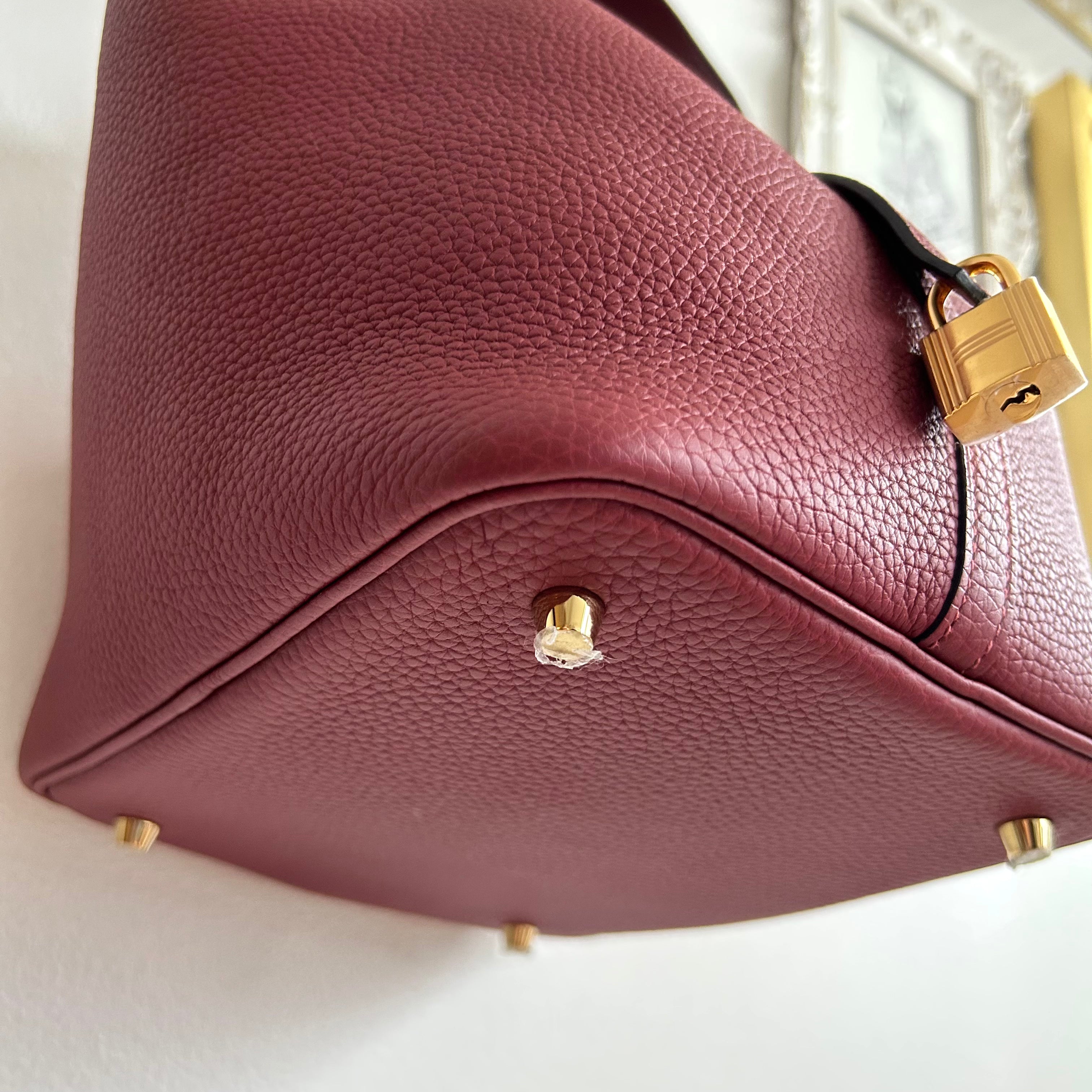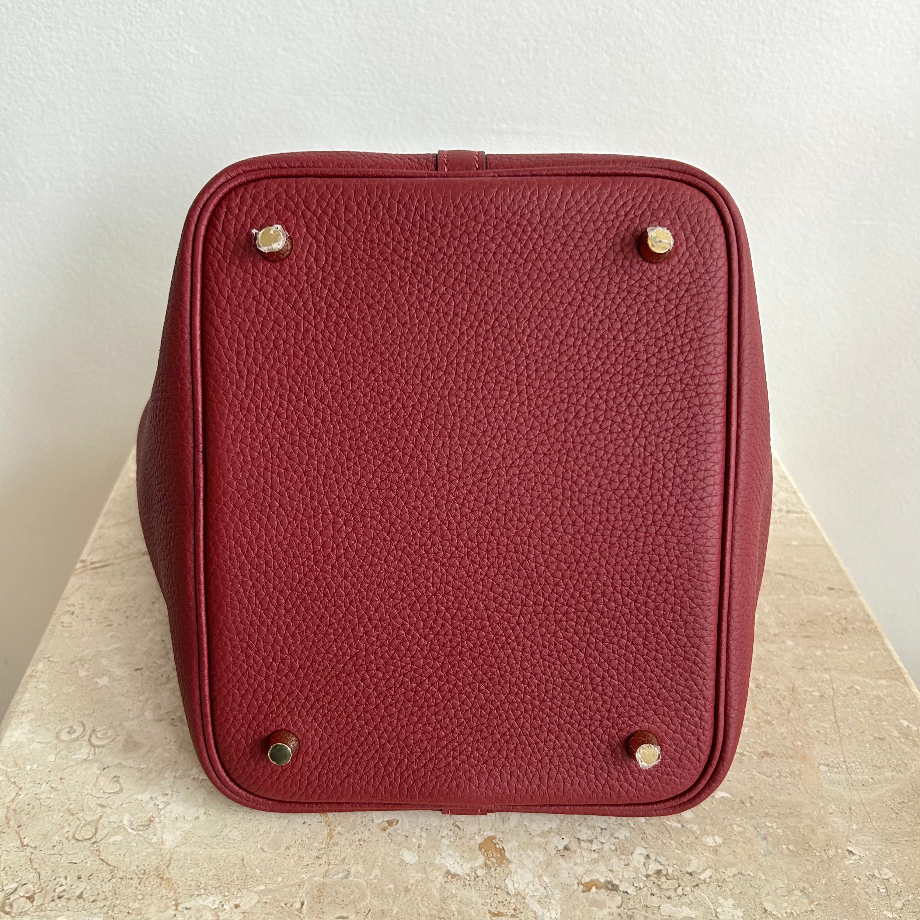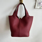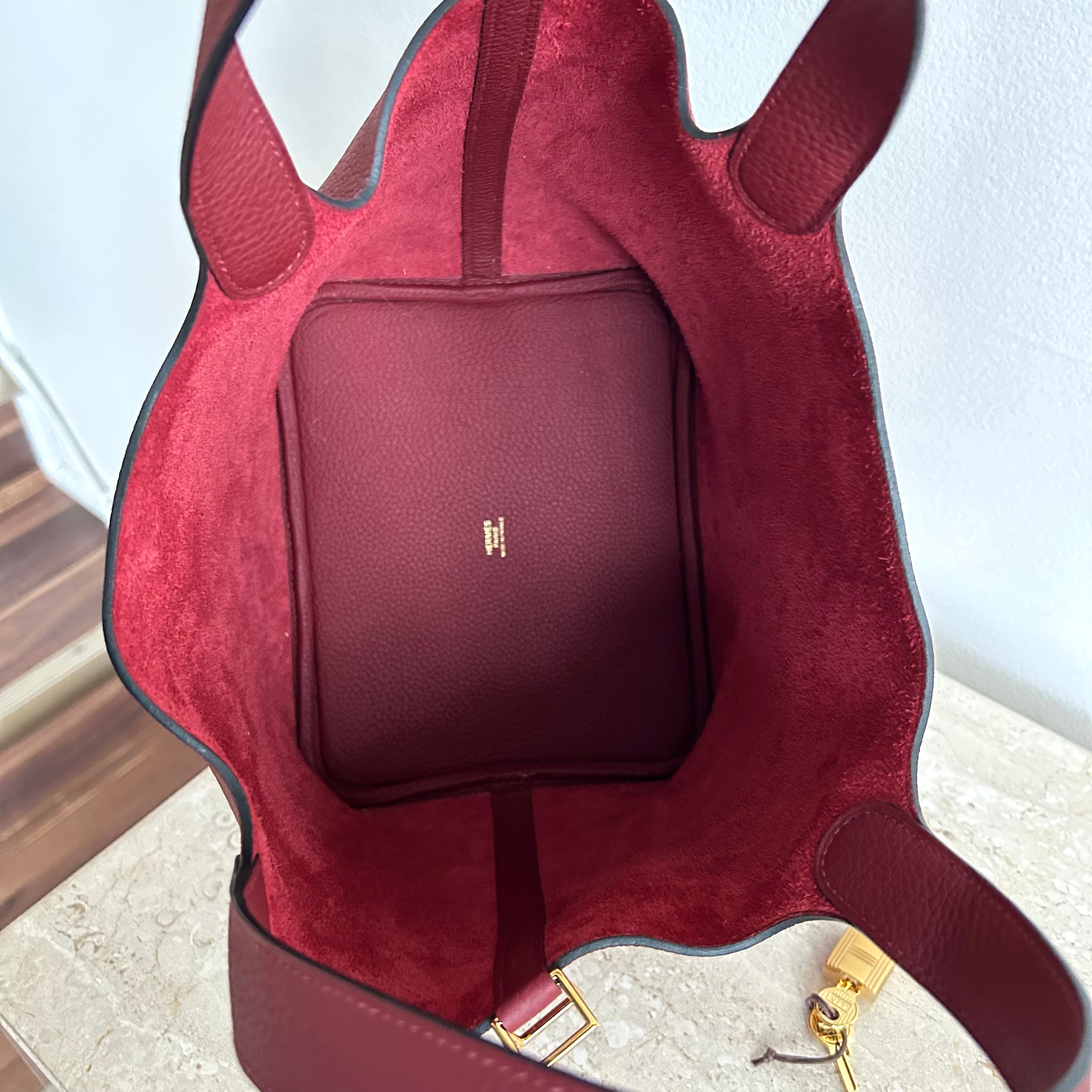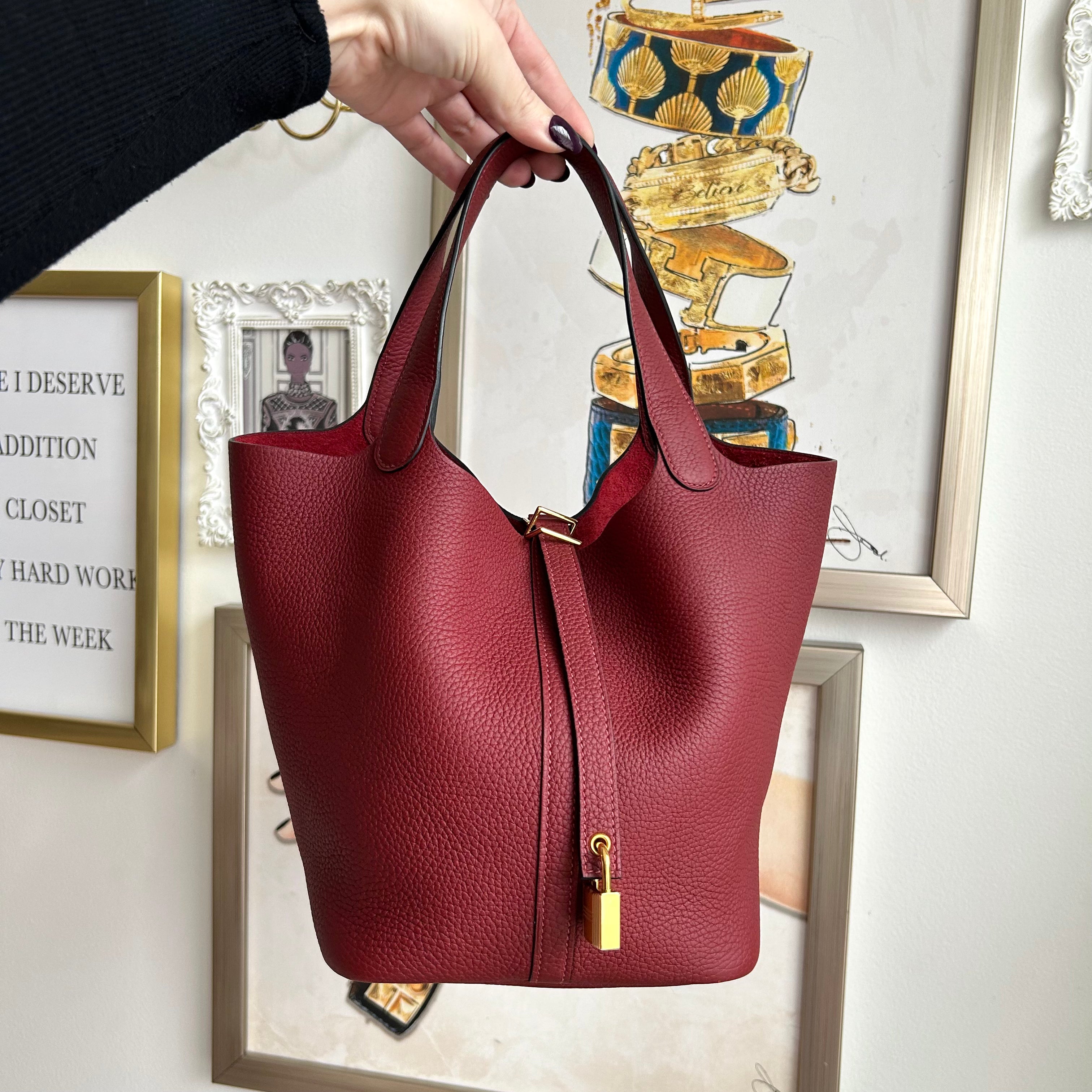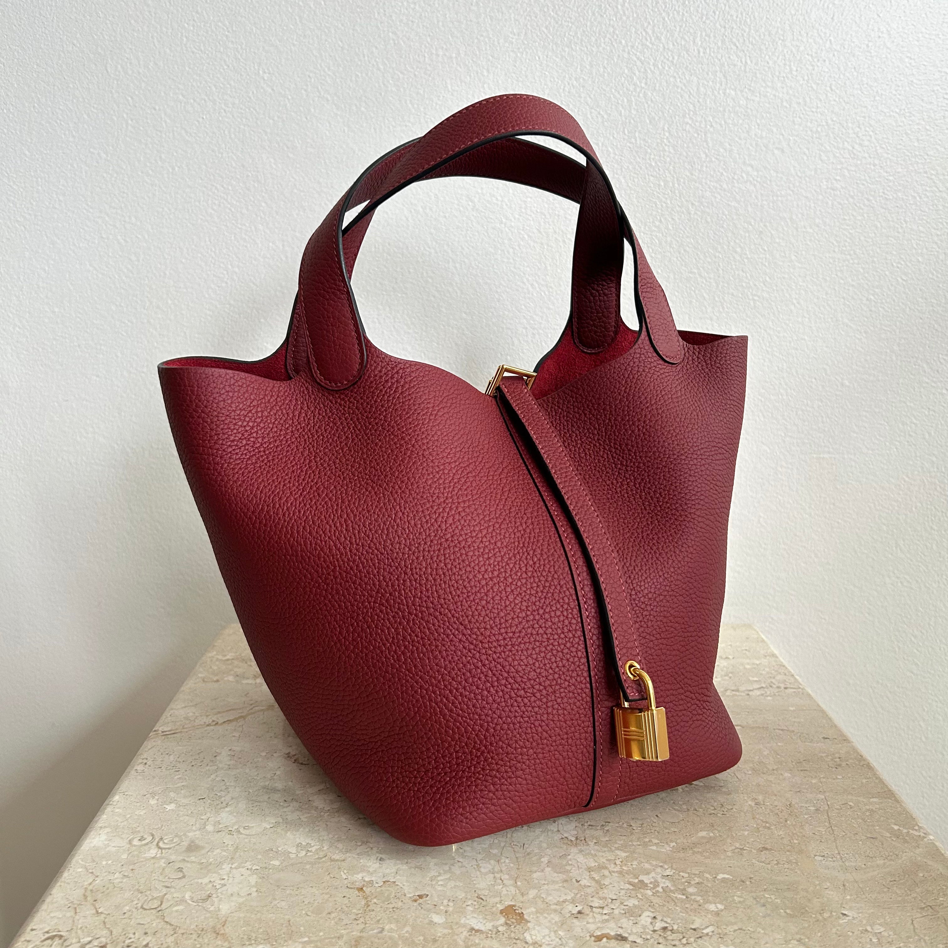 Pre-Owned Hermes Rouge H Taurillon Clemence Picotin 22. This is a rarely consigned item and a fab find! Crafted in Taurillon Clemence leather in the most beautiful deep wine red colour. This bag features leather top handles and a closure strap secured by a gold tone lock & key, protective feet, and a suede interior. This bag is next level incredible!!
