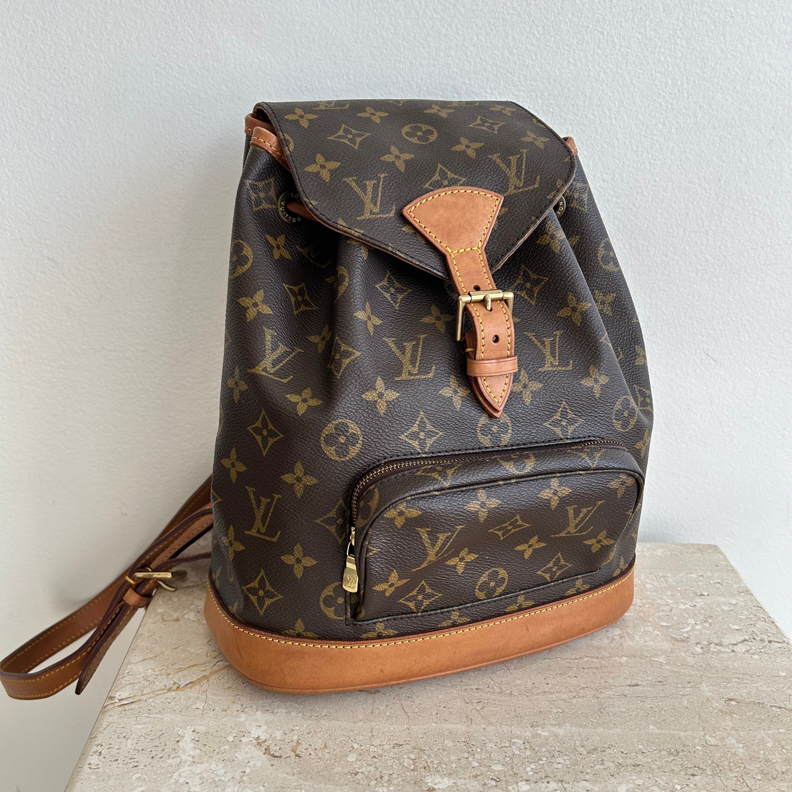 Pre-Owned Louis Vuitton Vintage Monogram Montsouris PM backpack. A backpack is a staple in every bag collection! A wonderful handsfree and practical way to carry all your essentials. A great daily bag with an exterior front zip pocket for ease of access to keys or cards. With adjustable straps and gold tone hardware. The buckle flap opens up to draw string opening to a roomy interior with one slit pocket and D-ring. This stylish backpack is the ideal bag!