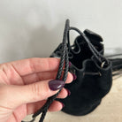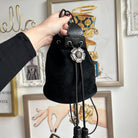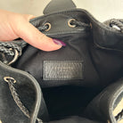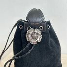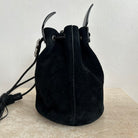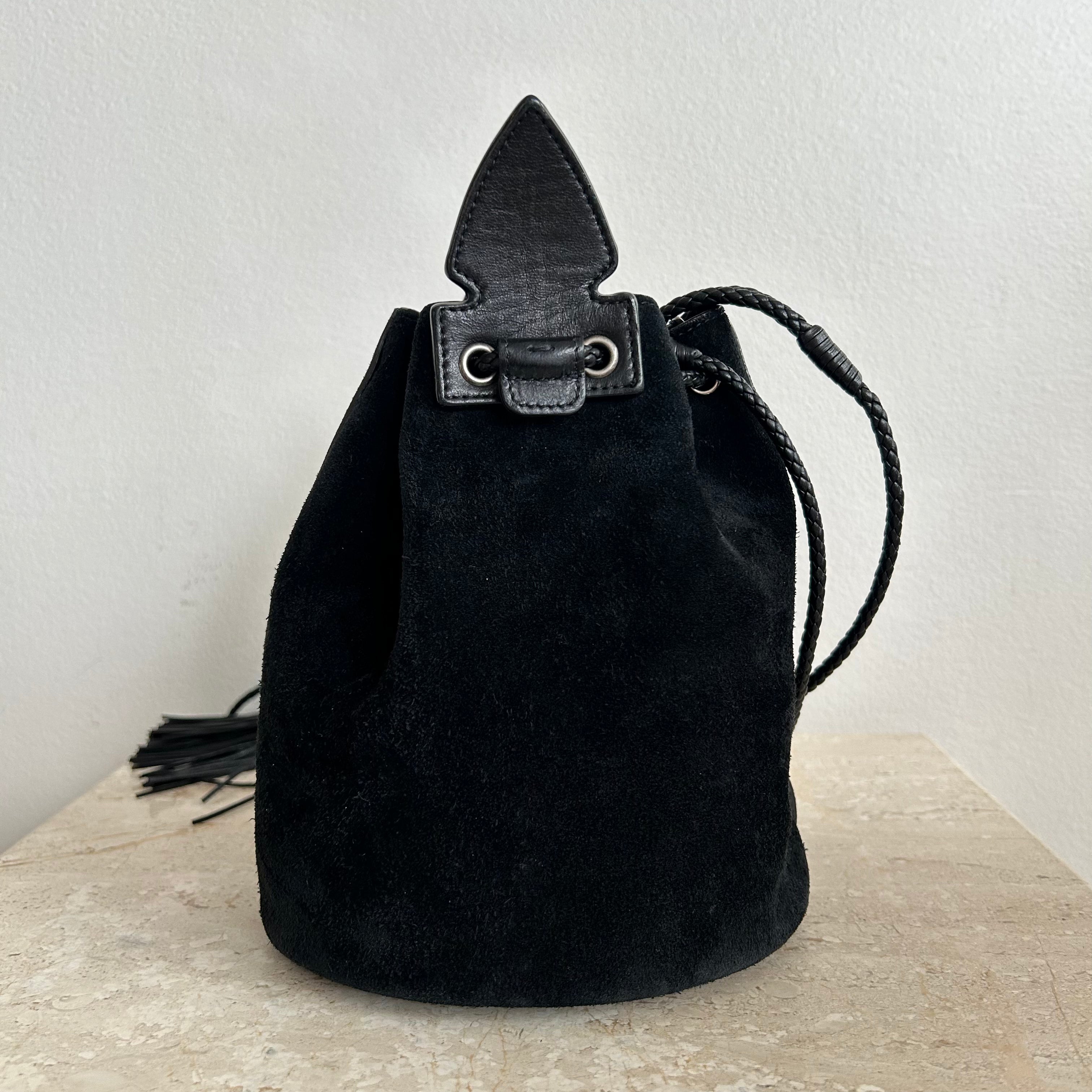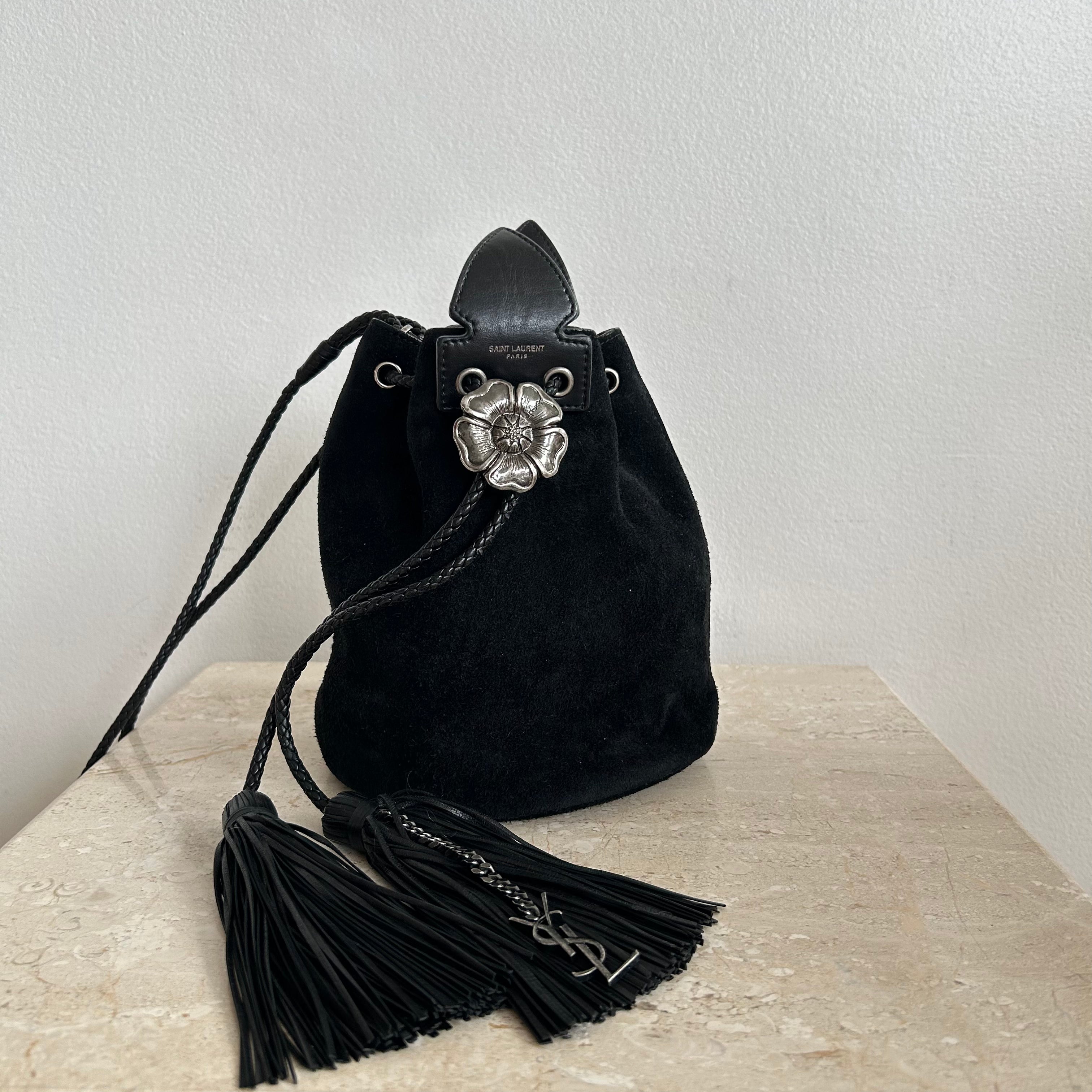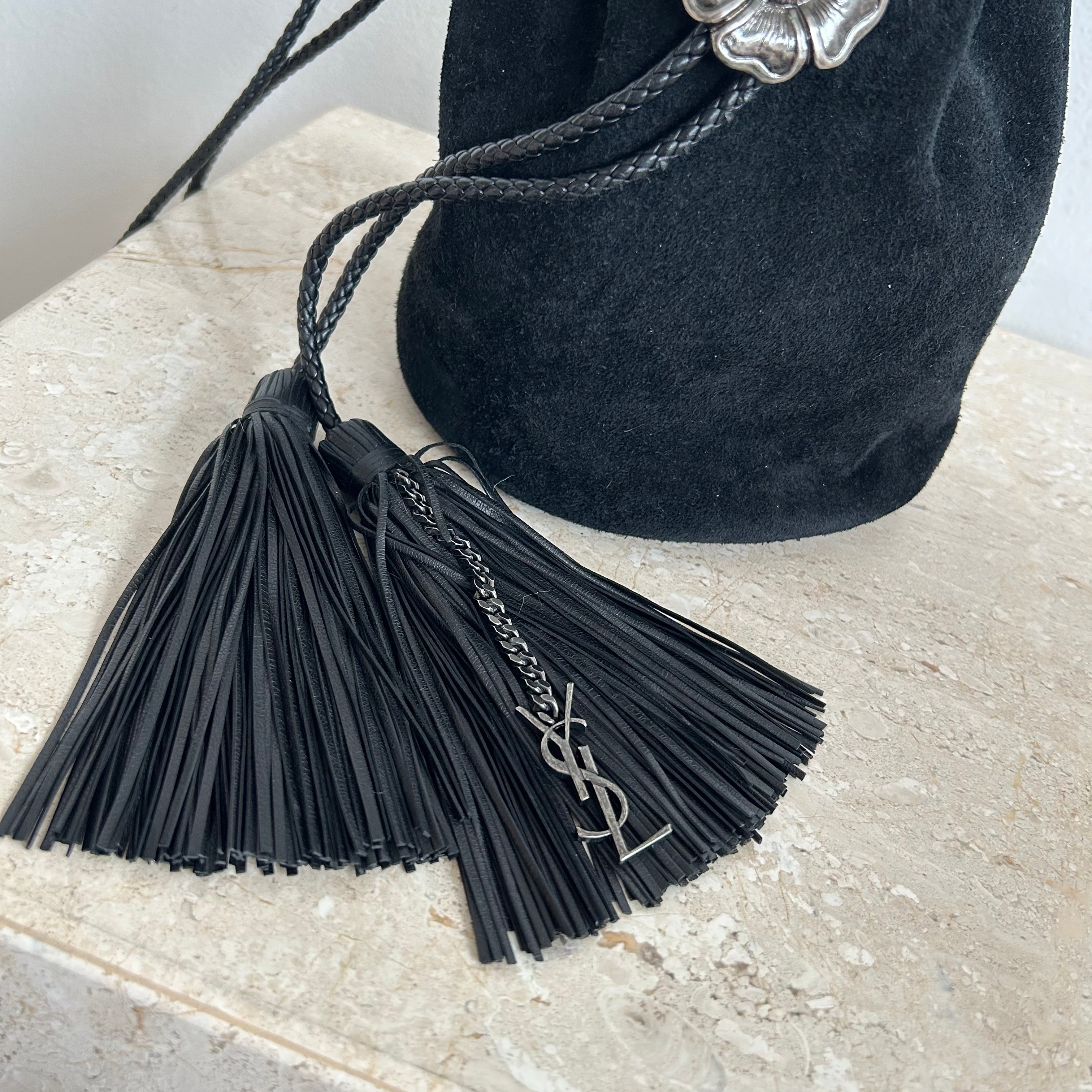 Pre-Owned Saint Laurent Suede Tassel Anja Bucket Bag. Classic black suede leather with silver-tone floral-appliquéd detail. The tassels are flirty and fun and yet this design captures the classic edge that YSL always contributed to their designs. You can easily fit your phone and daily essentials in this beauty. This is an great find!