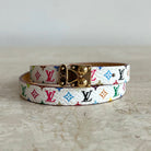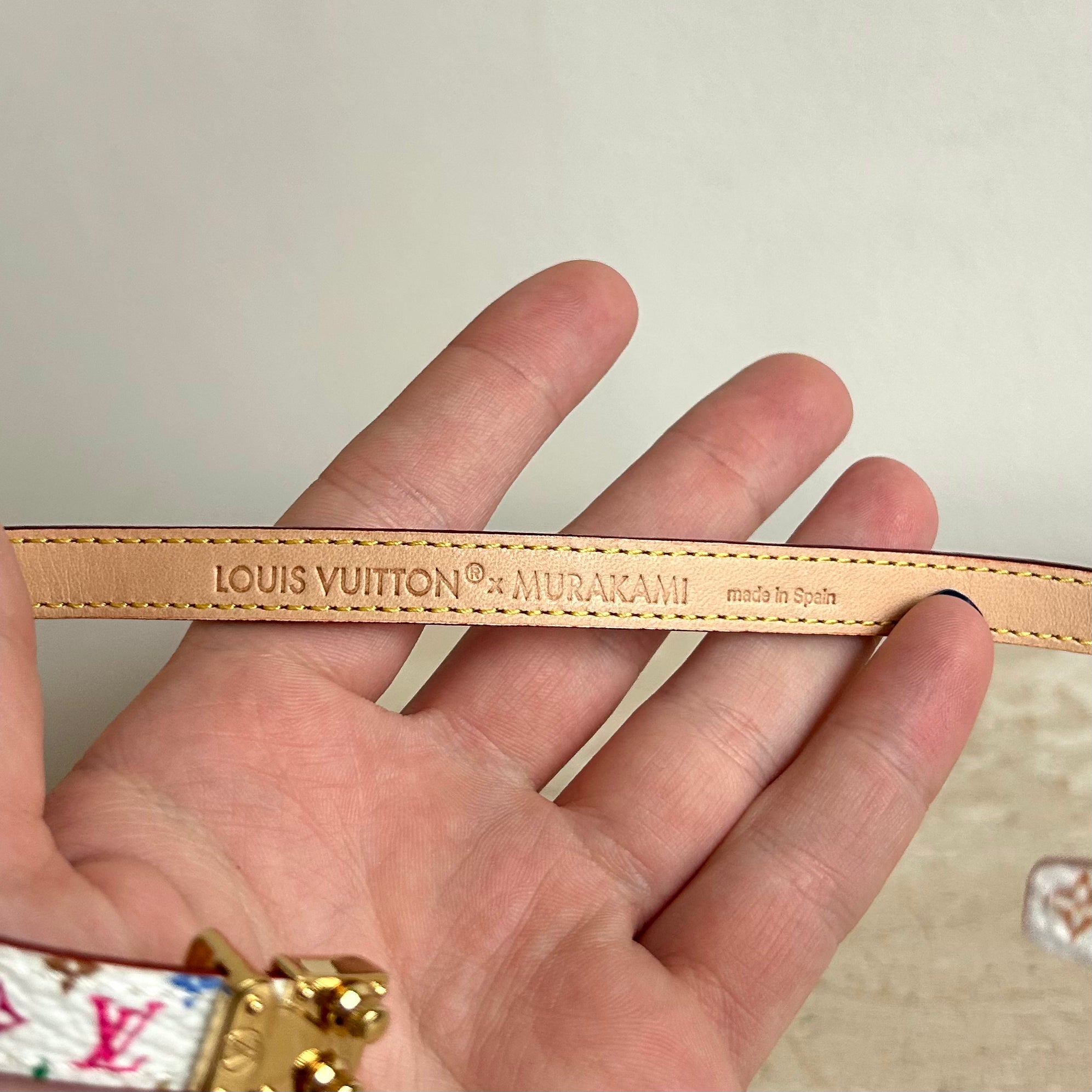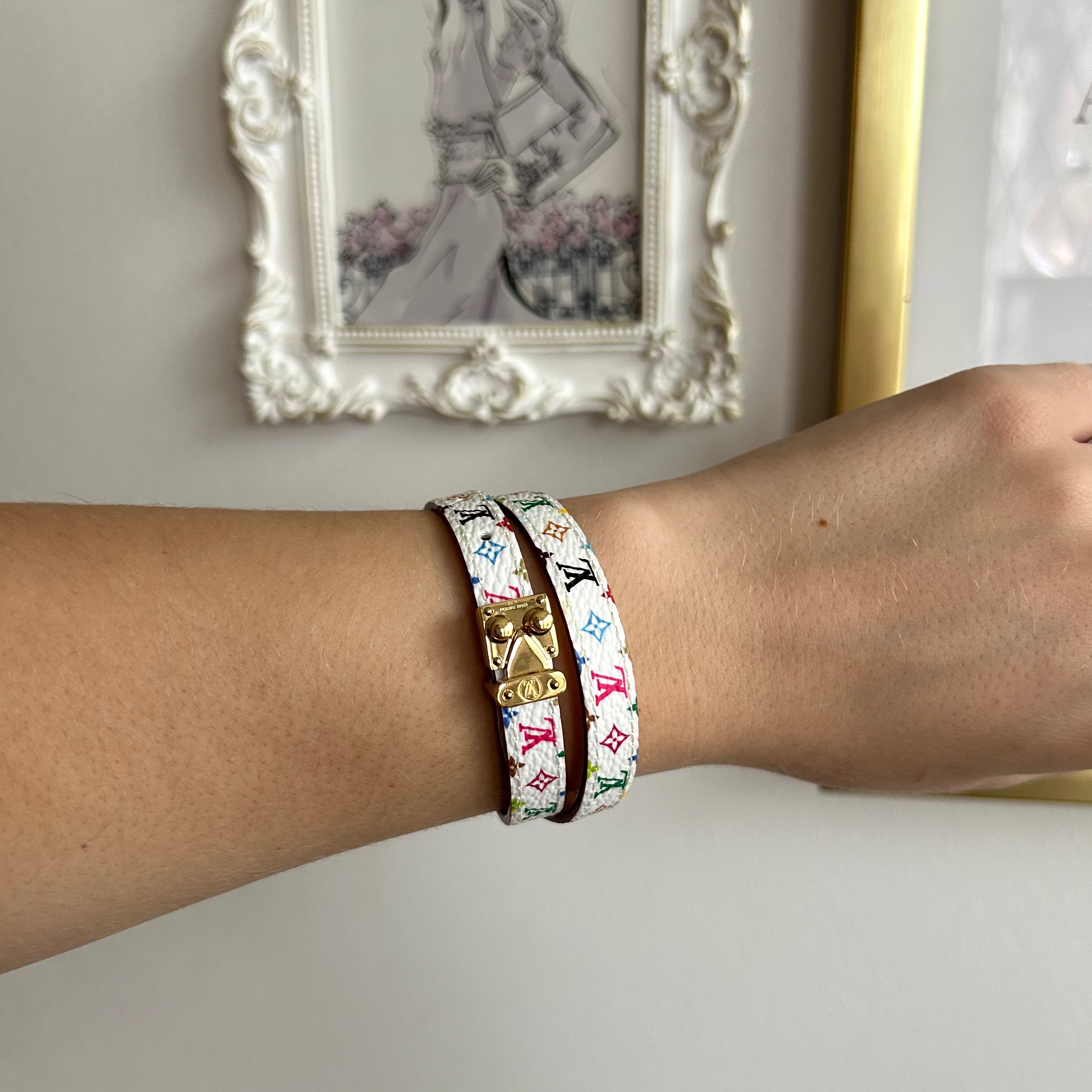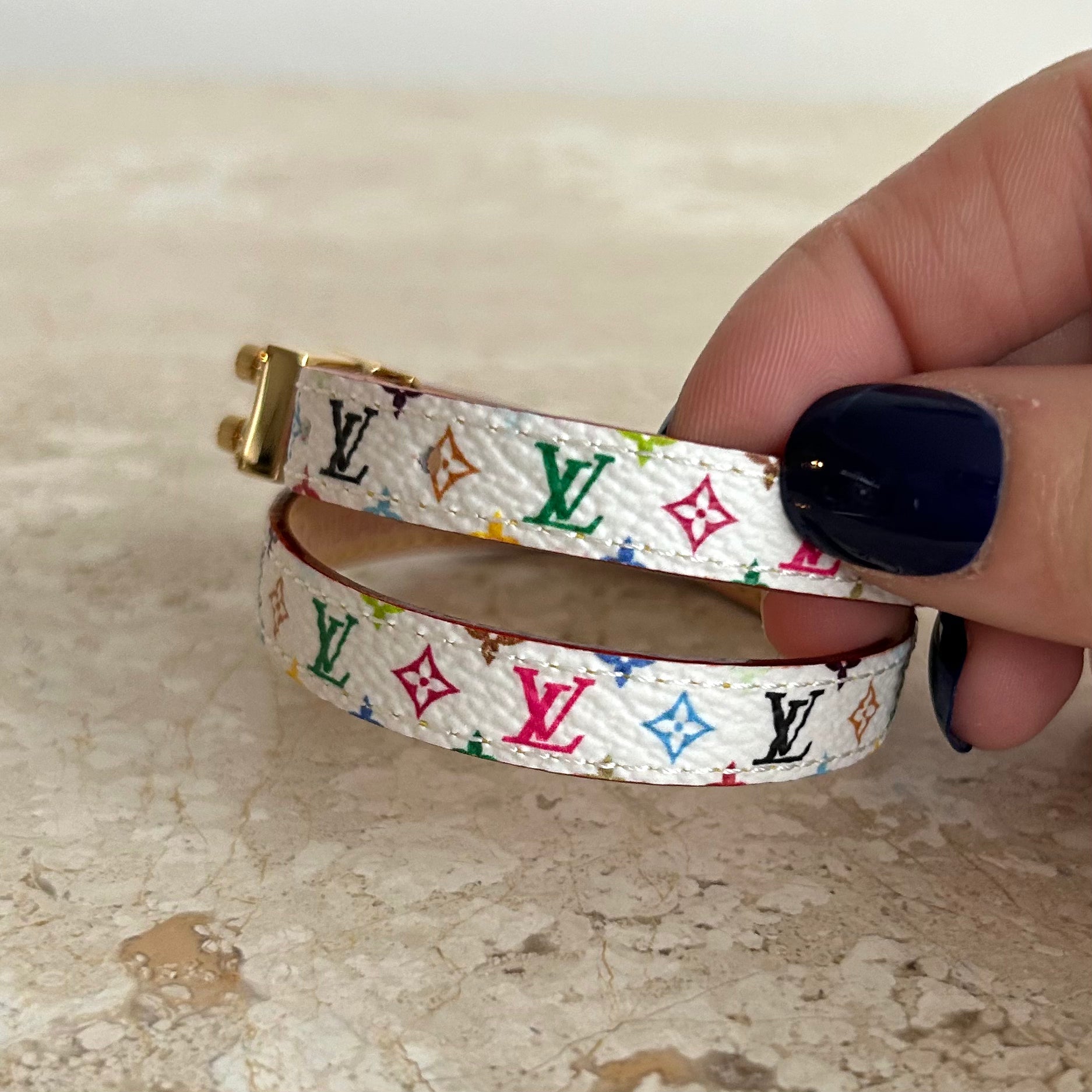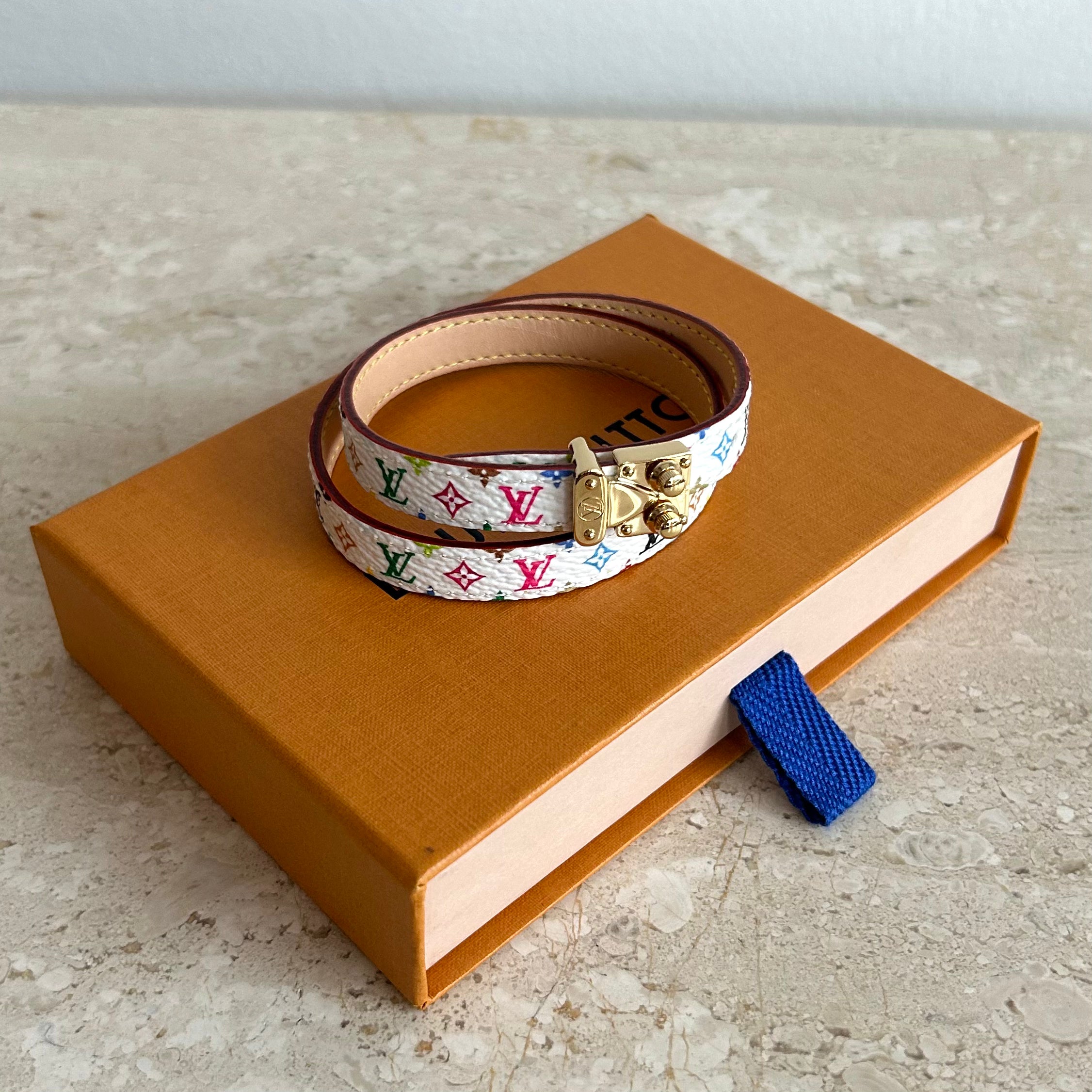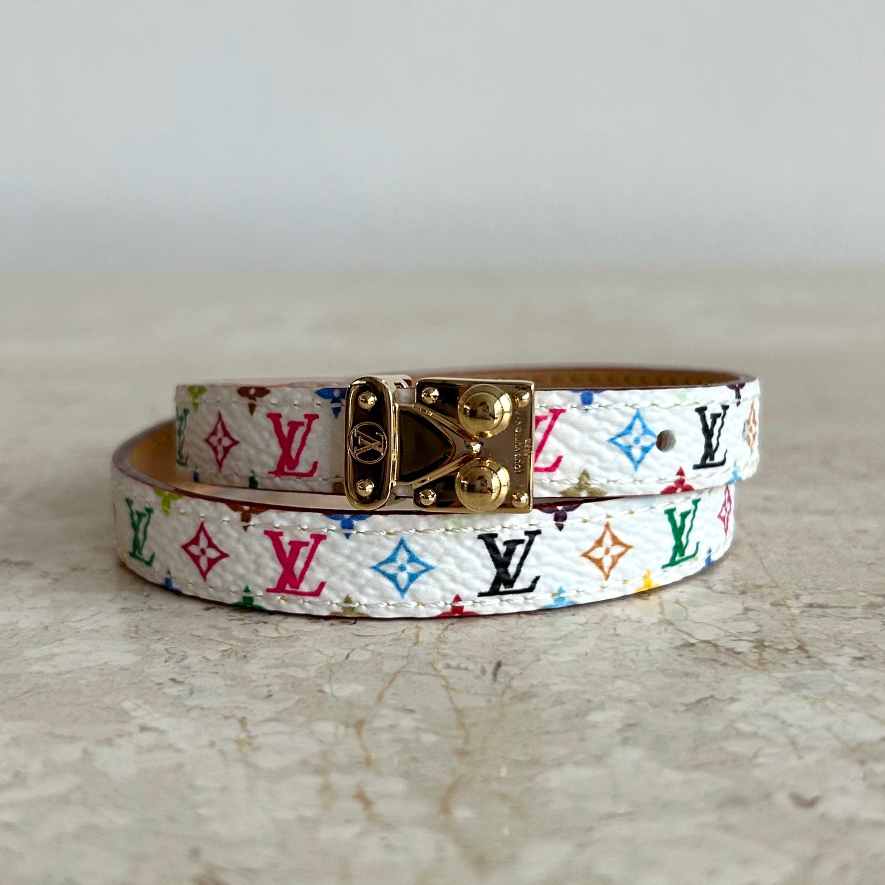 Pre-Owned Louis Vuitton x Takashi Murakami LV Signature Bracelet. In beautiful monogram multi colour canvas with Murakami's take on the house monogram featuring 33 different hues! This bracelet double wraps and has gold tone signature lock fastening. A limited edition piece perfect for all you Louis collectors!