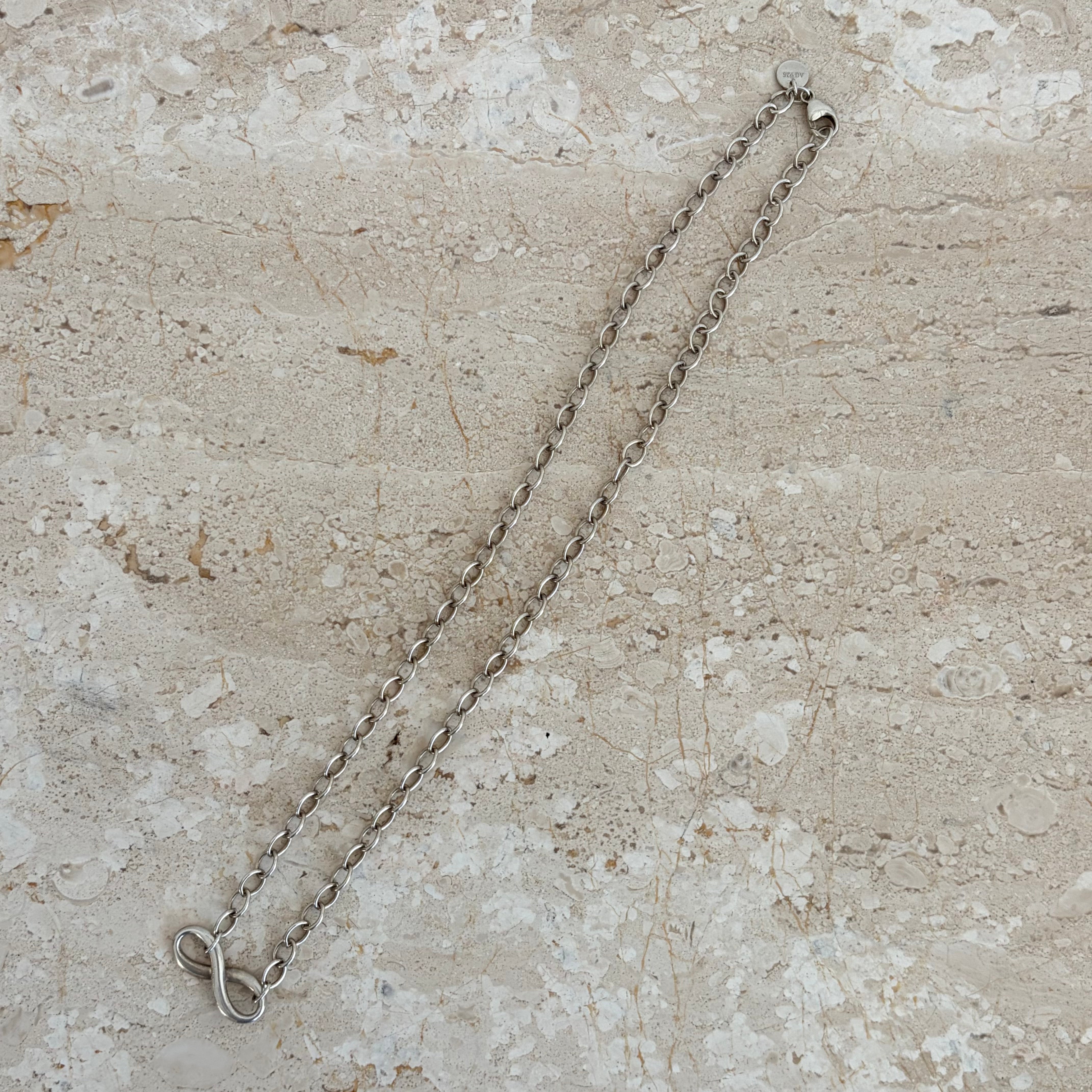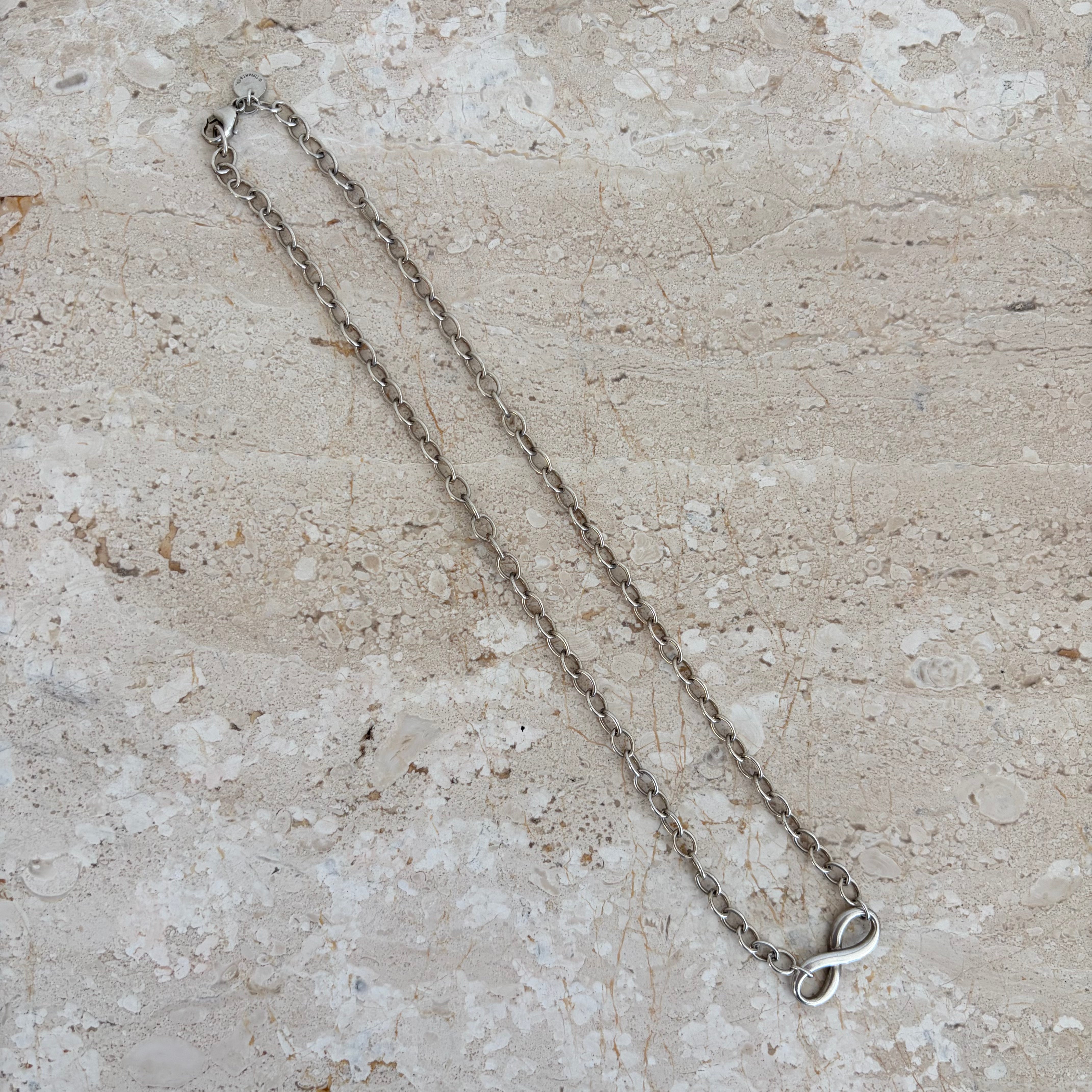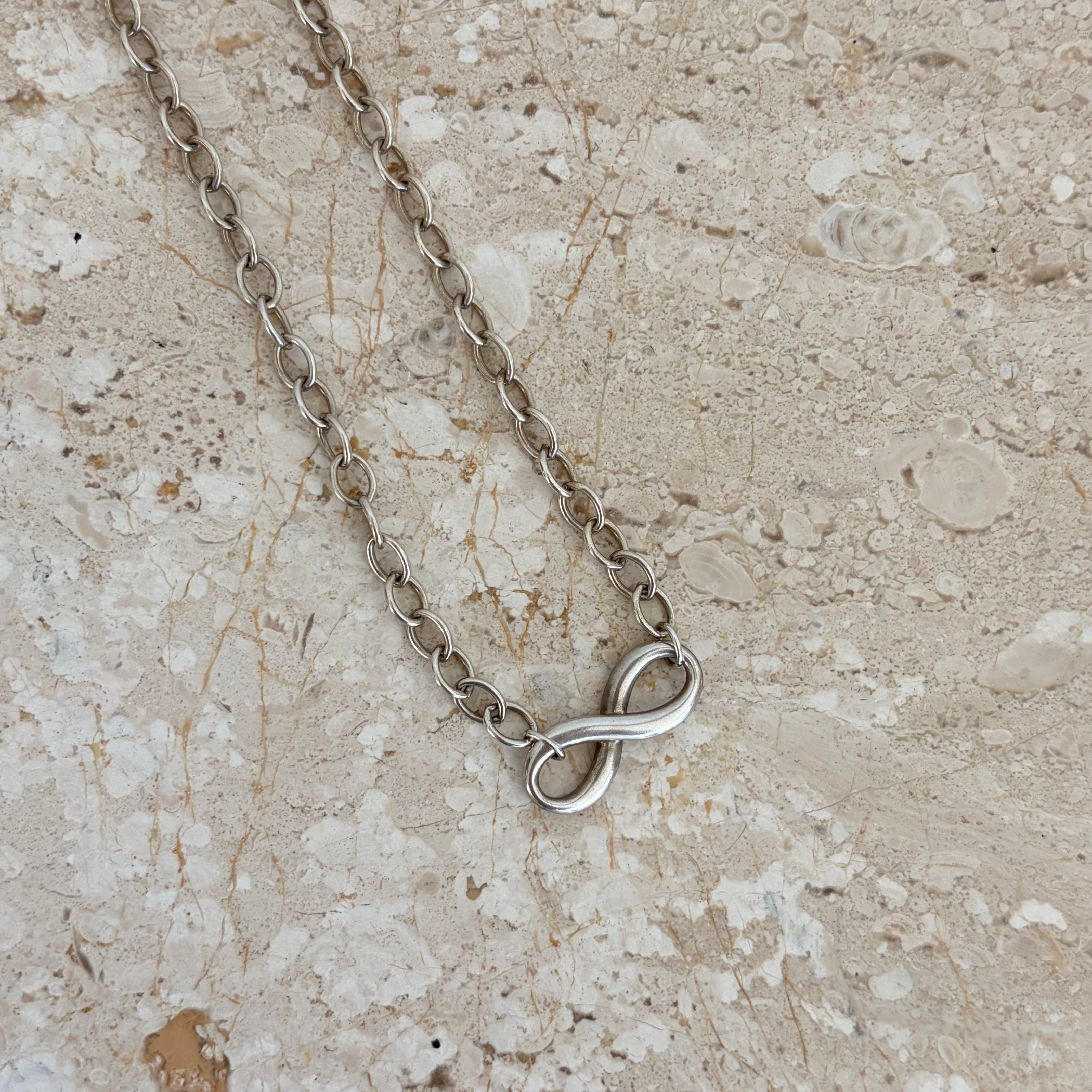 Pre-Owned Tiffany & Co. Infinity Pendant Necklace. This stunning necklace is crafted from sterling silver and features an infinity pendant on a chainlink necklace. A classic piece that you will reach for again and again!