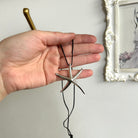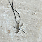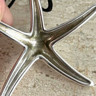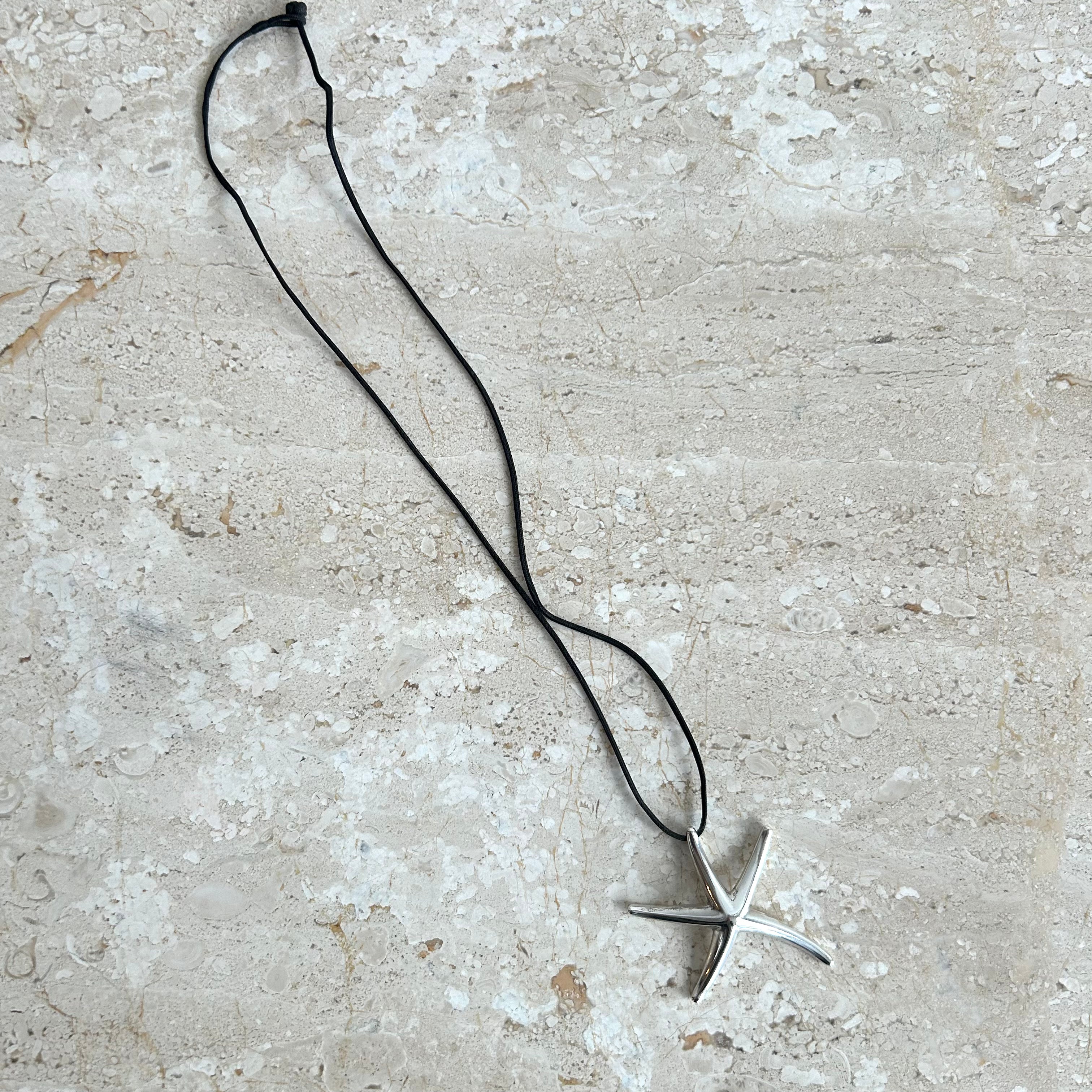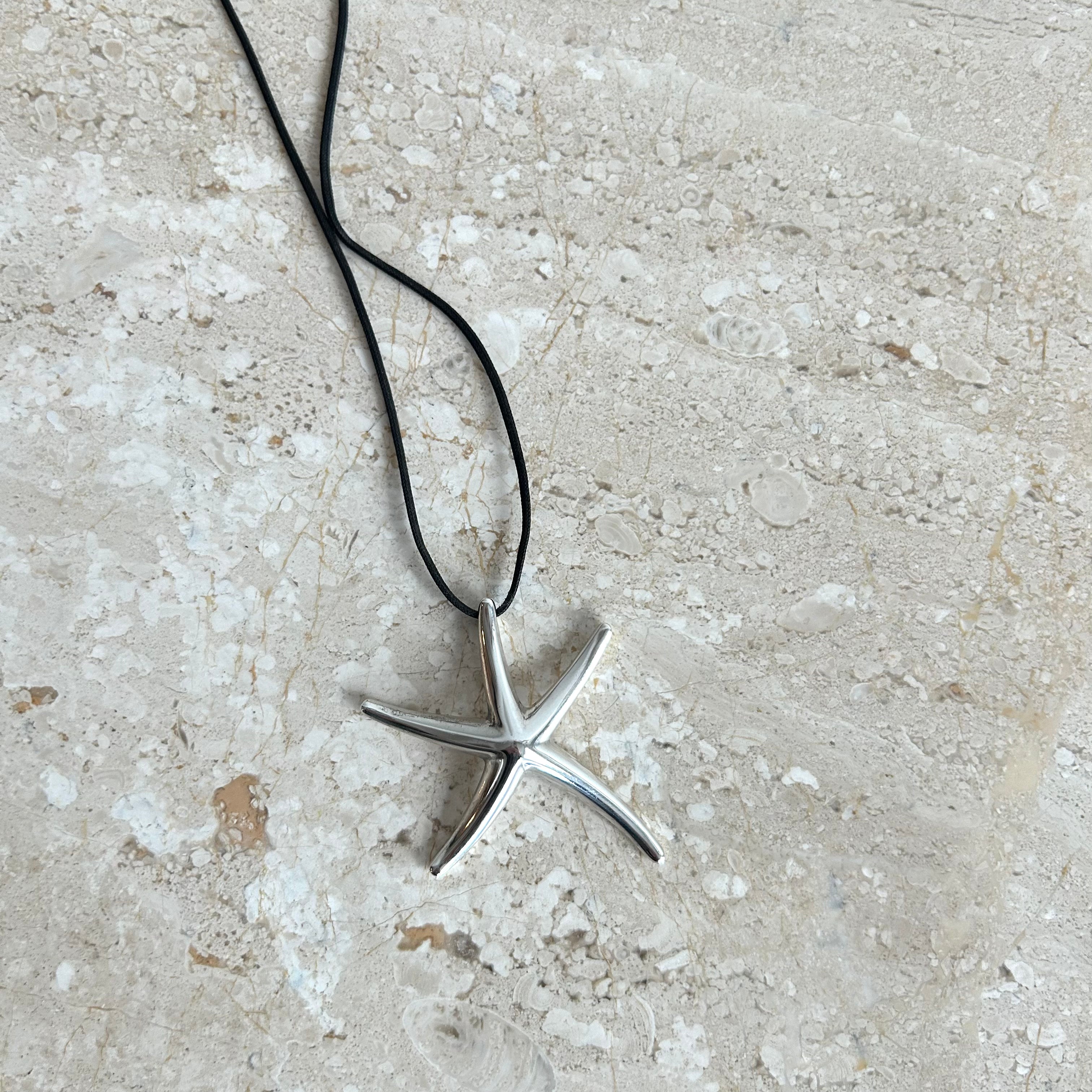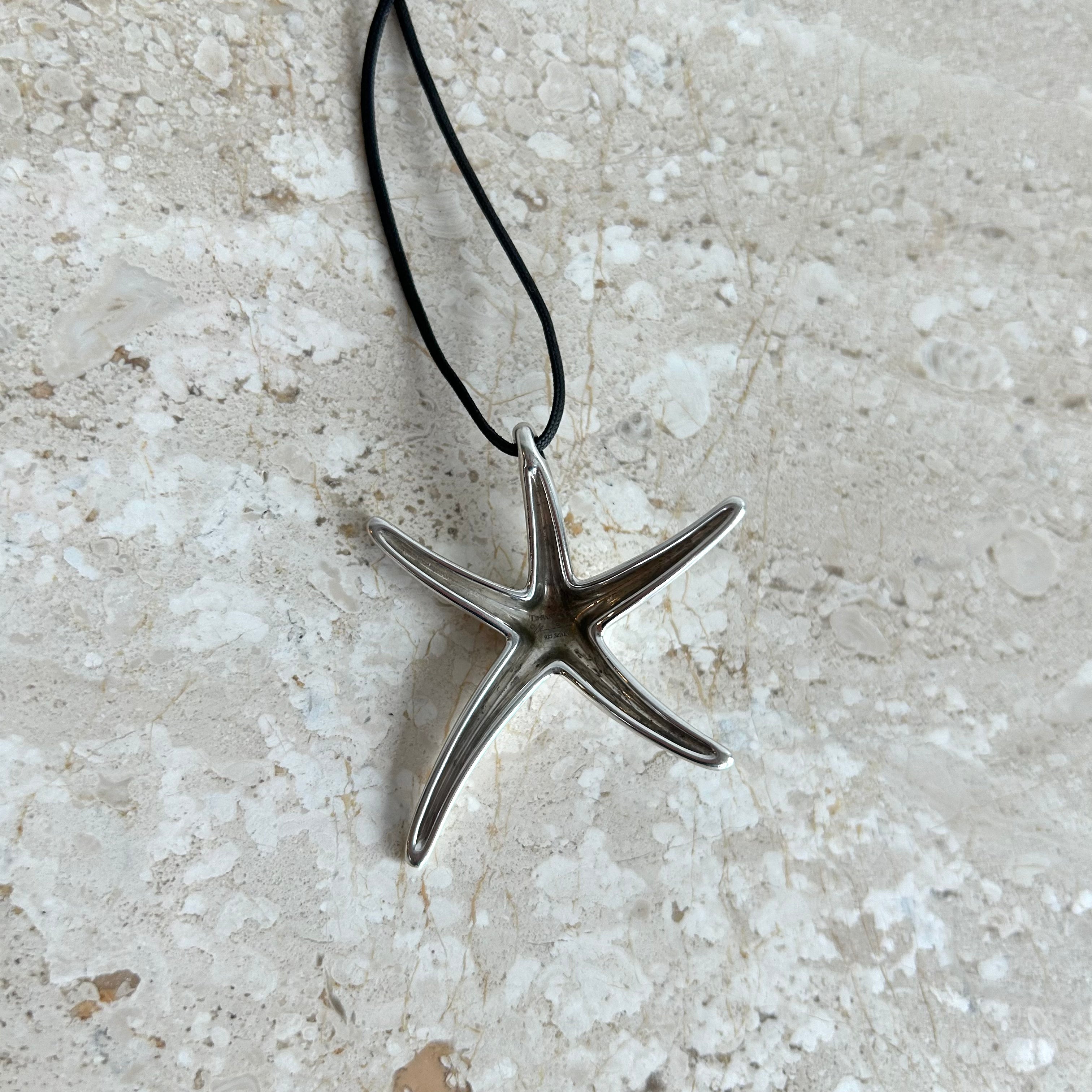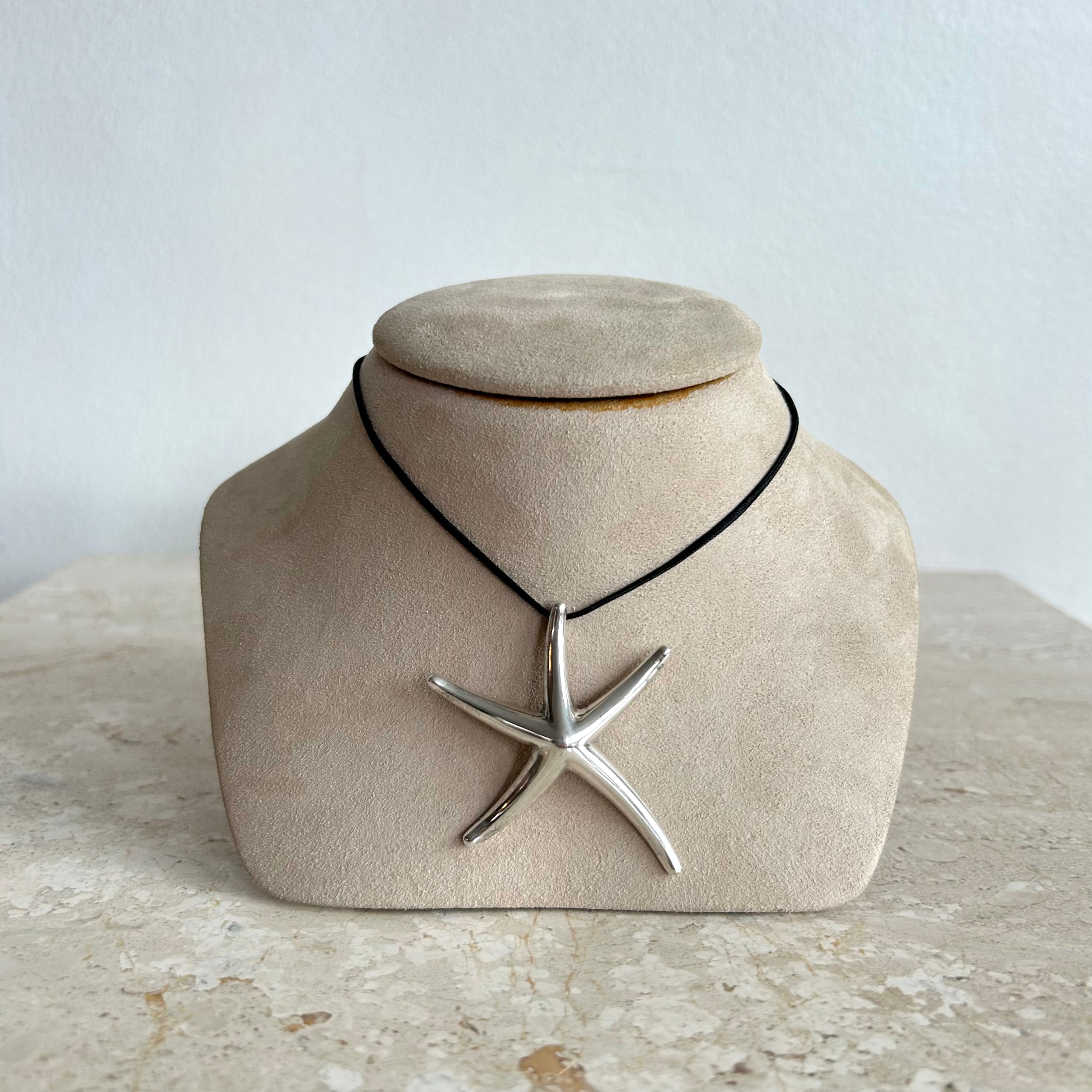 Pre-Owned Tiffany & Co Sterling Silver Starfish Necklace. On a black silk cord, this necklace features a sterling silver starfish pendant, designed by Elsa Peretti. The perfect pendant necklace comes as is, and can be worn in a stack or on its own as a statement!