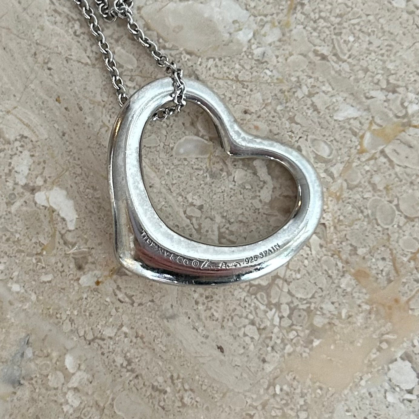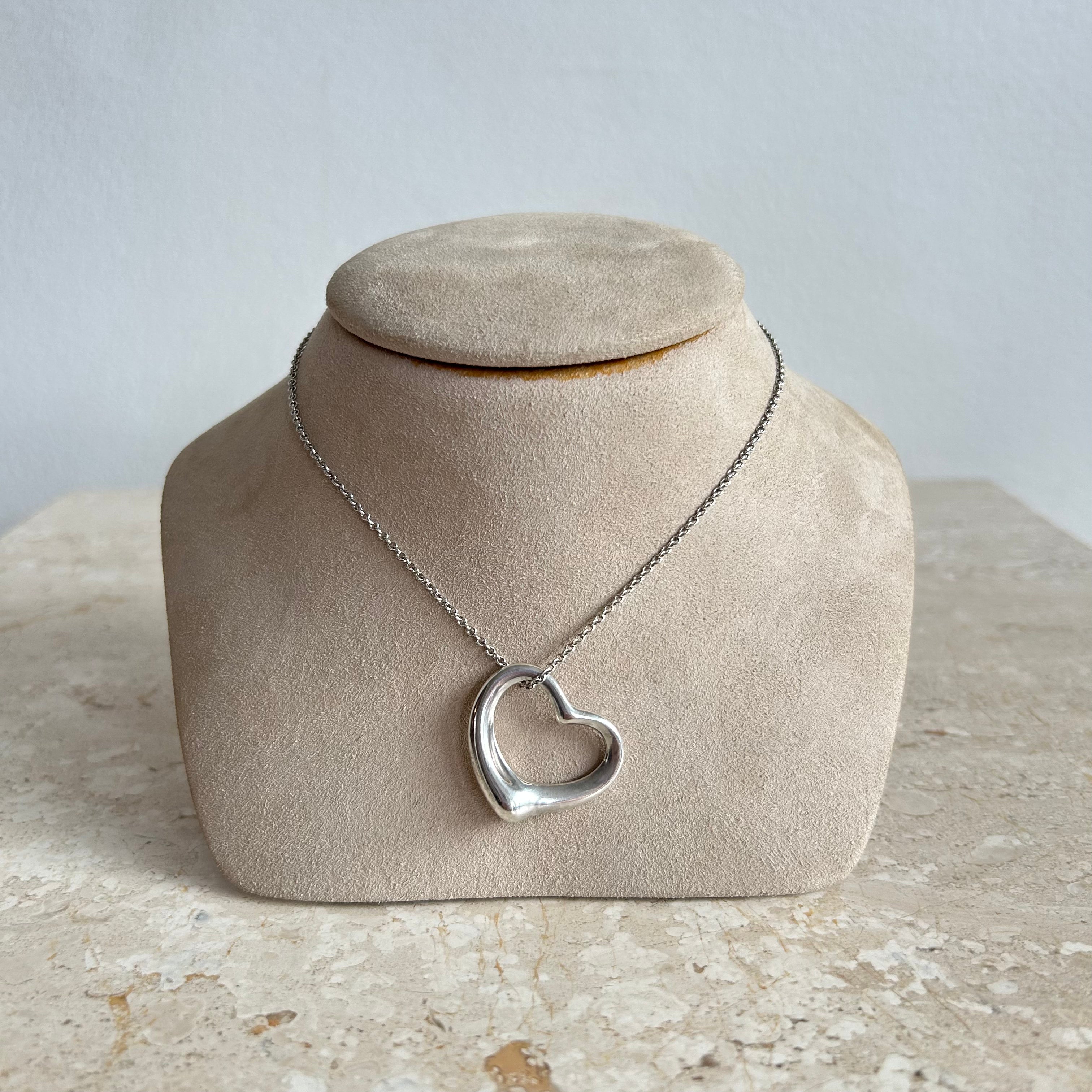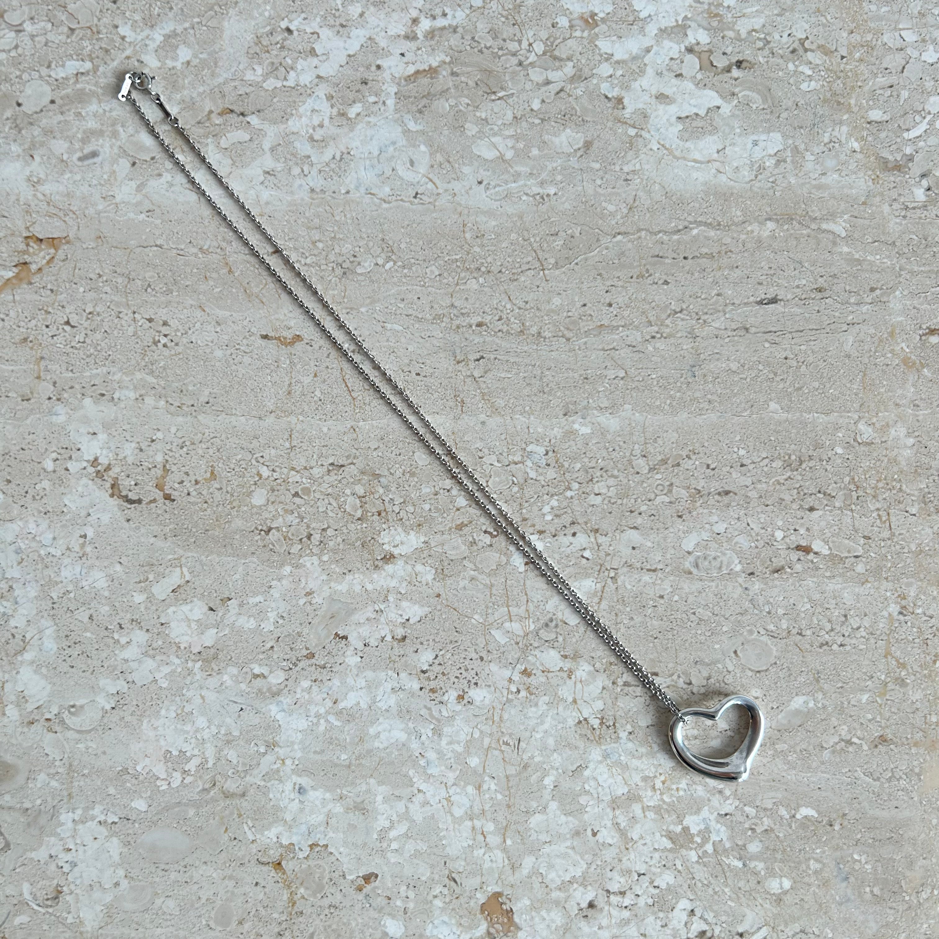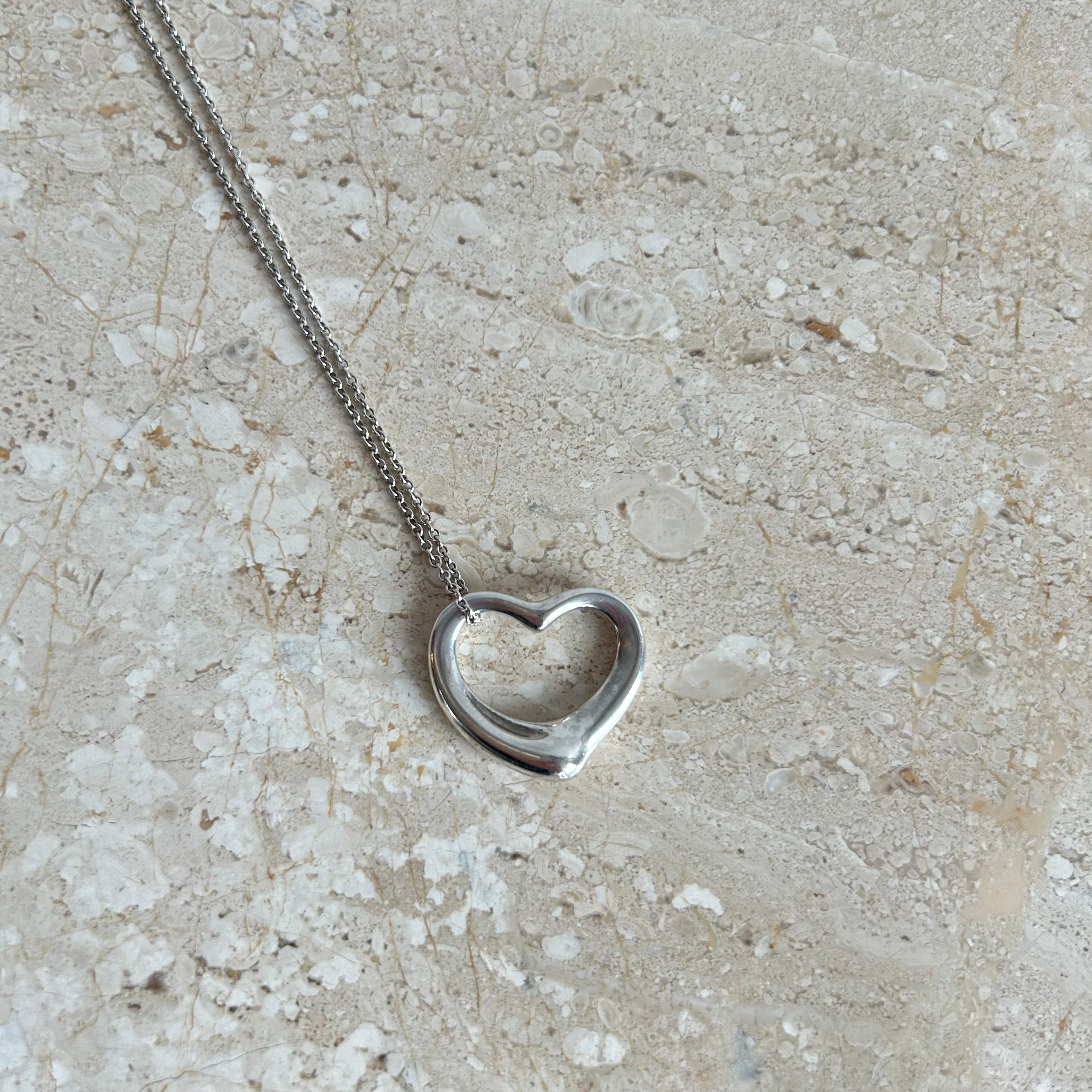 Pre-Owned Tiffany & Co. Sterling Silver Open Heart Necklace. One of Elsa Peretti's most iconic designs in the larger size. Simple Sterling silver open heart pendant on sterling silver chain. This piece comes as is, perfect on it own or layered with other Tiffany pieces! So timeless and elegant!