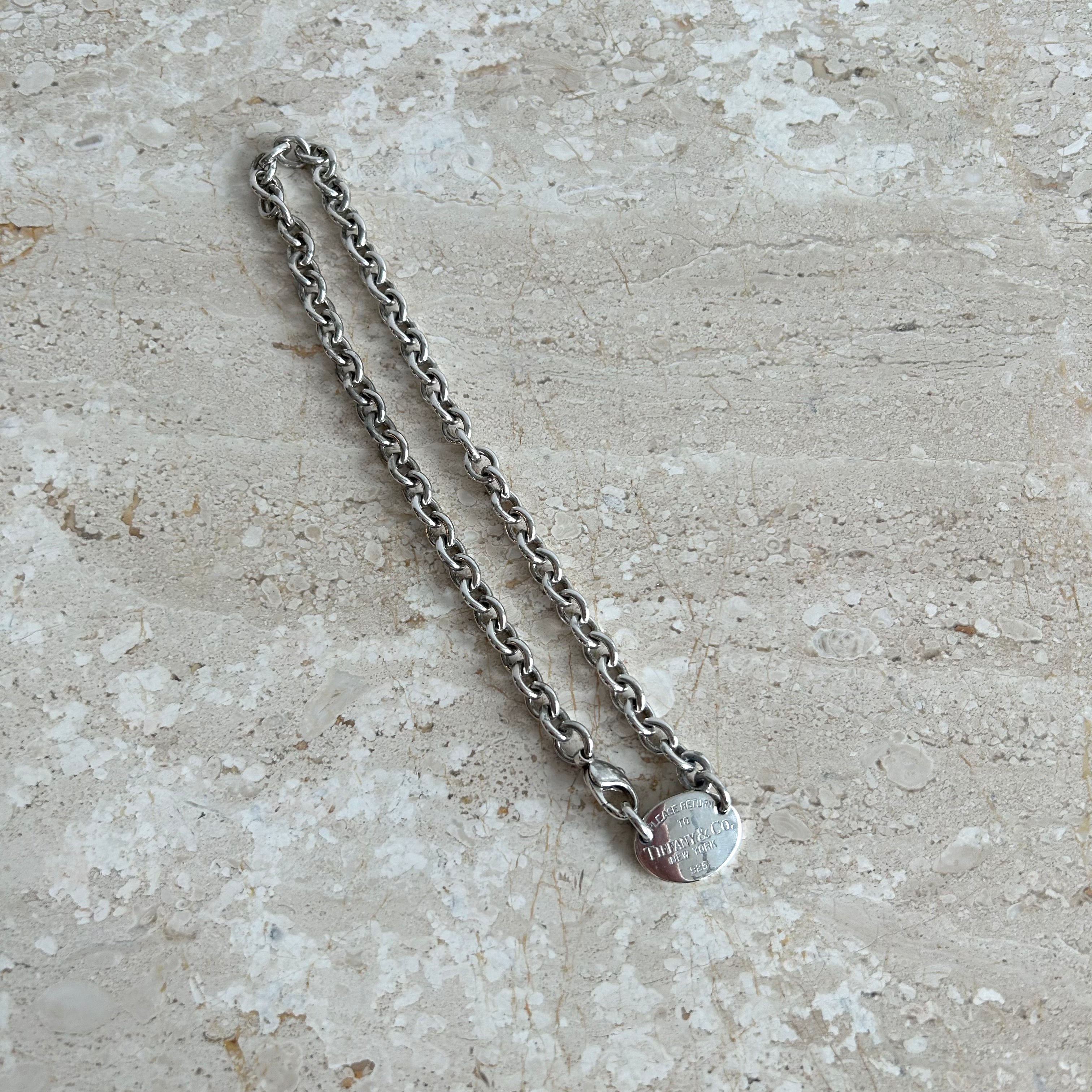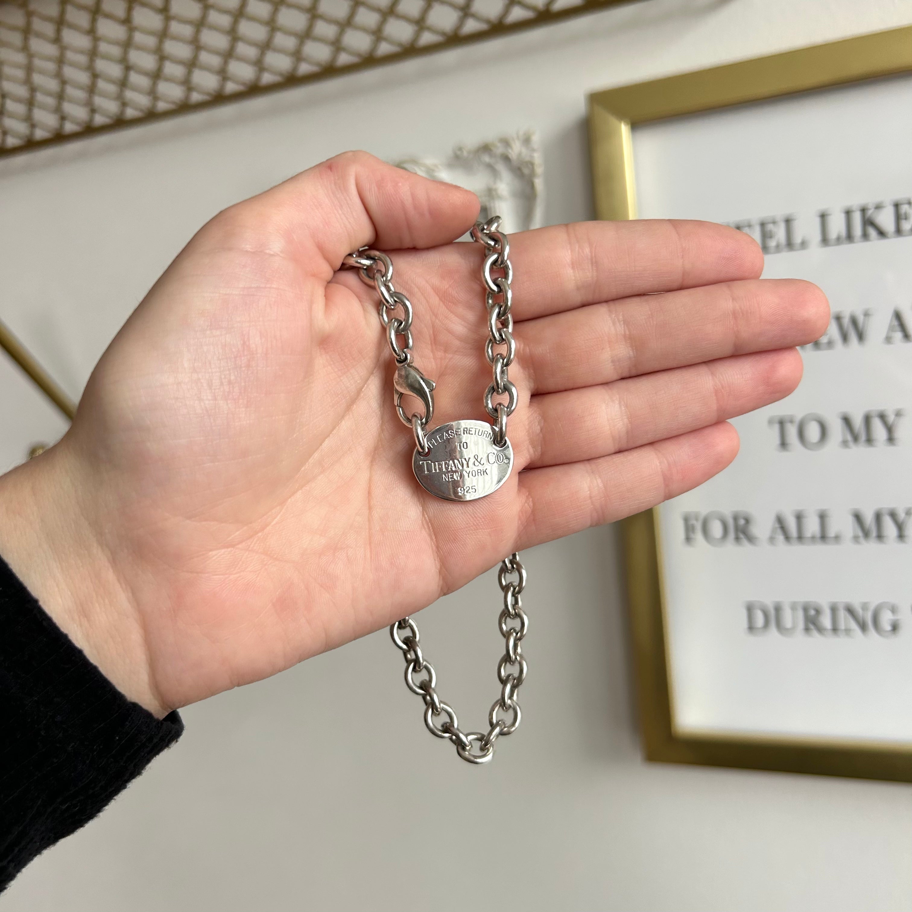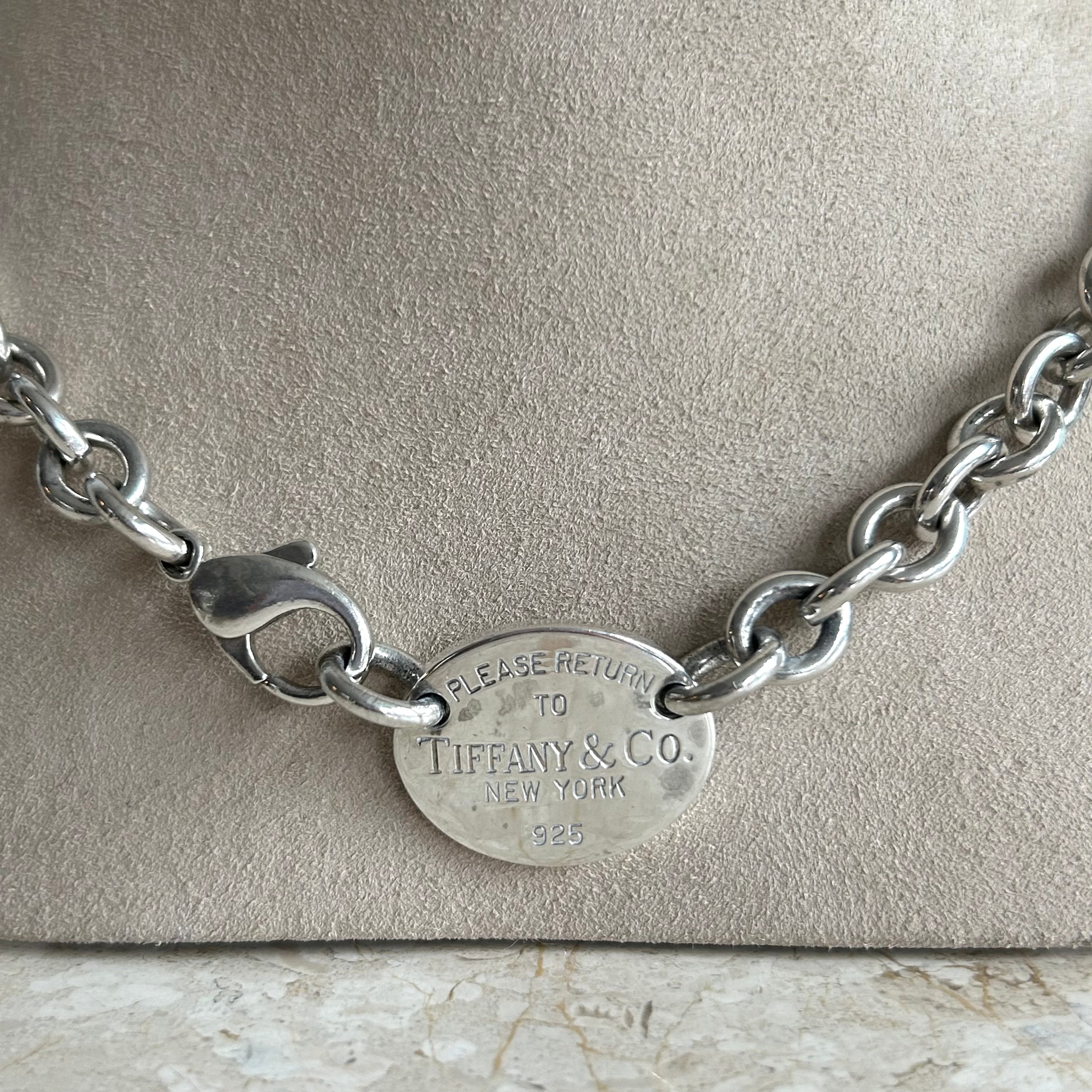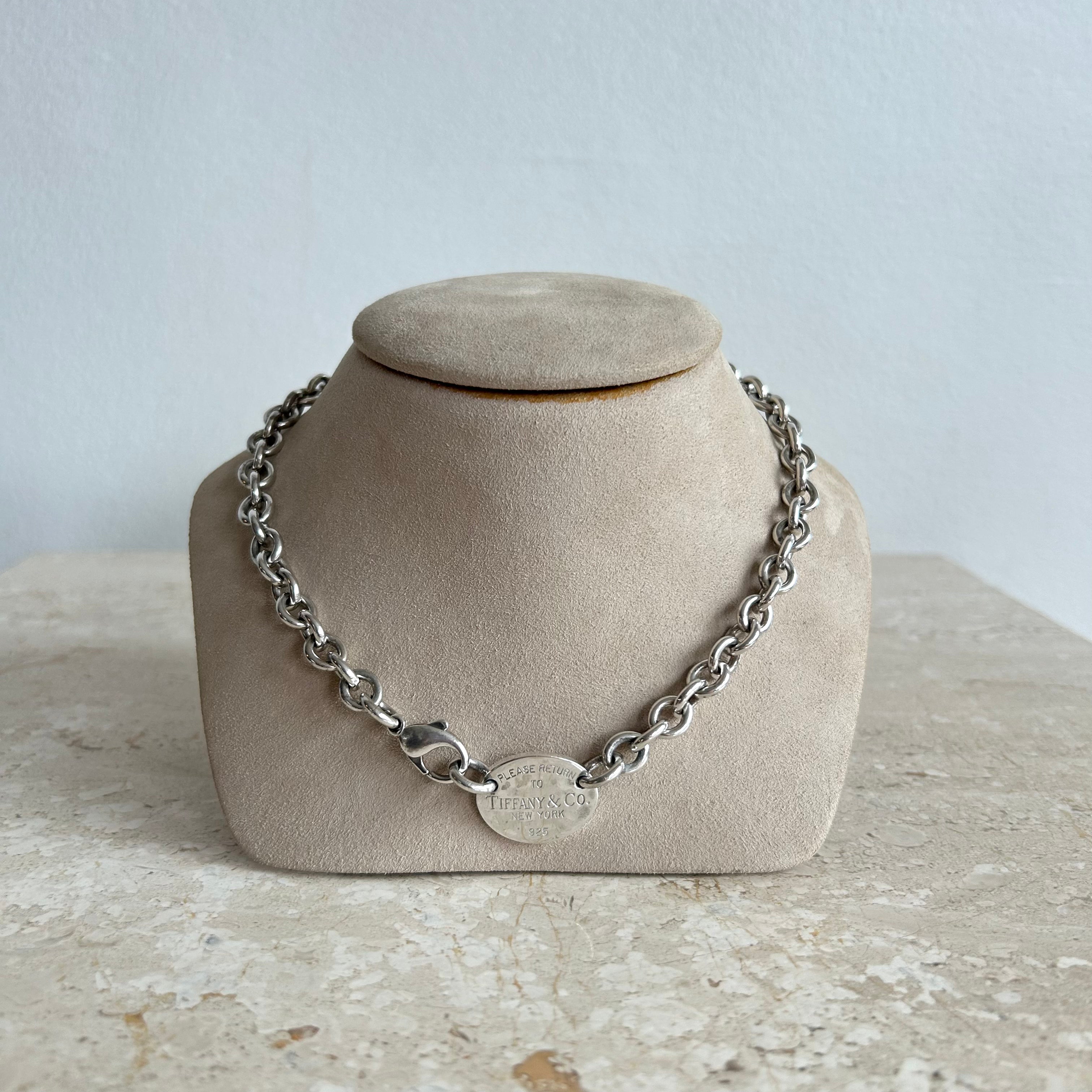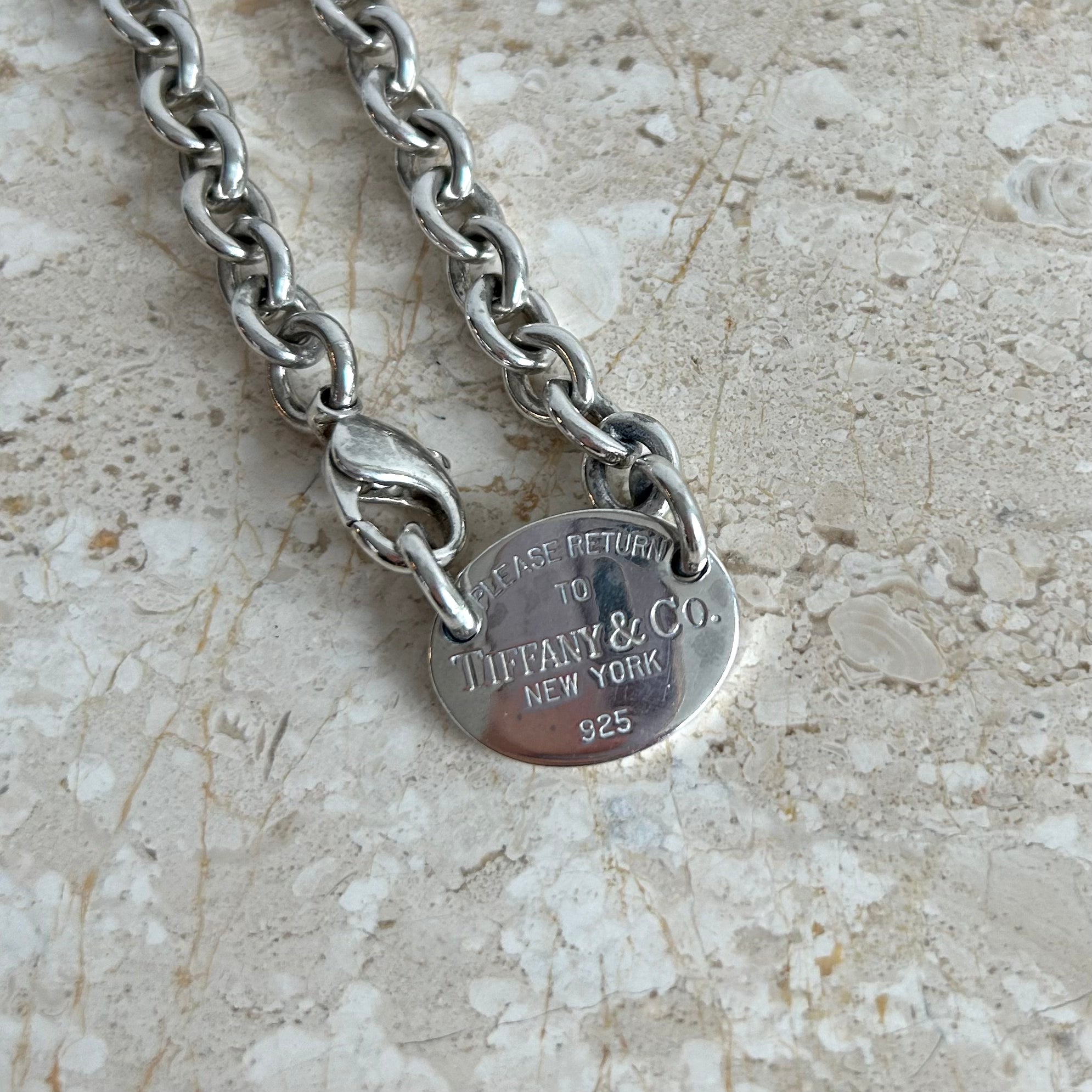 Pre-Owned Tiffany & Co. Sterling Silver Oval Tag Necklace. The Return to Tiffany Collection is originally inspired by the iconic Key Ring, first introduced in 1969. A bold statement necklace centred by an oval tag. This piece comes as is, perfect on it own or layered with other Tiffany pieces! A stunning piece!