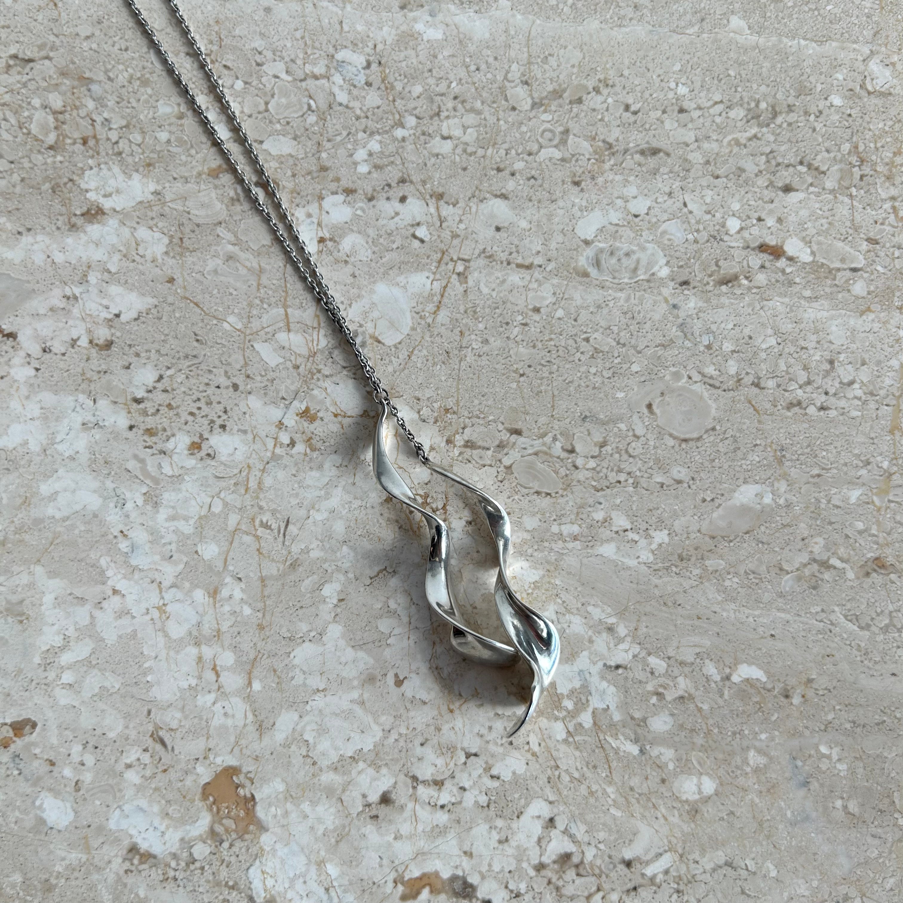 Pre-Owned Tiffany & Co. x Frank Gehry Sterling Silver Double Orchid Necklace. A limited edition collection by Canadian American Architect Frank Gehry, who is known for his use of unconventional materials and designs. This double pendant necklace is crafted of Sterling Silver and features two "swirl" pendants. This piece comes as is, and is a stunning statement!