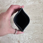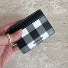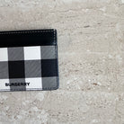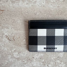 Pre-Owned Burberry Card Holder. This compact card holder features the Burberry check topstitched leather, with the house logo on the front in black. This card holder hosts four card slots, and a centre slip compartment. Stylish and versatile, making it the perfect gift!