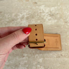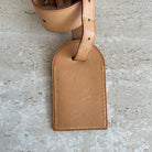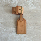 Pre-Owned Louis Vuitton Luggage Tag. Crafted in Vachetta cowhide leather, this essential travel piece features a gold-tone metal buckle. This also comes with a handle connector strap in matching Vachetta with a gold tone buckle. The name initials "AGD" are imposed into the front of the tag. Initials can easily be covered by art or embroidery by an artisan!