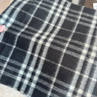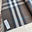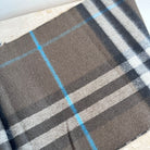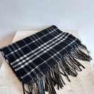 Pre-Owned Burberry Check Cashmere Scarf. Reversible scarf with a mix of whites, greys, and greens in a check pattern with a hint of blue. Made in 100% cashmere, this scarf is woven on traditional looms at a 200-year old Scottish mill. Ultra soft, this scarf is made in the classic Burberry check and features 3.5" fringe on each end. Embedded with history and tradition, this scarf is an iconic accessory.