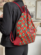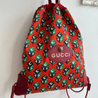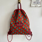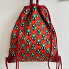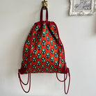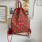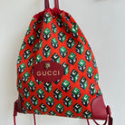 Pre-Owned Gucci Cotton GG Drawstring Backpack in red. This backpack is made in printed cotton and features red leather corners and dual leather top handles. Red cord drawstrings open to reveal a nylon lined interior with one zip pocket. With the house logo in gold tone front and centre with the iconic lion head. This is the perfect functional backpack and ideal for travel!