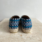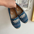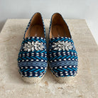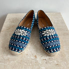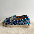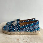 Pre-Owned Miu Miu Crystal Embellished Espadrille. Crafted in blue and white canvas upper, these espadrilles have a jute mid sold and crystal embellishment detail across the top! These are so fun!