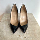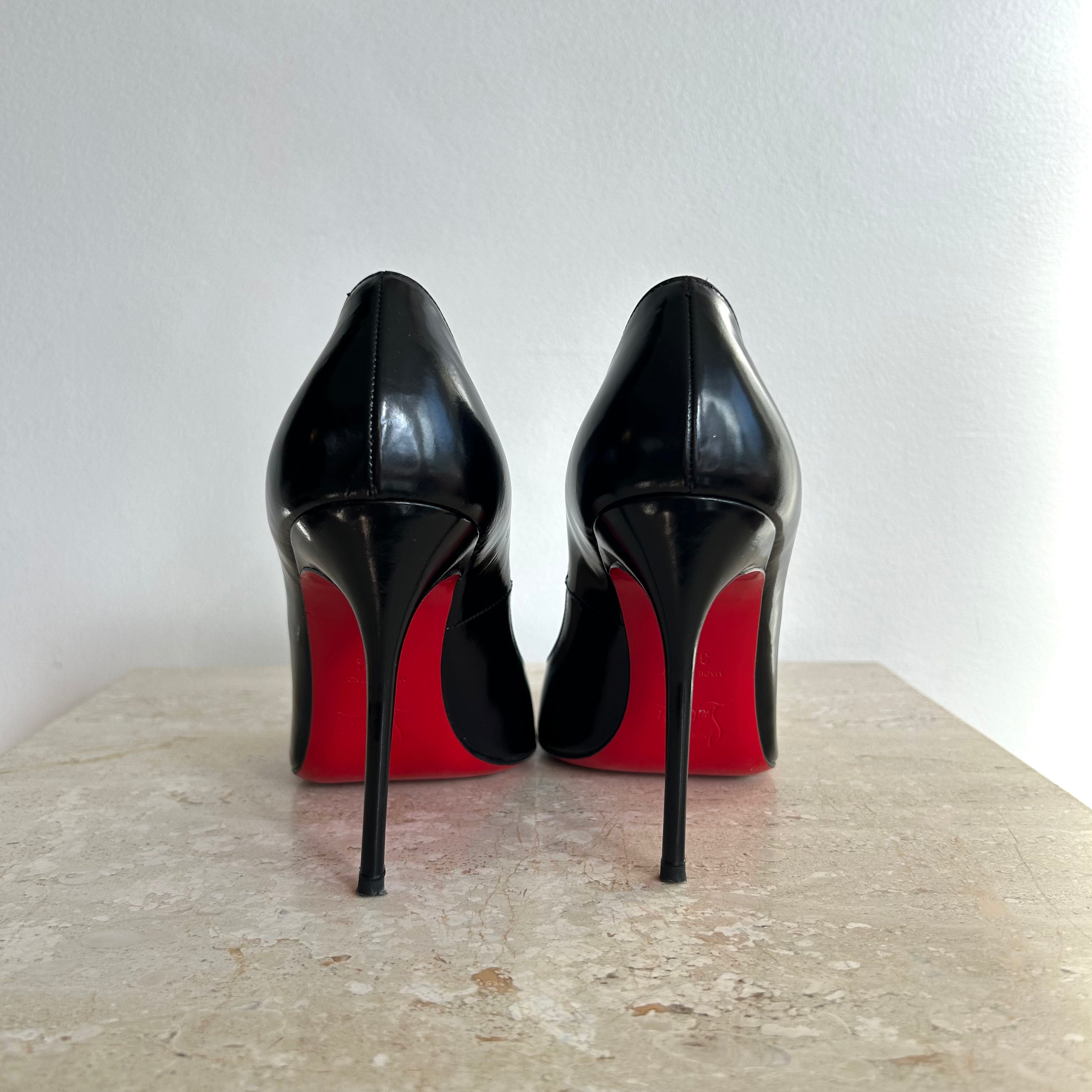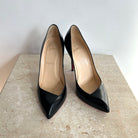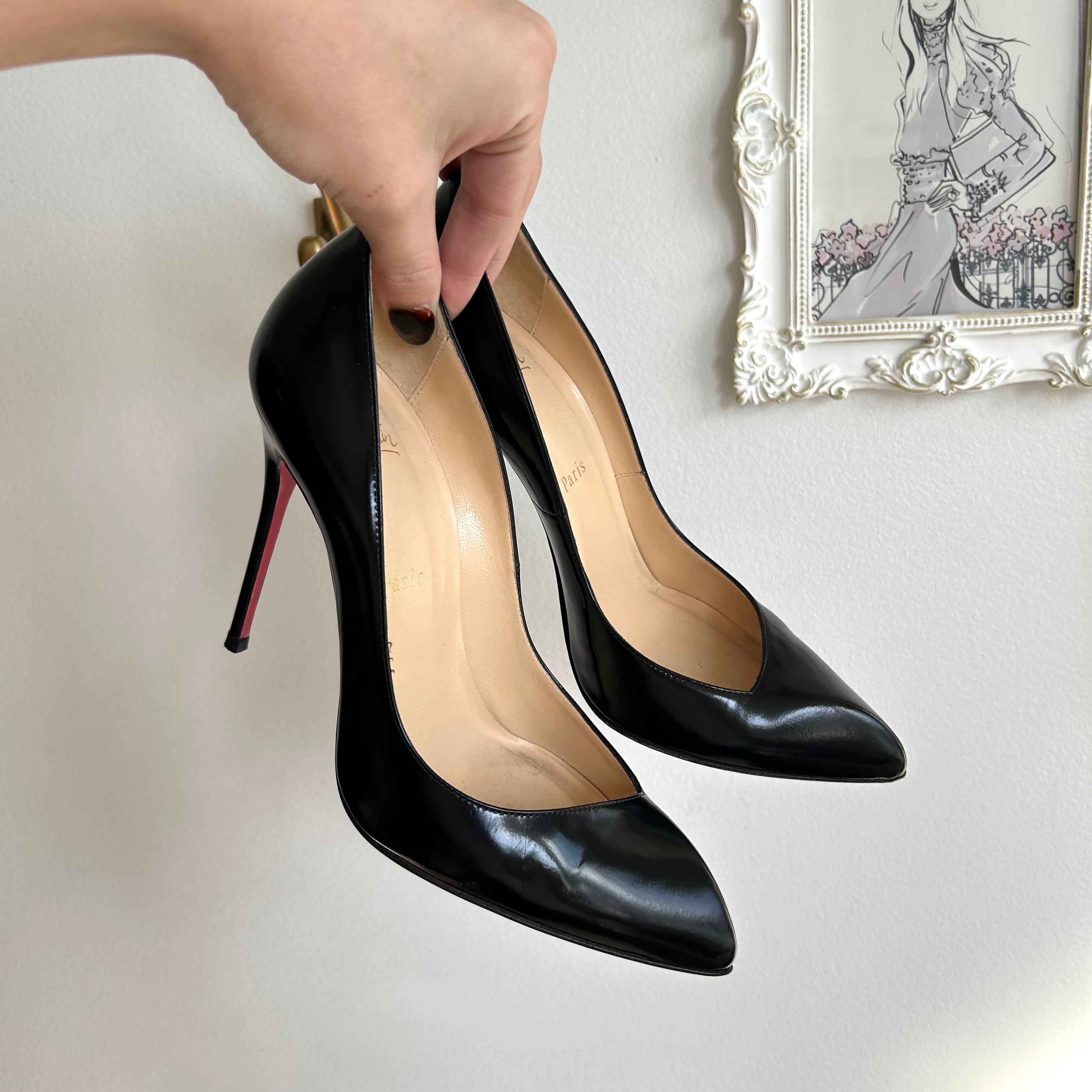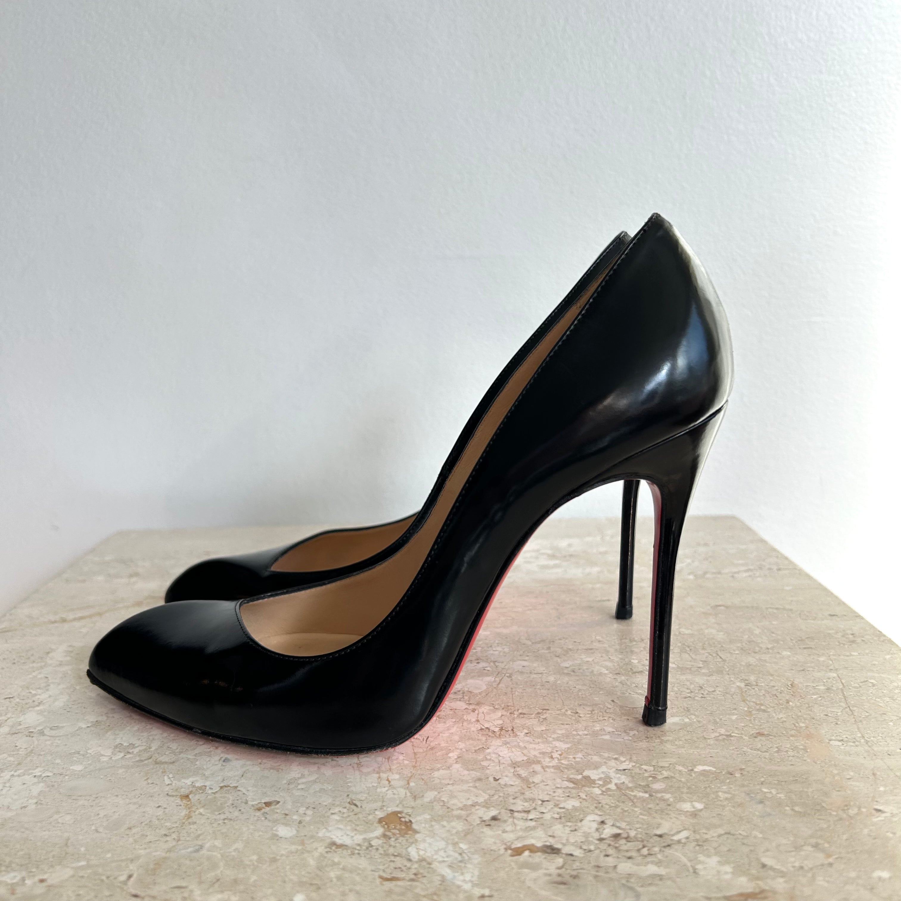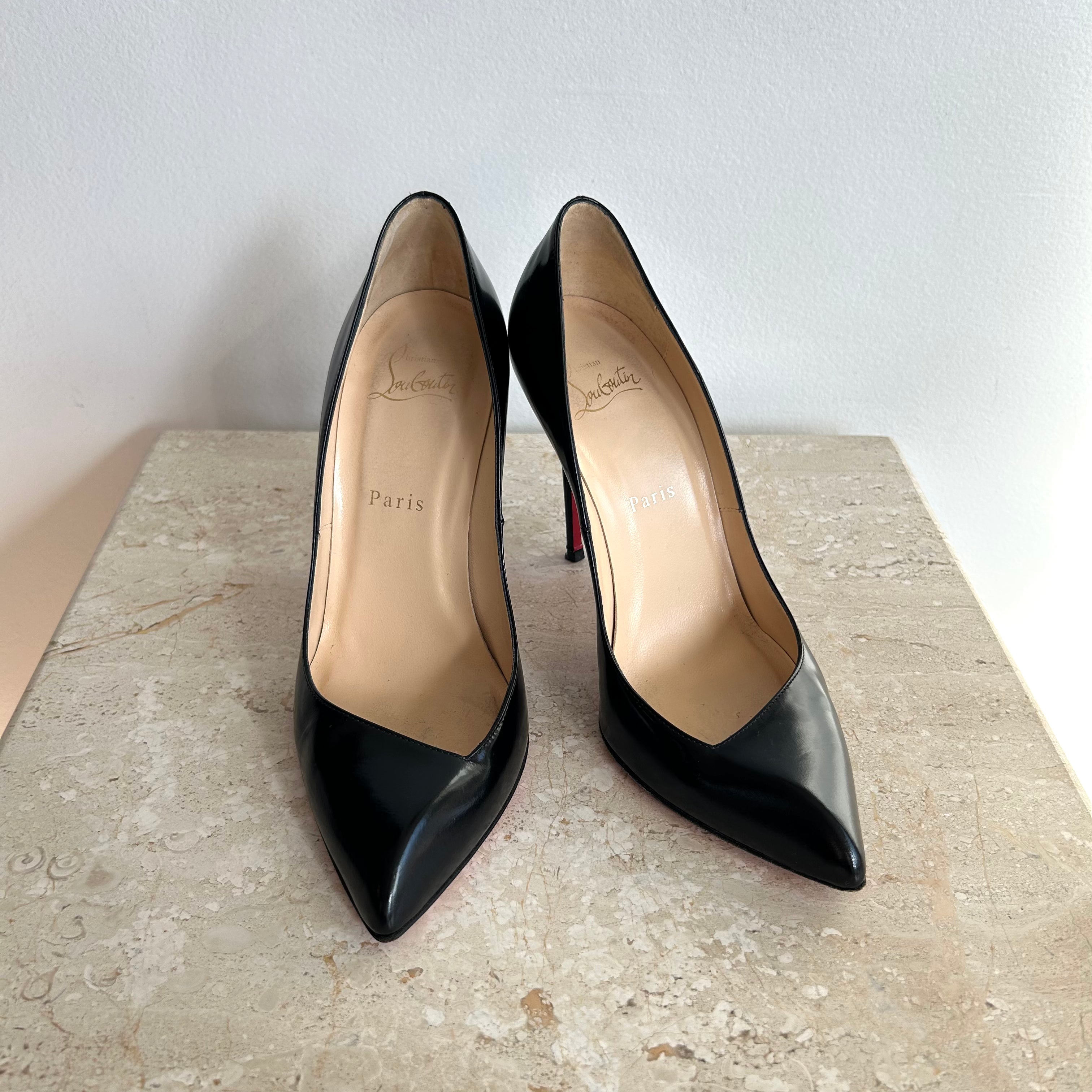 Pre-Owned Christian Louboutin Corneille 100 Jazz Calf Pumps. Crafted in shiny black calfskin leather, these classic pumps feature a stiletto heel, pointed toe, and asymmetrical toe box for added edge! These are elevated classic pumps. So chic!
