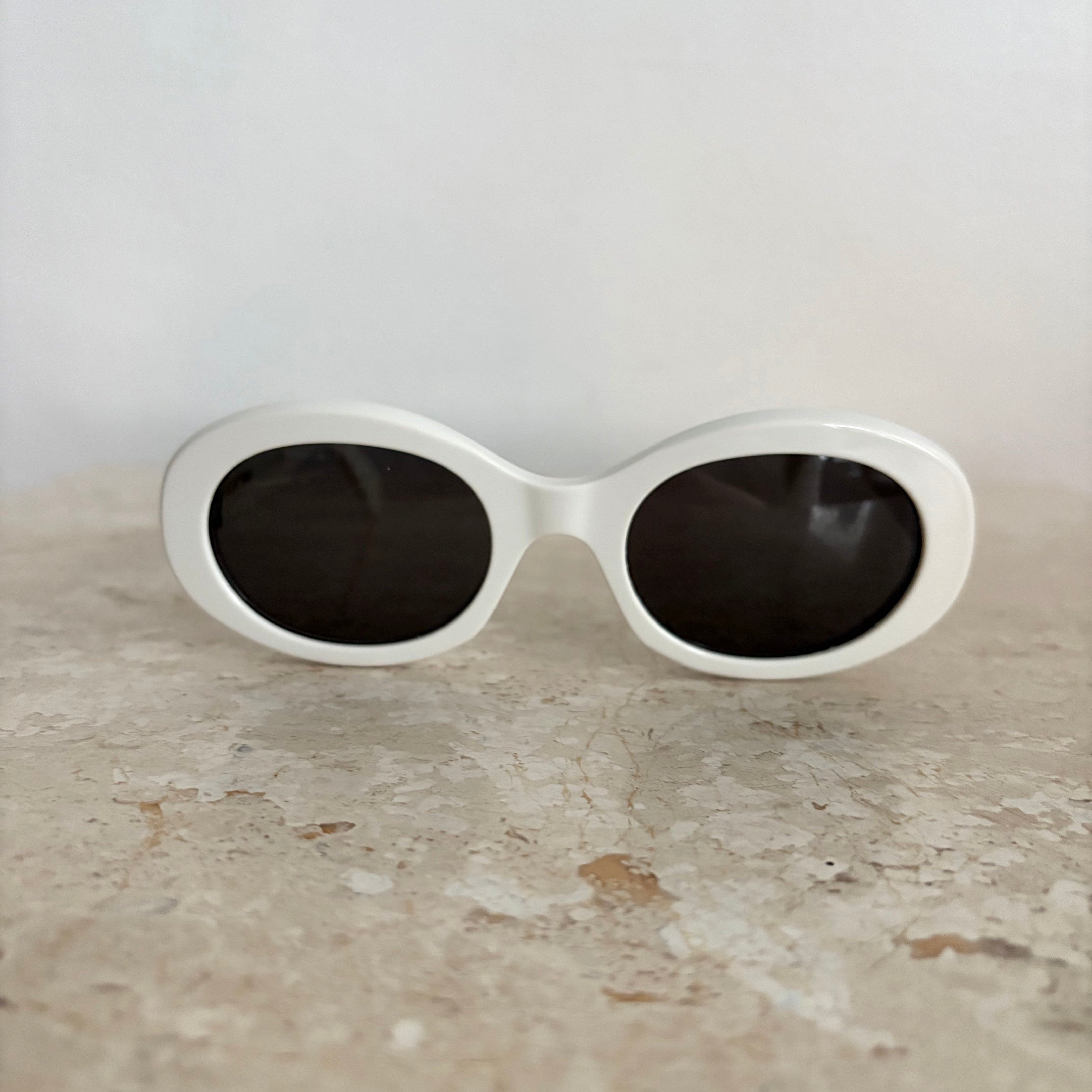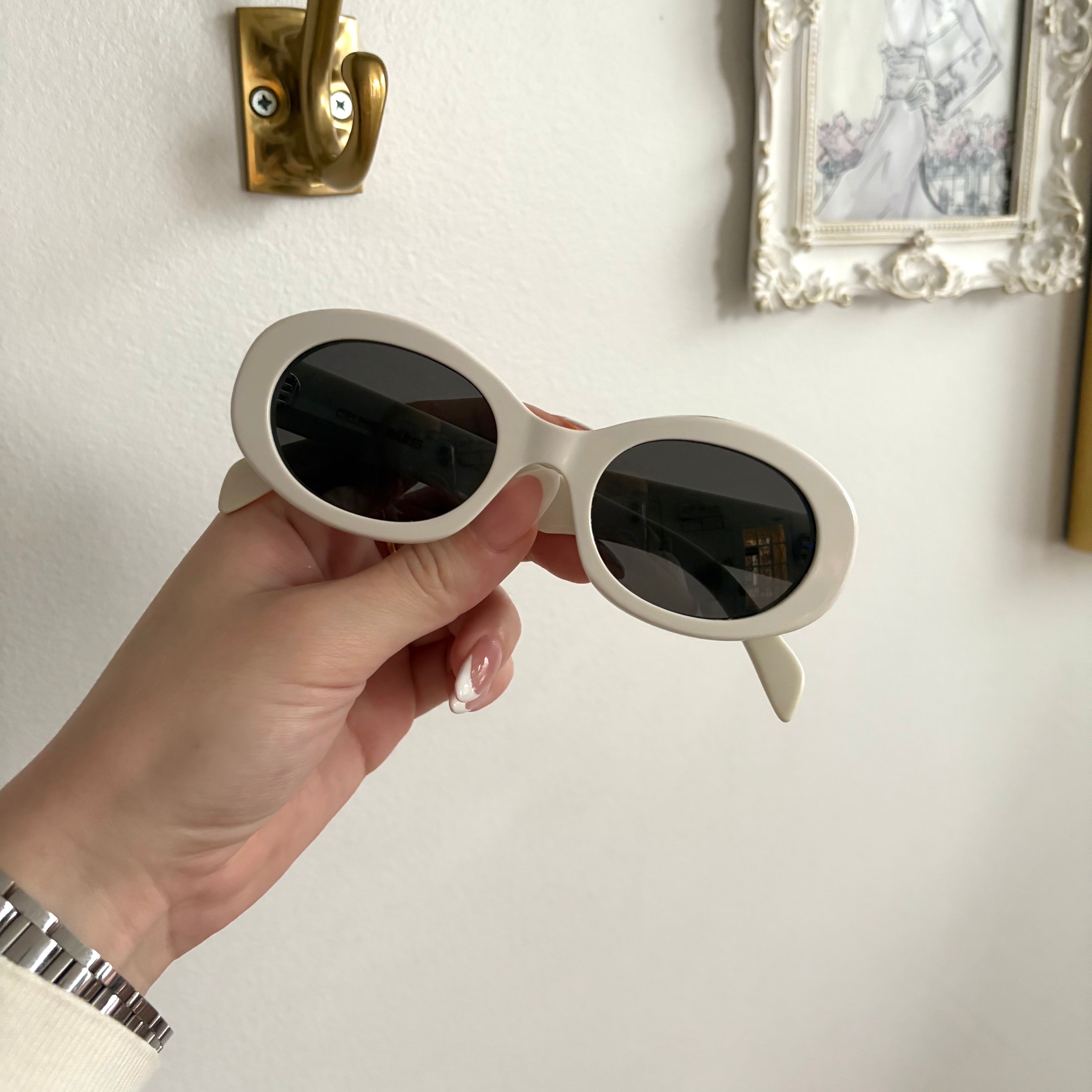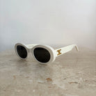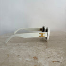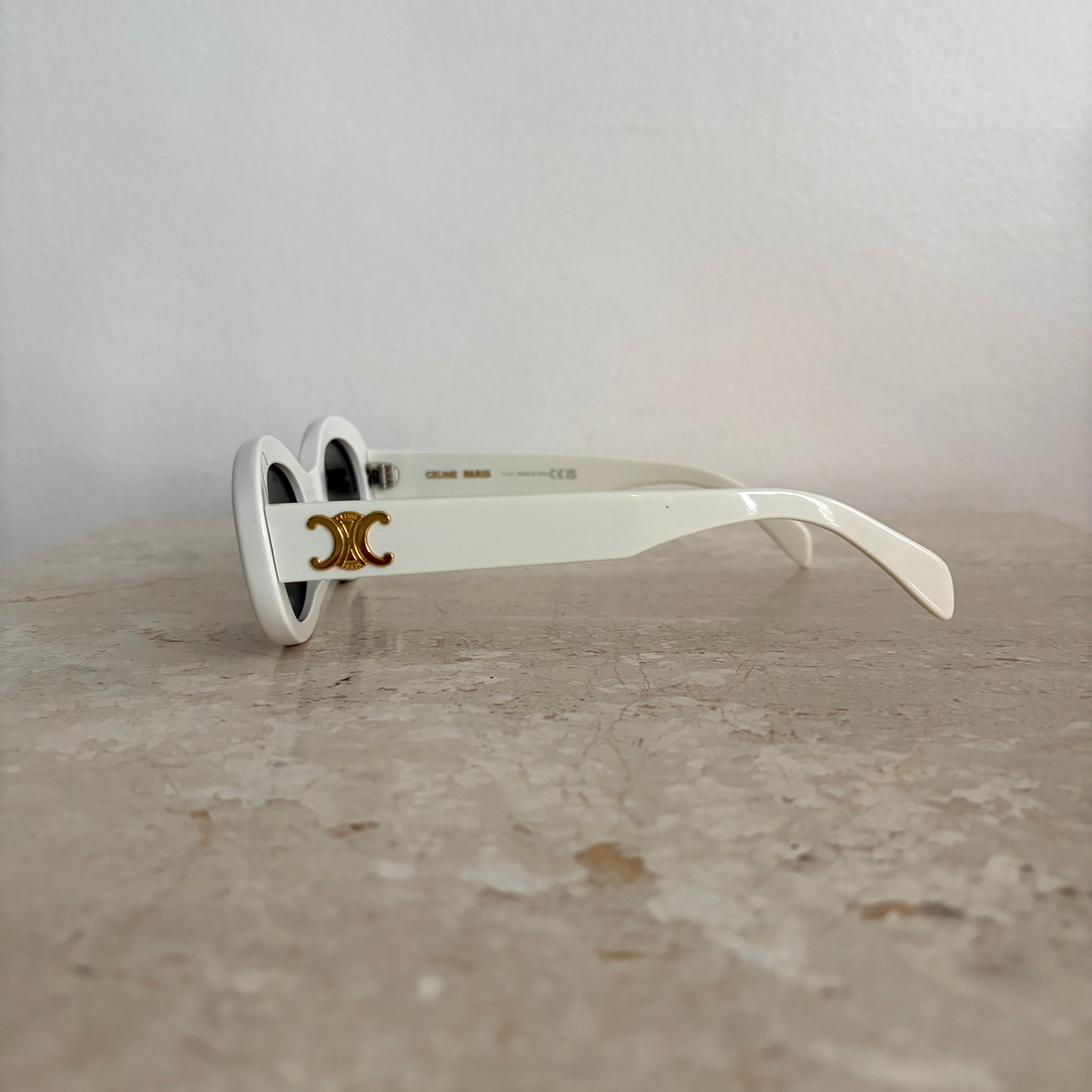 Pre-Owned Celine CL40194U Triomphe 01 Sunglasses. In white acetate, these fab sunglasses have an oval lens and feature the triomphe logo in gold tone on both temple arms. So fab!