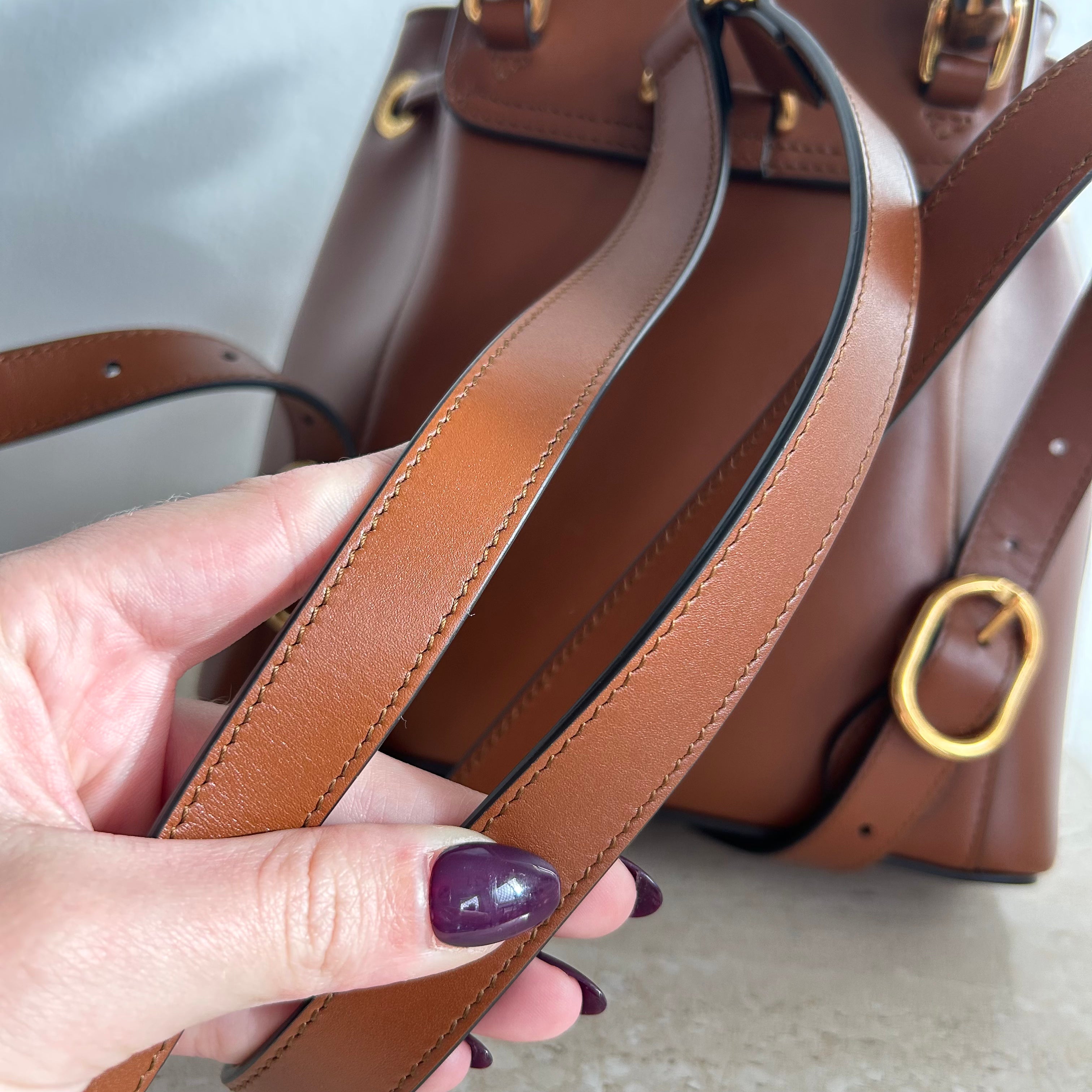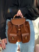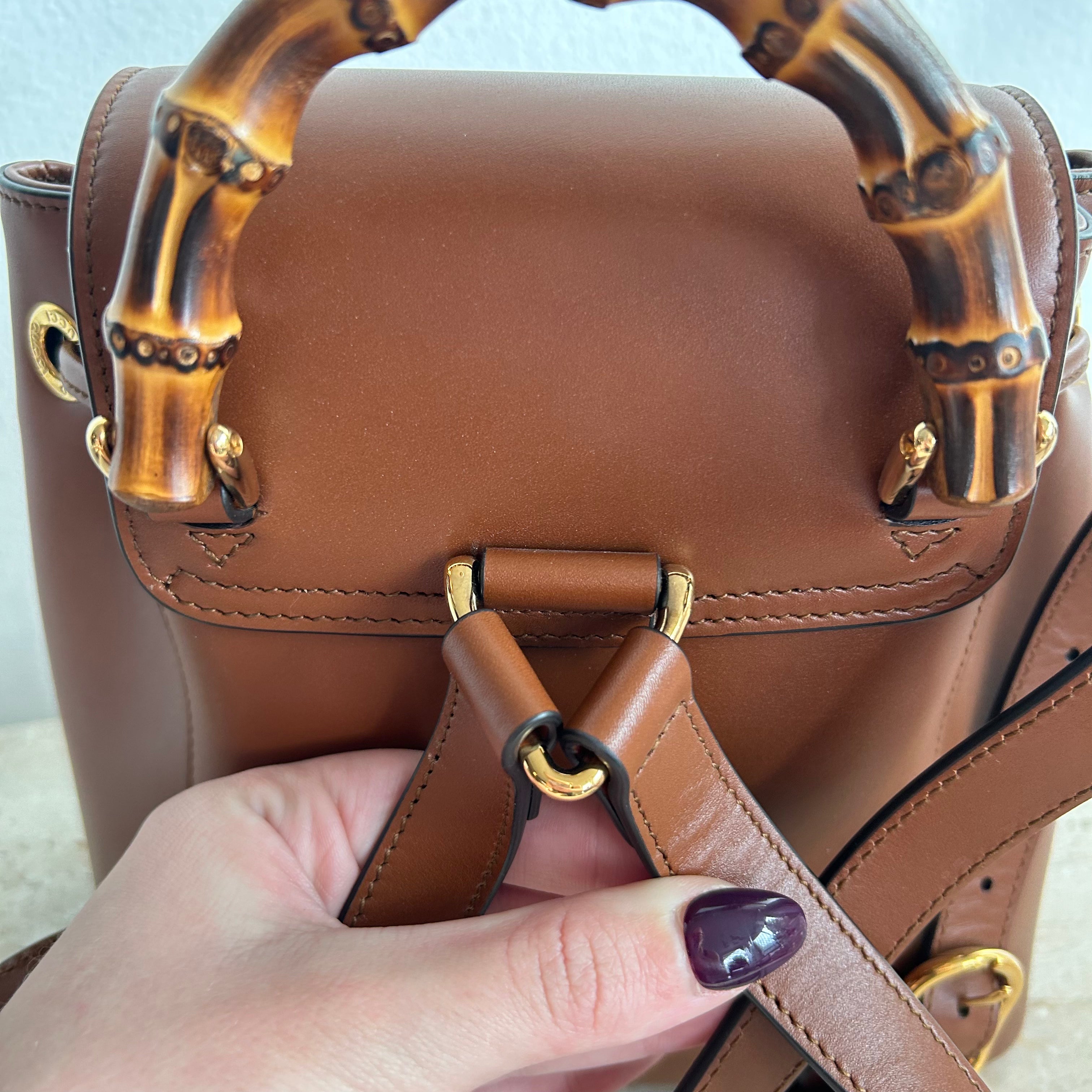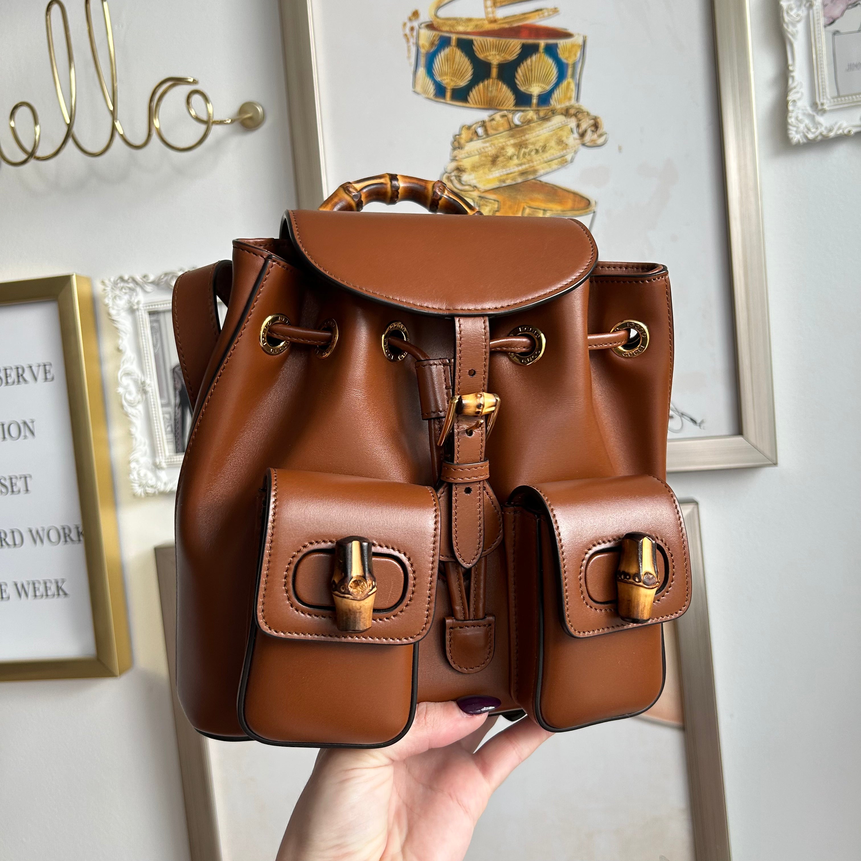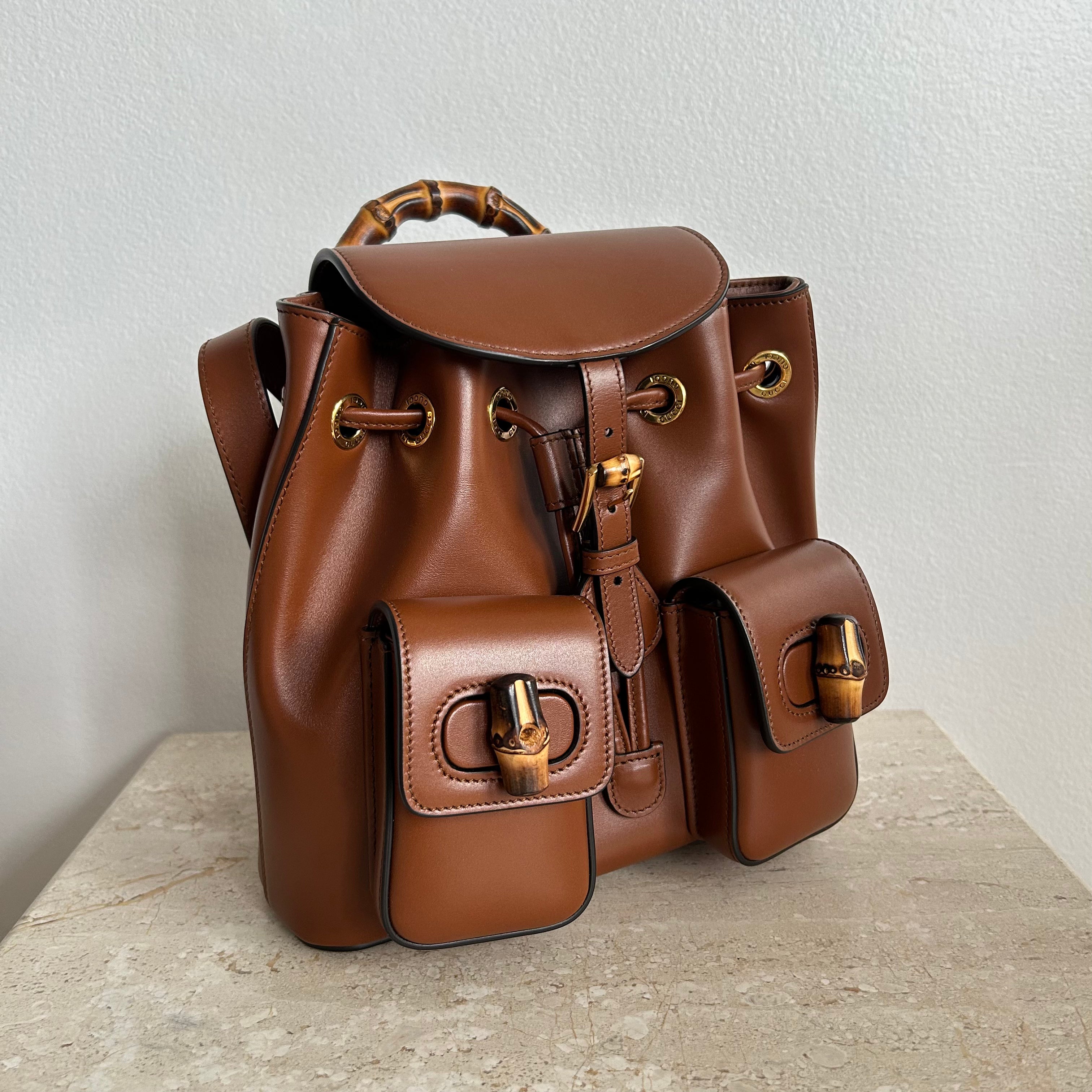 Pre-Owned Gucci 1947 Brown Leather Bamboo Backpack. Crafted in beautiful smooth brown leather with gold tone hardware and a bamboo top handle. Magnetic closure opens the front flap to a drawstring opening revealing a fabric lined interior hosting one slip pocket. With adjustable straps, this backpack is perfect for handsfree ease! Such a beauty of a bag!