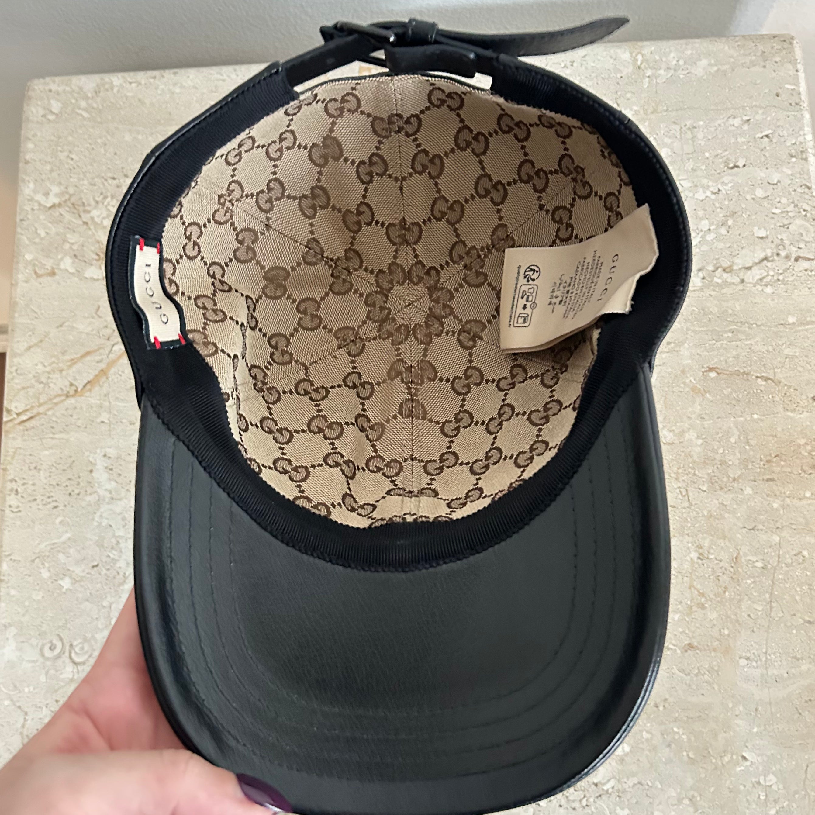 Pre-Owned Gucci Black Leather Baseball Hat Small. Crafted in 100% shiny black calfskin leather with the interlocking GG in black on the front centre and an adjustable back. GG fabric lined interior. This is a fab unisex find!