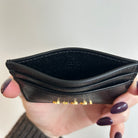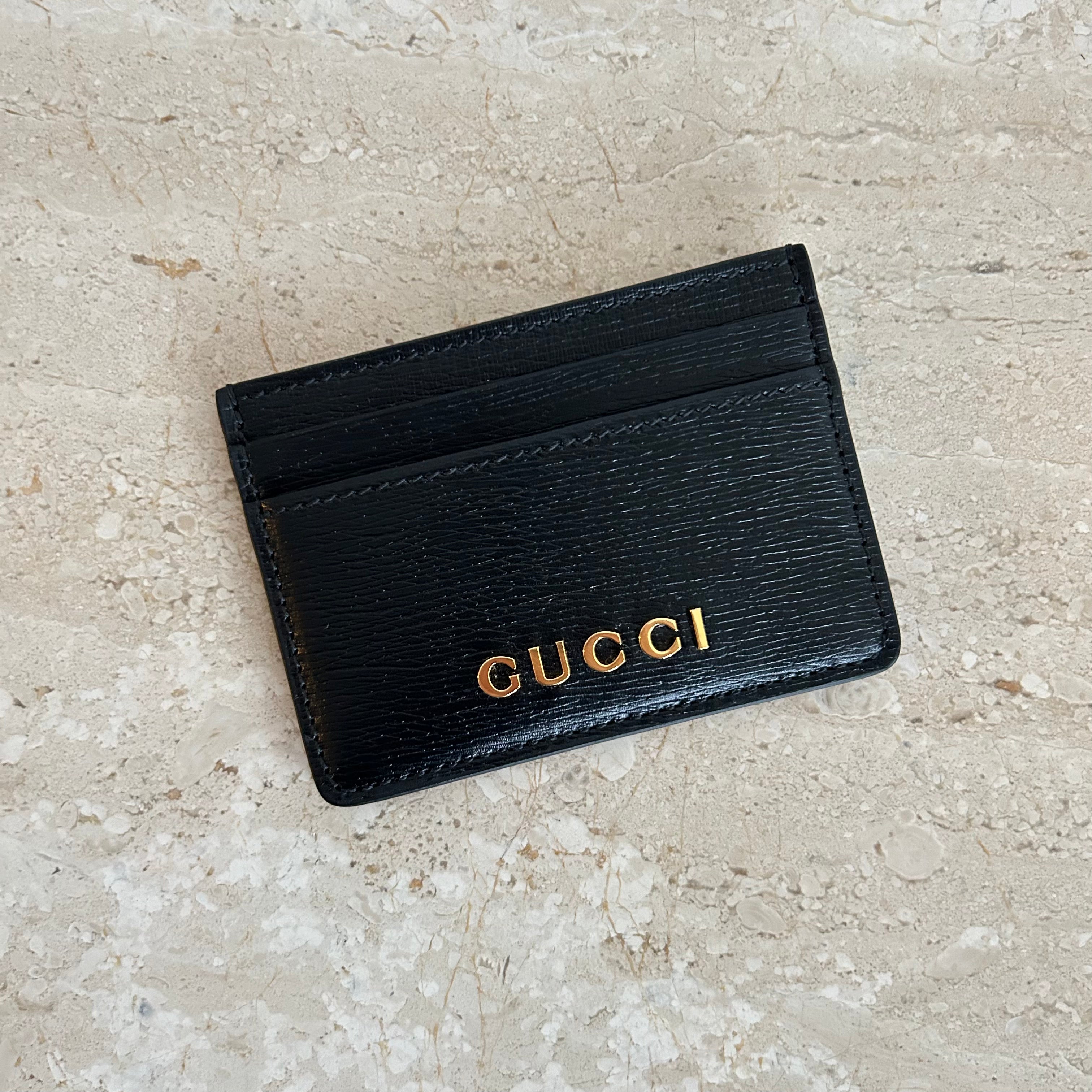 Pre-Owned Gucci Black Leather Cardcase. Crafted in black leather with the house logo in gold tone hardware across the front. Two card slots on each side and an open compartment for more cards. Perfect for daily use and a great gift!